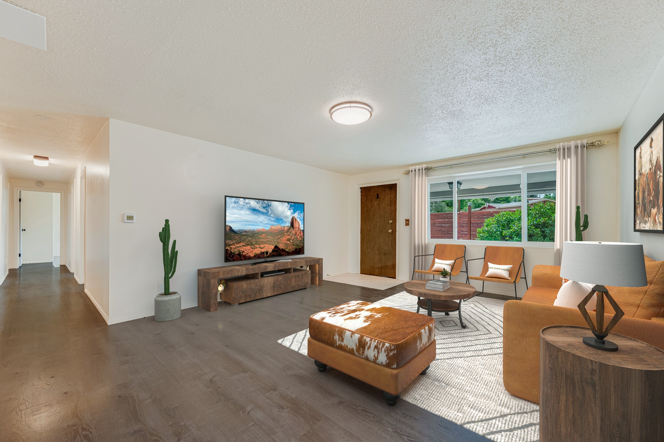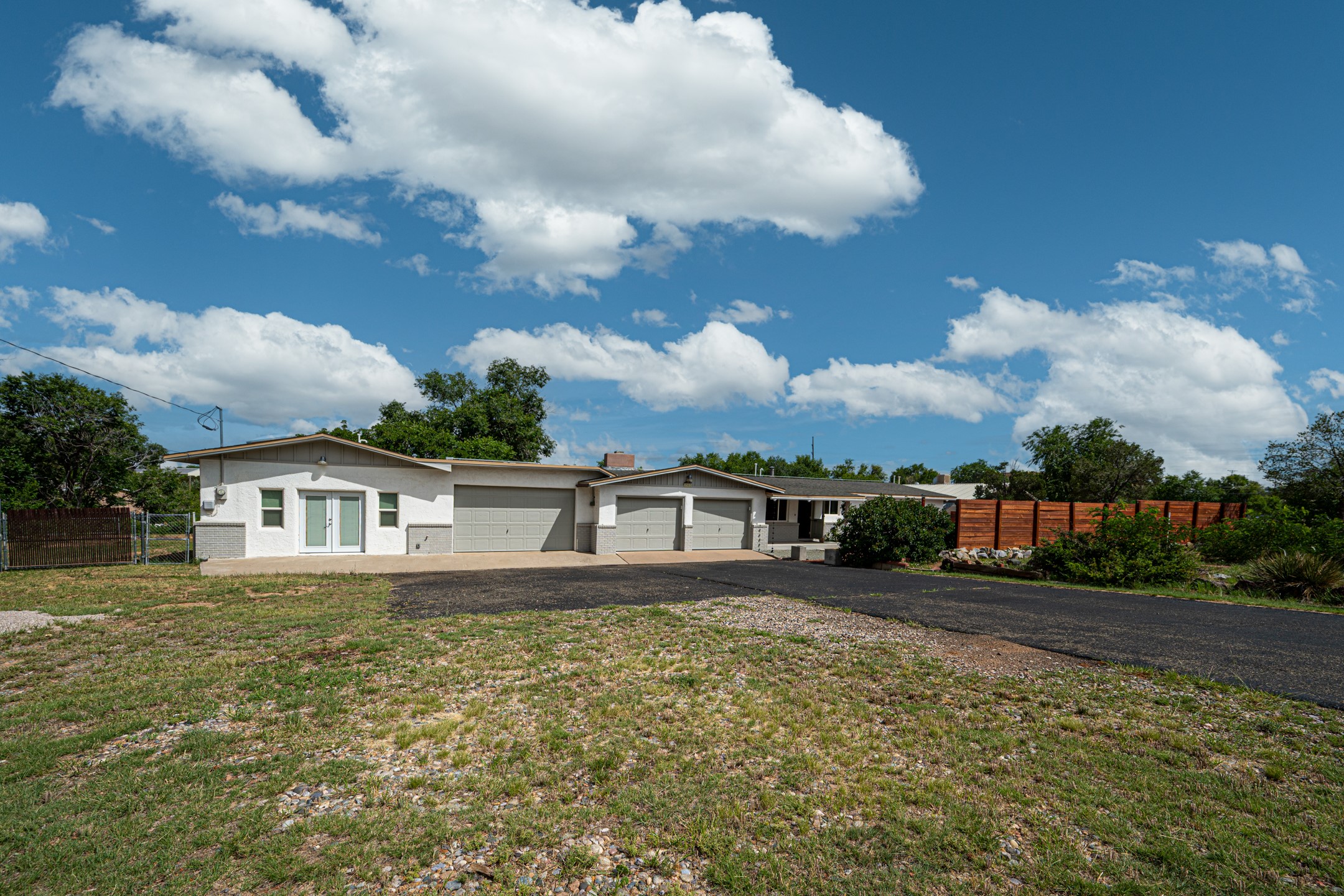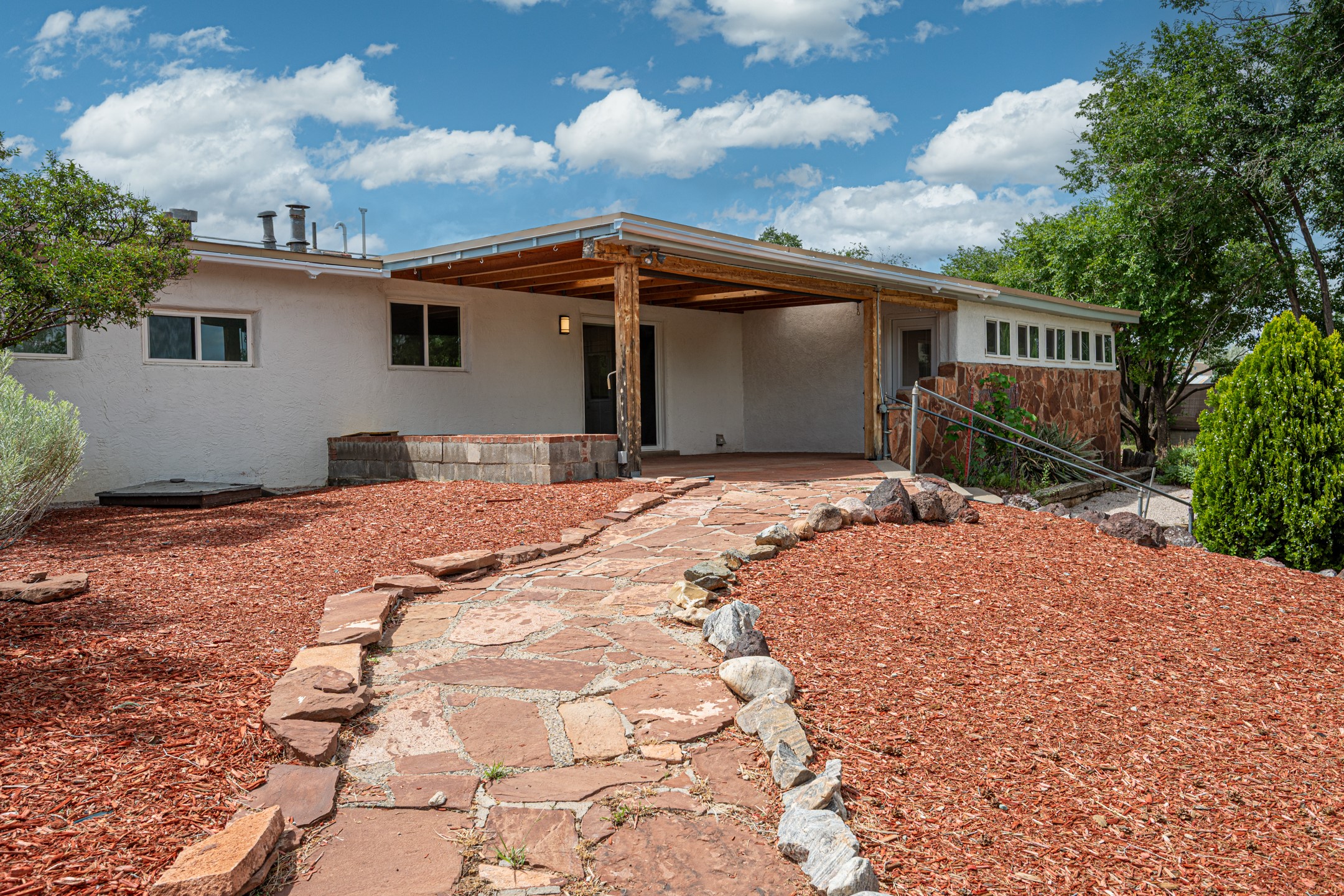 This inviting single level, ranch-style home is sited on nearly 3/4 of an acre in the heart of Santa Fe. The 1916 sqft floor plan features four-bedrooms, three-bathrooms, formal living, dining, den with wood-burning fireplace, and insulated sun room with hot tub. The extensive list of upgrades includes a refreshed kitchen with newer stainless steel appliances and countertops, new windows and flooring throughout, fresh paint, upgraded electrical, on-demand water heaters, and central A/C. Generous living spaces are enhanced by a large rear portal, accessible through sliding doors from the kitchen and French doors from the sunroom, where landscaped grounds create a natural oasis beneath the shade of mature trees. Need more to love? A 466 sqft studio provides added versatility for extended stays or creative use. This bonus space has high ceilings, a mini-split, and is plumbed for a kitchen. Complete with RV hookups in the third garage bay, this R-5 zoned property provides further development by a savvy and value-oriented buyer. Proximity to a neighborhood park and Santa Fe High School, the mid-town location is perfect for easy commutes. This move-in ready charmer of a property offers comfort, versatility, and space in spades.