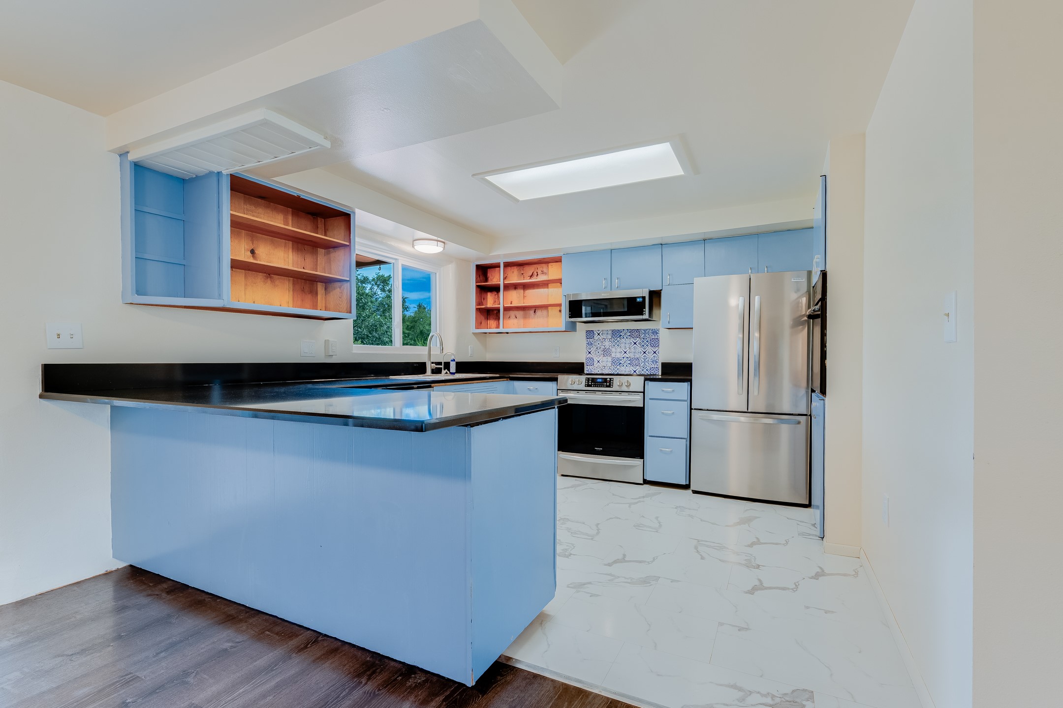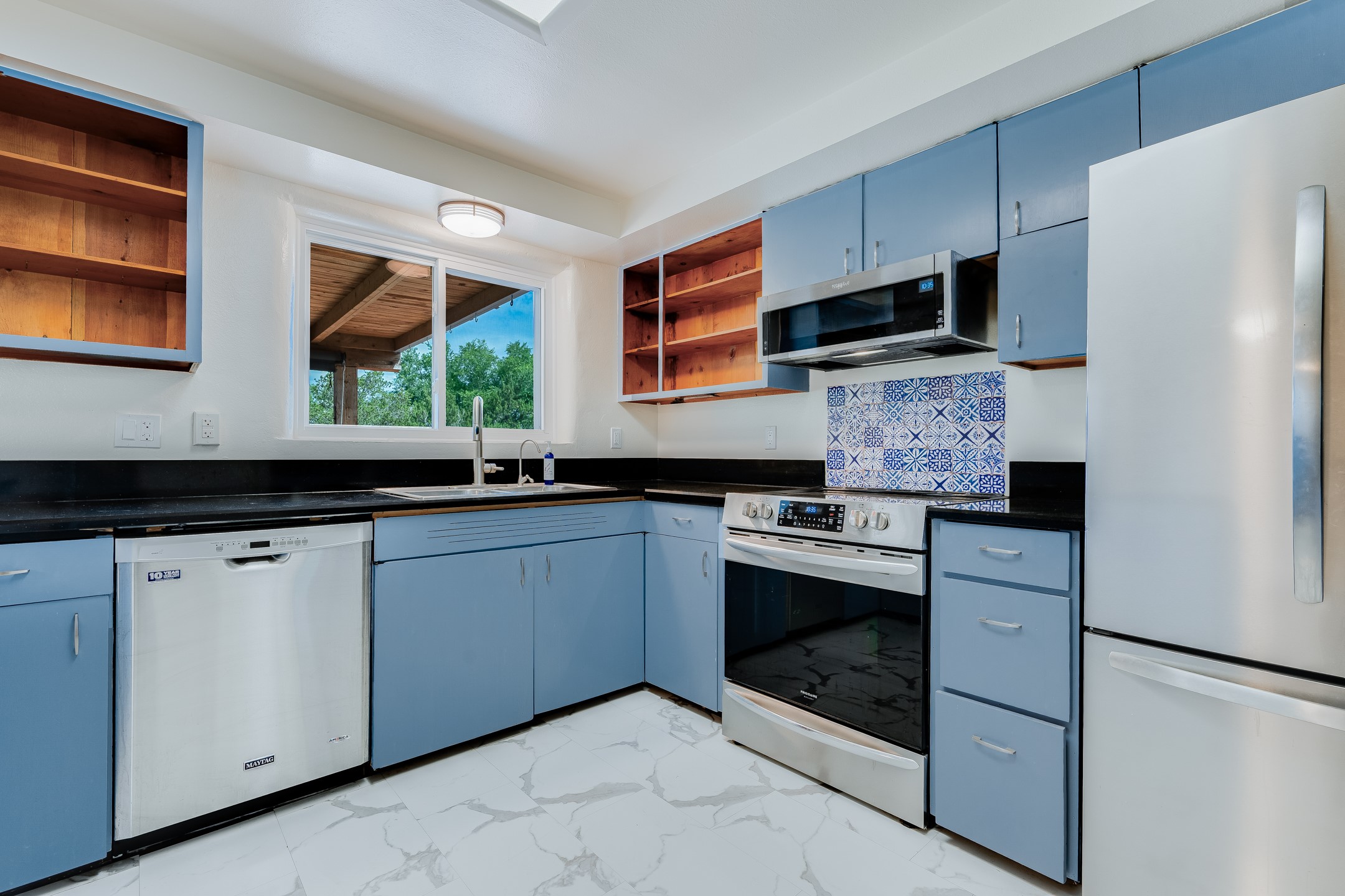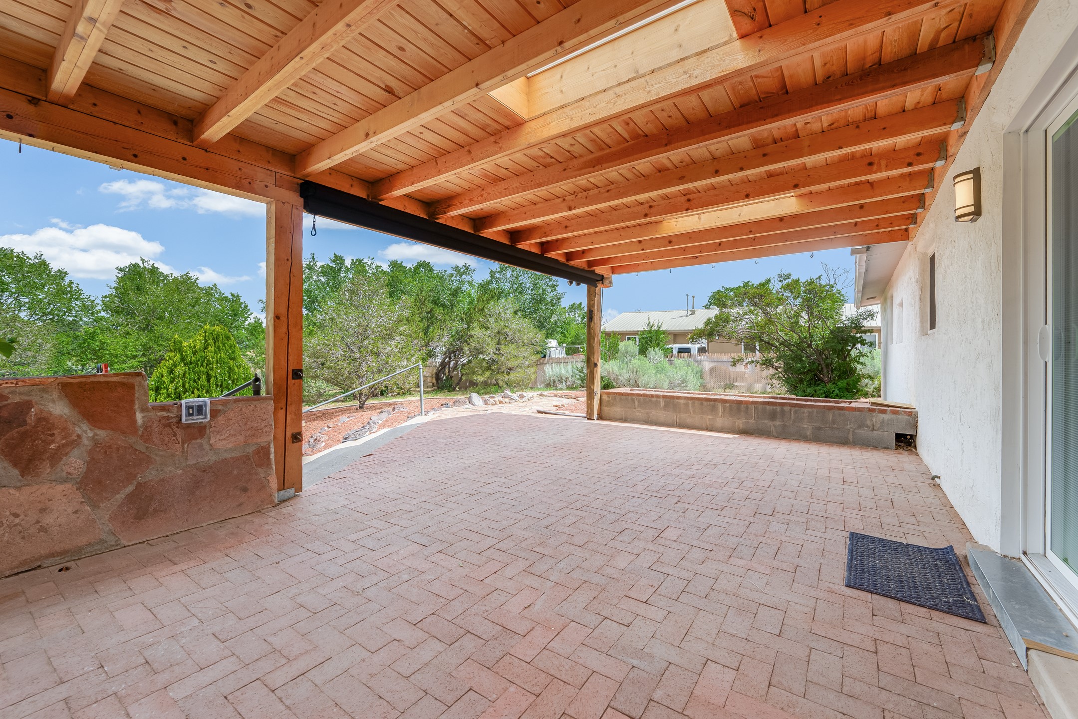 This inviting single level, ranch-style home is sited on nearly 3/4 of an acre in the heart of Santa Fe. The 1916 sqft floor plan features four-bedrooms, three-bathrooms, formal living, dining, den with wood-burning fireplace, and insulated sun room with hot tub. The extensive list of upgrades includes a refreshed kitchen with newer stainless steel appliances and countertops, new windows and flooring throughout, fresh paint, upgraded electrical, on-demand water heaters, and central A/C. Generous living spaces are enhanced by a large rear portal, accessible through sliding doors from the kitchen and French doors from the sunroom, where landscaped grounds create a natural oasis beneath the shade of mature trees. Need more to love? A 466 sqft studio provides added versatility for extended stays or creative use. This bonus space has high ceilings, a mini-split, and is plumbed for a kitchen. Complete with RV hookups in the third garage bay, this R-5 zoned property provides further development by a savvy and value-oriented buyer. Proximity to a neighborhood park and Santa Fe High School, the mid-town location is perfect for easy commutes. This move-in ready charmer of a property offers comfort, versatility, and space in spades.