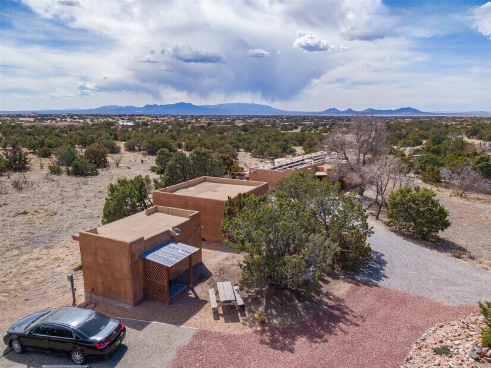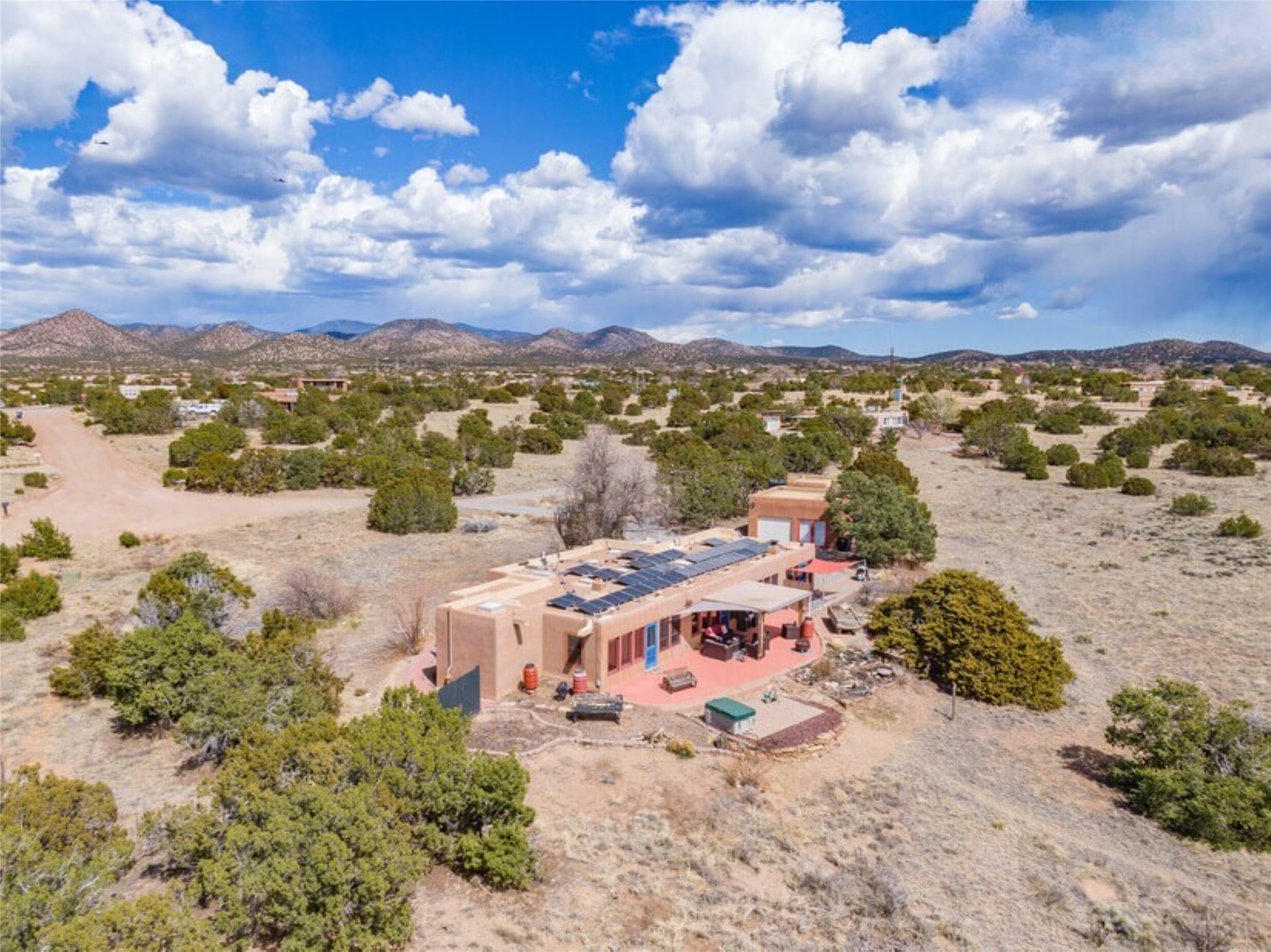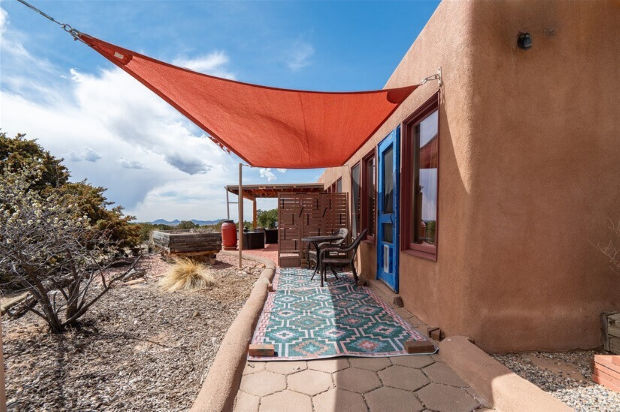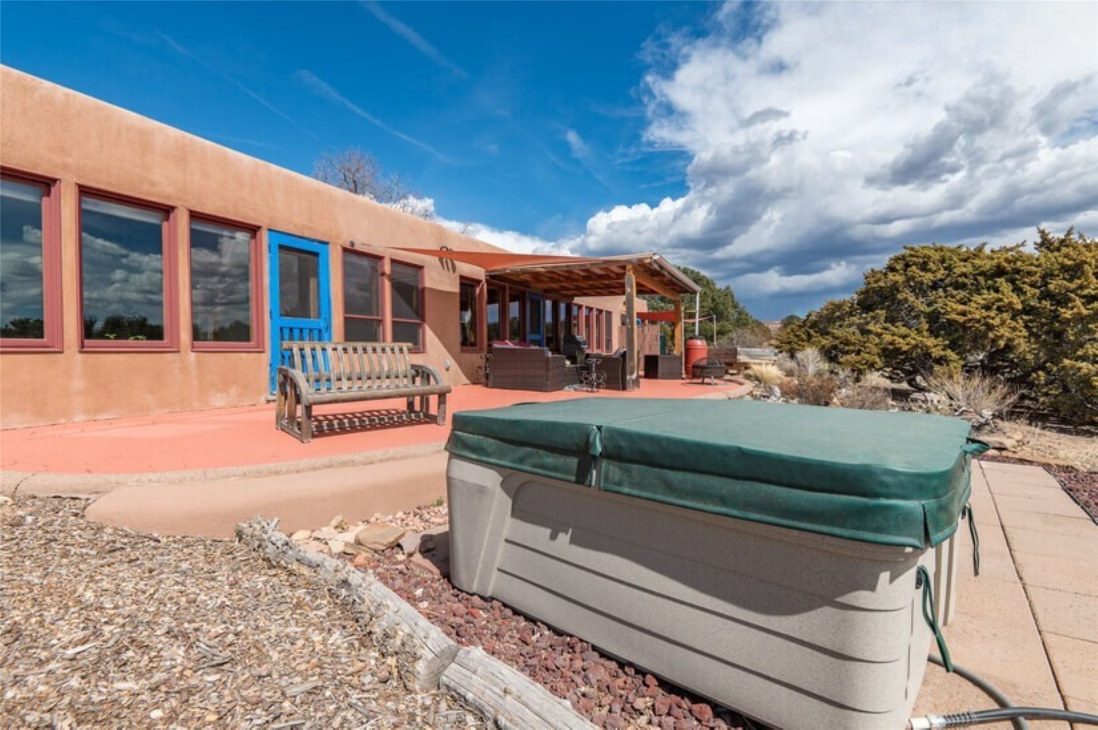 This Eldorado retreat features Santa Fe style and charm with beautiful outdoor living spaces that back directly onto a greenbelt with miles of trails, perfect for hiking and doggies. The home offers a passive solar design with an open split floor plan. The main living area, featuring a shepherd's fireplace, flows seamlessly into the kitchen and dining areas, and extends to a private portal with sweeping mountain views, perfect for entertaining. The primary suite includes its own kiva fireplace, large walk in closet and ensuite bath. For chilly evenings there's a hot tub, ideal for stargazing just off the owner's suite. Both the primary and second rear bedroom have direct access to the terrace as well. Beyond the garage, there's a separate studio perfect for a home office or creative endeavors. The sellers have made significant improvements and upgrades. Please see the attached list.