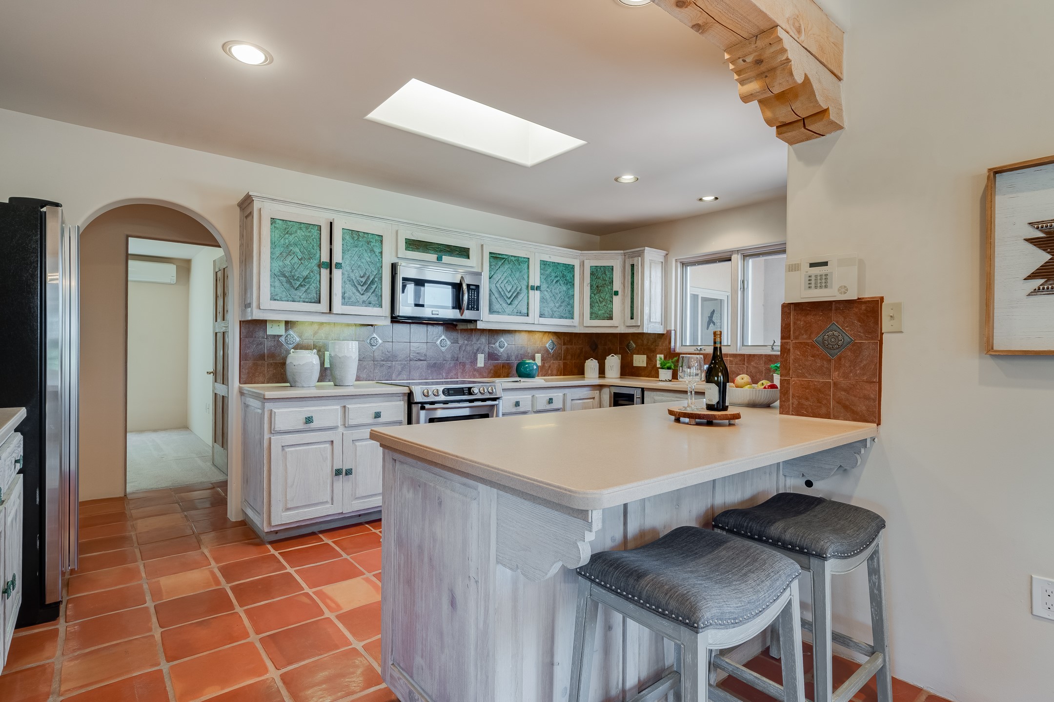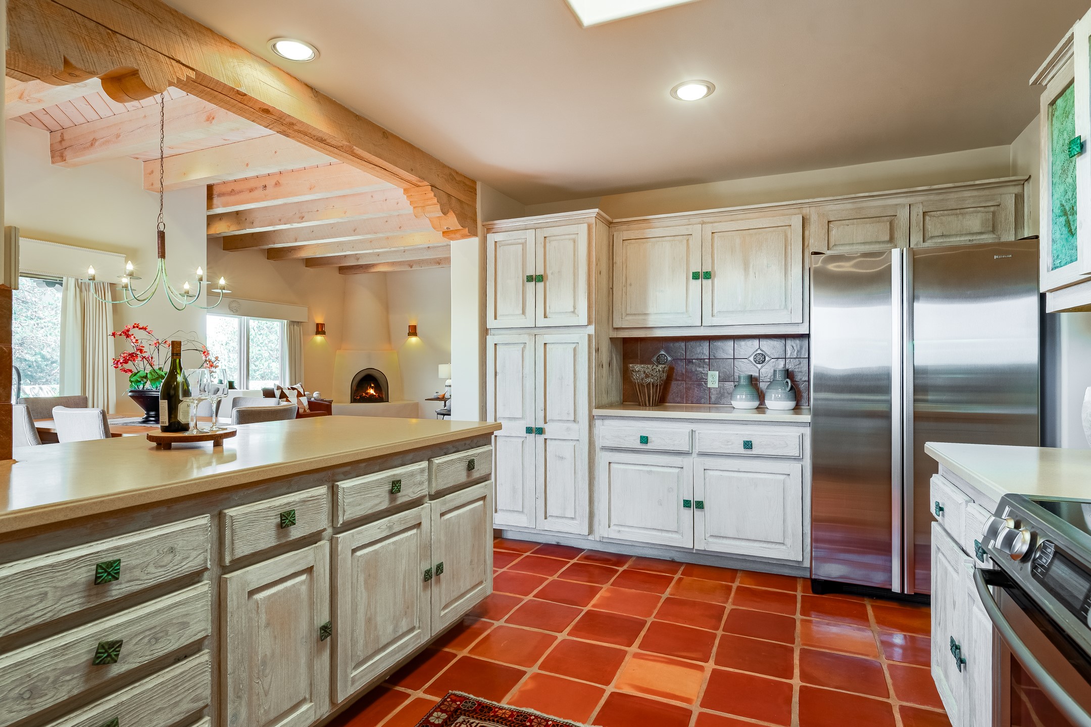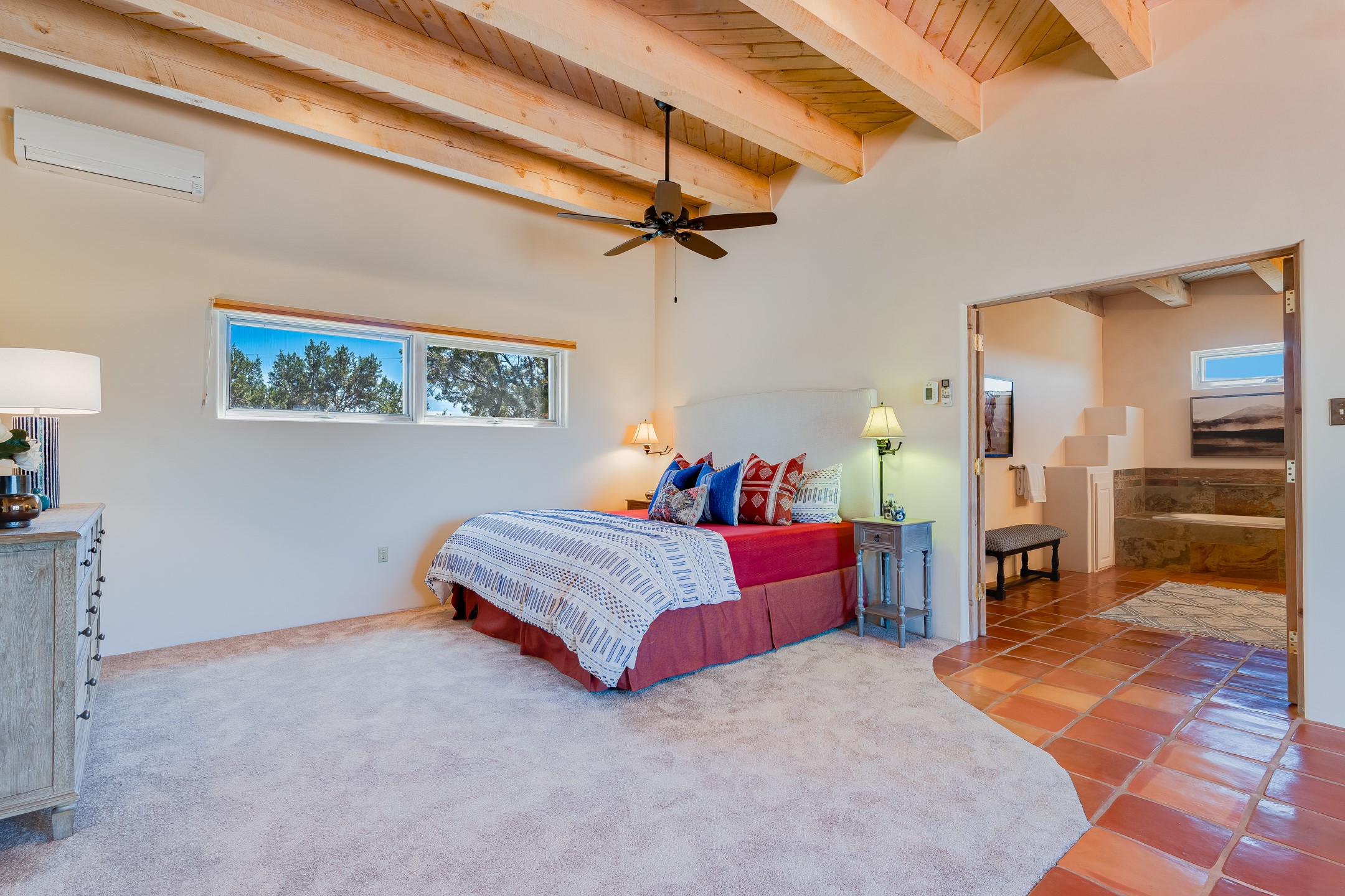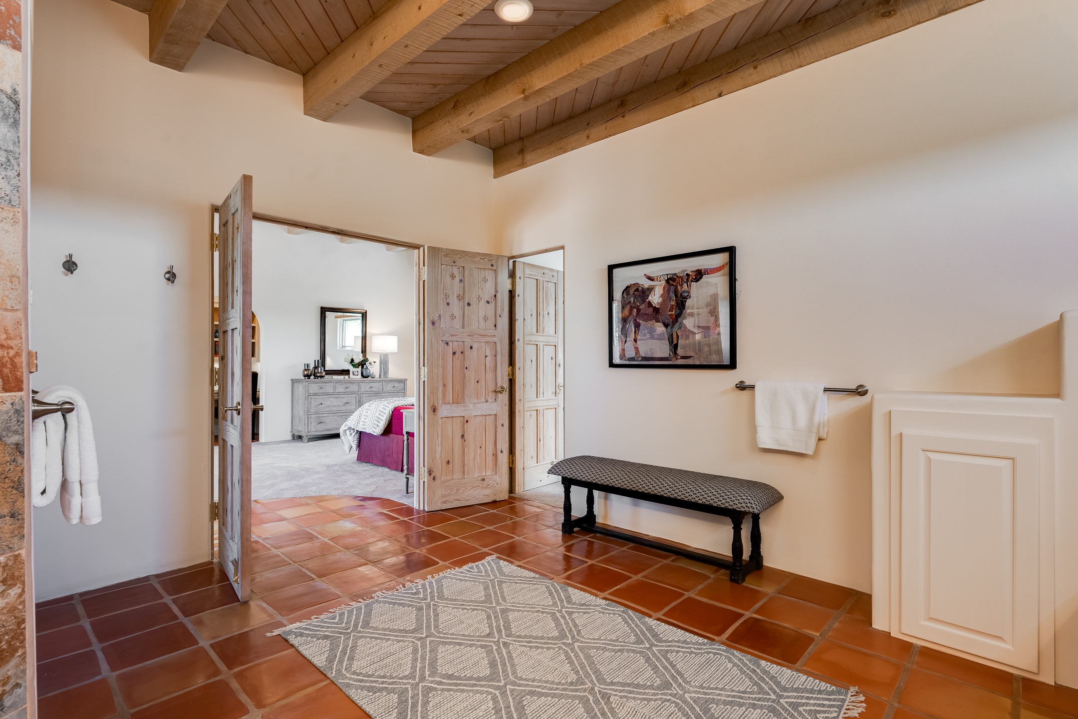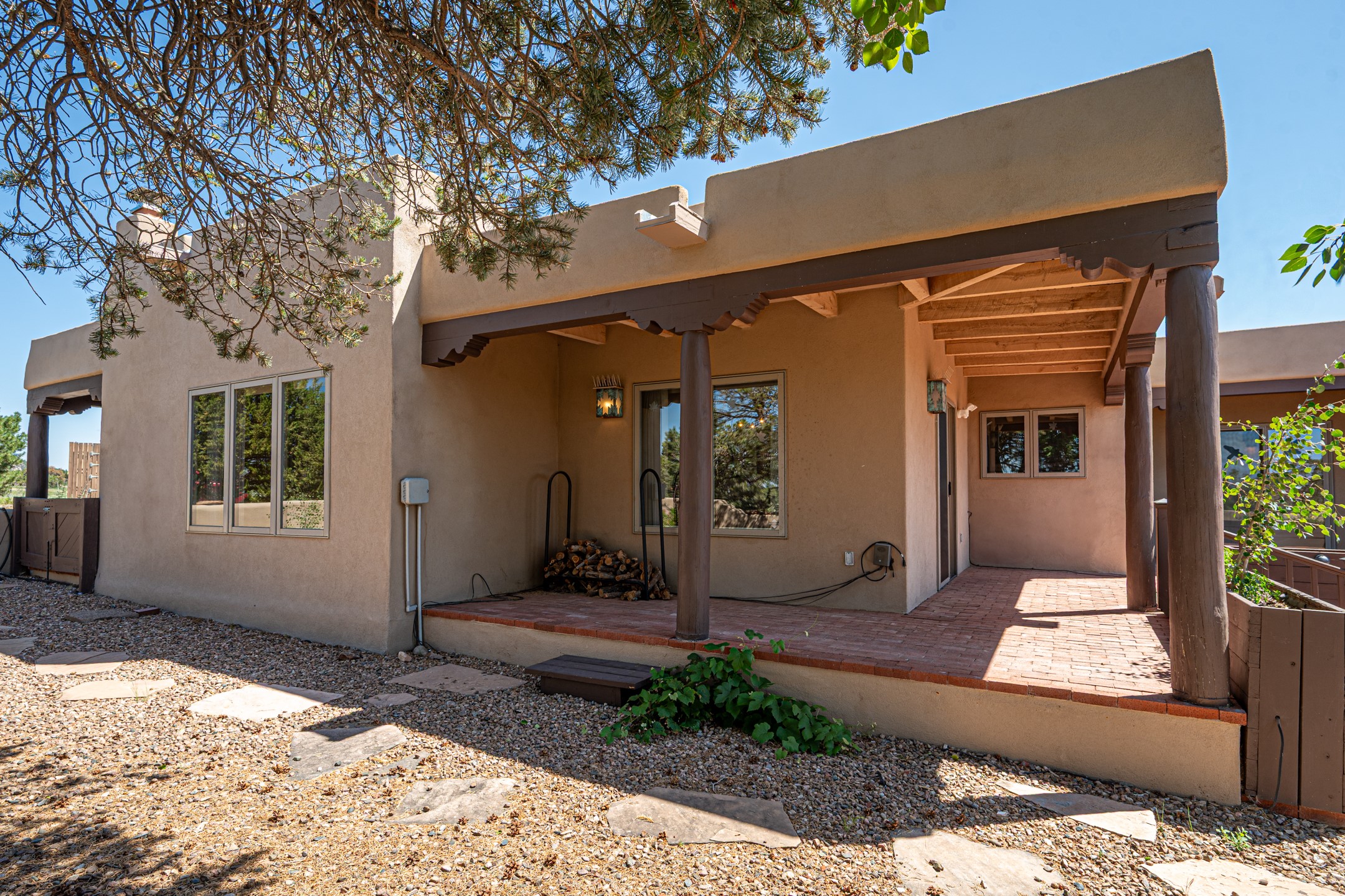 Southwestern charm meets modern comfort and functionality with this home with 3 peaceful acres with tranquil views of both sunrise and sunsets. This lovely property offers the best of rural living just minutes from the amenities of town. The home's open living area is warm and inviting, featuring Saltillo tile floors, high ceilings, and a traditional kiva fireplace--the perfect space to relax or entertain. The large master suite is a private sanctuary with its own sitting area and a second kiva fireplace, offering the kind of comfort and space that's rare to find. A separate bonus room with its own bath adds incredible flexibility--ideal as a guest suite, private office, or artist's studio. Additional features include community water, radiant in-floor heating, natural gas, and mini-split units for cooling, ensuring comfort year-round. Located in the Eldorado school system, this home offers a rare blend of privacy, convenience, and natural beauty. Home has been pre-inspected. If you have horses to bring, this property delivers with a two-stall barn, a half-acre turnout, and direct access to an easement which can be used for riding. Whether you want to saddle up or just take a peaceful hike, you can head out your back door.
