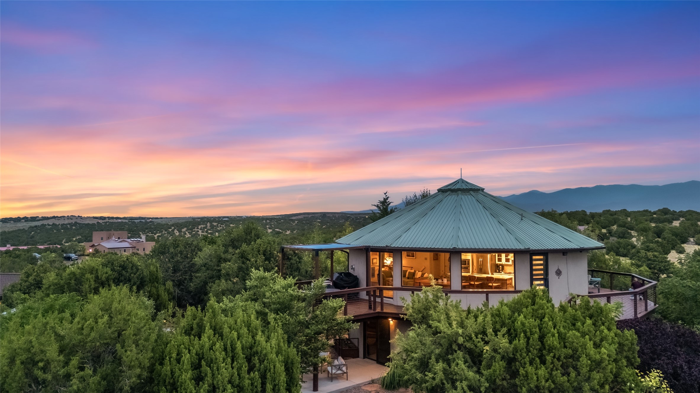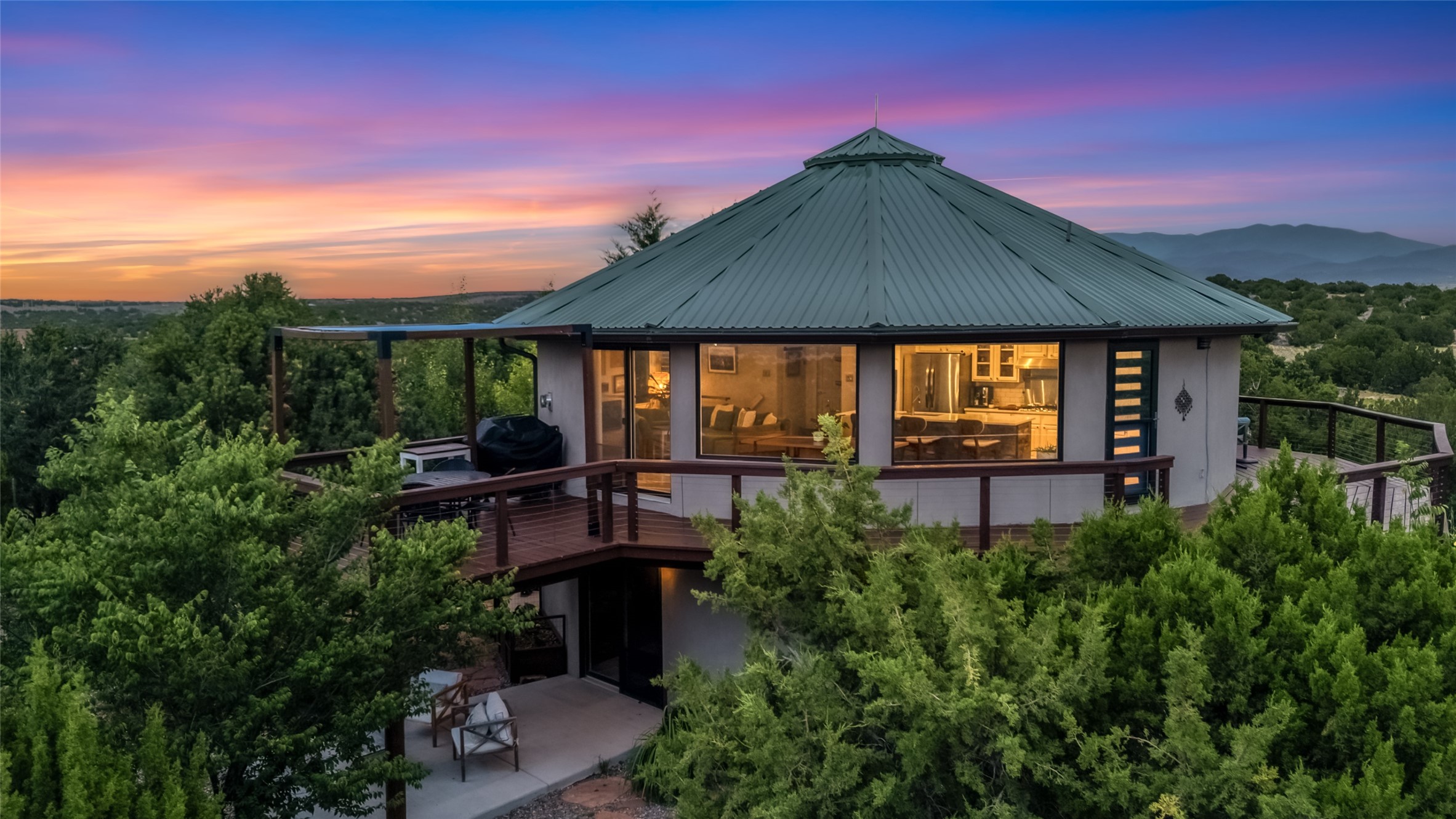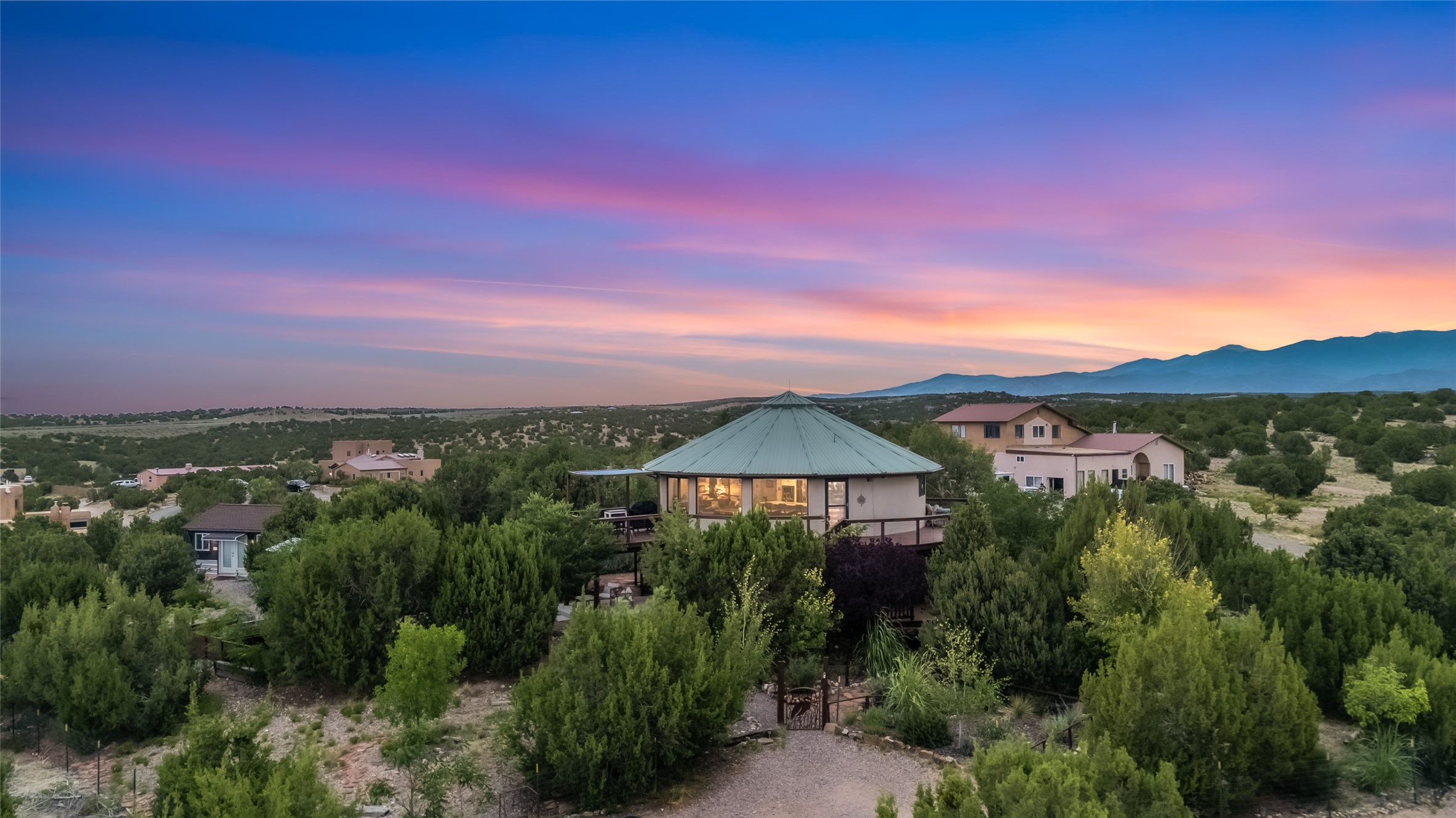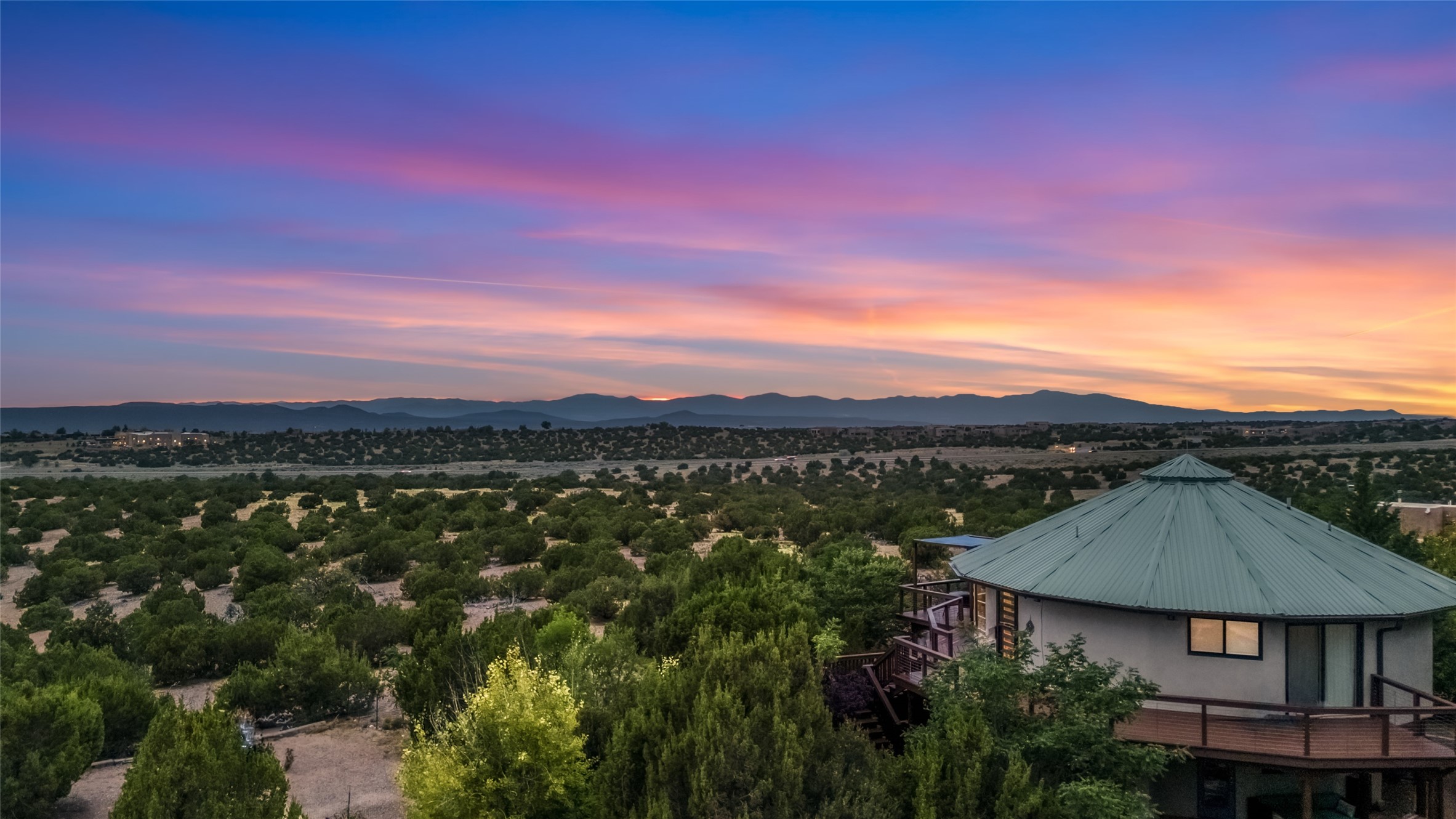 Discover the unparalleled beauty of Santa Fe at 272 Camino Tres Arroyos, a distinctive round home featuring 3 bedrooms, 2 bathrooms, and 2,482 square feet of thoughtfully designed living space. Perfectly positioned on a beautifully landscaped lot, this architecturally unique residence showcases panoramic, unobstructed views that capture the essence of Northern New Mexico's natural beauty. Upon entry, you're welcomed into a warm, light-filled interior that artfully combines modern updates with enduring character. The flowing, circular layout creates inviting spaces ideal for relaxing or entertaining, while recent owner improvements ensure true turnkey comfort. The property also includes a detached 320-square-foot powered studio, perfect for an artist's retreat, home office, or guest space. Enjoy stunning sunsets from the landscaped yard or entertain guests on the private deck surrounded by Santa Fe's iconic vistas. Situated just minutes from town yet feeling worlds away, this extraordinary home offers the best of both convenience and serenity. Don't miss this rare opportunity to own an architecturally distinctive, move-in-ready home with unparalleled views in a coveted Santa Fe location. The home sits 1 mile down a dirt road that is maintained by the neighborhood twice a year.