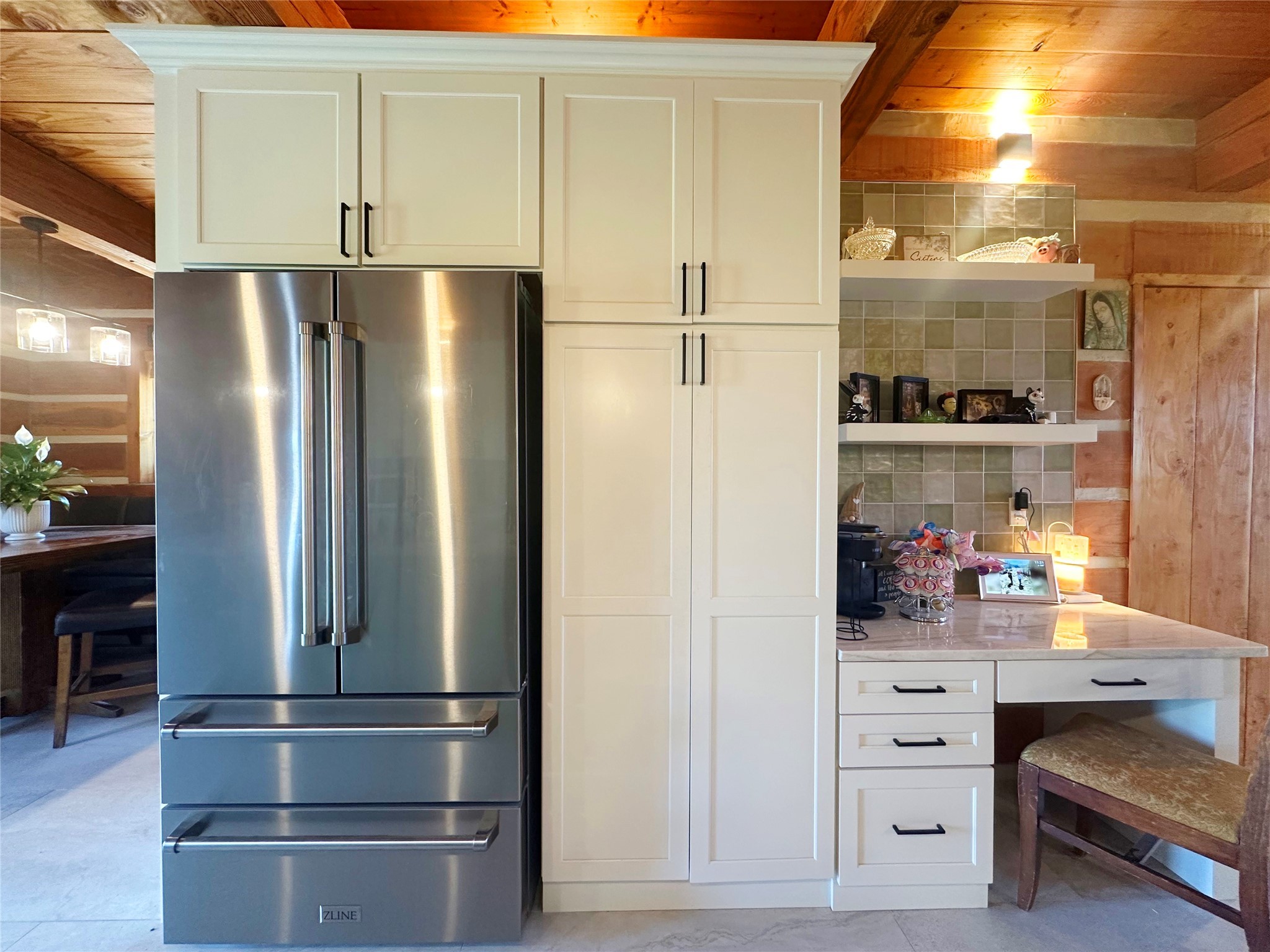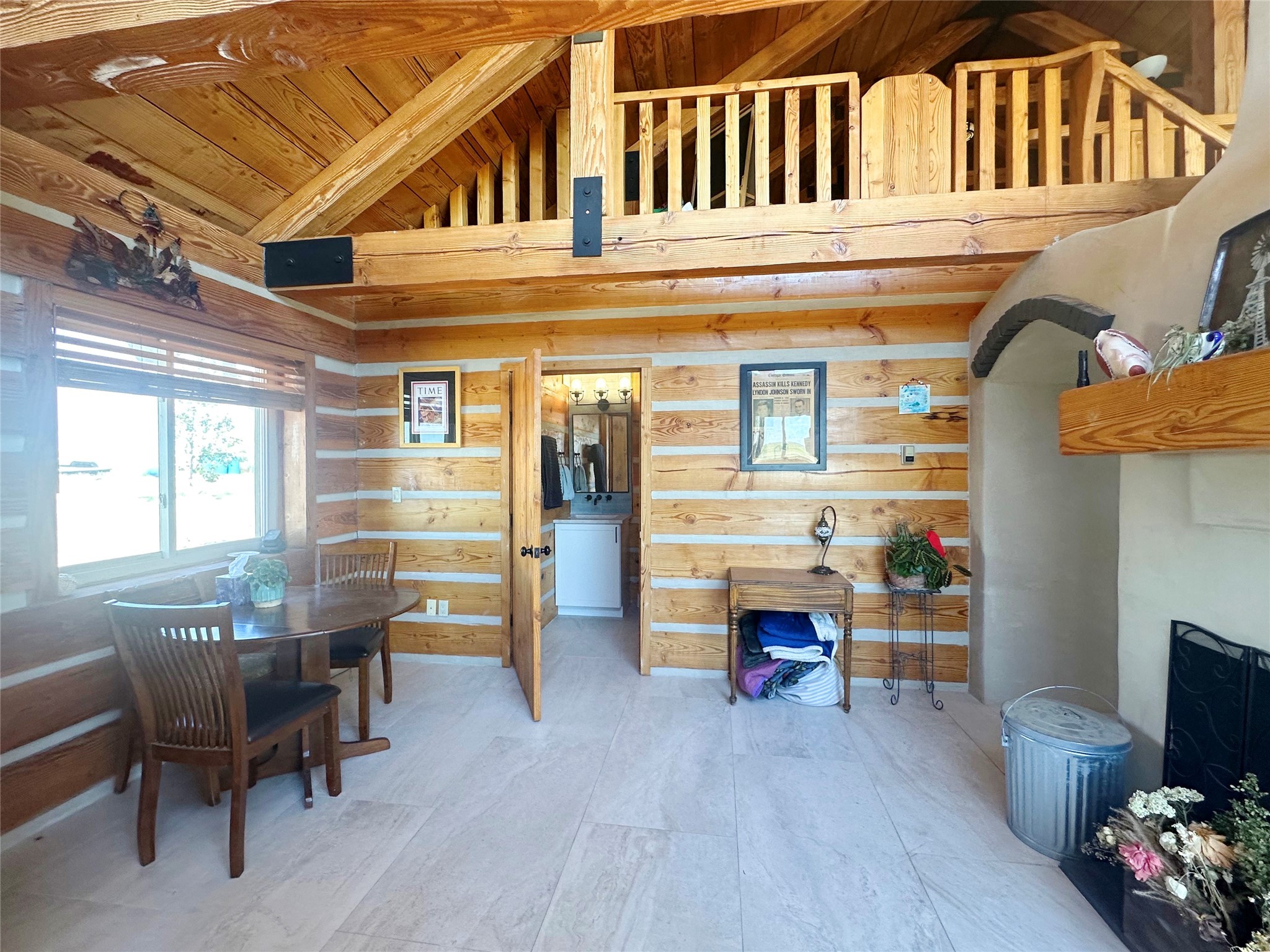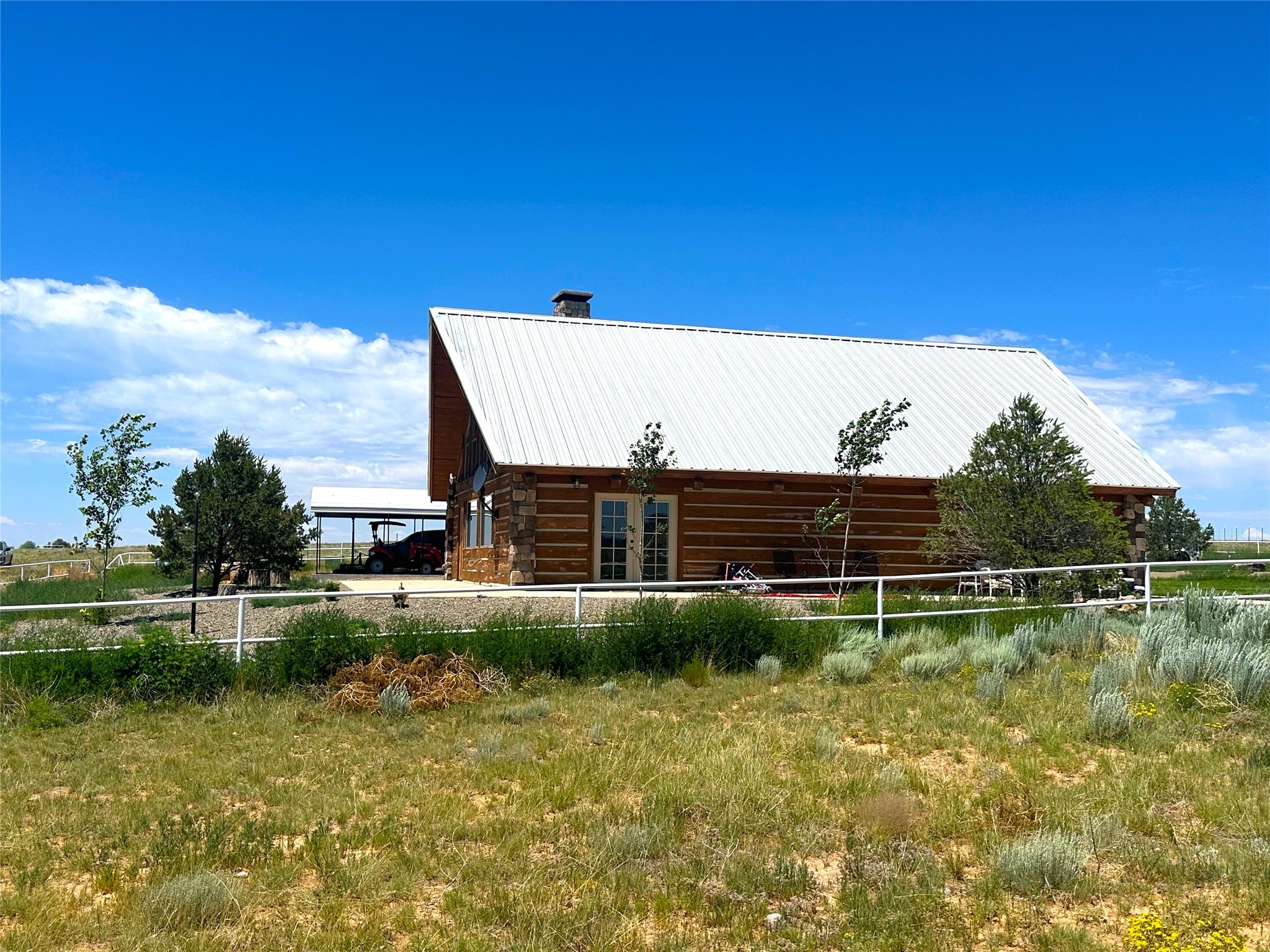 This two-story, 2,477 sq ft log cabin sits on 10 flat, usable acres in the open grasslands of Stanley, just 50 minutes from Santa Fe. The home features vaulted ceilings, modern finishes, and a practical layout with 3 bedrooms and 3 full bathrooms. The main level includes a primary suite with ensuite bath, a second full guest bath, an updated kitchen, and a central living area with a two-way fireplace and radiant floor heating. South-facing windows provide abundant natural light and support passive solar. Upstairs, a loft-style landing leads to two additional bedrooms and a full bathroom. A covered carport offers sheltered parking and extra storage. The surrounding acreage is open and accessible, with wide-ranging views in every direction. Whether you're looking for a full-time residence or a comfortable retreat from the city, this property is ready to welcome you home.