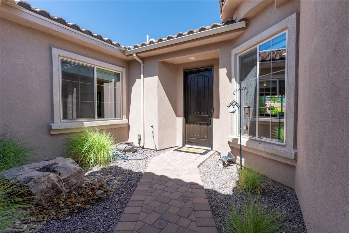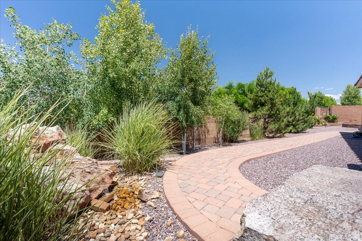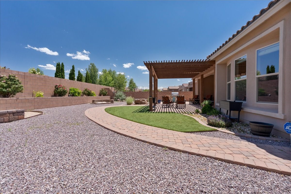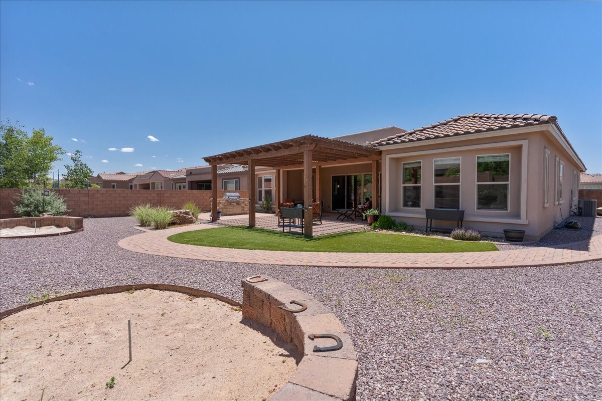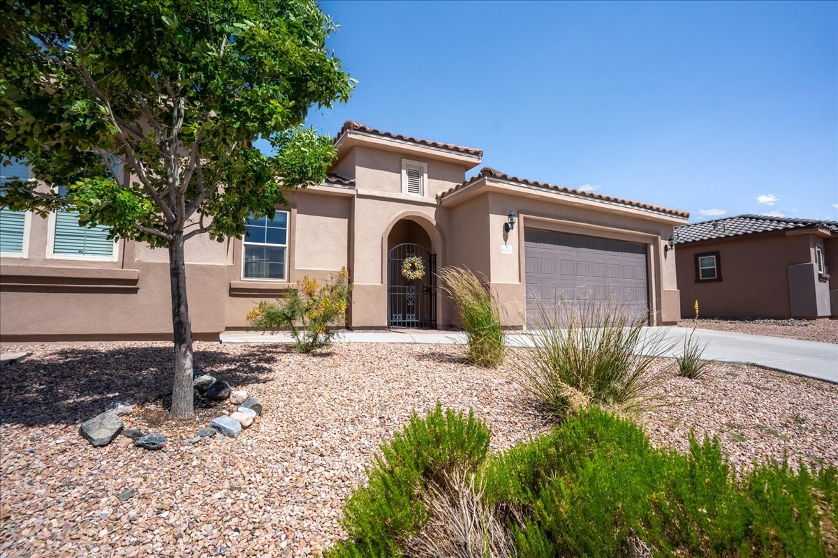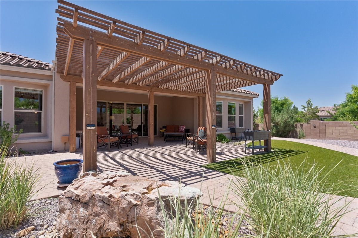 Discover the perfect blend of elegance and comfort in this thoughtfully designed 2-bedroom, 2.5-bath home in the Las Soleras subdivision. The spacious primary suite is thoughtfully separated from the guest suite, open office/den and powder room. Step into the welcoming courtyard with a soothing water feature that sets the tone for the serene ambiance throughout. Inside, the open-concept great room boasts a coffered ceiling, built-in speakers, open glass shelving and recessed lighting which flows seamlessly into the culinary kitchen, complete with a generous island -- ideal for entertaining. Butlers pantry leads to the separate laundry room and 2 car garage. A formal dining room provides additional space for hosting and gathering. Outdoors, enjoy the best of Santa Fe living with a lattice patio cover, built-in BBQ, horseshoe pits and two more tranquil water features in the beautifully landscaped backyard. A direct access two-car garage plus a separate cart garage offers ample space for vehicles, hobbies, or storage. This home combines indoor luxury with outdoor charm -- a rare find in a coveted setting. Close to trails, shopping, restaurants, Presbyterian Hospital and Nexus Health.