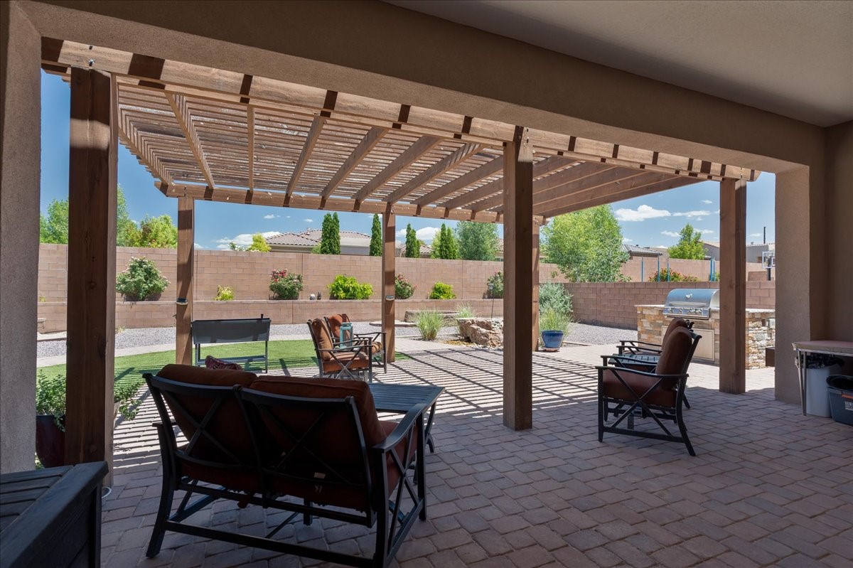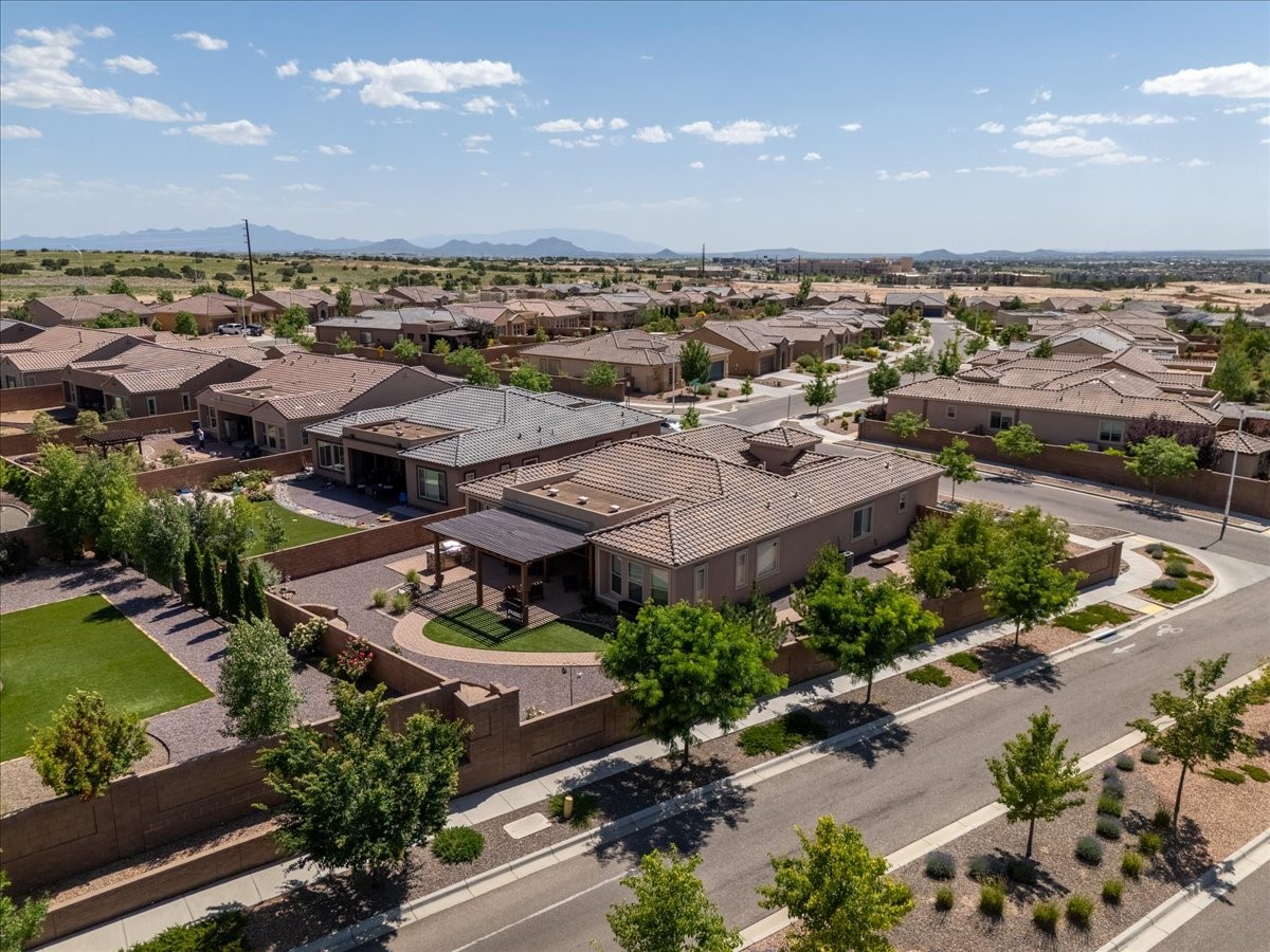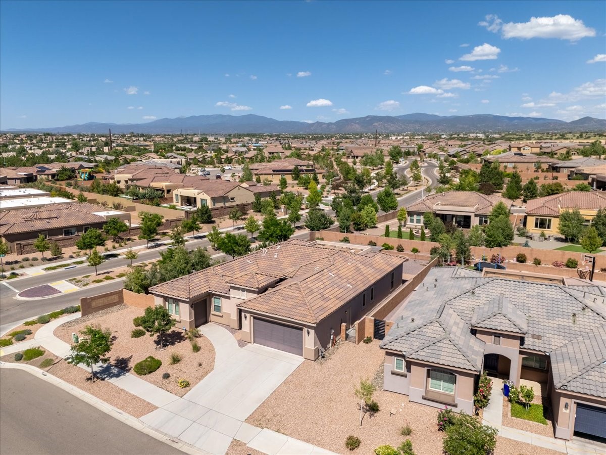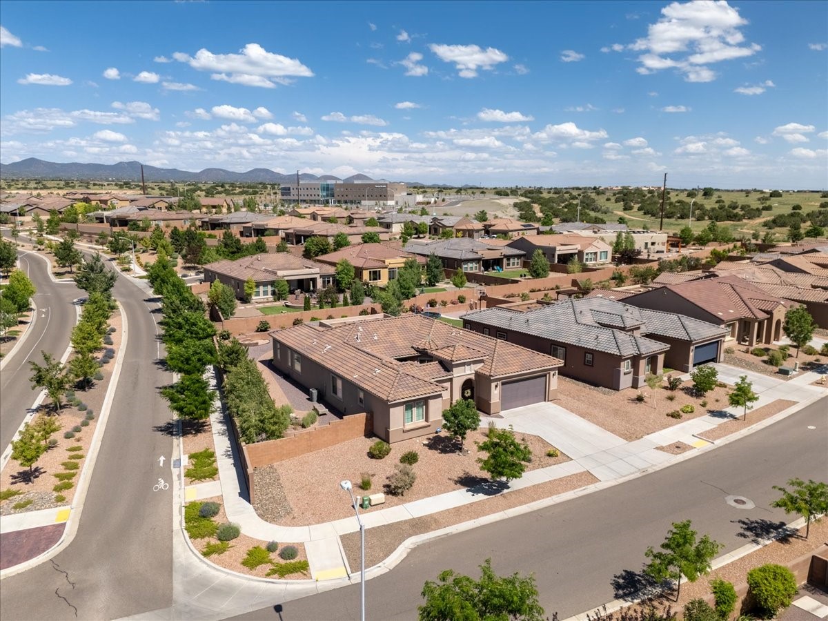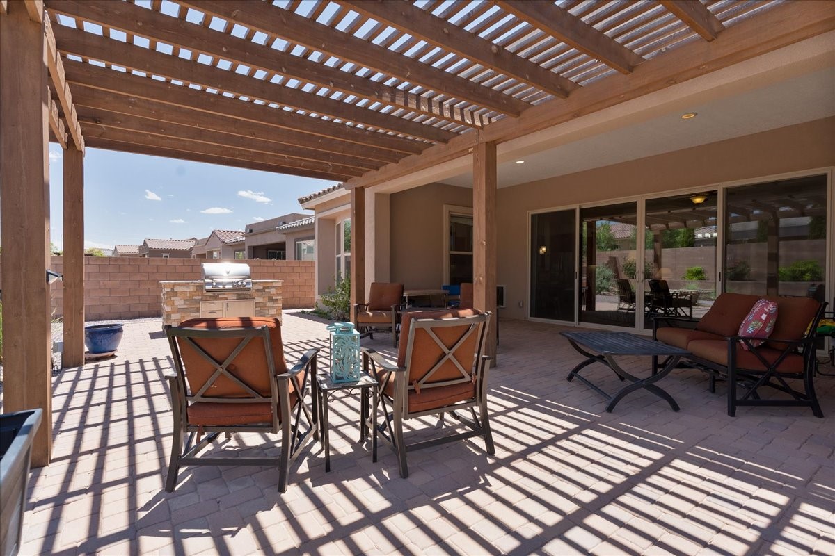 Discover the perfect blend of elegance and comfort in this thoughtfully designed 2-bedroom, 2.5-bath home in the Las Soleras subdivision. The spacious primary suite is thoughtfully separated from the guest suite, open office/den and powder room. Step into the welcoming courtyard with a soothing water feature that sets the tone for the serene ambiance throughout. Inside, the open-concept great room boasts a coffered ceiling, built-in speakers, open glass shelving and recessed lighting which flows seamlessly into the culinary kitchen, complete with a generous island -- ideal for entertaining. Butlers pantry leads to the separate laundry room and 2 car garage. A formal dining room provides additional space for hosting and gathering. Outdoors, enjoy the best of Santa Fe living with a lattice patio cover, built-in BBQ, horseshoe pits and two more tranquil water features in the beautifully landscaped backyard. A direct access two-car garage plus a separate cart garage offers ample space for vehicles, hobbies, or storage. This home combines indoor luxury with outdoor charm -- a rare find in a coveted setting. Close to trails, shopping, restaurants, Presbyterian Hospital and Nexus Health.