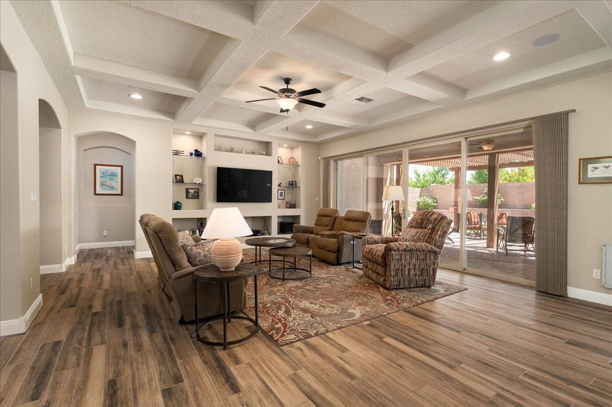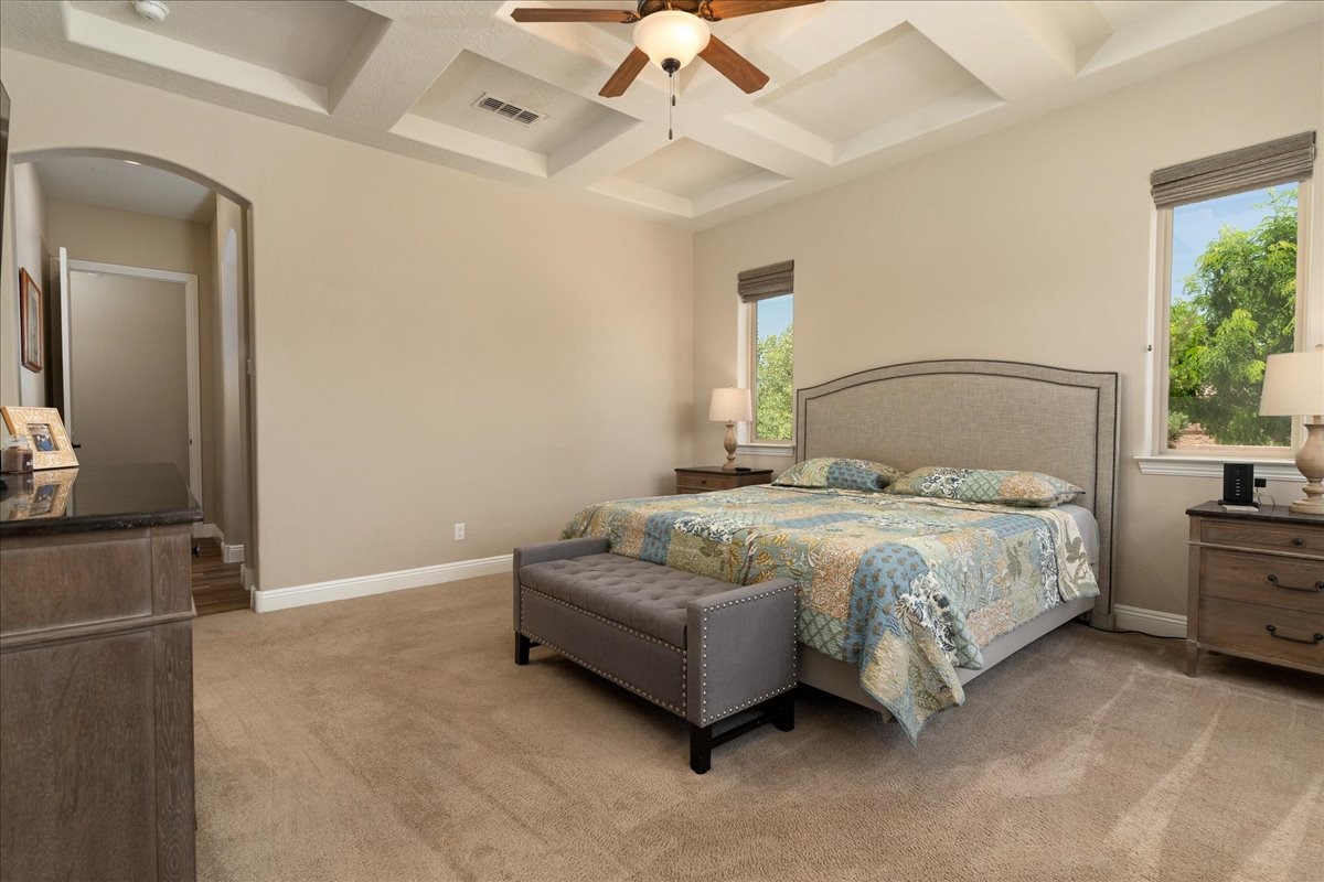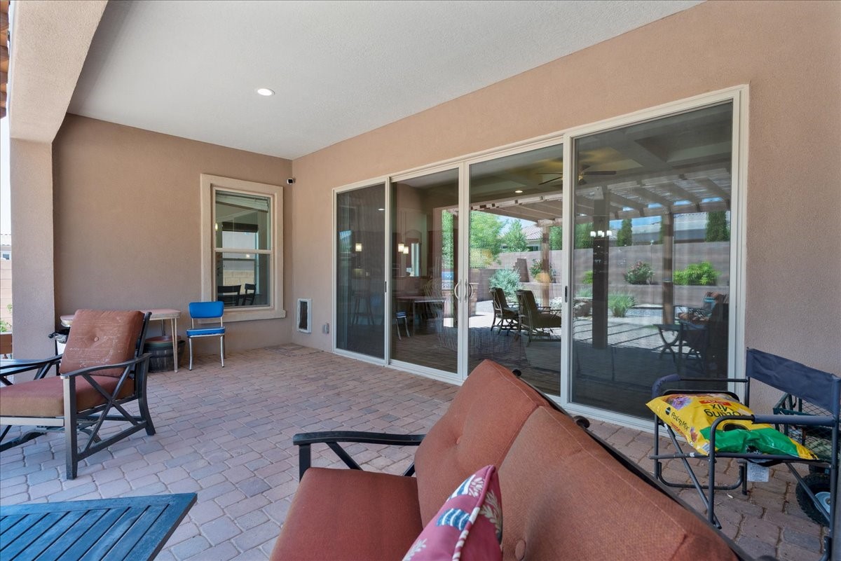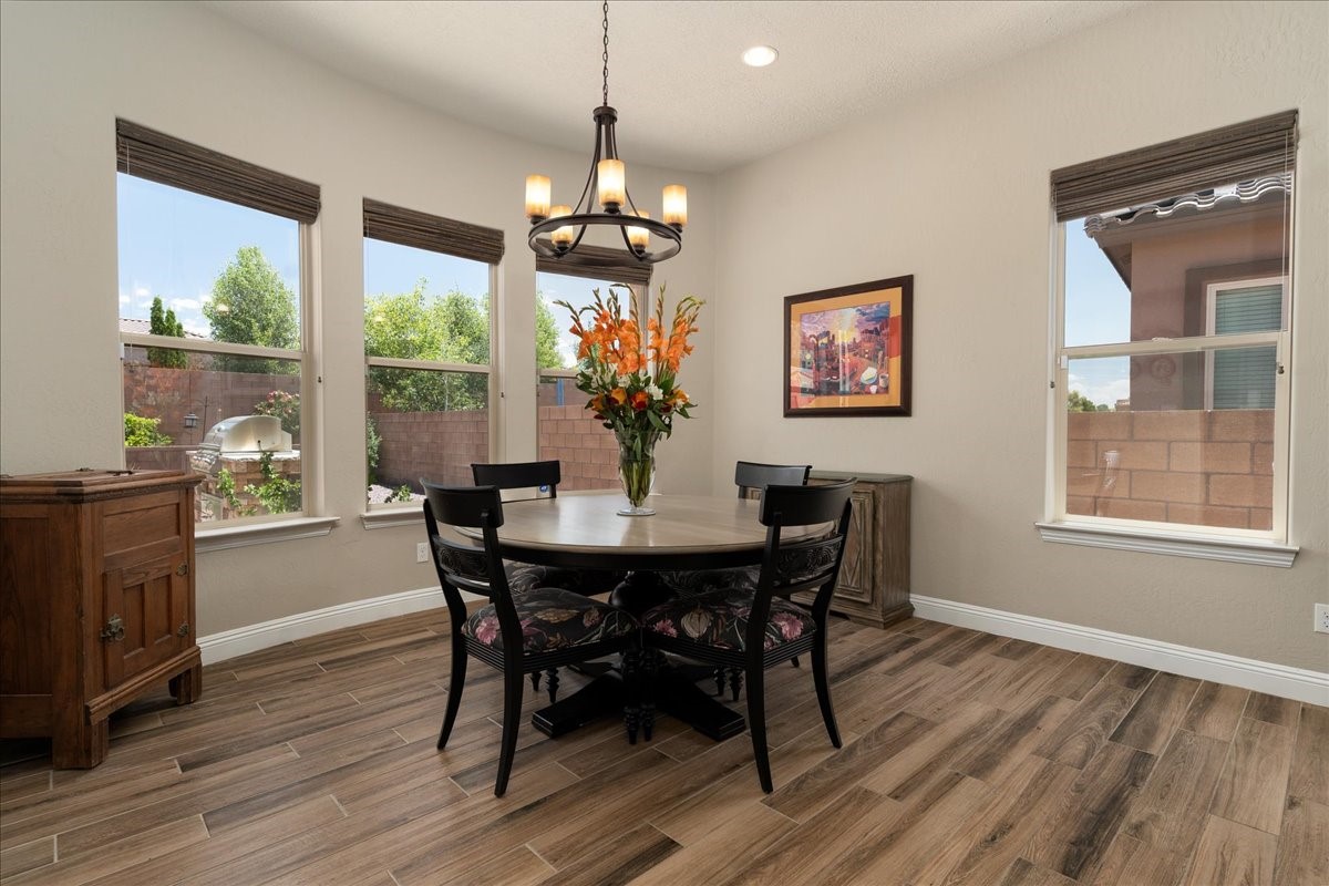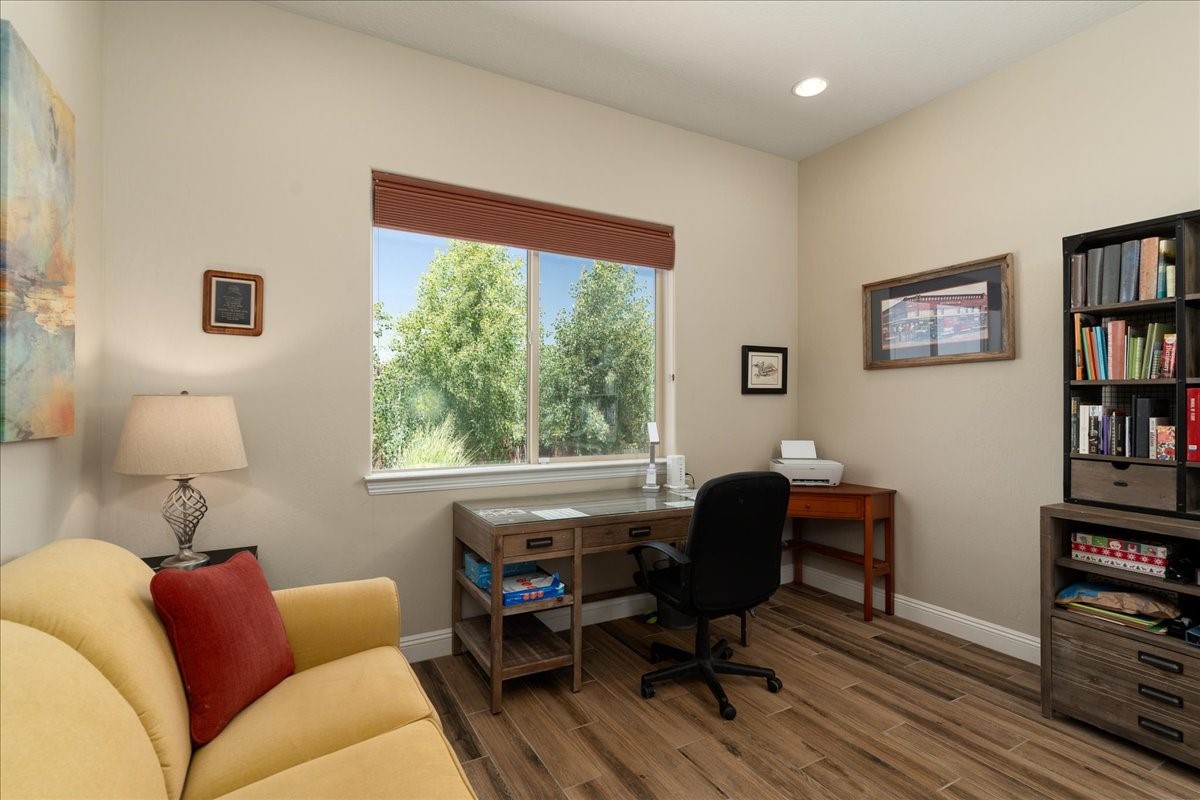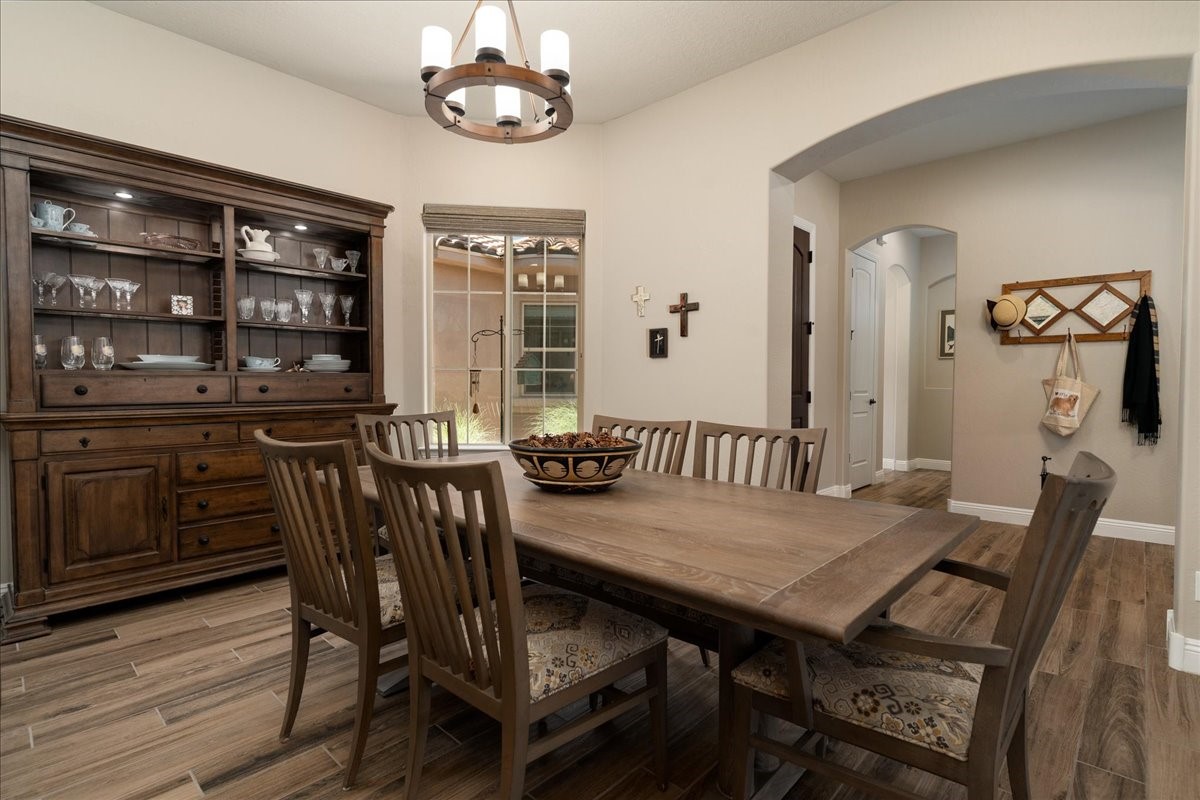 Discover the perfect blend of elegance and comfort in this thoughtfully designed 2-bedroom, 2.5-bath home in the Las Soleras subdivision. The spacious primary suite is thoughtfully separated from the guest suite, open office/den and powder room. Step into the welcoming courtyard with a soothing water feature that sets the tone for the serene ambiance throughout. Inside, the open-concept great room boasts a coffered ceiling, built-in speakers, open glass shelving and recessed lighting which flows seamlessly into the culinary kitchen, complete with a generous island -- ideal for entertaining. Butlers pantry leads to the separate laundry room and 2 car garage. A formal dining room provides additional space for hosting and gathering. Outdoors, enjoy the best of Santa Fe living with a lattice patio cover, built-in BBQ, horseshoe pits and two more tranquil water features in the beautifully landscaped backyard. A direct access two-car garage plus a separate cart garage offers ample space for vehicles, hobbies, or storage. This home combines indoor luxury with outdoor charm -- a rare find in a coveted setting. Close to trails, shopping, restaurants, Presbyterian Hospital and Nexus Health.