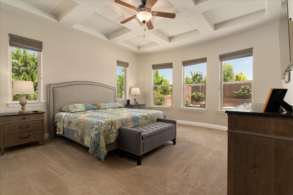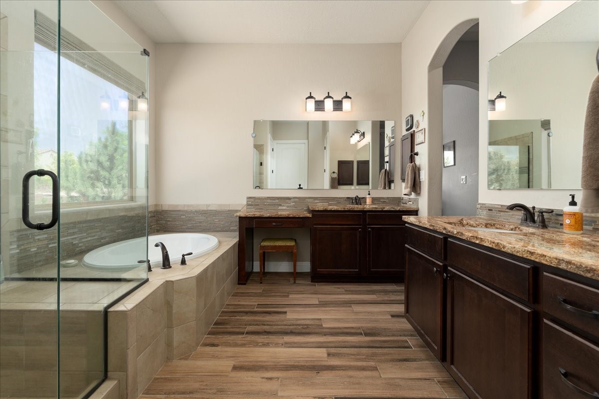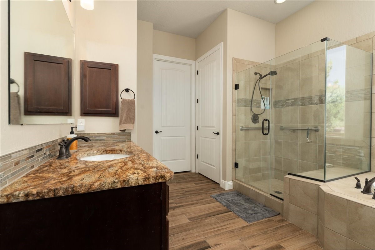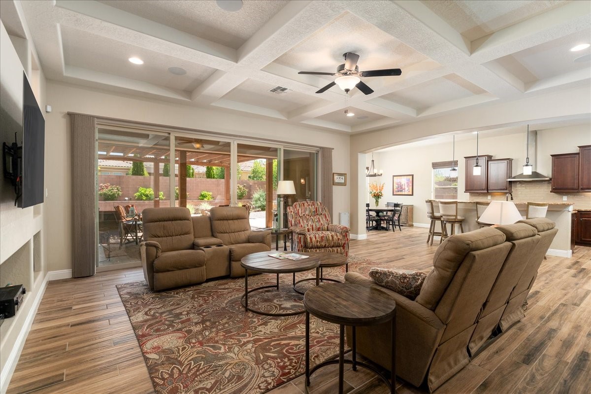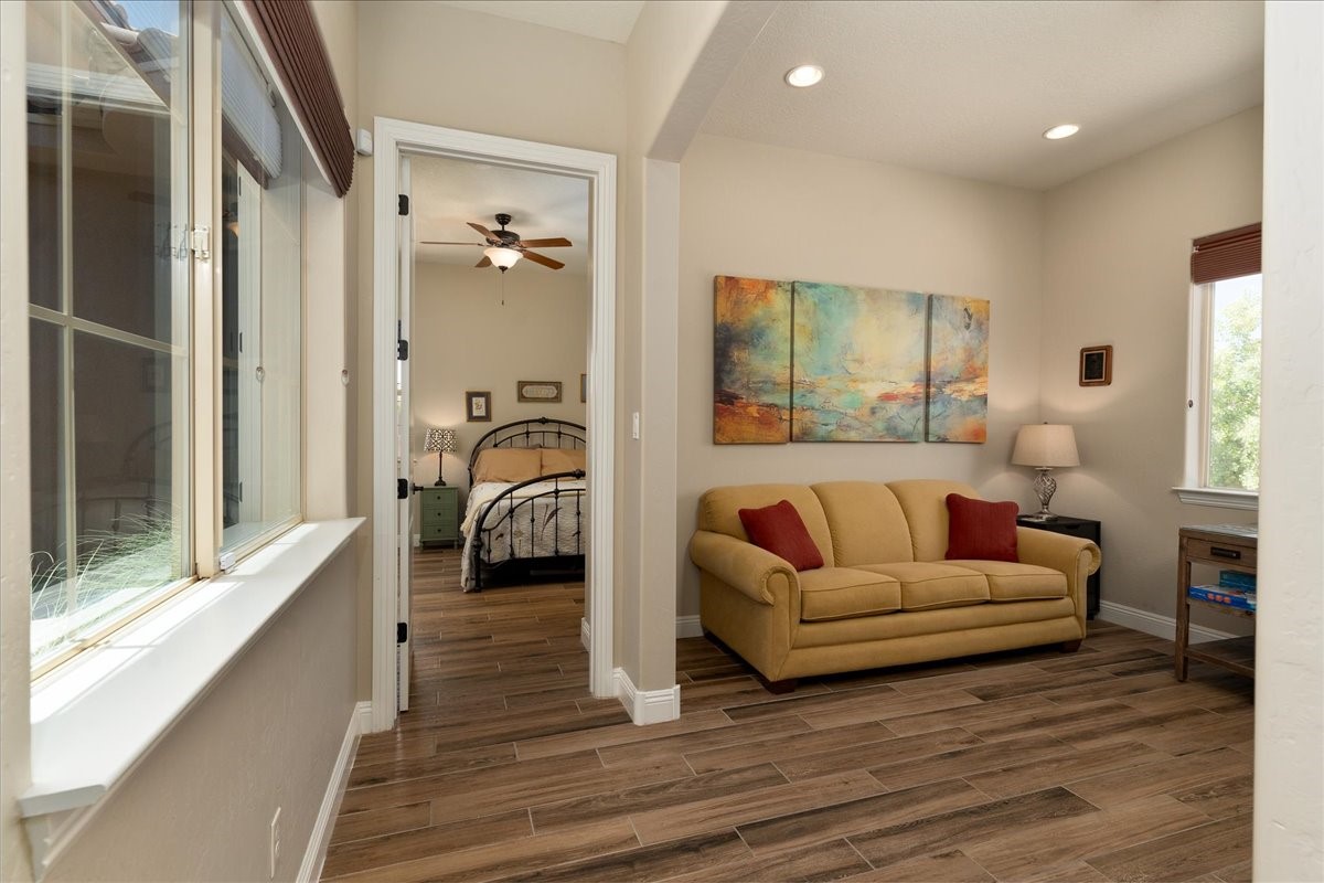 Discover the perfect blend of elegance and comfort in this thoughtfully designed 2-bedroom, 2.5-bath home in the Las Soleras subdivision. The spacious primary suite is thoughtfully separated from the guest suite, open office/den and powder room. Step into the welcoming courtyard with a soothing water feature that sets the tone for the serene ambiance throughout. Inside, the open-concept great room boasts a coffered ceiling, built-in speakers, open glass shelving and recessed lighting which flows seamlessly into the culinary kitchen, complete with a generous island -- ideal for entertaining. Butlers pantry leads to the separate laundry room and 2 car garage. A formal dining room provides additional space for hosting and gathering. Outdoors, enjoy the best of Santa Fe living with a lattice patio cover, built-in BBQ, horseshoe pits and two more tranquil water features in the beautifully landscaped backyard. A direct access two-car garage plus a separate cart garage offers ample space for vehicles, hobbies, or storage. This home combines indoor luxury with outdoor charm -- a rare find in a coveted setting. Close to trails, shopping, restaurants, Presbyterian Hospital and Nexus Health.