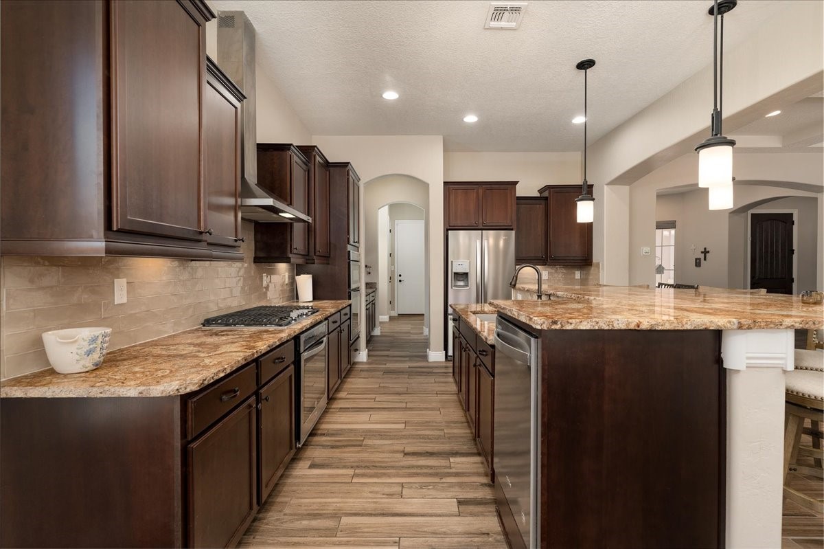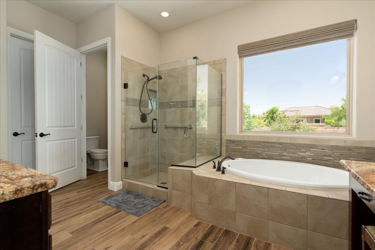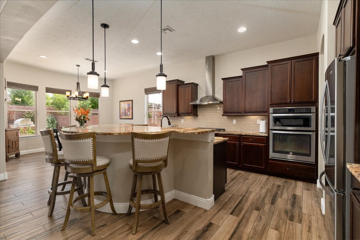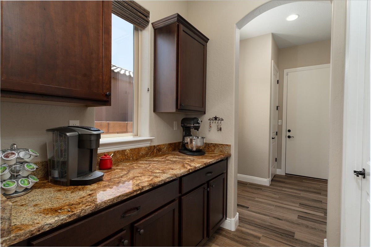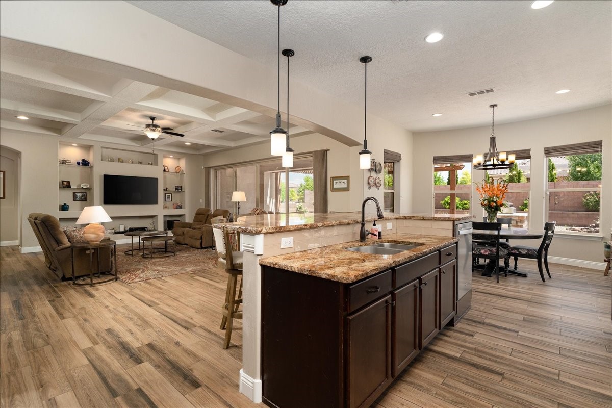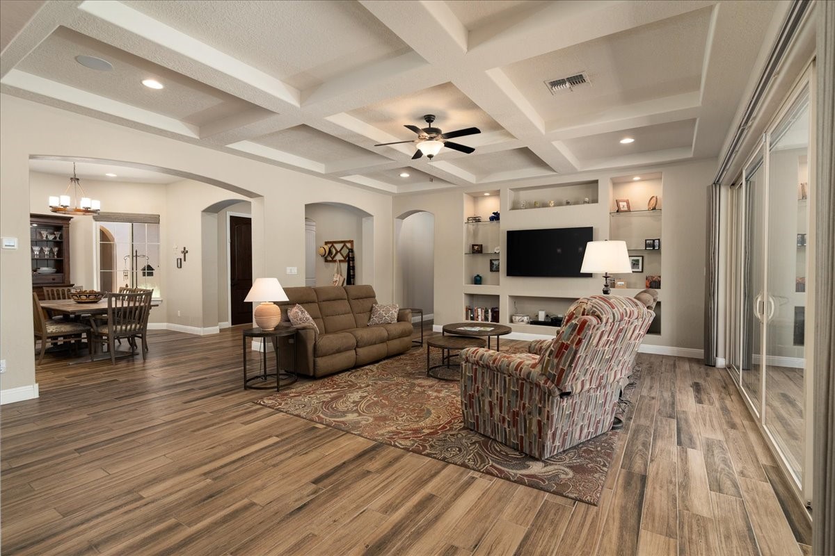 Discover the perfect blend of elegance and comfort in this thoughtfully designed 2-bedroom, 2.5-bath home in the Las Soleras subdivision. The spacious primary suite is thoughtfully separated from the guest suite, open office/den and powder room. Step into the welcoming courtyard with a soothing water feature that sets the tone for the serene ambiance throughout. Inside, the open-concept great room boasts a coffered ceiling, built-in speakers, open glass shelving and recessed lighting which flows seamlessly into the culinary kitchen, complete with a generous island -- ideal for entertaining. Butlers pantry leads to the separate laundry room and 2 car garage. A formal dining room provides additional space for hosting and gathering. Outdoors, enjoy the best of Santa Fe living with a lattice patio cover, built-in BBQ, horseshoe pits and two more tranquil water features in the beautifully landscaped backyard. A direct access two-car garage plus a separate cart garage offers ample space for vehicles, hobbies, or storage. This home combines indoor luxury with outdoor charm -- a rare find in a coveted setting. Close to trails, shopping, restaurants, Presbyterian Hospital and Nexus Health.