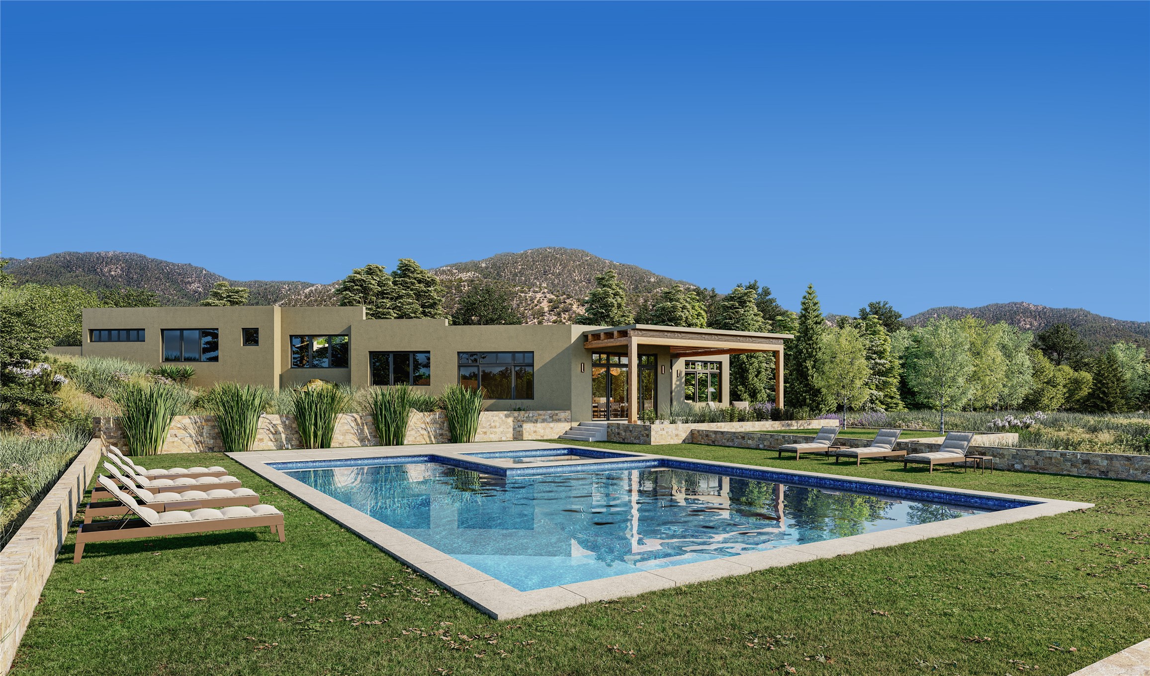 Luxury, breathtaking views and sophistication within Wilderness Gate by the awarding winning Woods Design Builders. One of the most extraordinary future homes in all of Santa Fe, this stunning To Be Built residence by Woods Design Builders excites and captivates with powerful architecture, stunning, expansive views mountain, city and sunset views. Permits took two years to obtain given the complexity of designing a home within this specific location, which best captures the unapparelled views to perfection. This stunning, 3,981 square foot masterpiece is ready to break ground today! Sited on a superior, elevated 2-acre view lot, this exquisite residence located within the gated Ponderosa neighborhood, within the Wilderness Gate, exemplifies the unique blend of sophisticated contemporary design with inherent Santa Fe warmth. Designed by the famed Lorn Tryk, with a grand open concept living experience and seamless surround view windows, this fabulous home stuns and can still be customized featuring a grand primary suite with views, two additional spacious ensuite bedrooms, plus an office and an exercise room or ideal media room and the ultimate state of the art kitchen. Ideal for entertaining, this Wilderness Gate tranquil retreat, delights with exceptional outdoor living areas, with a resort-style pool possible, though not included with the list purchase price. Minutes from the Plaza and steps away from Atalaya Mountain, St. Johns College, and the Dale Ball trail system, the team of Woods Design Builders is ready to customize this rare offering today.