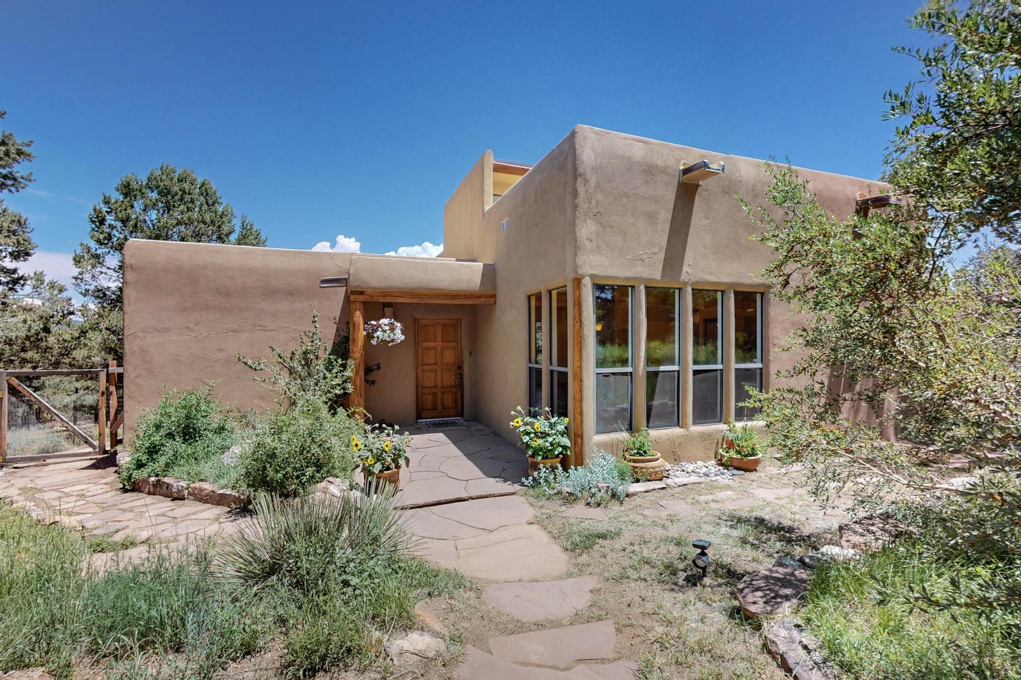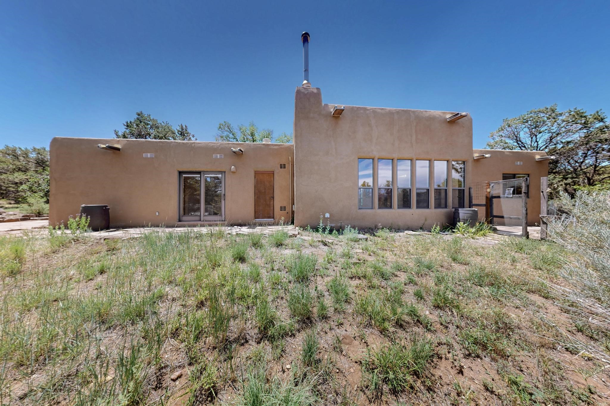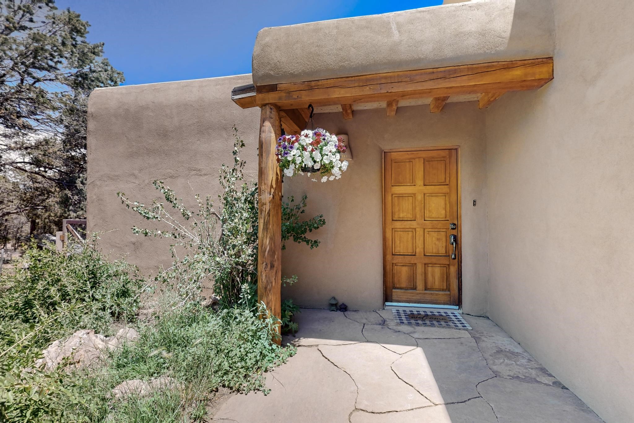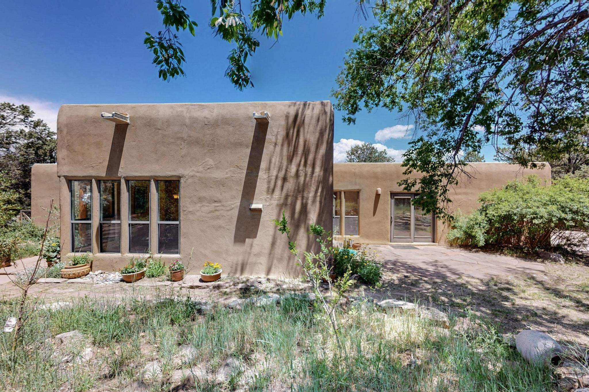 Offering absolutely stunning views of the Southern Rocky Mountains, this home and 5 acre property offers tranquil country living and is only ~15 minutes to the vibrant heart of downtown Santa Fe. This pueblo style two bedroom 2 bath home features exposed vigas, a stunning kiva fireplace, talavera tile accents, clearstory windows , and wonderful outdoor flagstone patio's. Other notable features include a newer TPO roof with transferable warranty, private well, radiant in floor heating, new water heater, and a couple of sheds for your storage needs. This amazing 5 acre property is very usable and can accommodate further development if desired.