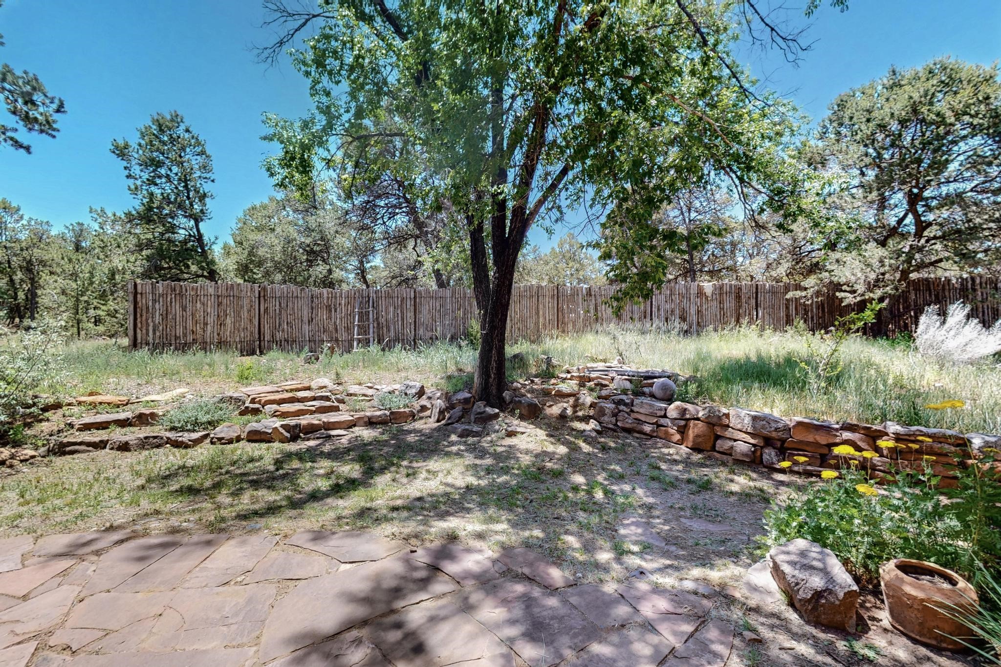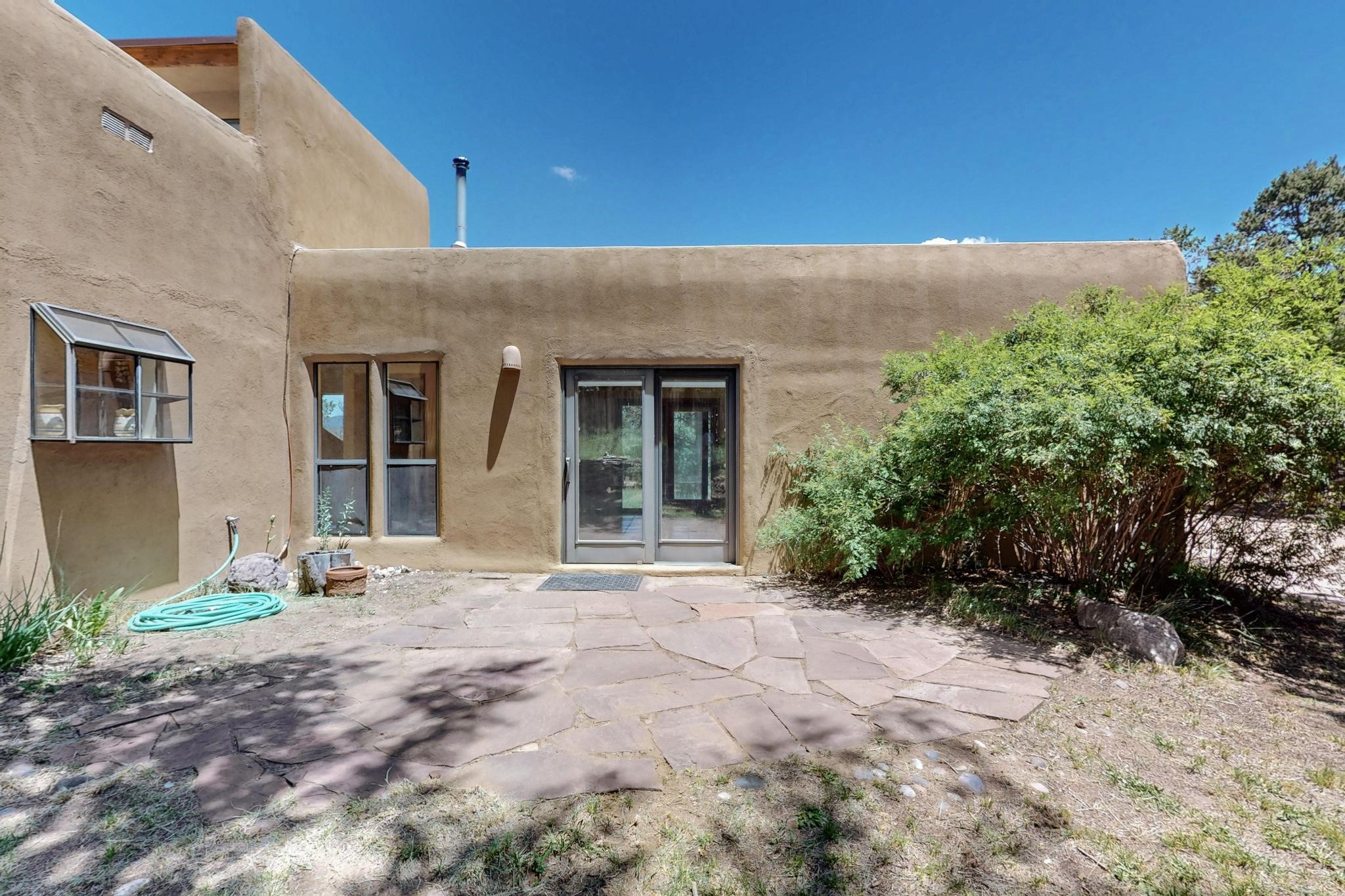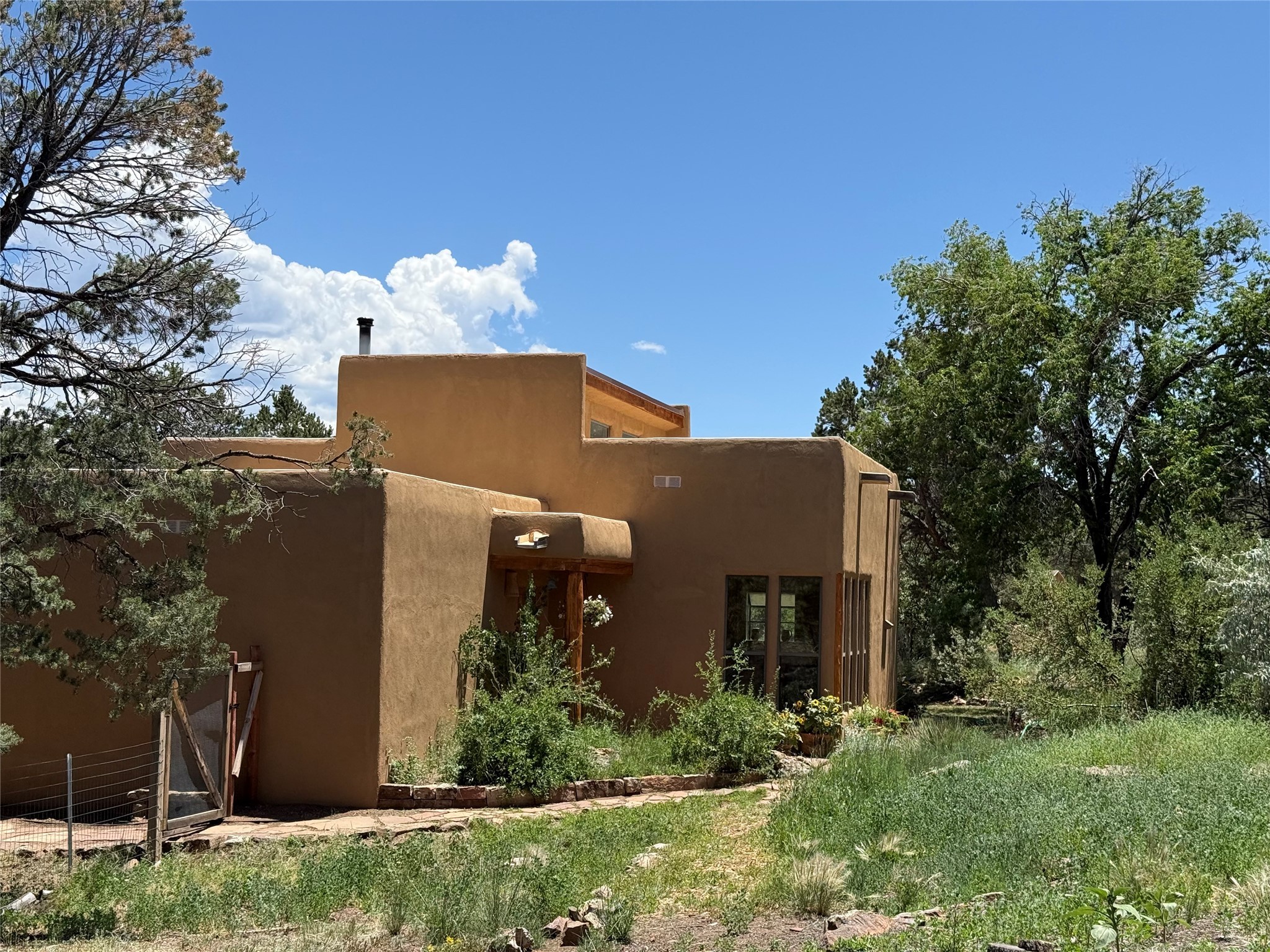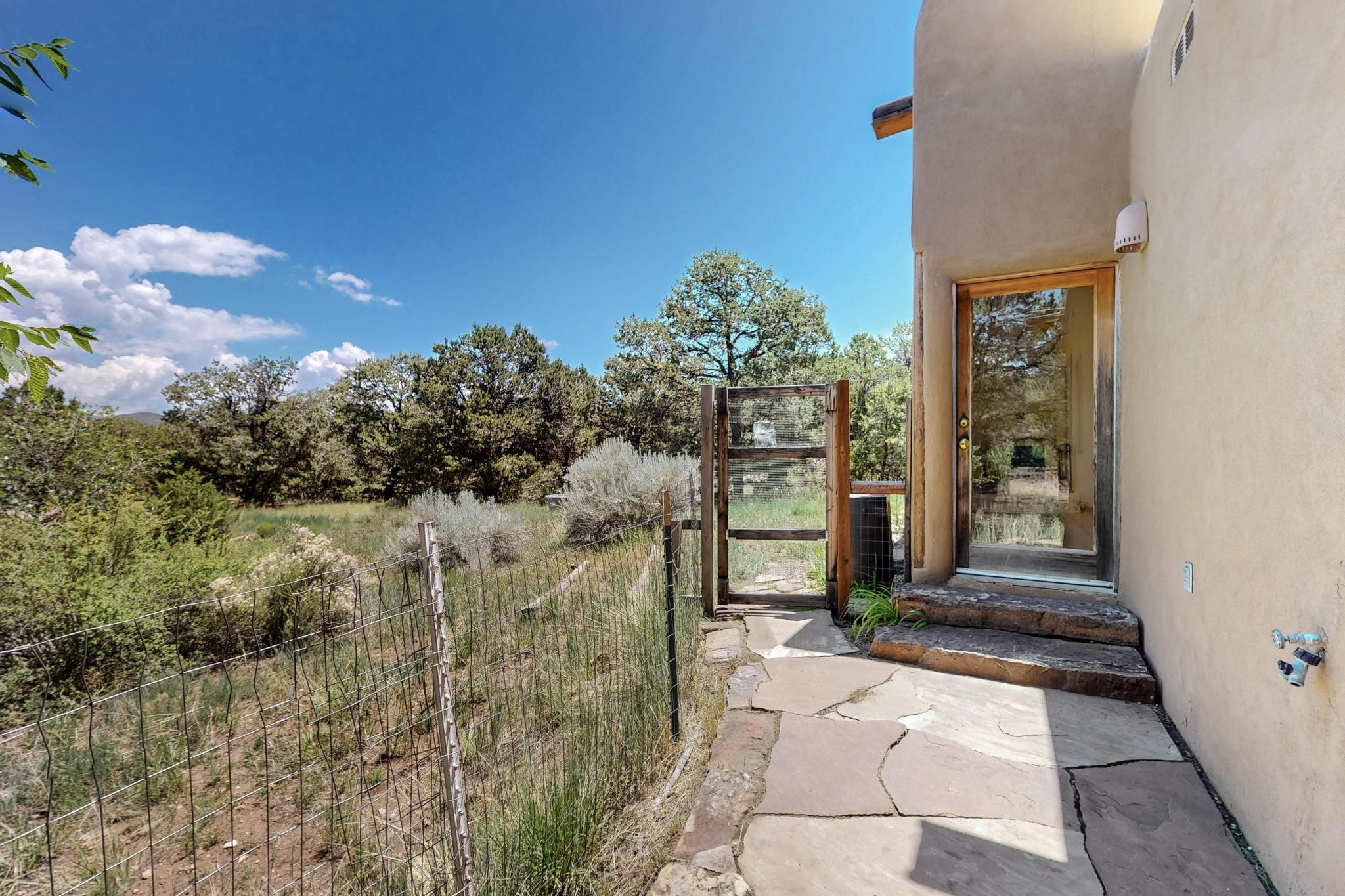 Offering absolutely stunning views of the Southern Rocky Mountains, this home and 5 acre property offers tranquil country living and is only ~15 minutes to the vibrant heart of downtown Santa Fe. This pueblo style two bedroom 2 bath home features exposed vigas, a stunning kiva fireplace, talavera tile accents, clearstory windows , and wonderful outdoor flagstone patio's. Other notable features include a newer TPO roof with transferable warranty, private well, radiant in floor heating, new water heater, and a couple of sheds for your storage needs. This amazing 5 acre property is very usable and can accommodate further development if desired.