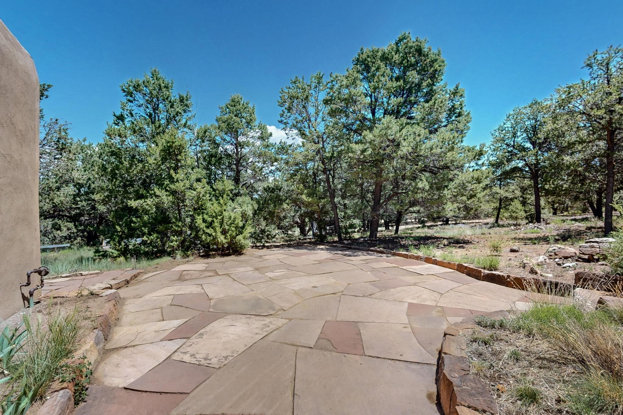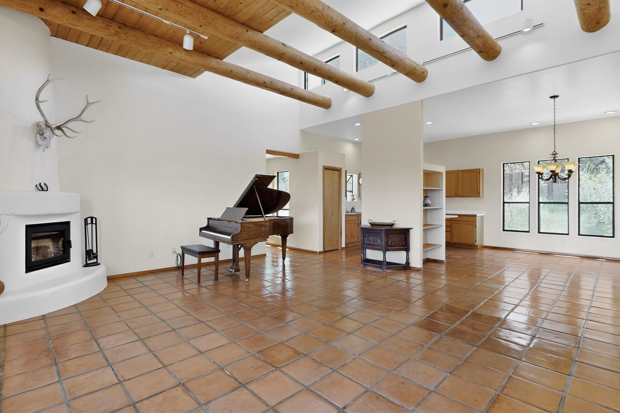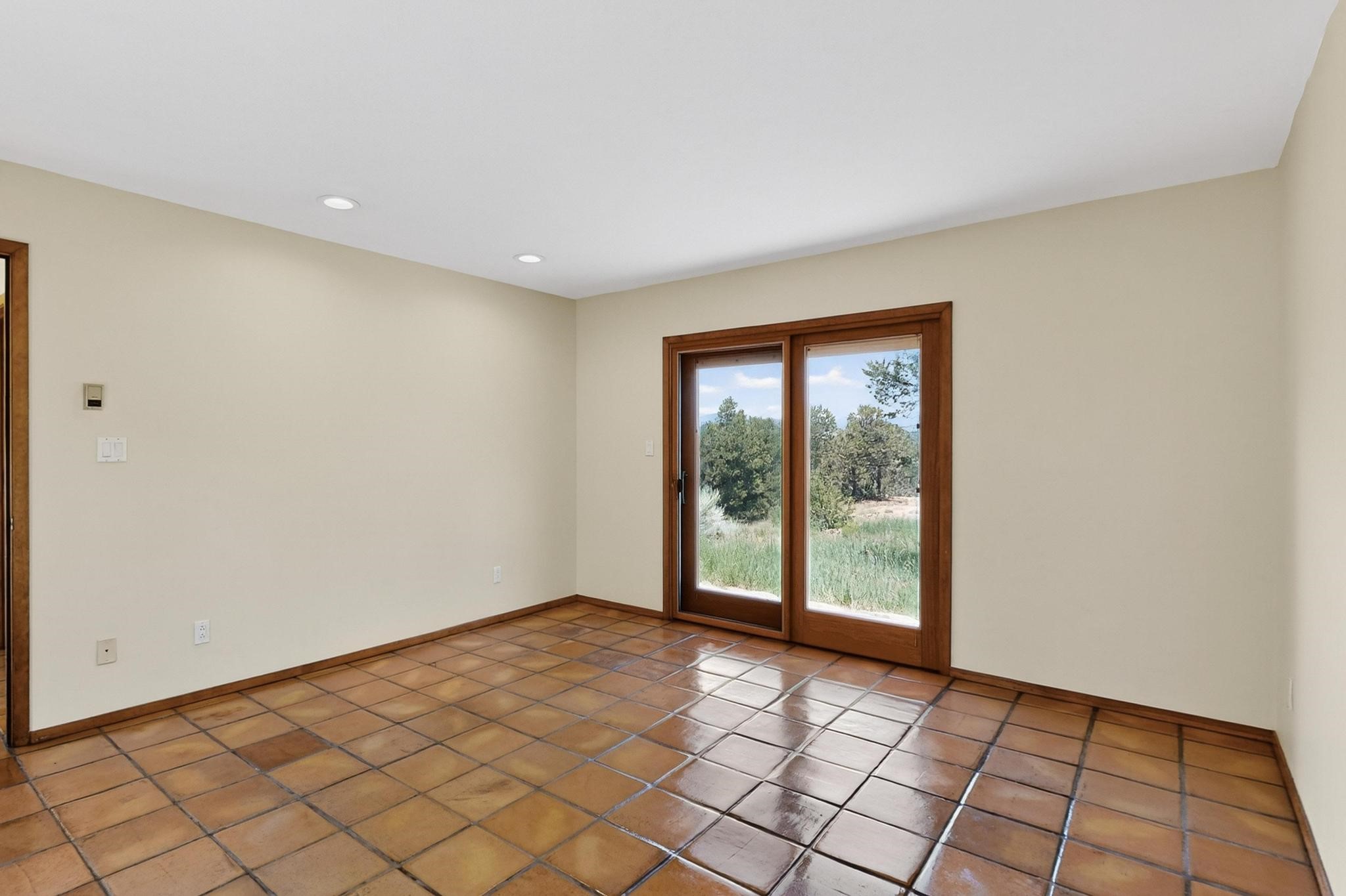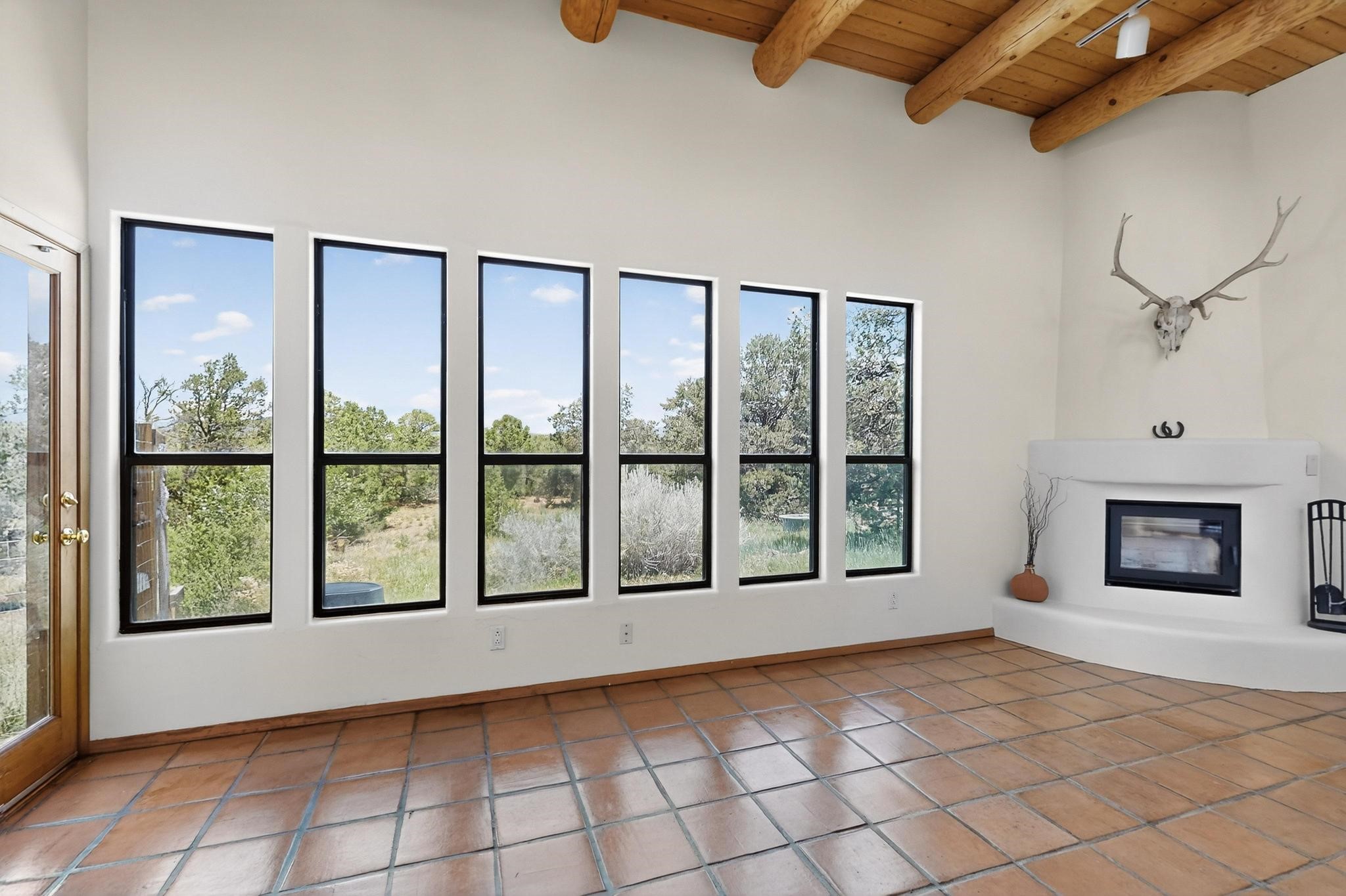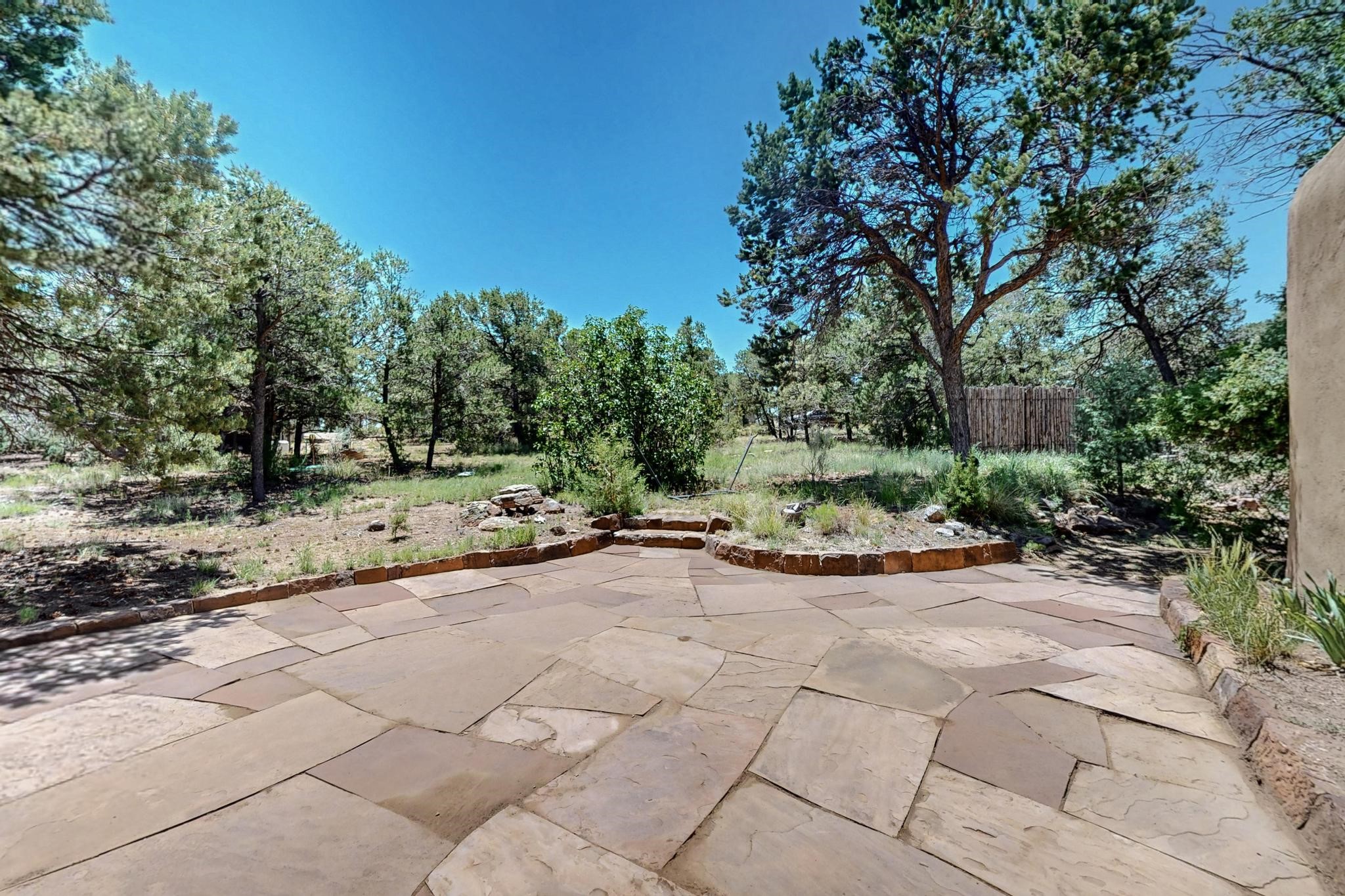 Offering absolutely stunning views of the Southern Rocky Mountains, this home and 5 acre property offers tranquil country living and is only ~15 minutes to the vibrant heart of downtown Santa Fe. This pueblo style two bedroom 2 bath home features exposed vigas, a stunning kiva fireplace, talavera tile accents, clearstory windows , and wonderful outdoor flagstone patio's. Other notable features include a newer TPO roof with transferable warranty, private well, radiant in floor heating, new water heater, and a couple of sheds for your storage needs. This amazing 5 acre property is very usable and can accommodate further development if desired.