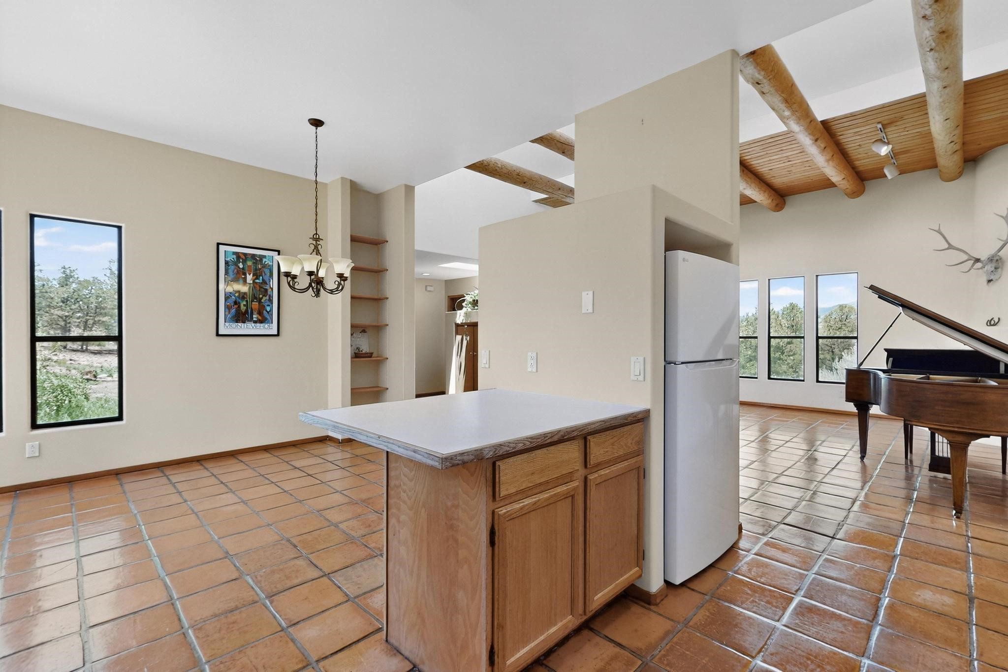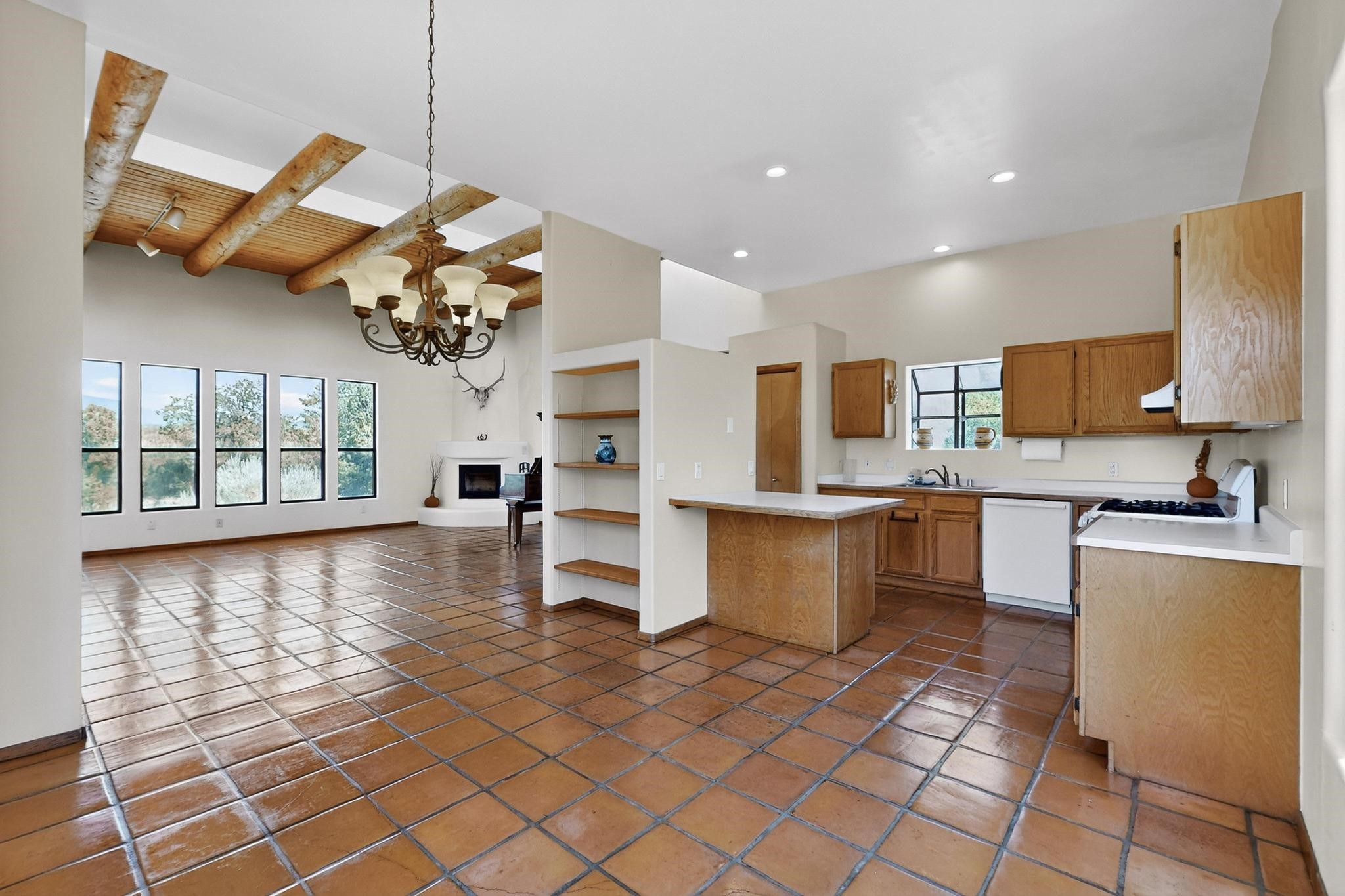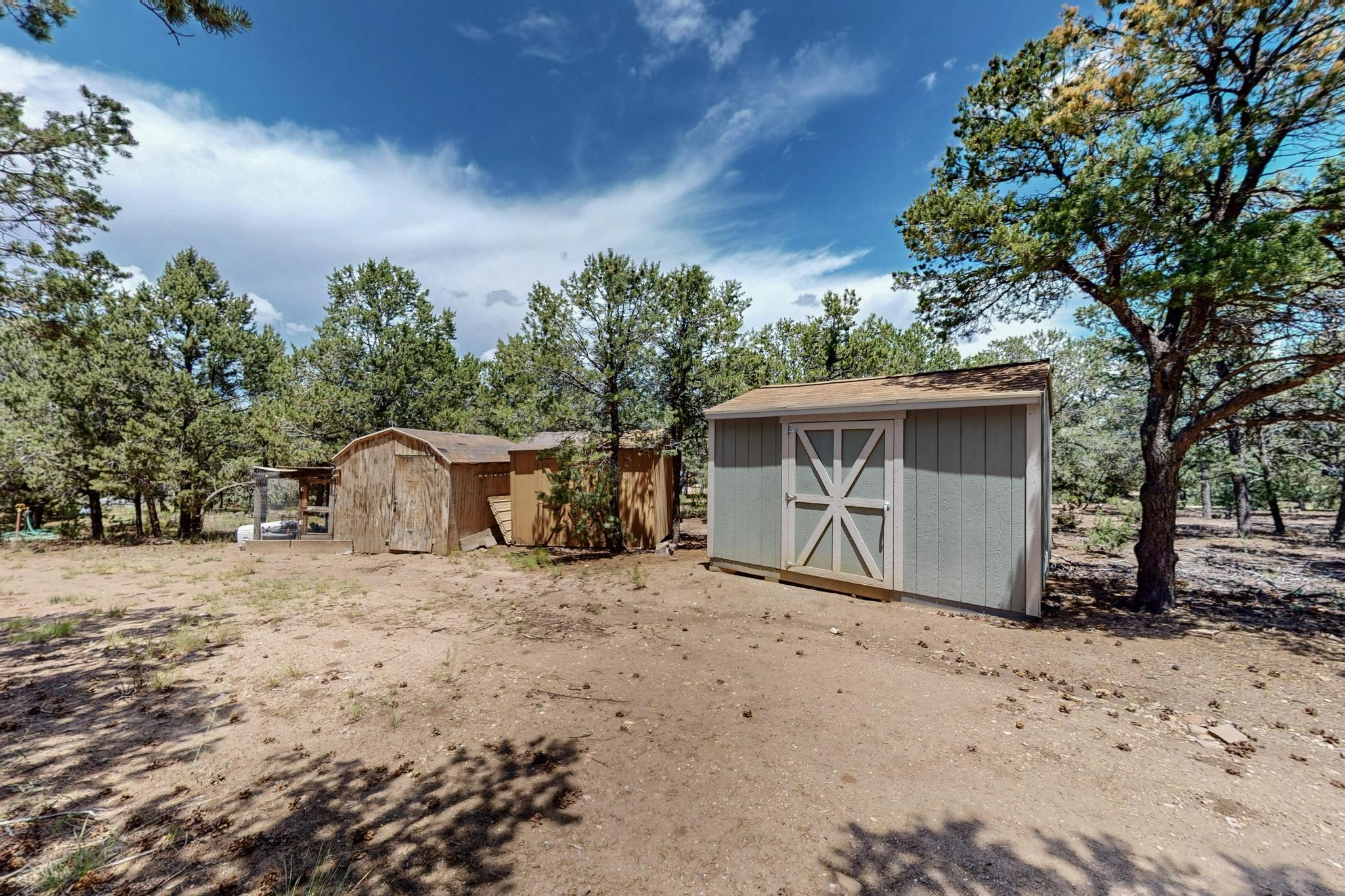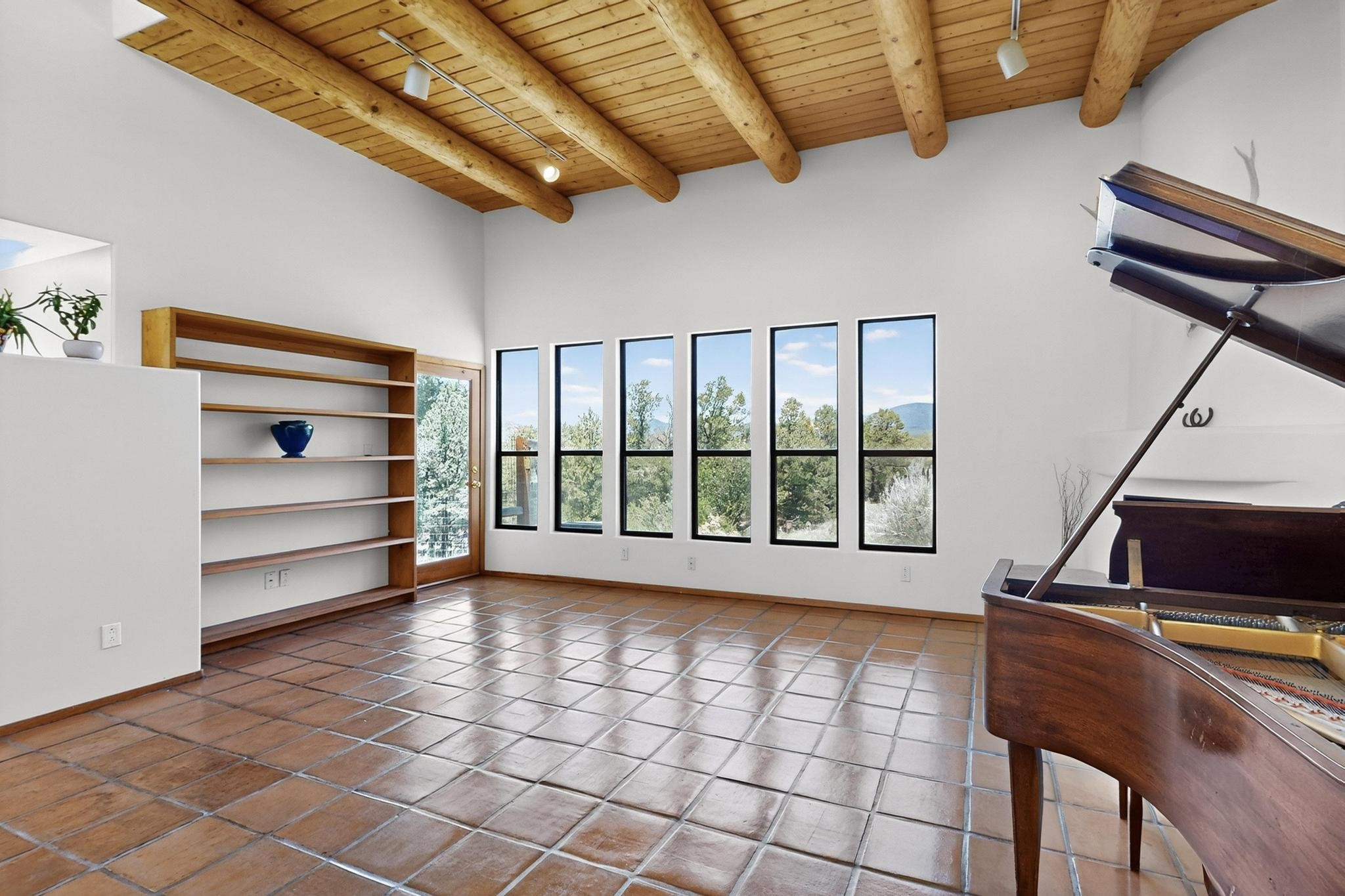 Offering absolutely stunning views of the Southern Rocky Mountains, this home and 5 acre property offers tranquil country living and is only ~15 minutes to the vibrant heart of downtown Santa Fe. This pueblo style two bedroom 2 bath home features exposed vigas, a stunning kiva fireplace, talavera tile accents, clearstory windows , and wonderful outdoor flagstone patio's. Other notable features include a newer TPO roof with transferable warranty, private well, radiant in floor heating, new water heater, and a couple of sheds for your storage needs. This amazing 5 acre property is very usable and can accommodate further development if desired.