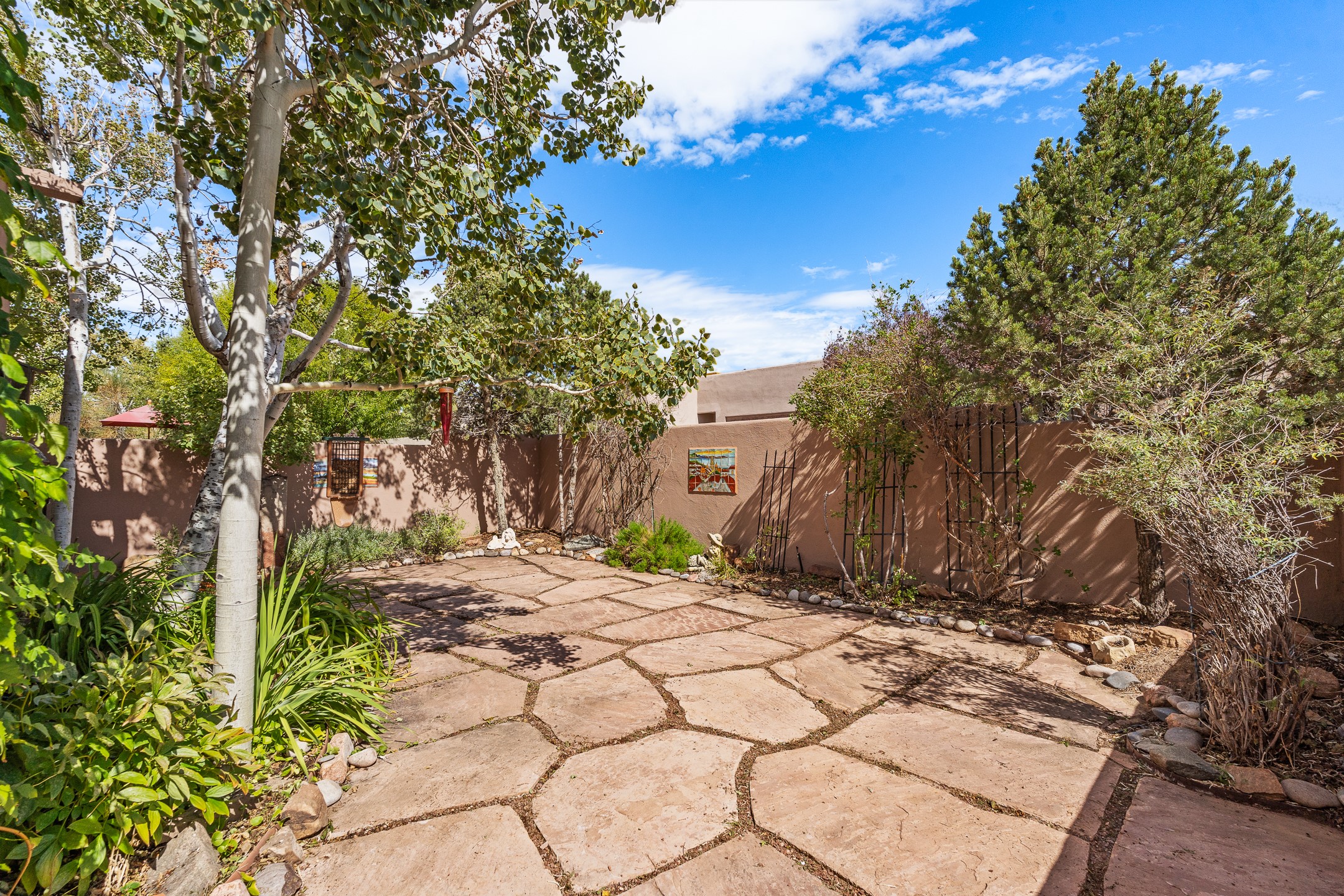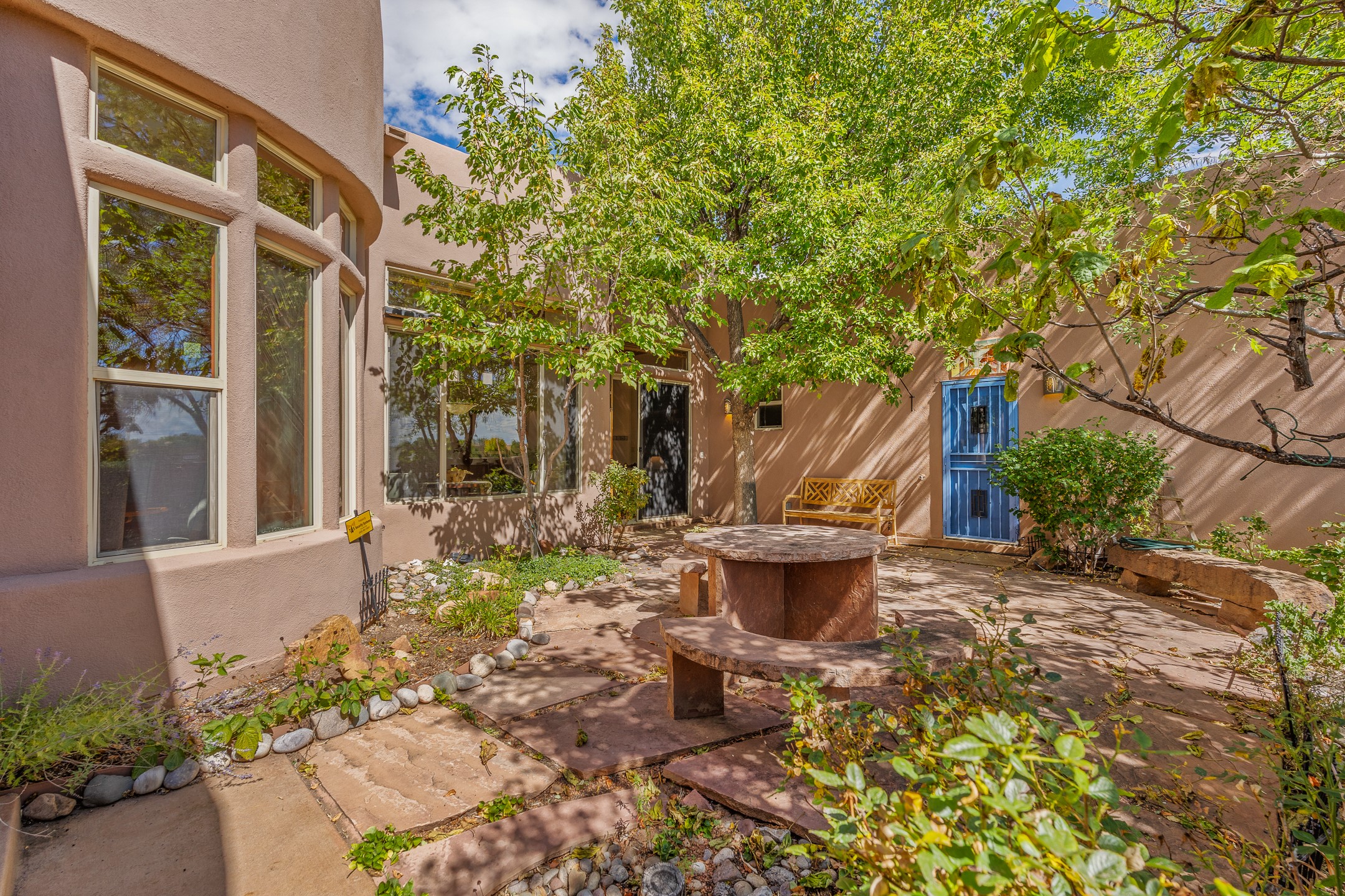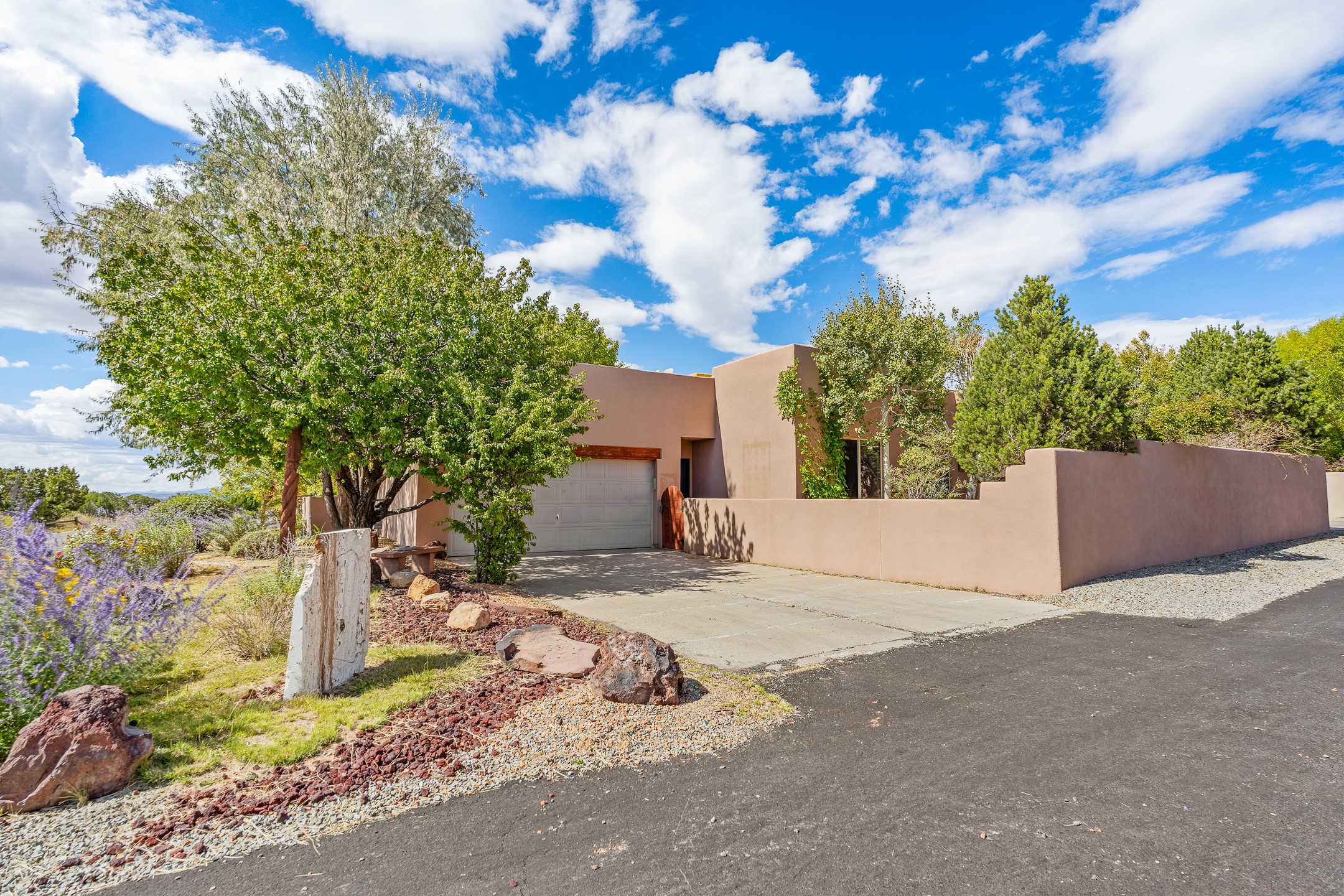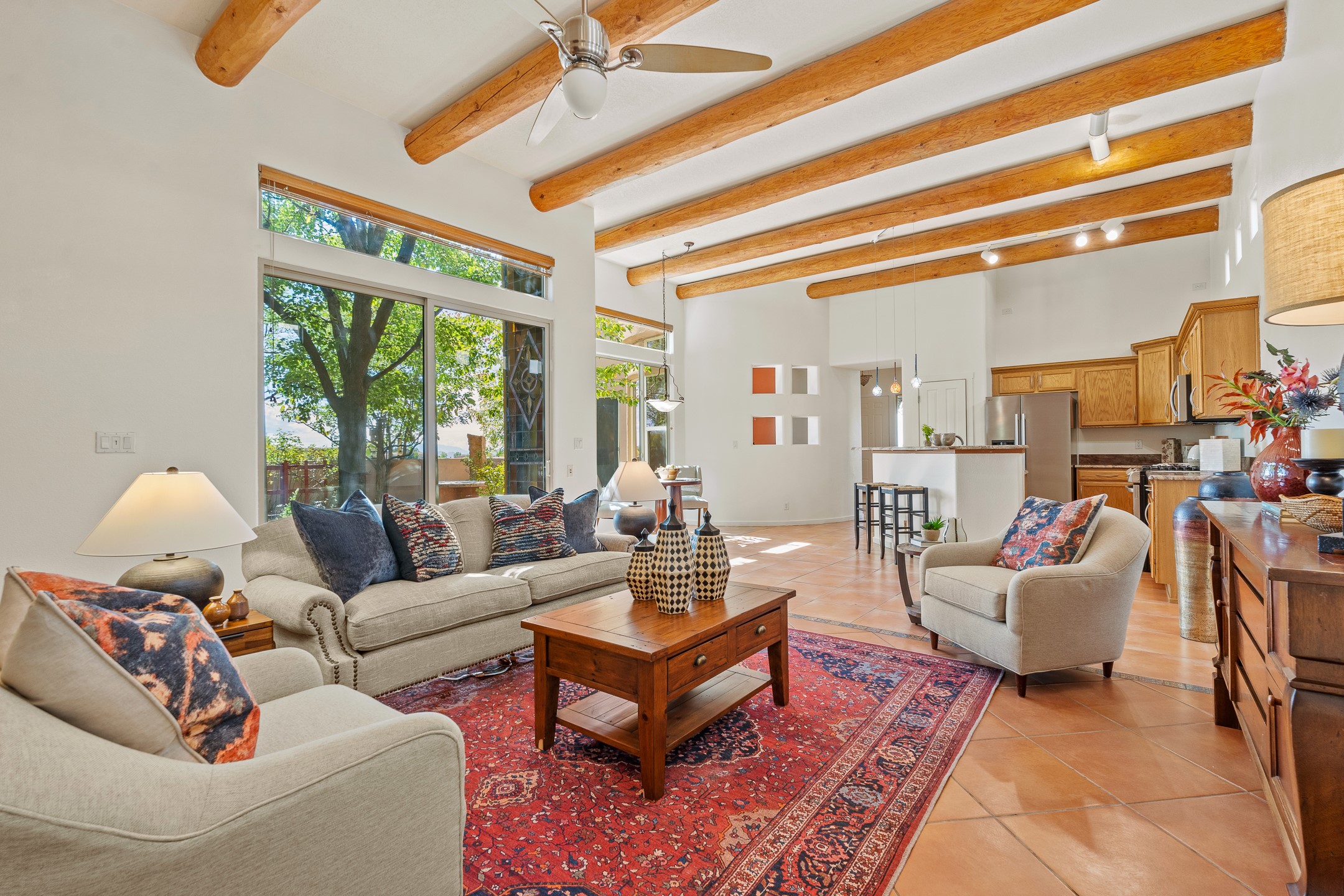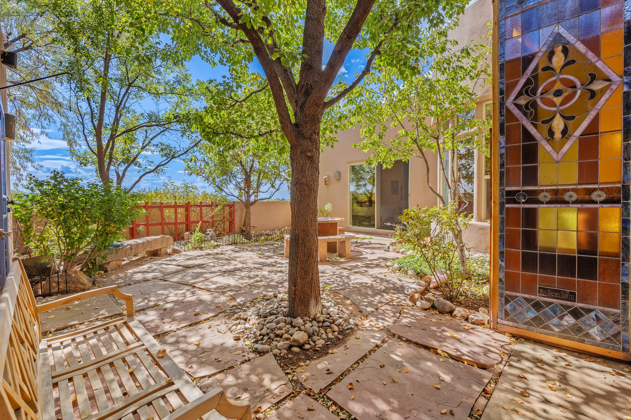 Welcome to this spacious 2,291 sq. ft. single-level home in the sought-after Windmill Ridge neighborhood of Rancho Viejo. Built in 2001, this thoughtfully designed residence offers 3 bedrooms plus an office, 2 bathrooms, 2 courtyards, and a 2-car garage, blending comfort and convenience with timeless Santa Fe style. Interior highlights include high ceilings with beams in the great room, tile flooring throughout, and a gas kiva fireplace in the living room. The extra-large lot is enhanced with mature trees and irrigated plantings.The open-concept design features a light-filled living area anchored by a unique round dining space, creating the perfect flow for both everyday living and entertaining. A comfortable family room sits just off the kitchen, which is equipped with a gas range, granite countertops, and new appliances including a refrigerator, dishwasher, and sink - adding modern ease to this inviting space.A split floor plan places the private primary suite on one side of the home, with two guest bedrooms plus the office on the other--ideal for hosting visitors or creating a home office. Outdoor living is equally inviting with a walled private courtyard perfect for morning coffee, gardening, or starlit evenings. A second courtyard at the back of the home offers charming landscaping and tile murals, creating another serene space to enjoy.Set at the end of a quiet street and just across from walking trails and open space, this property provides a rare sense of serenity while staying connected to the best of Santa Fe.Located within Rancho Viejo, a thriving planned community designed around open land, residents enjoy over 15 miles of paved walking trails, multiple parks, and a strong neighborhood spirit. Shopping, dining, and city amenities are only minutes away, making this home as practical as it is beautiful.Come discover the perfect balance of space, style, and community at 2 Sobradora.