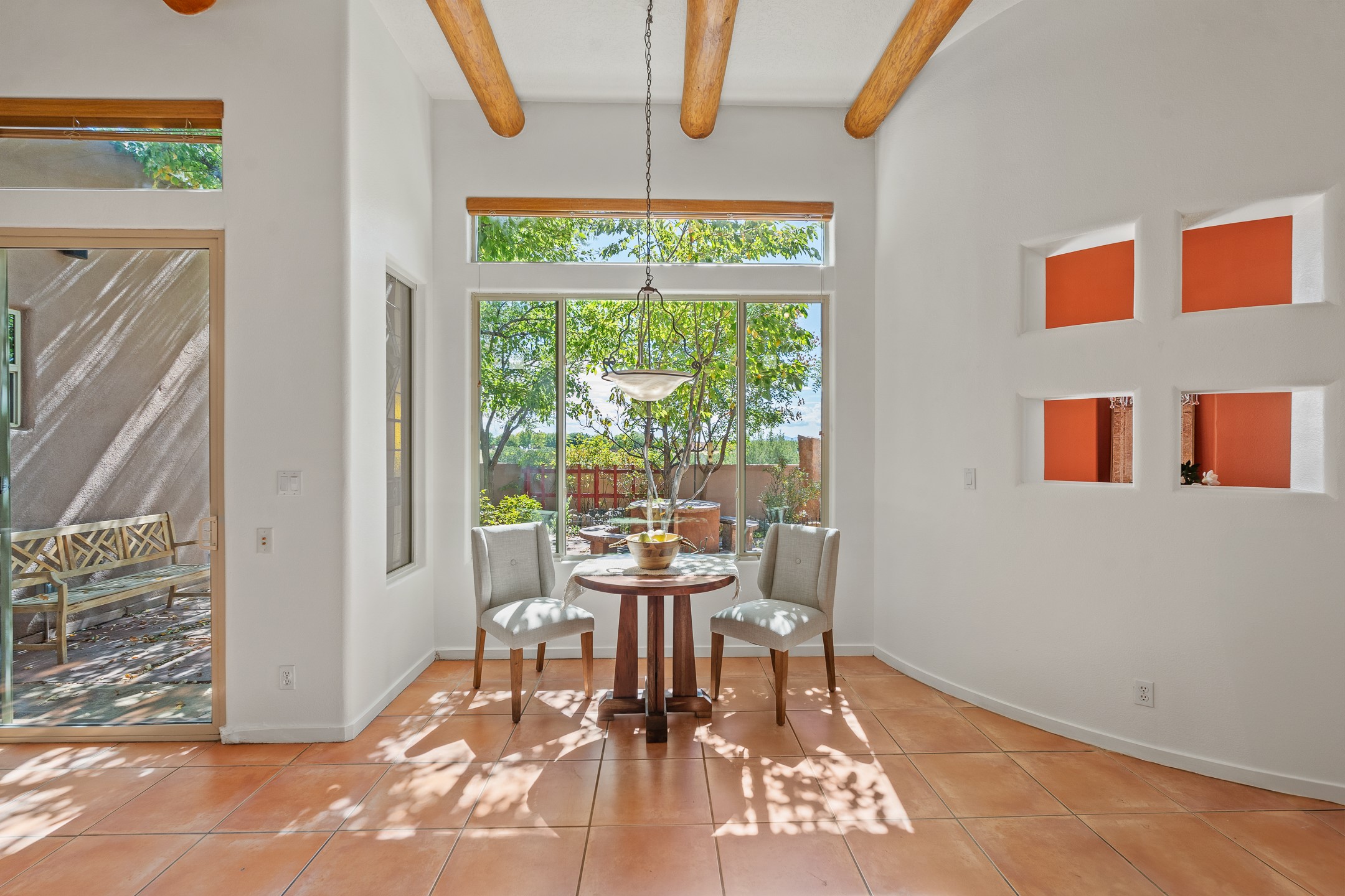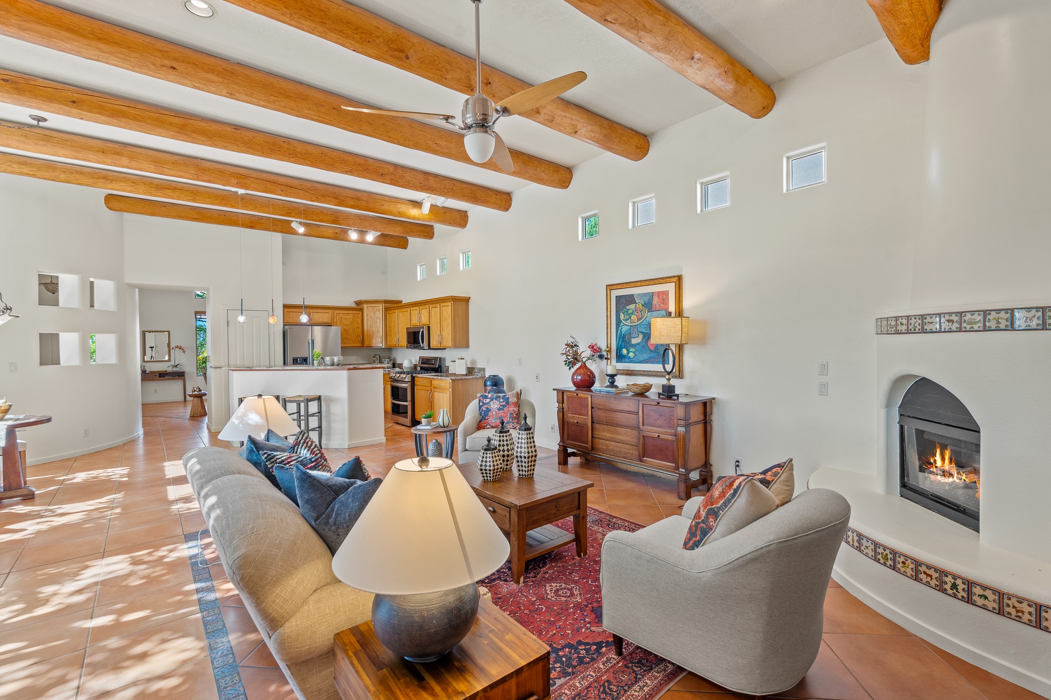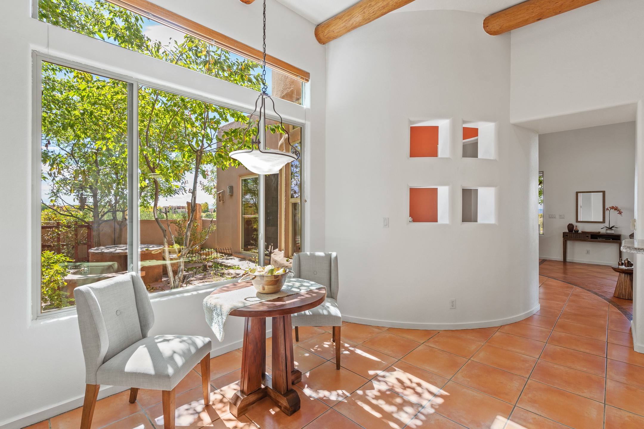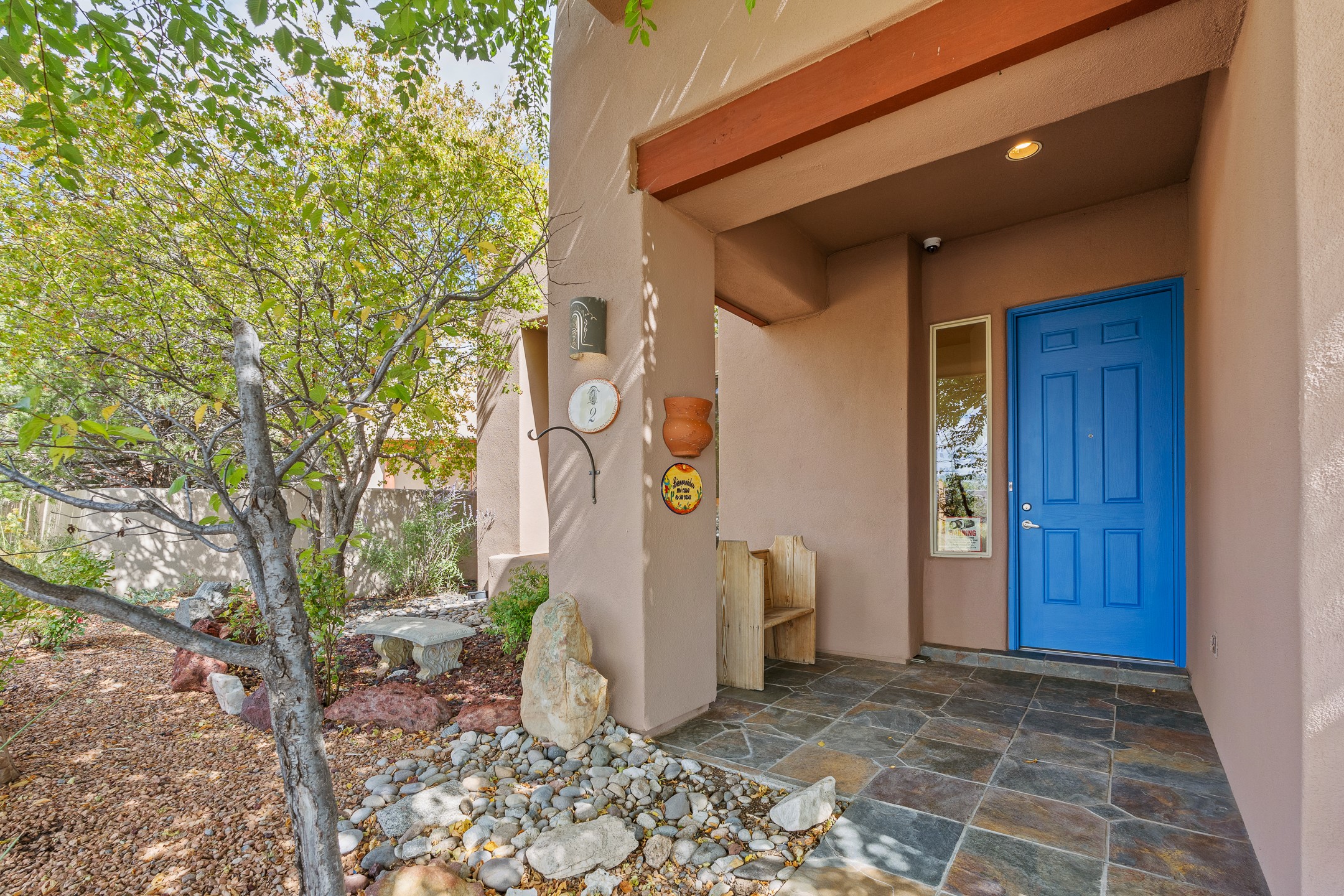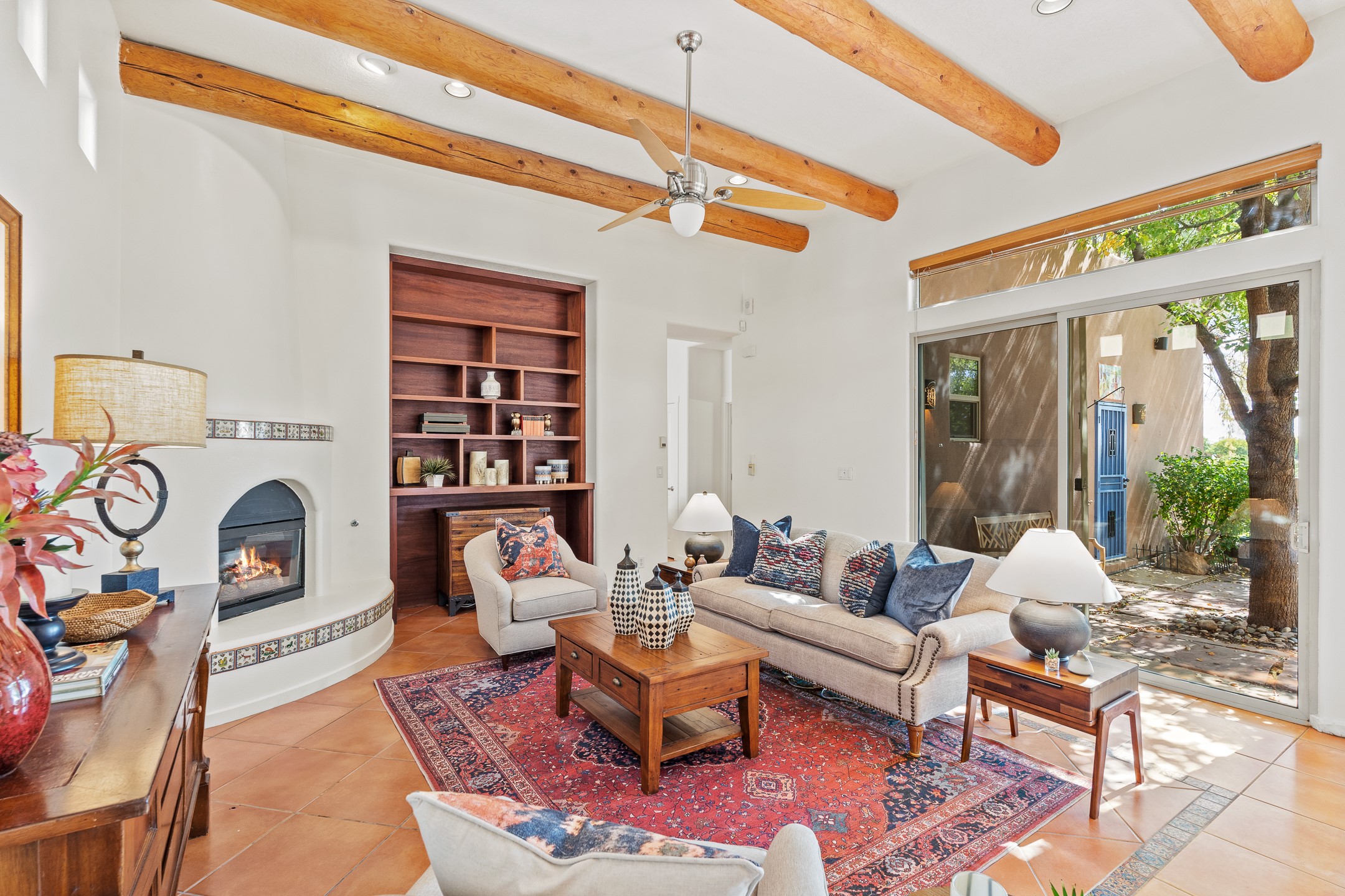 Welcome to this spacious 2,291 sq. ft. single-level home in the sought-after Windmill Ridge neighborhood of Rancho Viejo. Built in 2001, this thoughtfully designed residence offers 3 bedrooms plus an office, 2 bathrooms, 2 courtyards, and a 2-car garage, blending comfort and convenience with timeless Santa Fe style. Interior highlights include high ceilings with beams in the great room, tile flooring throughout, and a gas kiva fireplace in the living room. The extra-large lot is enhanced with mature trees and irrigated plantings.The open-concept design features a light-filled living area anchored by a unique round dining space, creating the perfect flow for both everyday living and entertaining. A comfortable family room sits just off the kitchen, which is equipped with a gas range, granite countertops, and new appliances including a refrigerator, dishwasher, and sink - adding modern ease to this inviting space.A split floor plan places the private primary suite on one side of the home, with two guest bedrooms plus the office on the other--ideal for hosting visitors or creating a home office. Outdoor living is equally inviting with a walled private courtyard perfect for morning coffee, gardening, or starlit evenings. A second courtyard at the back of the home offers charming landscaping and tile murals, creating another serene space to enjoy.Set at the end of a quiet street and just across from walking trails and open space, this property provides a rare sense of serenity while staying connected to the best of Santa Fe.Located within Rancho Viejo, a thriving planned community designed around open land, residents enjoy over 15 miles of paved walking trails, multiple parks, and a strong neighborhood spirit. Shopping, dining, and city amenities are only minutes away, making this home as practical as it is beautiful.Come discover the perfect balance of space, style, and community at 2 Sobradora.