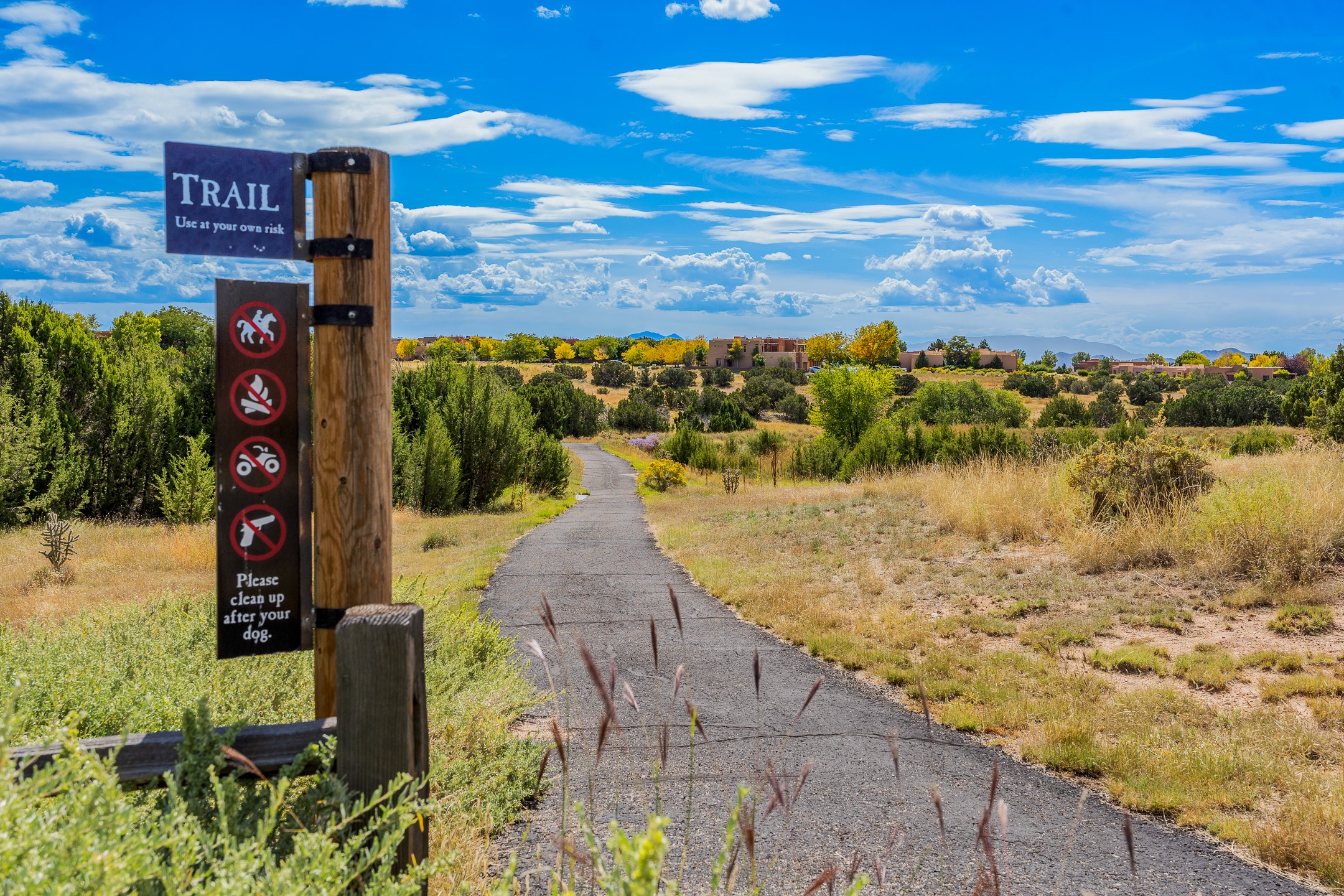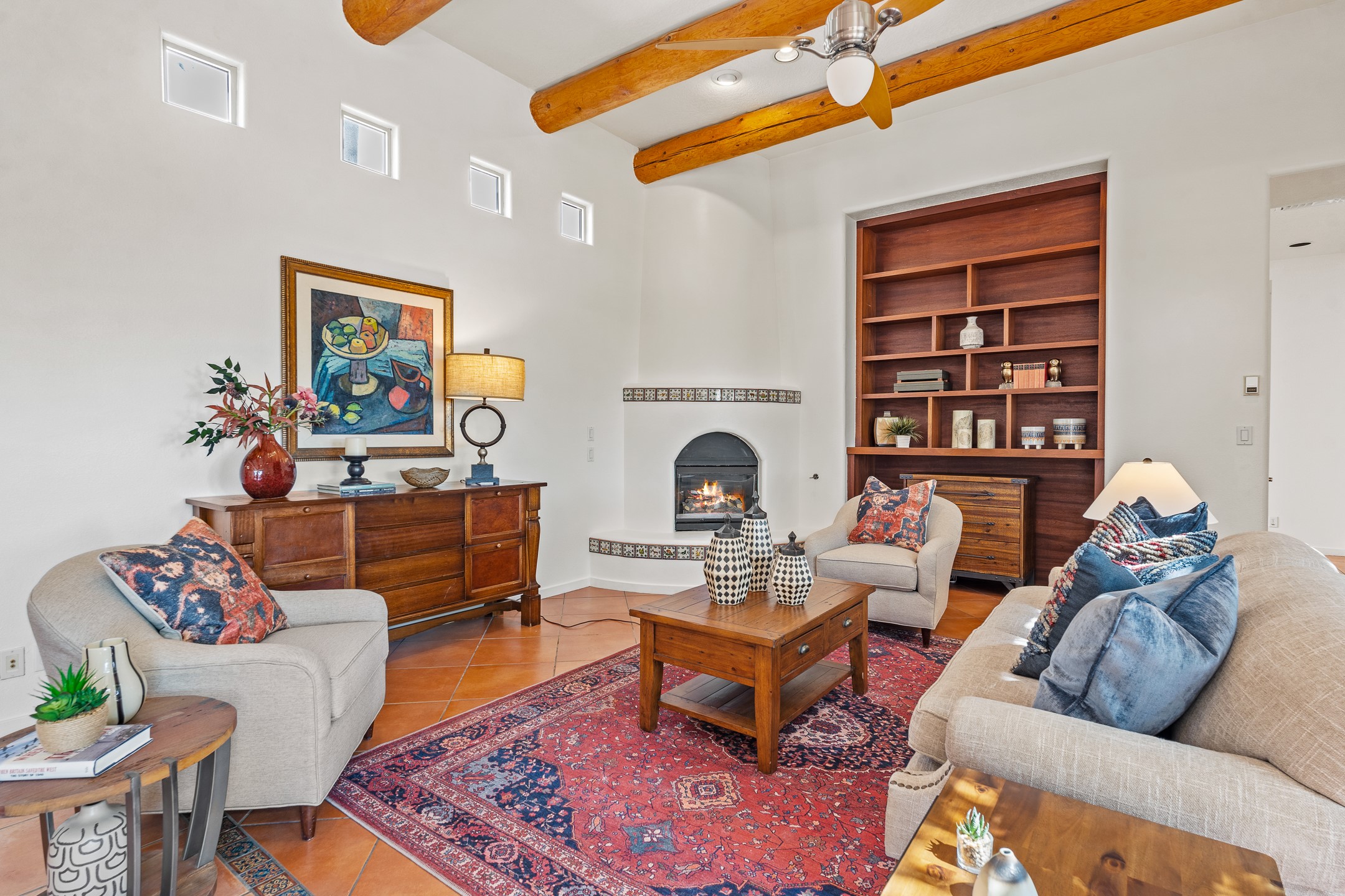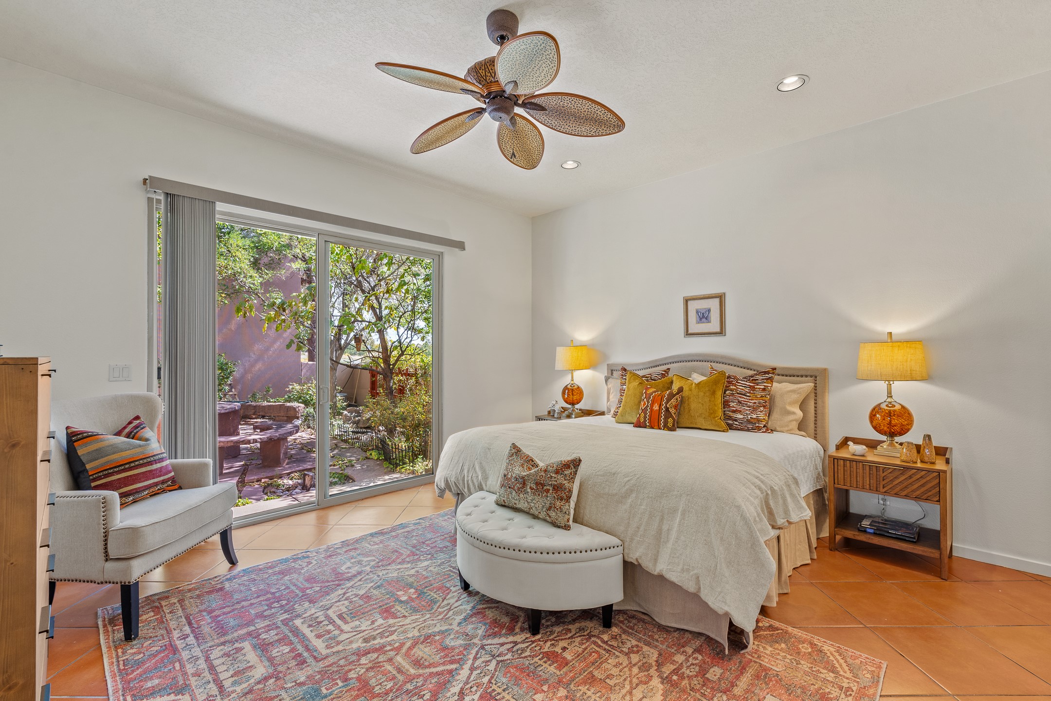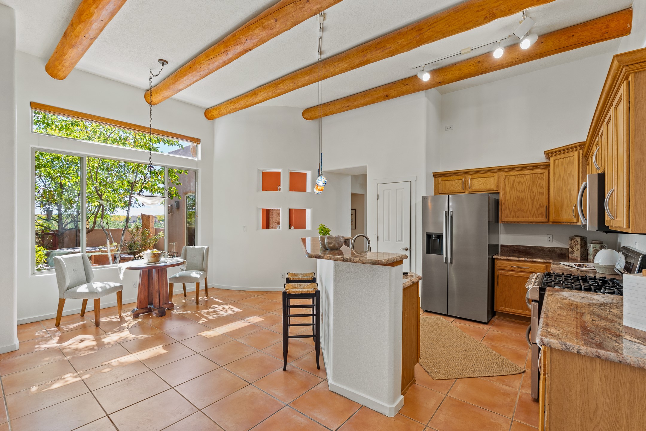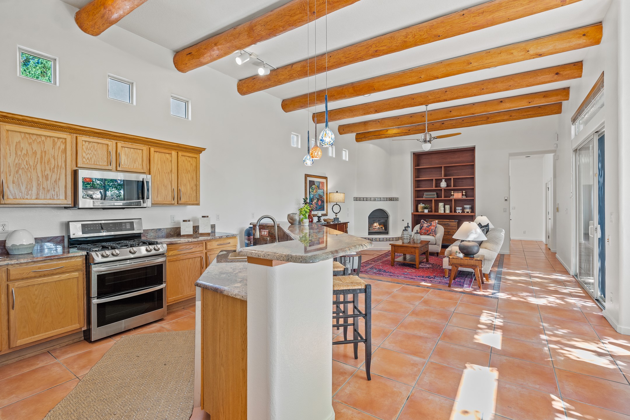Welcome to this spacious 2,291 sq. ft. single-level home in the sought-after Windmill Ridge neighborhood of Rancho Viejo. Built in 2001, this thoughtfully designed residence offers 3 bedrooms plus an office, 2 bathrooms, 2 courtyards, and a 2-car garage, blending comfort and convenience with timeless Santa Fe style. Interior highlights include high ceilings with beams in the great room, tile flooring throughout, and a gas kiva fireplace in the living room. The extra-large lot is enhanced with mature trees and irrigated plantings.The open-concept design features a light-filled living area anchored by a unique round dining space, creating the perfect flow for both everyday living and entertaining. A comfortable family room sits just off the kitchen, which is equipped with a gas range, granite countertops, and new appliances including a refrigerator, dishwasher, and sink - adding modern ease to this inviting space.A split floor plan places the private primary suite on one side of the home, with two guest bedrooms plus the office on the other--ideal for hosting visitors or creating a home office. Outdoor living is equally inviting with a walled private courtyard perfect for morning coffee, gardening, or starlit evenings. A second courtyard at the back of the home offers charming landscaping and tile murals, creating another serene space to enjoy.Set at the end of a quiet street and just across from walking trails and open space, this property provides a rare sense of serenity while staying connected to the best of Santa Fe.Located within Rancho Viejo, a thriving planned community designed around open land, residents enjoy over 15 miles of paved walking trails, multiple parks, and a strong neighborhood spirit. Shopping, dining, and city amenities are only minutes away, making this home as practical as it is beautiful.Come discover the perfect balance of space, style, and community at 2 Sobradora.