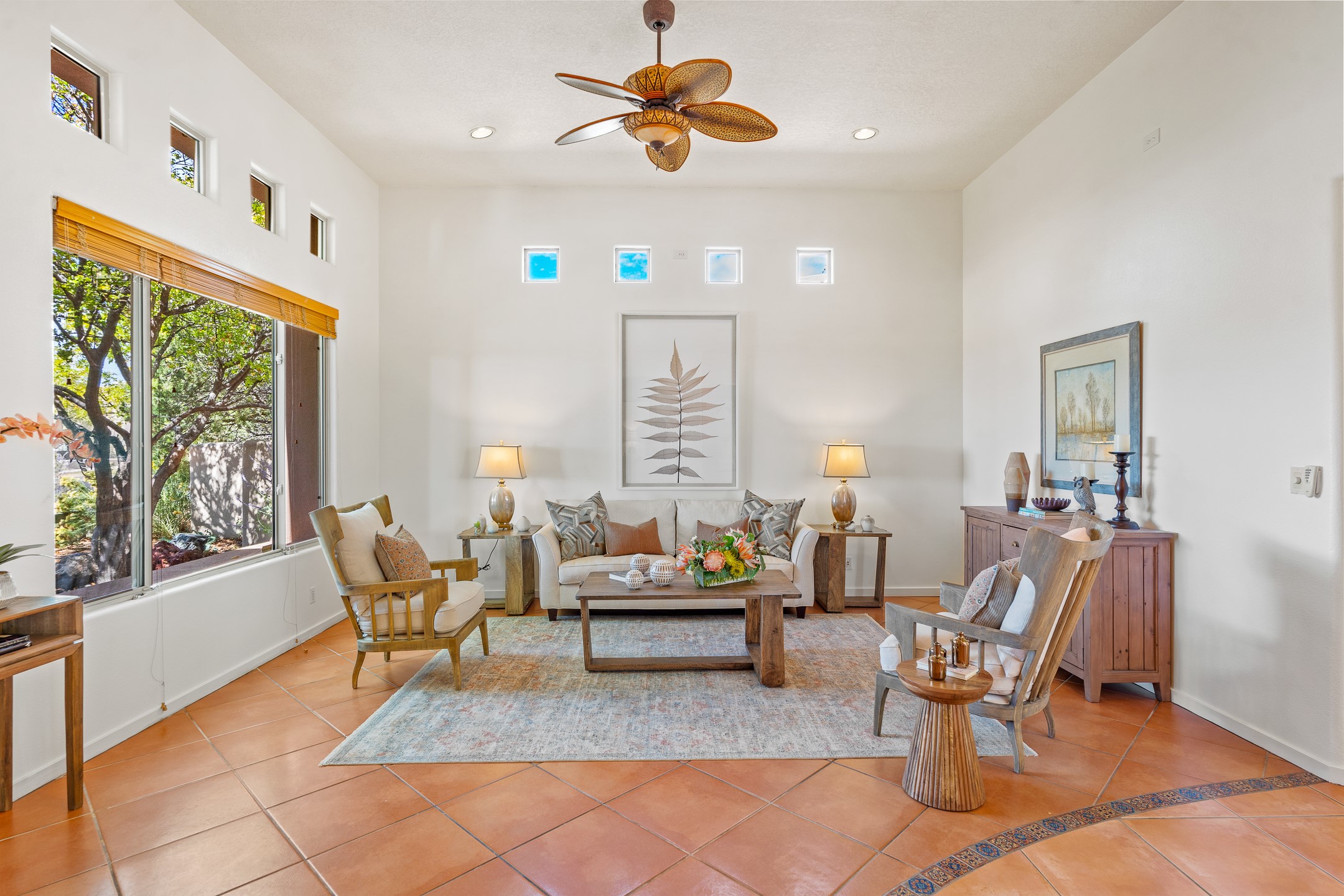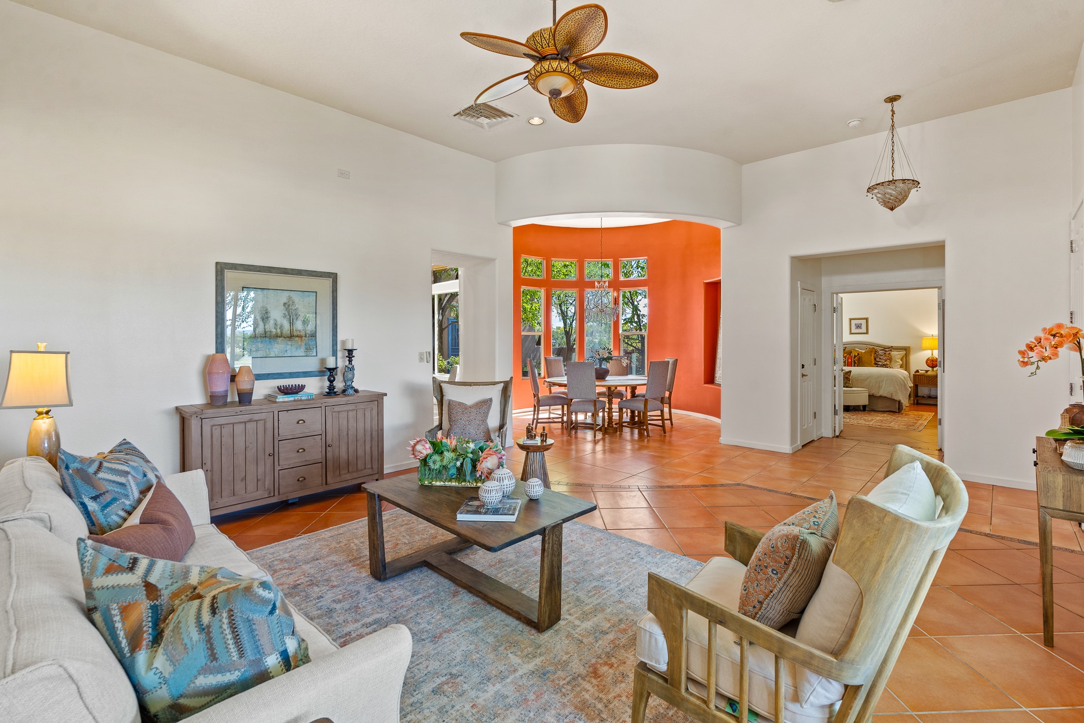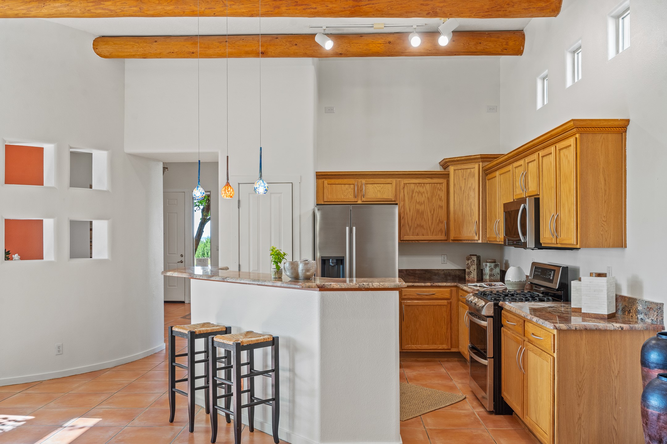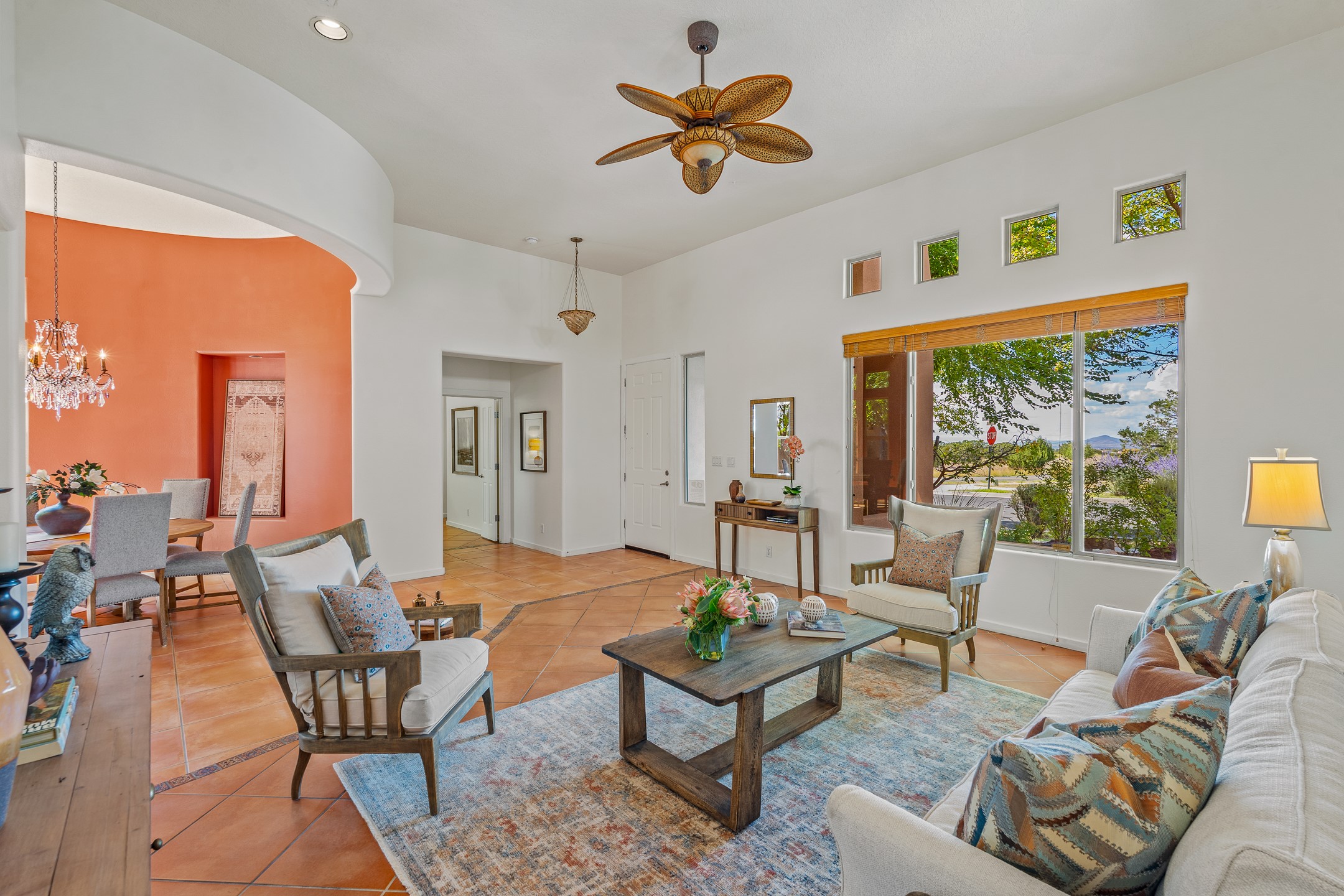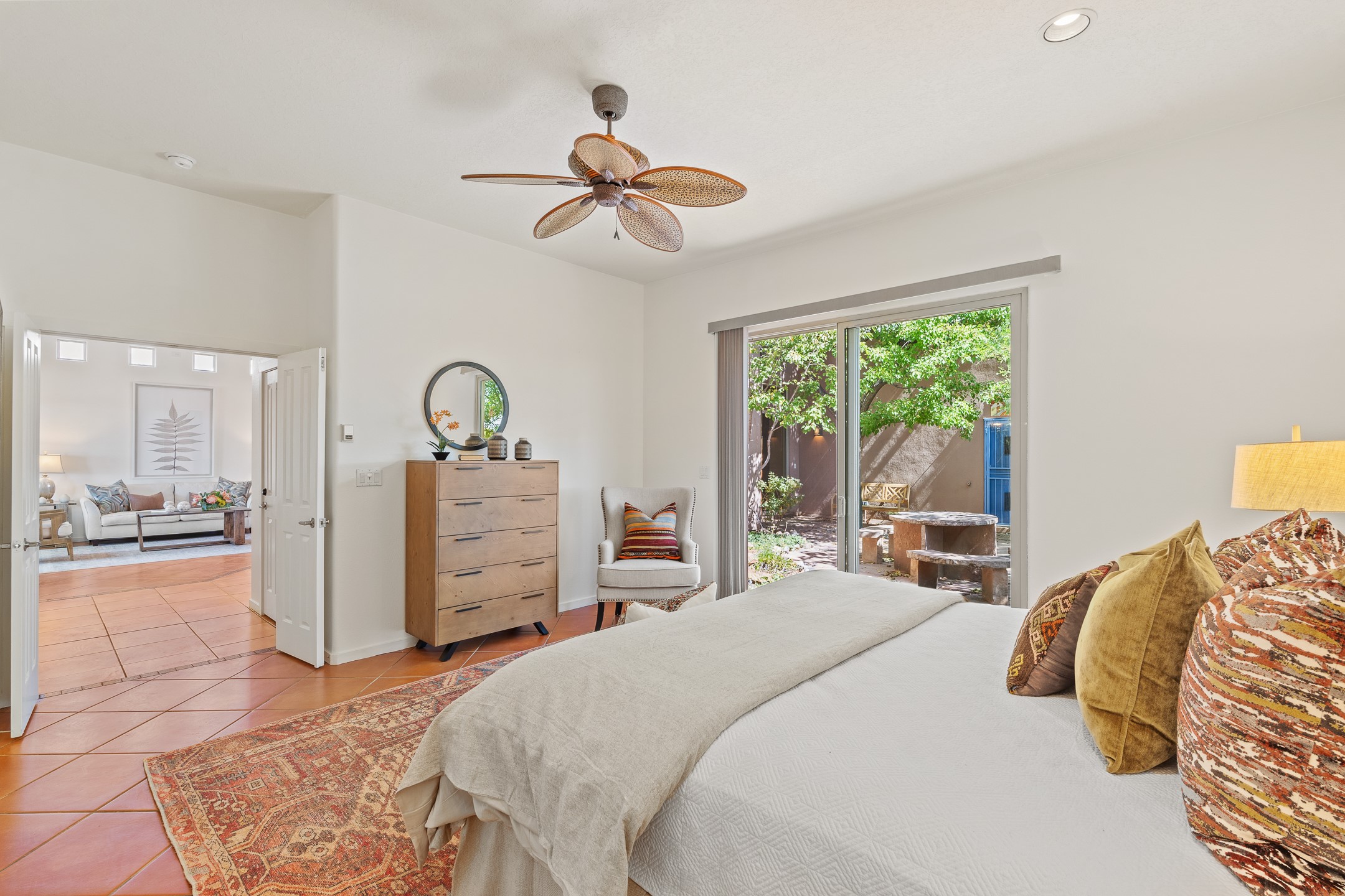 Welcome to this spacious 2,291 sq. ft. single-level home in the sought-after Windmill Ridge neighborhood of Rancho Viejo. Built in 2001, this thoughtfully designed residence offers 3 bedrooms plus an office, 2 bathrooms, 2 courtyards, and a 2-car garage, blending comfort and convenience with timeless Santa Fe style. Interior highlights include high ceilings with beams in the great room, tile flooring throughout, and a gas kiva fireplace in the living room. The extra-large lot is enhanced with mature trees and irrigated plantings.The open-concept design features a light-filled living area anchored by a unique round dining space, creating the perfect flow for both everyday living and entertaining. A comfortable family room sits just off the kitchen, which is equipped with a gas range, granite countertops, and new appliances including a refrigerator, dishwasher, and sink - adding modern ease to this inviting space.A split floor plan places the private primary suite on one side of the home, with two guest bedrooms plus the office on the other--ideal for hosting visitors or creating a home office. Outdoor living is equally inviting with a walled private courtyard perfect for morning coffee, gardening, or starlit evenings. A second courtyard at the back of the home offers charming landscaping and tile murals, creating another serene space to enjoy.Set at the end of a quiet street and just across from walking trails and open space, this property provides a rare sense of serenity while staying connected to the best of Santa Fe.Located within Rancho Viejo, a thriving planned community designed around open land, residents enjoy over 15 miles of paved walking trails, multiple parks, and a strong neighborhood spirit. Shopping, dining, and city amenities are only minutes away, making this home as practical as it is beautiful.Come discover the perfect balance of space, style, and community at 2 Sobradora.