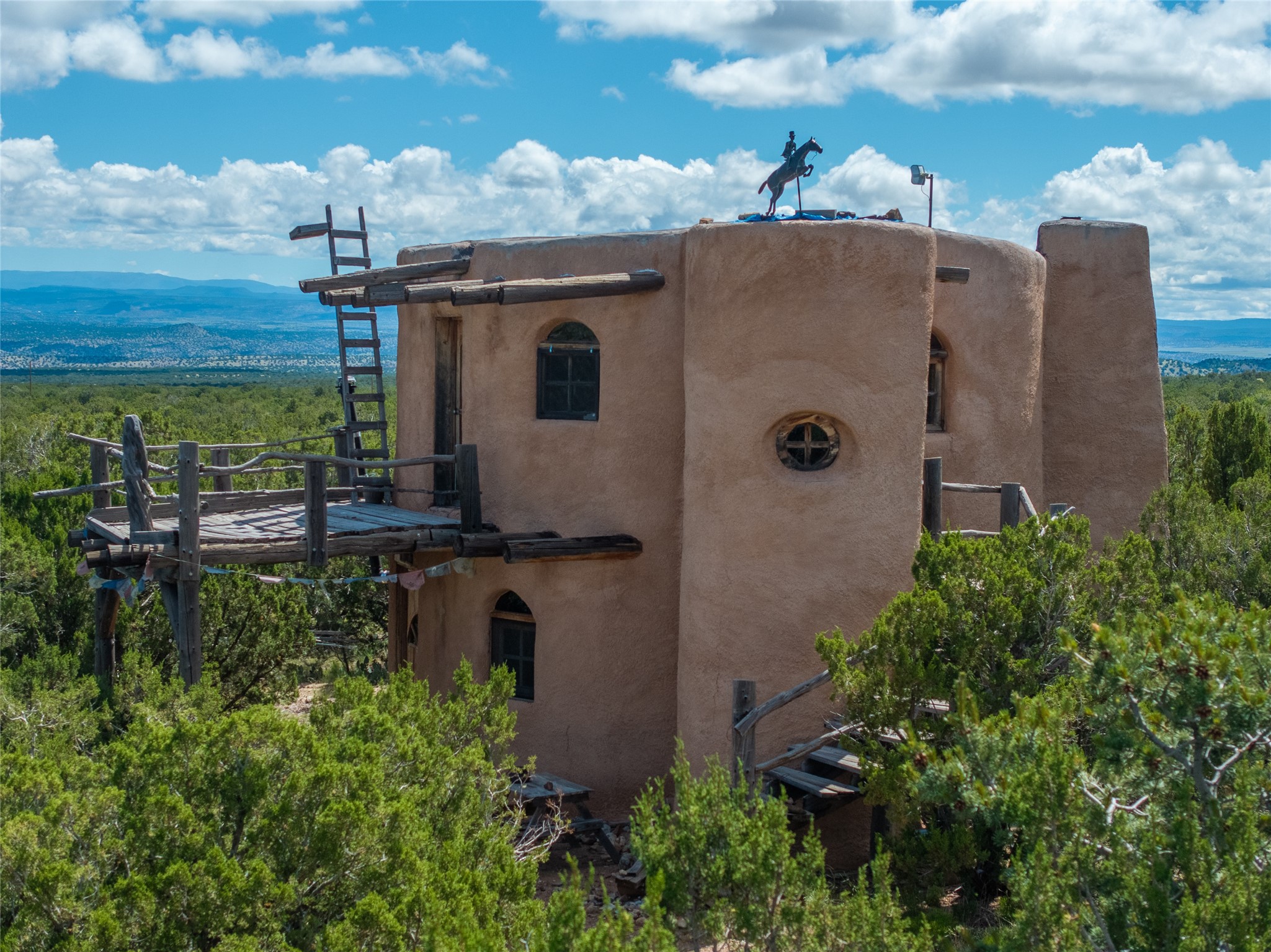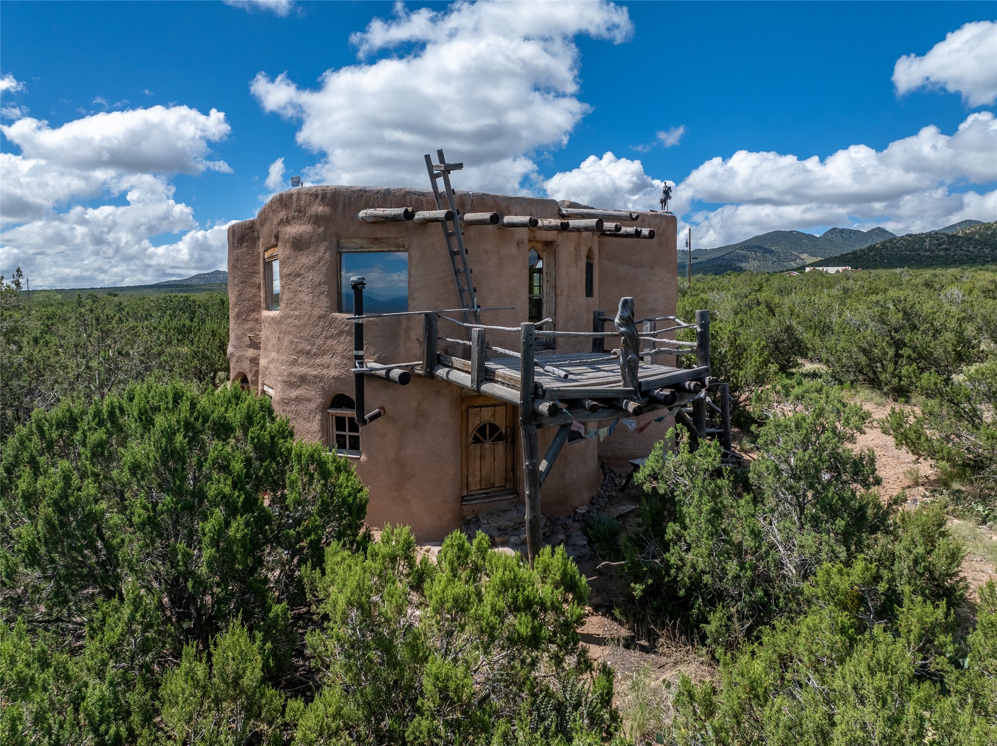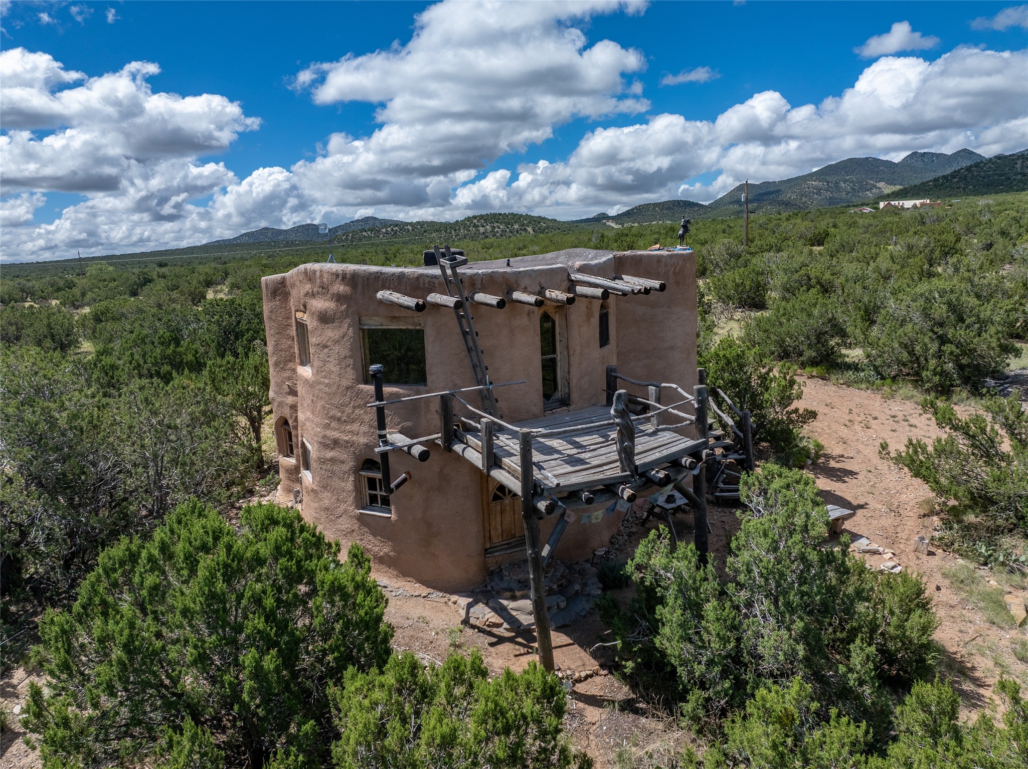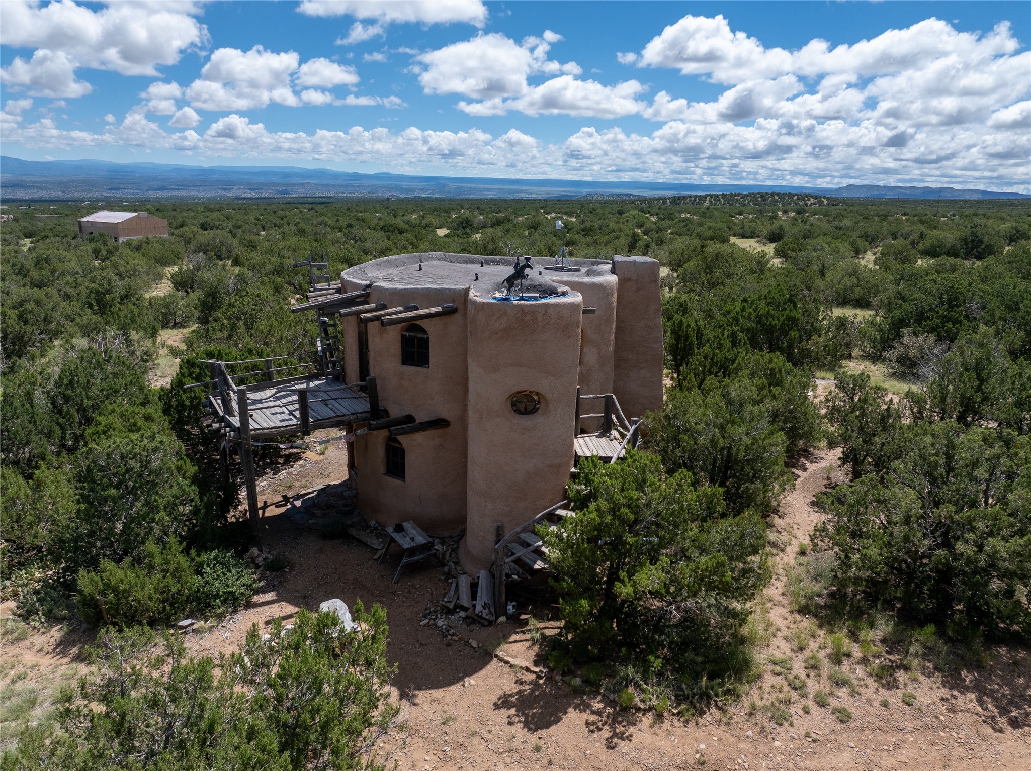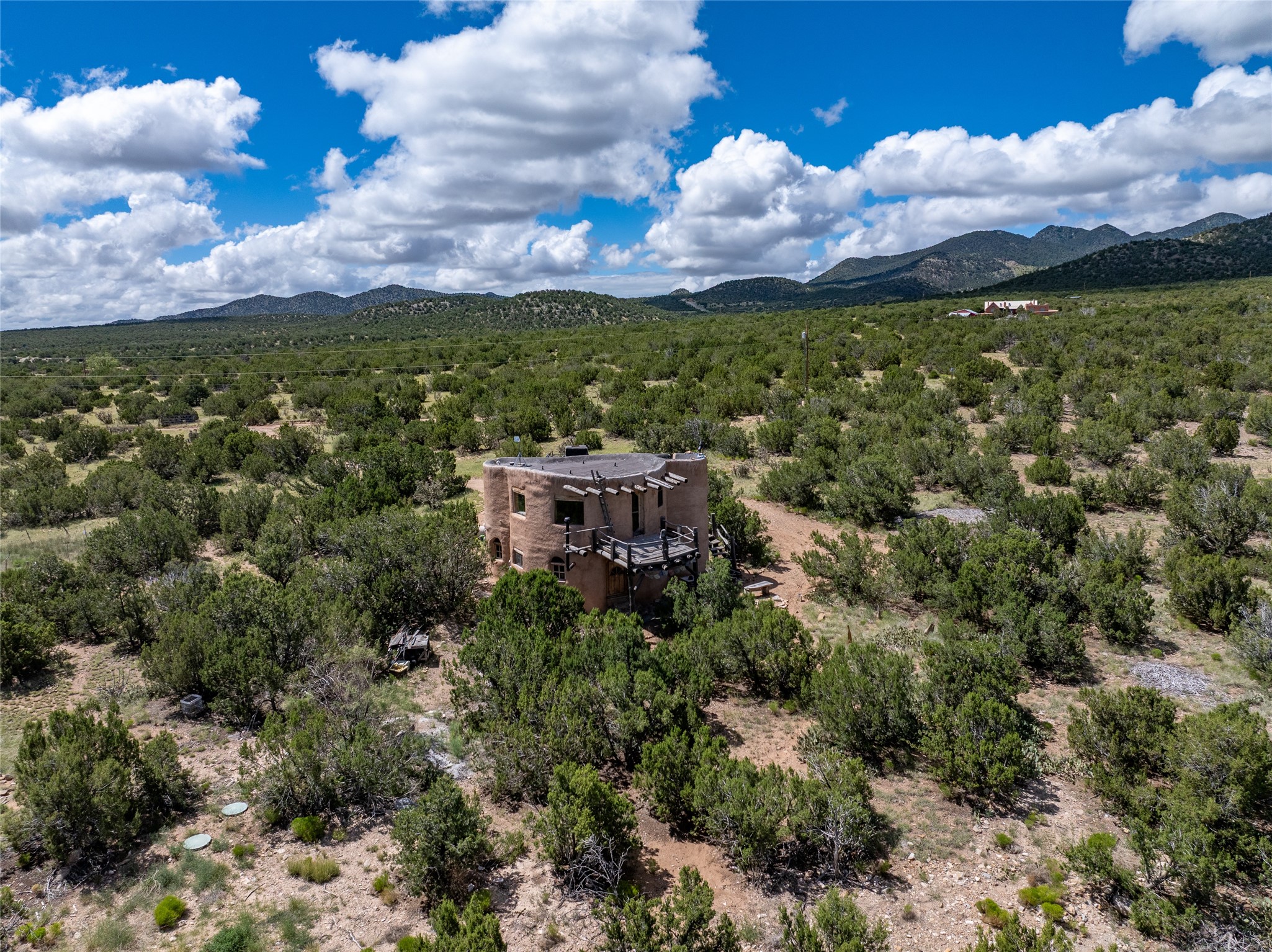 Revealing a sculptor's touch, this hand-built round adobe on the slopes of the Ortiz Mountains is ready for new energy. Nestled on 13.34 elevated acres with gentle, easy topography and breathtaking views, this one-bedroom, one-bath home offers a sanctuary from the world while being less than a quarter mile from pavement and approximately 30 minutes from Santa Fe. Unique features add warmth and character, including a spiral staircase, wide plank wood floors, hand-hewn counters, a stone sink, and viga ceilings. Outside, the upstairs decks, which currently need repair, offer some of the best views in the region. With wood heat, public electricity, a private well, and a newer septic system, this home is poised to provide a distinctive retreat. While completely charming, this home requires some repairs and upgrades and is priced accordingly. Please make an appointment to see.