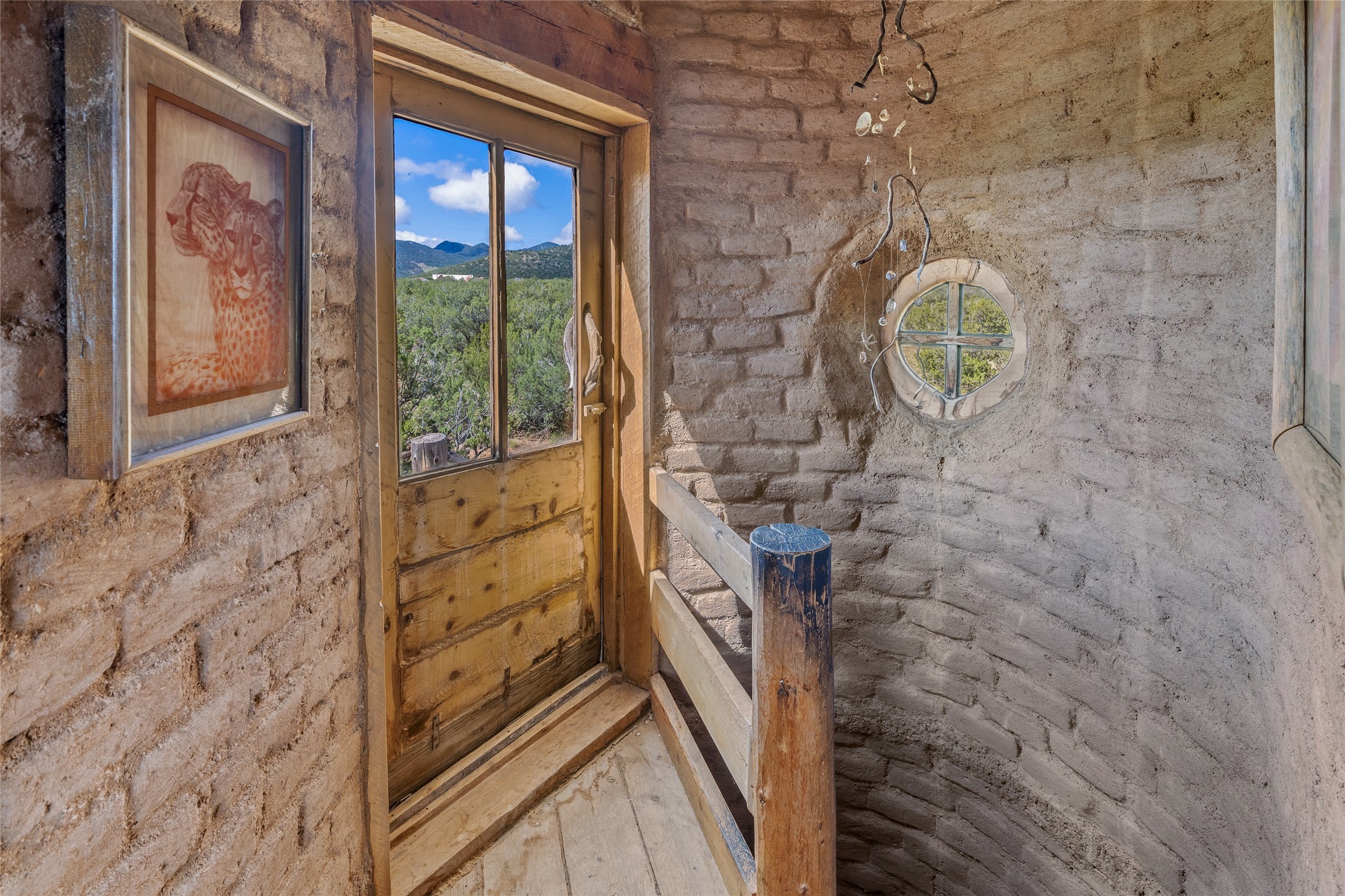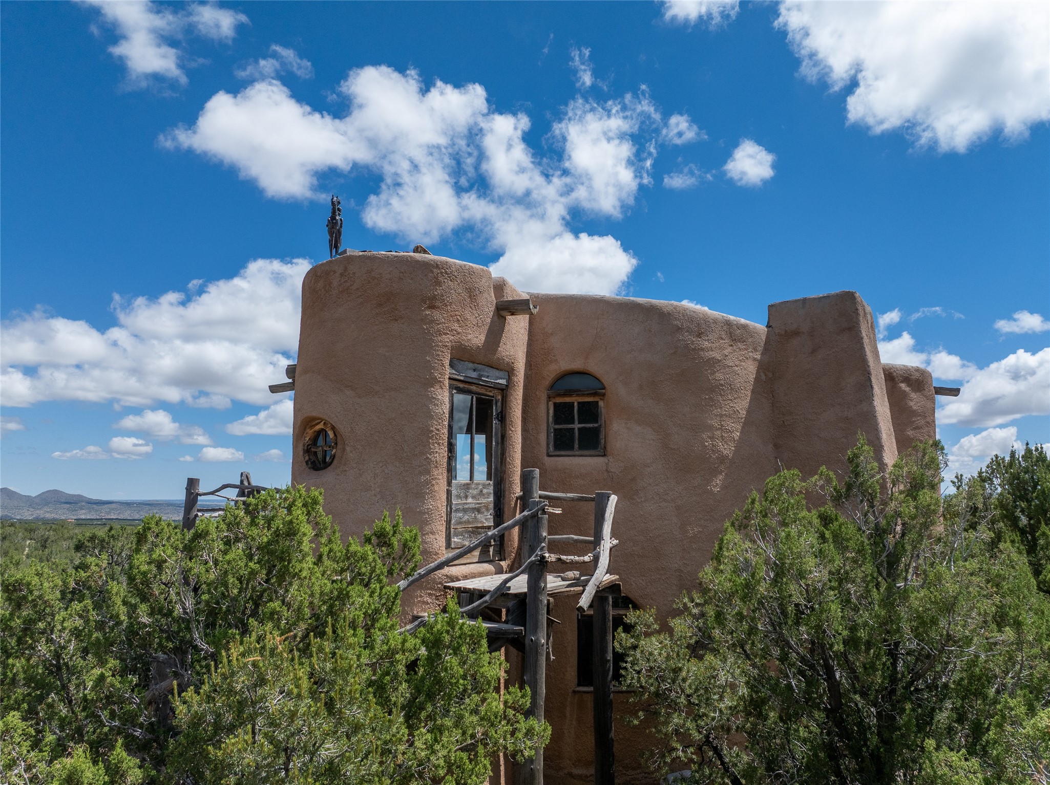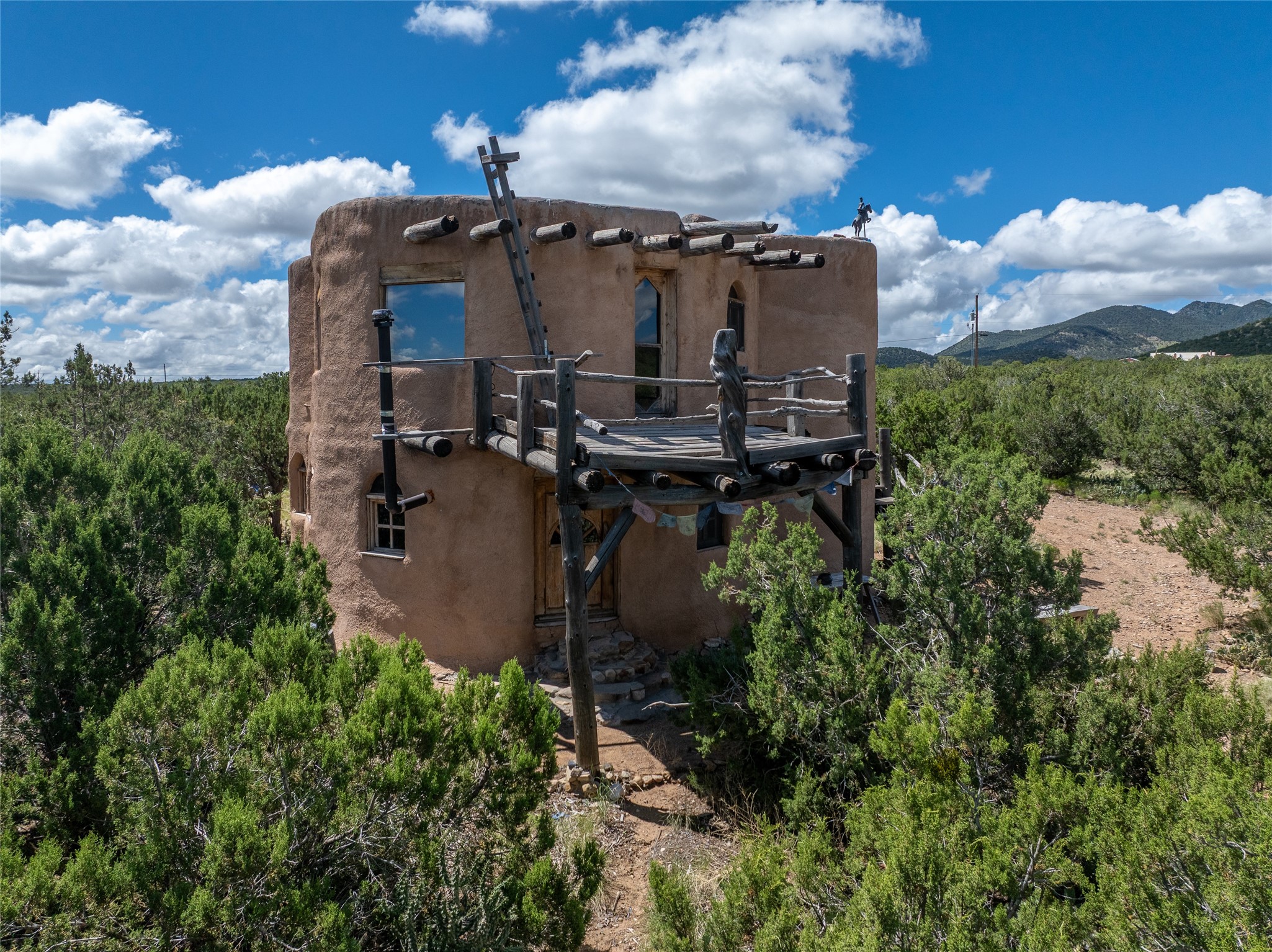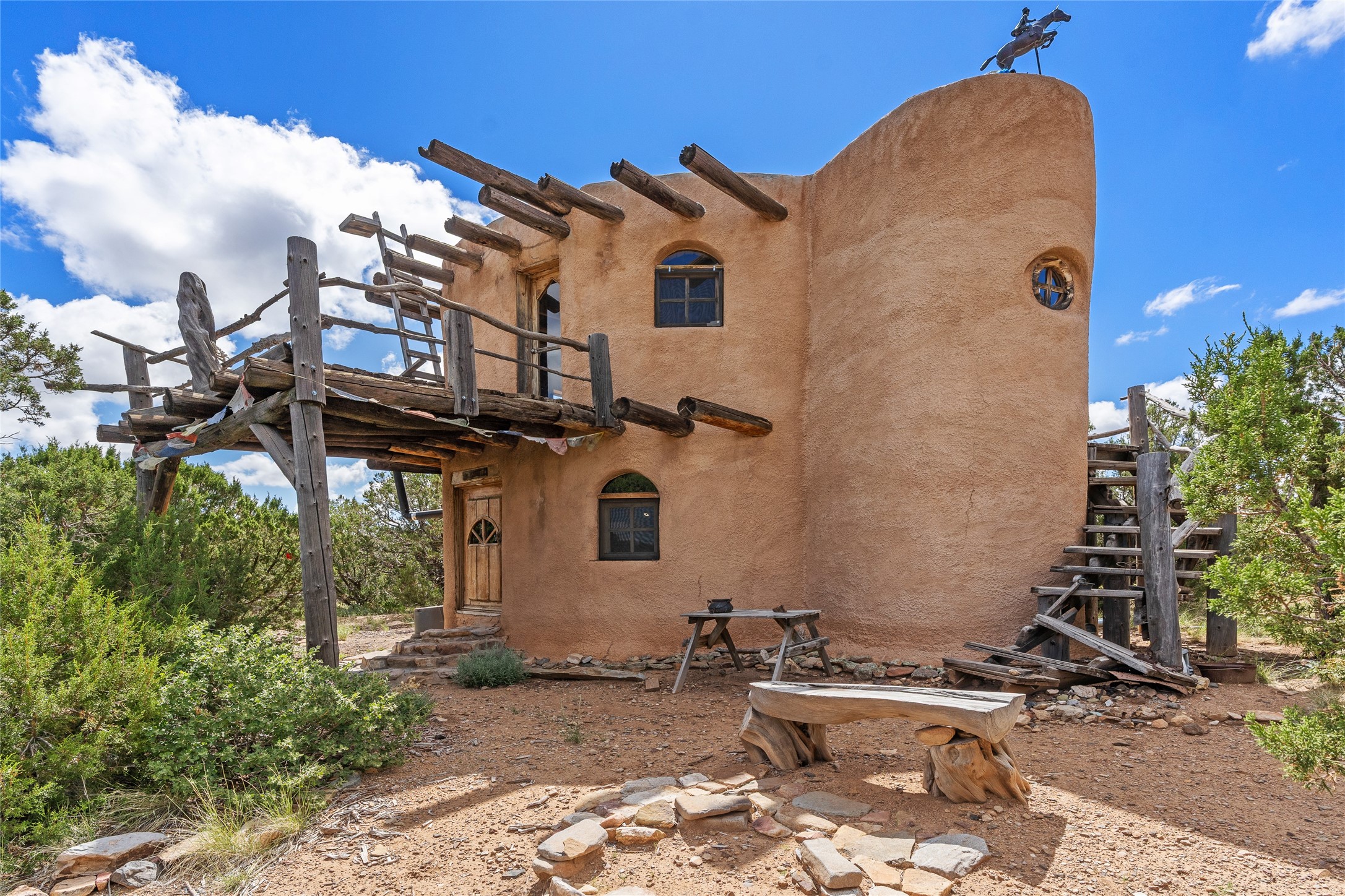 Revealing a sculptor's touch, this hand-built round adobe on the slopes of the Ortiz Mountains is ready for new energy. Nestled on 13.34 elevated acres with gentle, easy topography and breathtaking views, this one-bedroom, one-bath home offers a sanctuary from the world while being less than a quarter mile from pavement and approximately 30 minutes from Santa Fe. Unique features add warmth and character, including a spiral staircase, wide plank wood floors, hand-hewn counters, a stone sink, and viga ceilings. Outside, the upstairs decks, which currently need repair, offer some of the best views in the region. With wood heat, public electricity, a private well, and a newer septic system, this home is poised to provide a distinctive retreat. While completely charming, this home requires some repairs and upgrades and is priced accordingly. Please make an appointment to see.