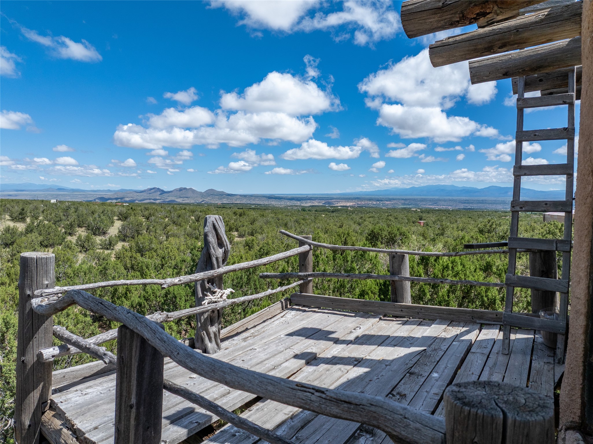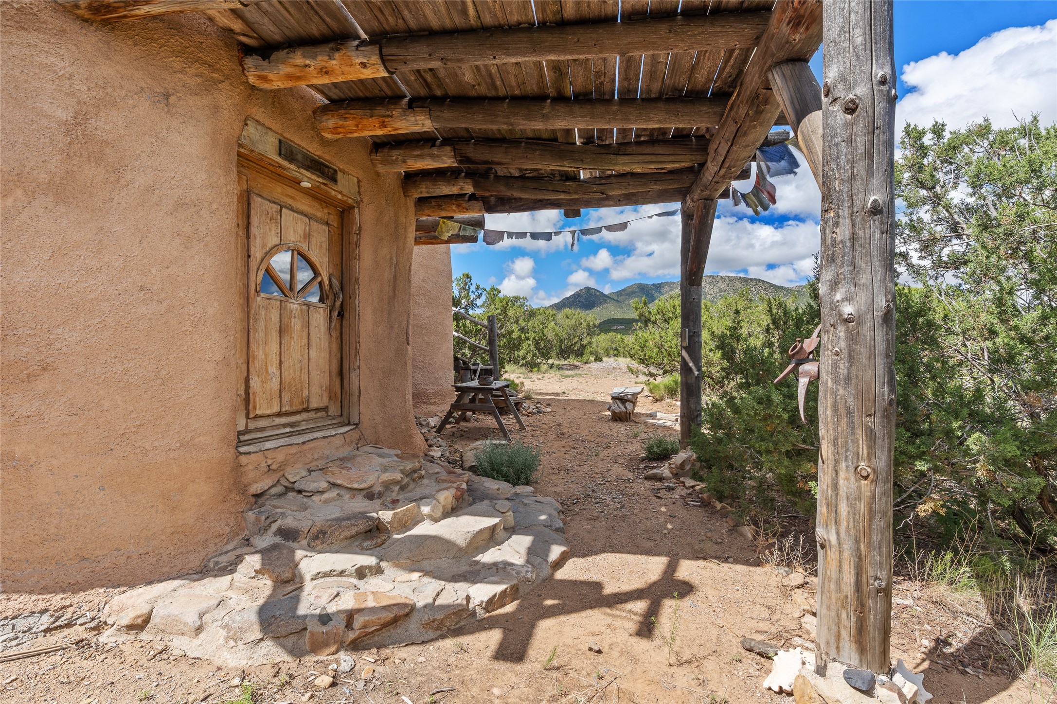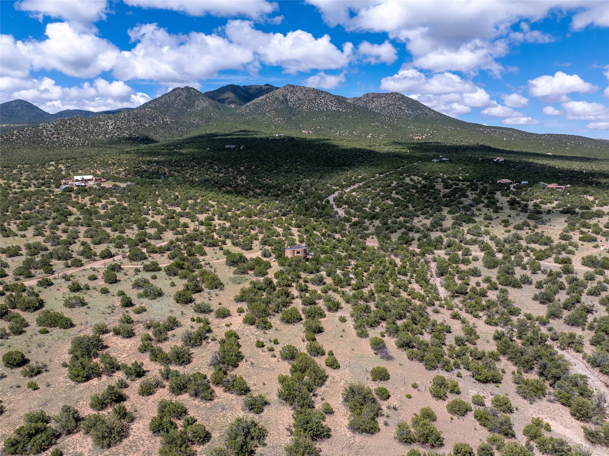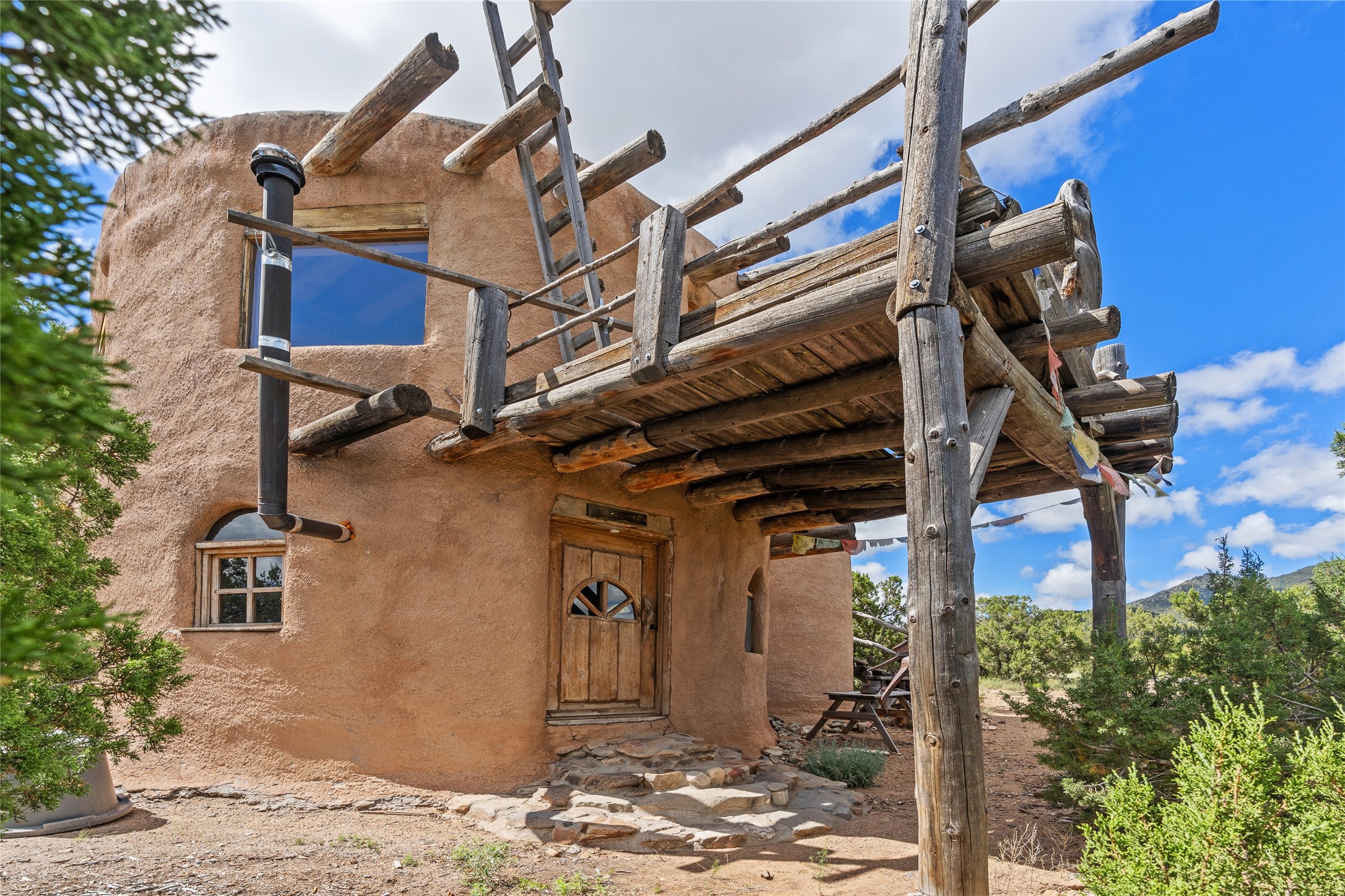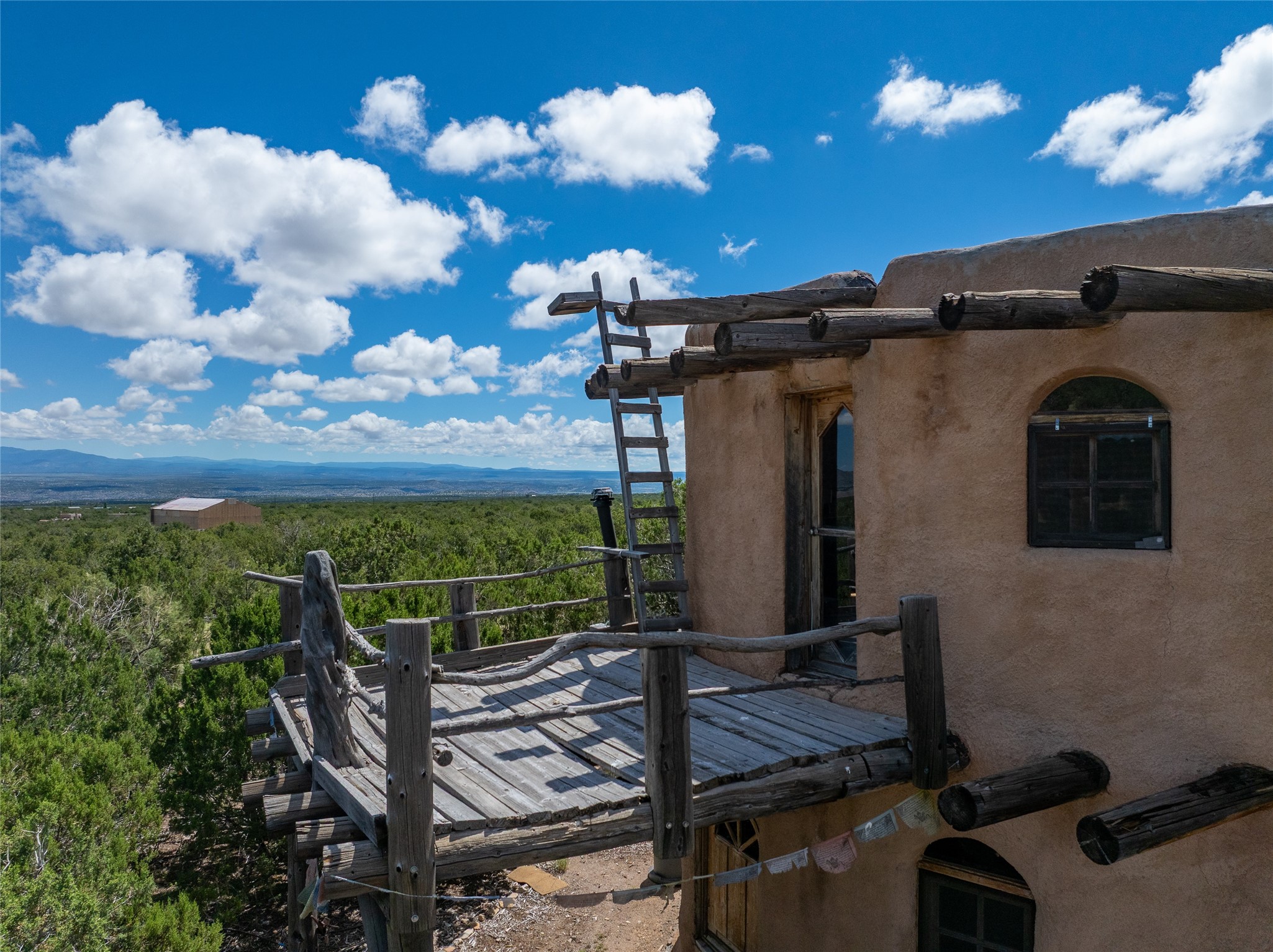 Revealing a sculptor's touch, this hand-built round adobe on the slopes of the Ortiz Mountains is ready for new energy. Nestled on 13.34 elevated acres with gentle, easy topography and breathtaking views, this one-bedroom, one-bath home offers a sanctuary from the world while being less than a quarter mile from pavement and approximately 30 minutes from Santa Fe. Unique features add warmth and character, including a spiral staircase, wide plank wood floors, hand-hewn counters, a stone sink, and viga ceilings. Outside, the upstairs decks, which currently need repair, offer some of the best views in the region. With wood heat, public electricity, a private well, and a newer septic system, this home is poised to provide a distinctive retreat. While completely charming, this home requires some repairs and upgrades and is priced accordingly. Please make an appointment to see.