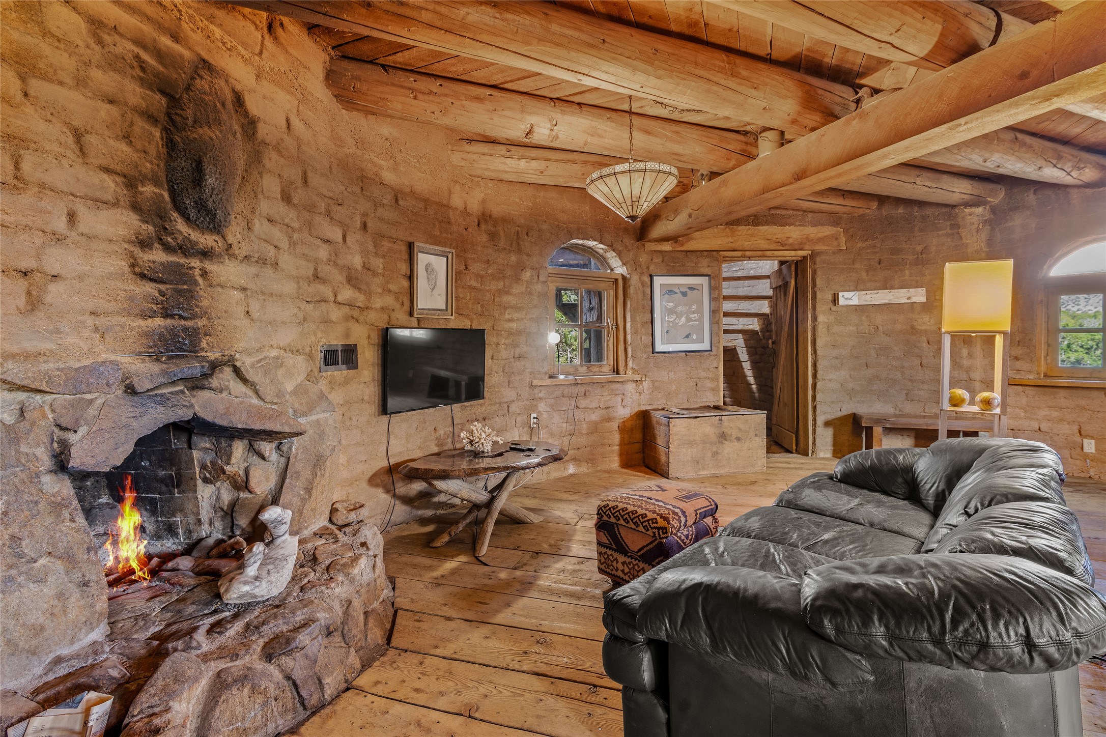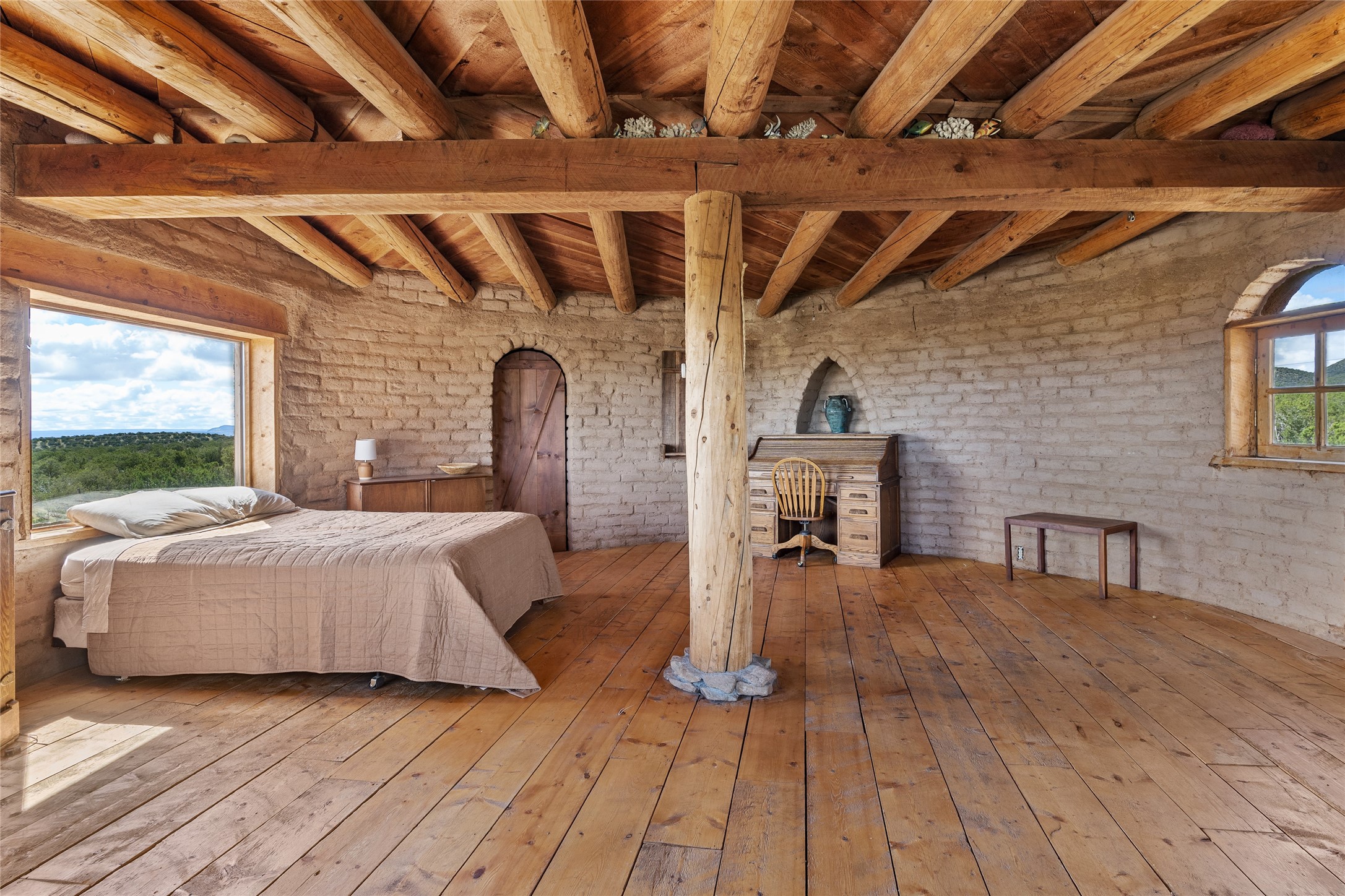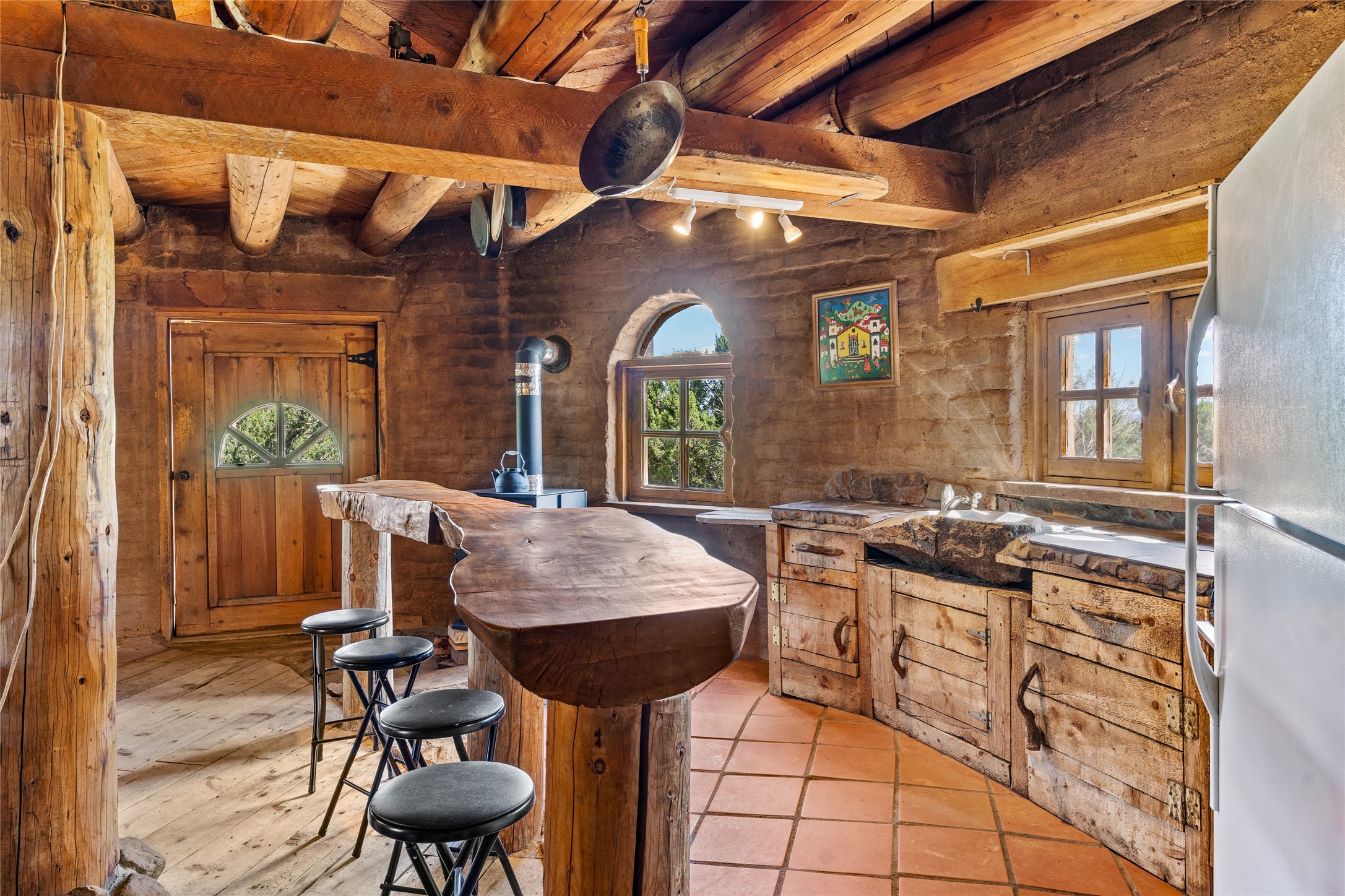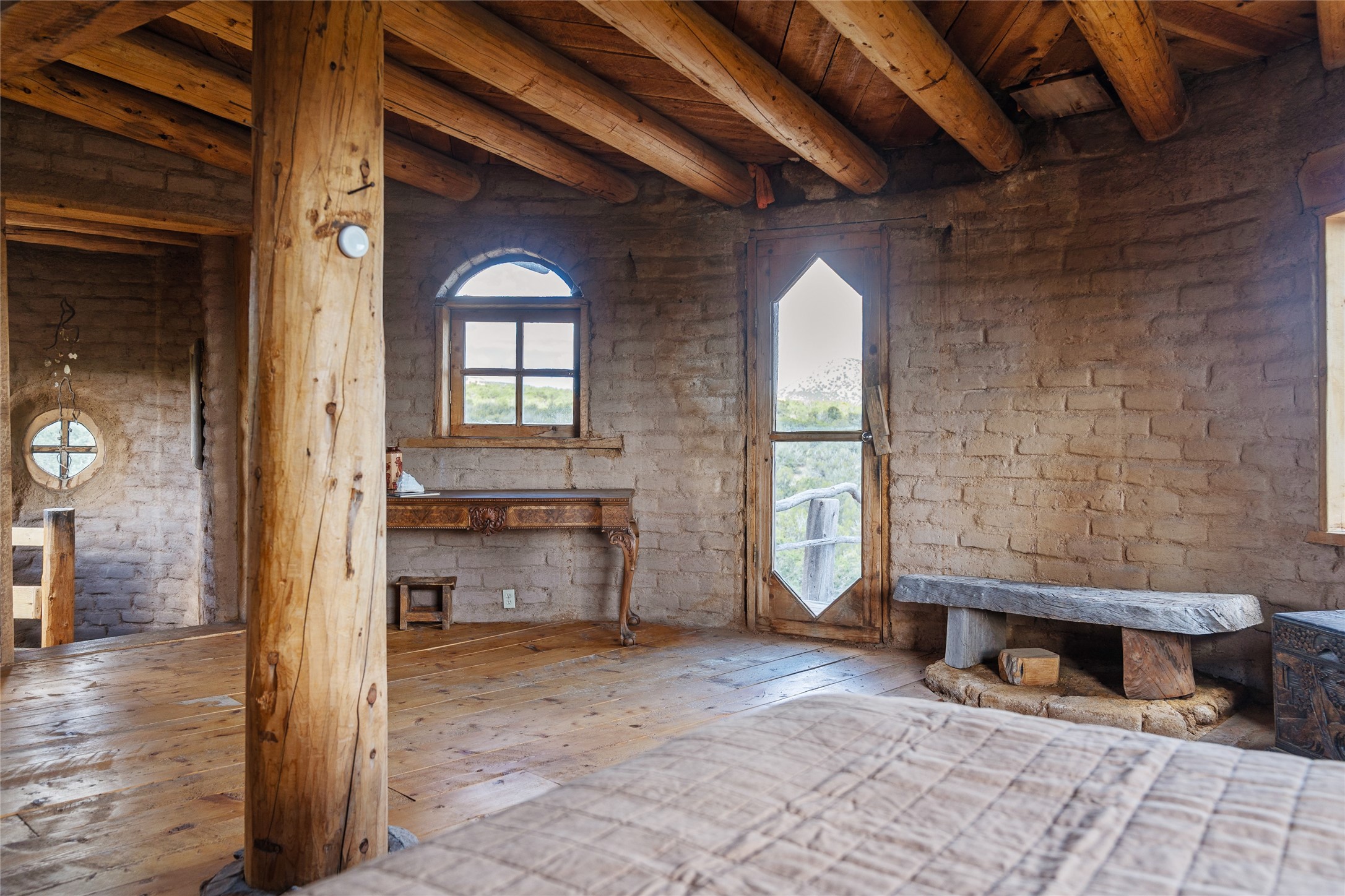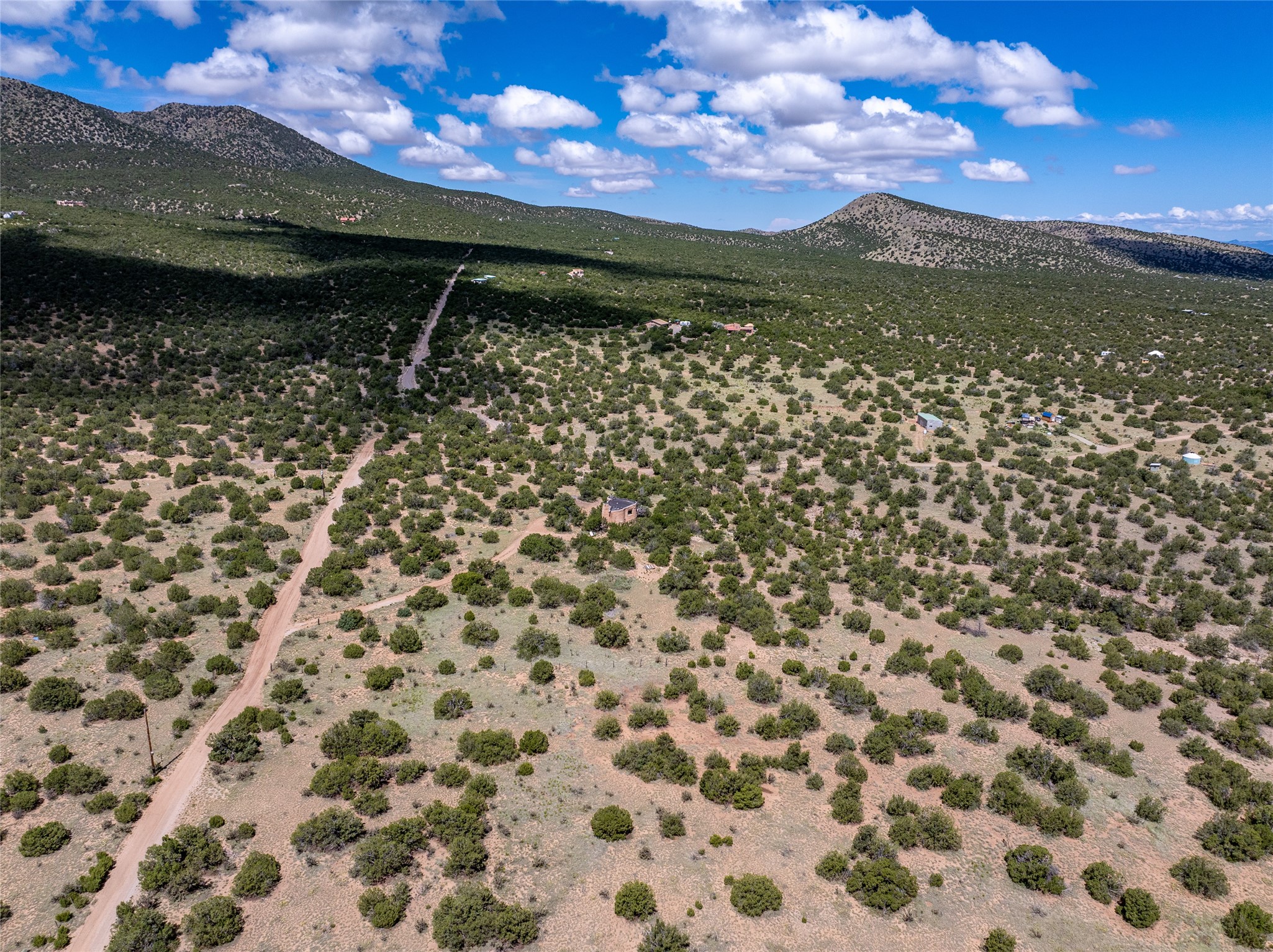 Revealing a sculptor's touch, this hand-built round adobe on the slopes of the Ortiz Mountains is ready for new energy. Nestled on 13.34 elevated acres with gentle, easy topography and breathtaking views, this one-bedroom, one-bath home offers a sanctuary from the world while being less than a quarter mile from pavement and approximately 30 minutes from Santa Fe. Unique features add warmth and character, including a spiral staircase, wide plank wood floors, hand-hewn counters, a stone sink, and viga ceilings. Outside, the upstairs decks, which currently need repair, offer some of the best views in the region. With wood heat, public electricity, a private well, and a newer septic system, this home is poised to provide a distinctive retreat. While completely charming, this home requires some repairs and upgrades and is priced accordingly. Please make an appointment to see.
