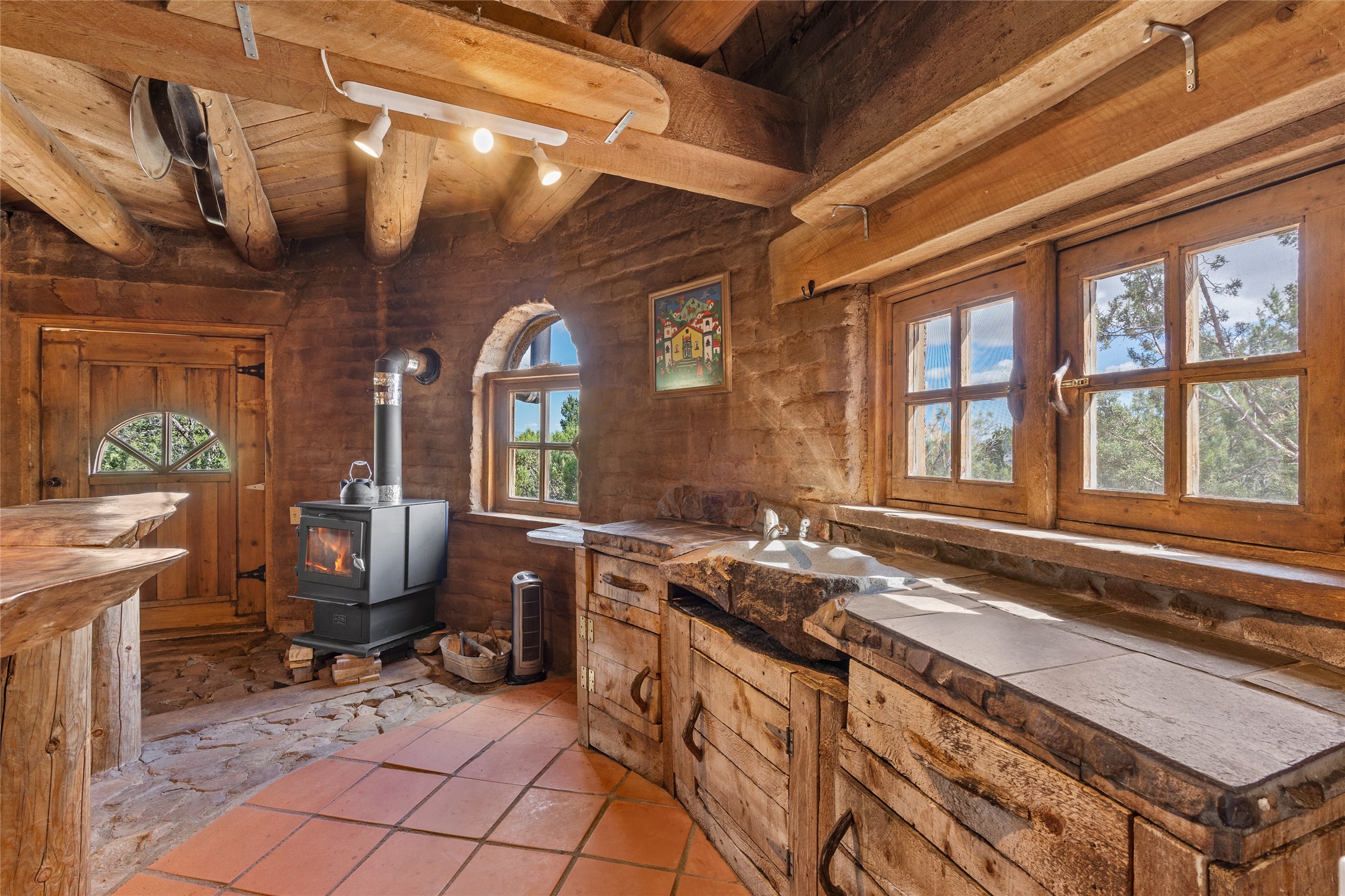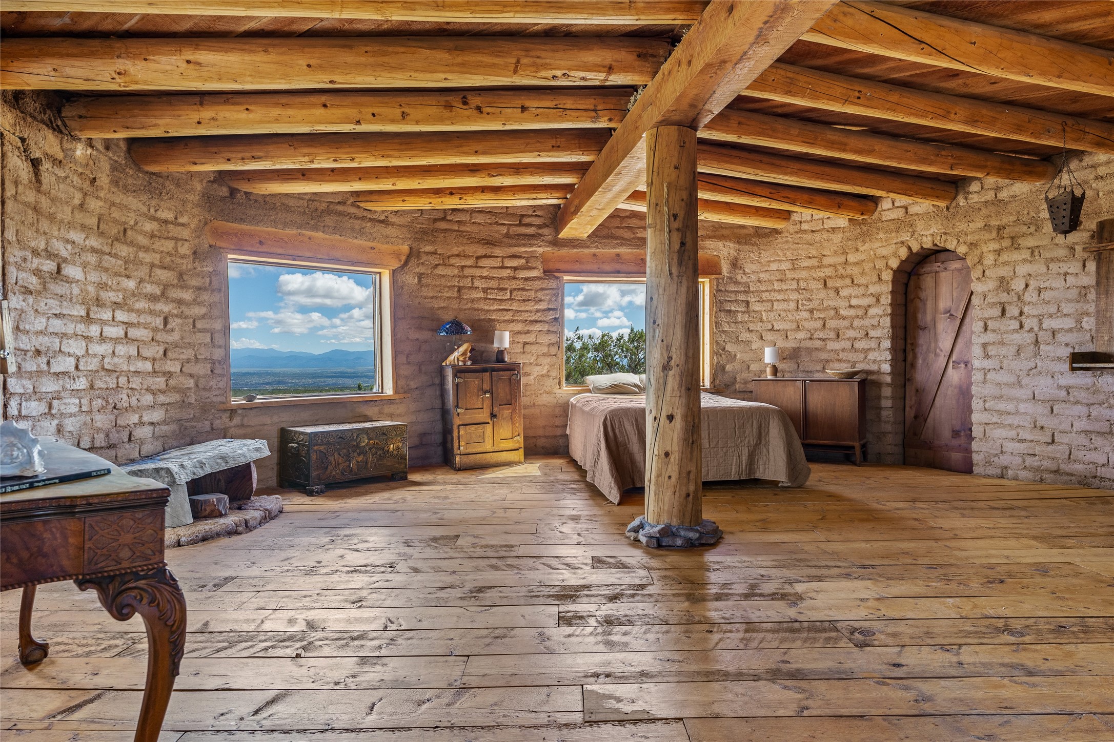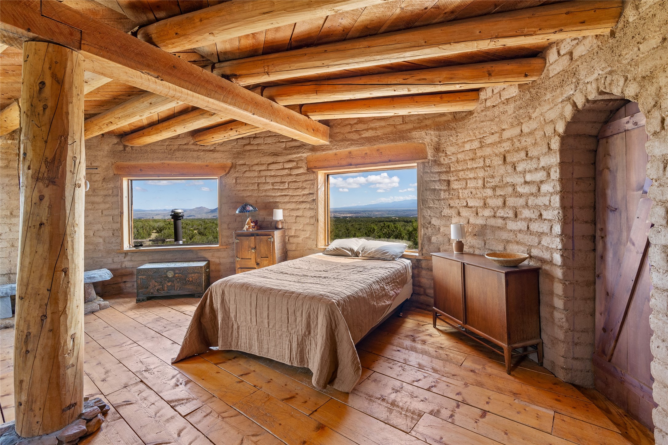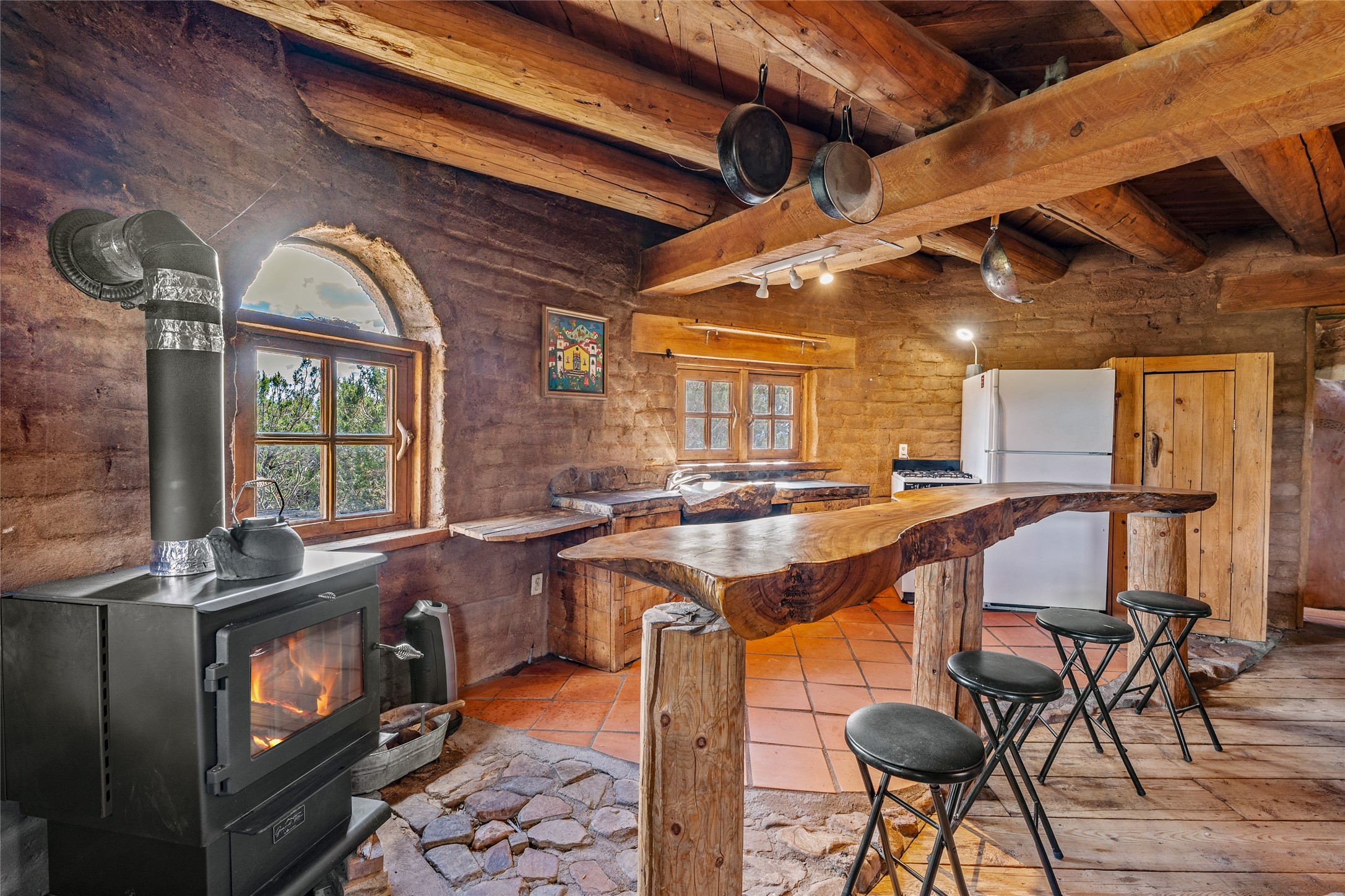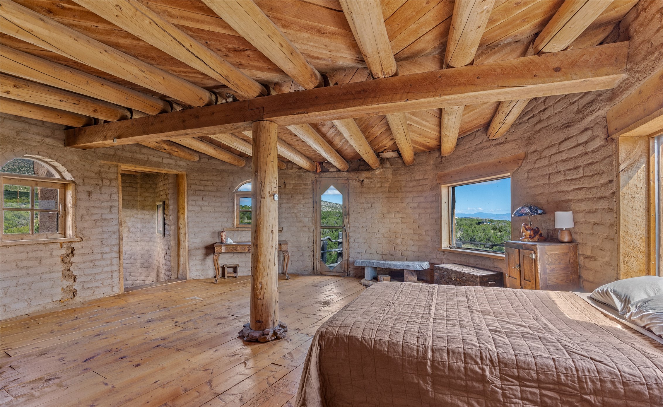 Revealing a sculptor's touch, this hand-built round adobe on the slopes of the Ortiz Mountains is ready for new energy. Nestled on 13.34 elevated acres with gentle, easy topography and breathtaking views, this one-bedroom, one-bath home offers a sanctuary from the world while being less than a quarter mile from pavement and approximately 30 minutes from Santa Fe. Unique features add warmth and character, including a spiral staircase, wide plank wood floors, hand-hewn counters, a stone sink, and viga ceilings. Outside, the upstairs decks, which currently need repair, offer some of the best views in the region. With wood heat, public electricity, a private well, and a newer septic system, this home is poised to provide a distinctive retreat. While completely charming, this home requires some repairs and upgrades and is priced accordingly. Please make an appointment to see.