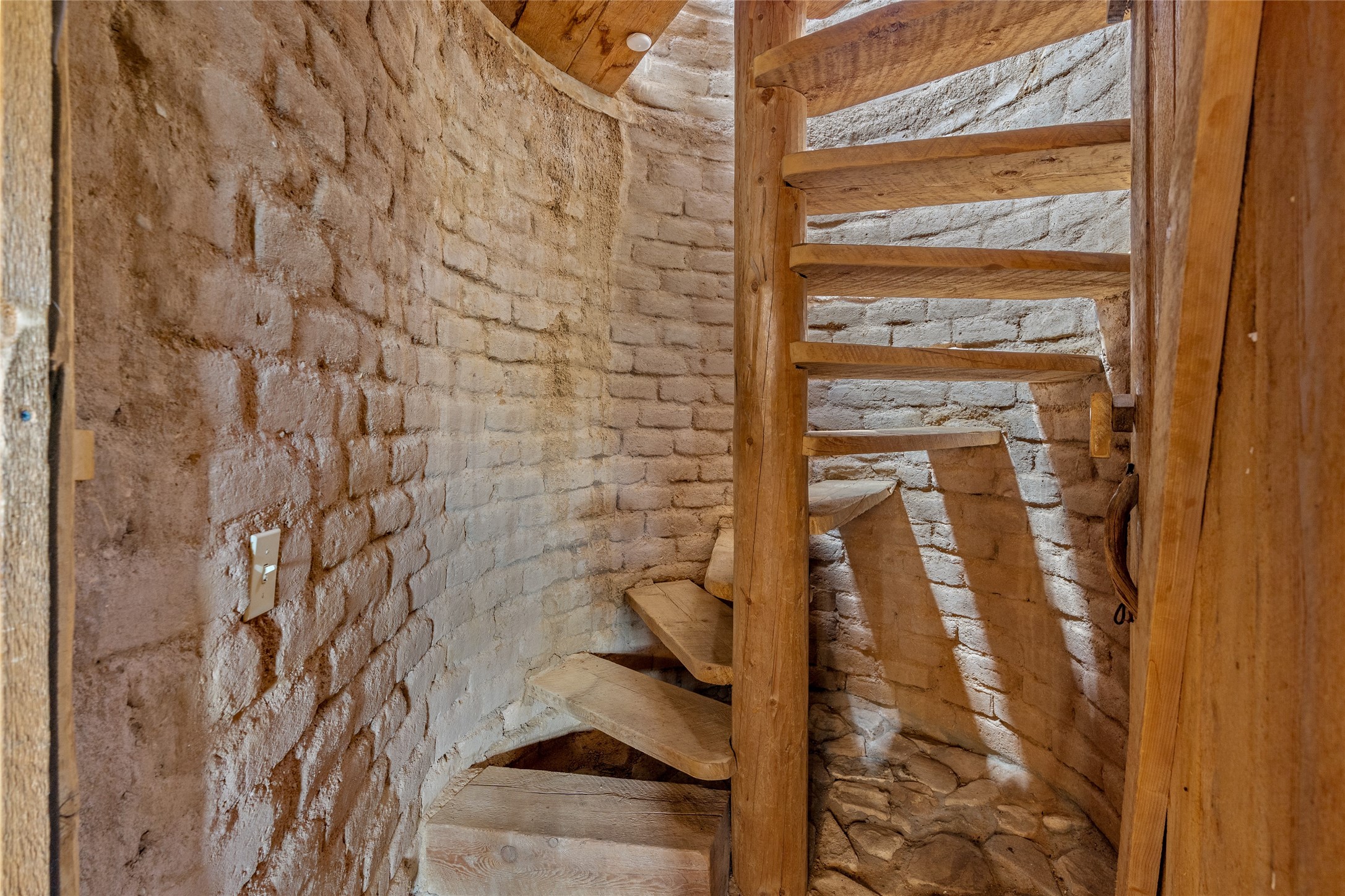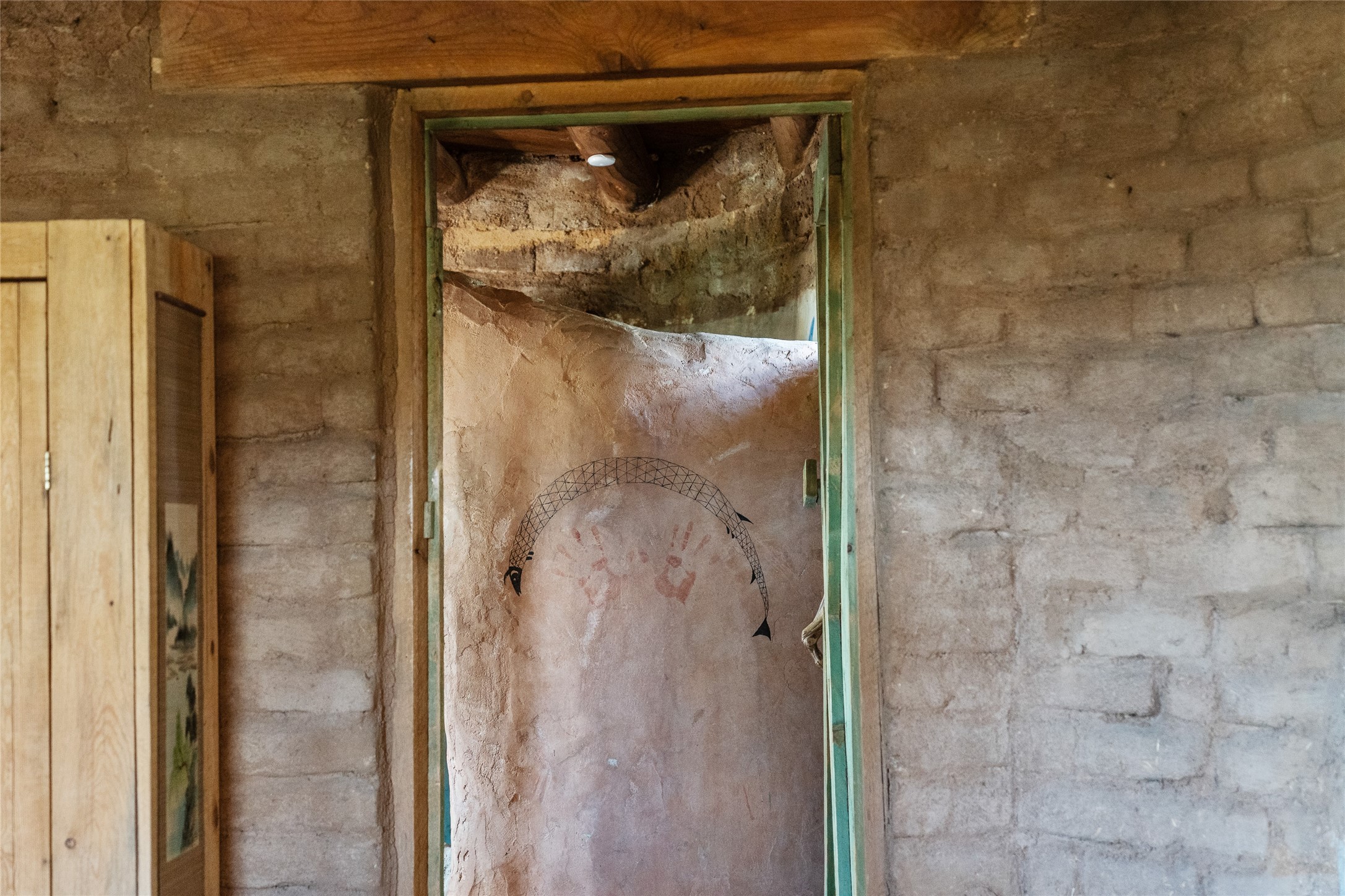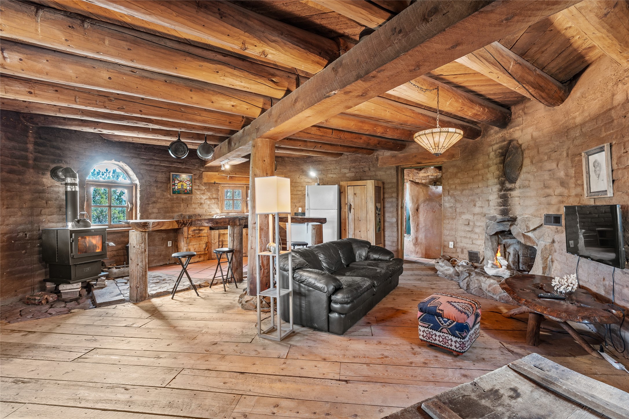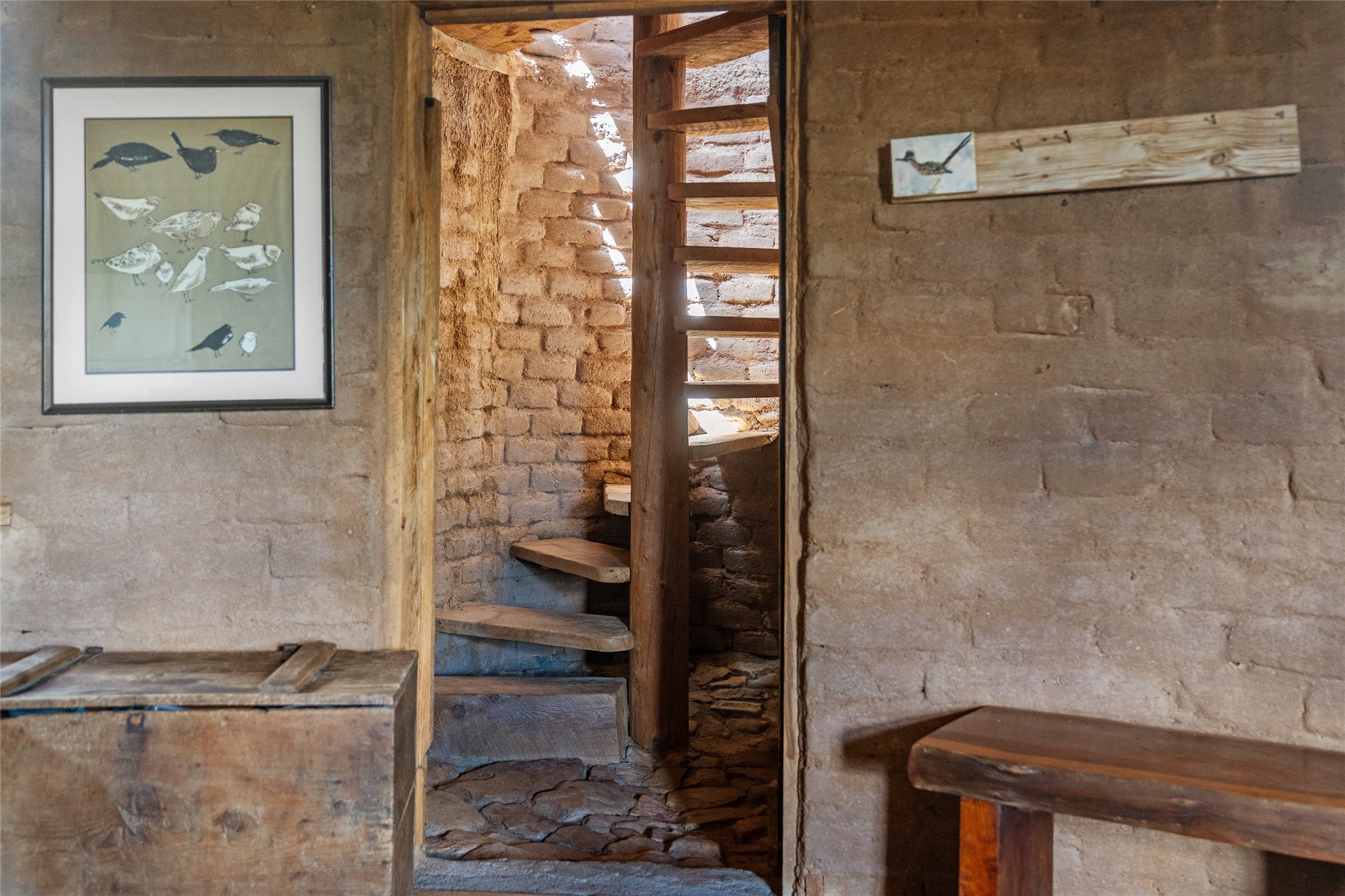 Revealing a sculptor's touch, this hand-built round adobe on the slopes of the Ortiz Mountains is ready for new energy. Nestled on 13.34 elevated acres with gentle, easy topography and breathtaking views, this one-bedroom, one-bath home offers a sanctuary from the world while being less than a quarter mile from pavement and approximately 30 minutes from Santa Fe. Unique features add warmth and character, including a spiral staircase, wide plank wood floors, hand-hewn counters, a stone sink, and viga ceilings. Outside, the upstairs decks, which currently need repair, offer some of the best views in the region. With wood heat, public electricity, a private well, and a newer septic system, this home is poised to provide a distinctive retreat. While completely charming, this home requires some repairs and upgrades and is priced accordingly. Please make an appointment to see.