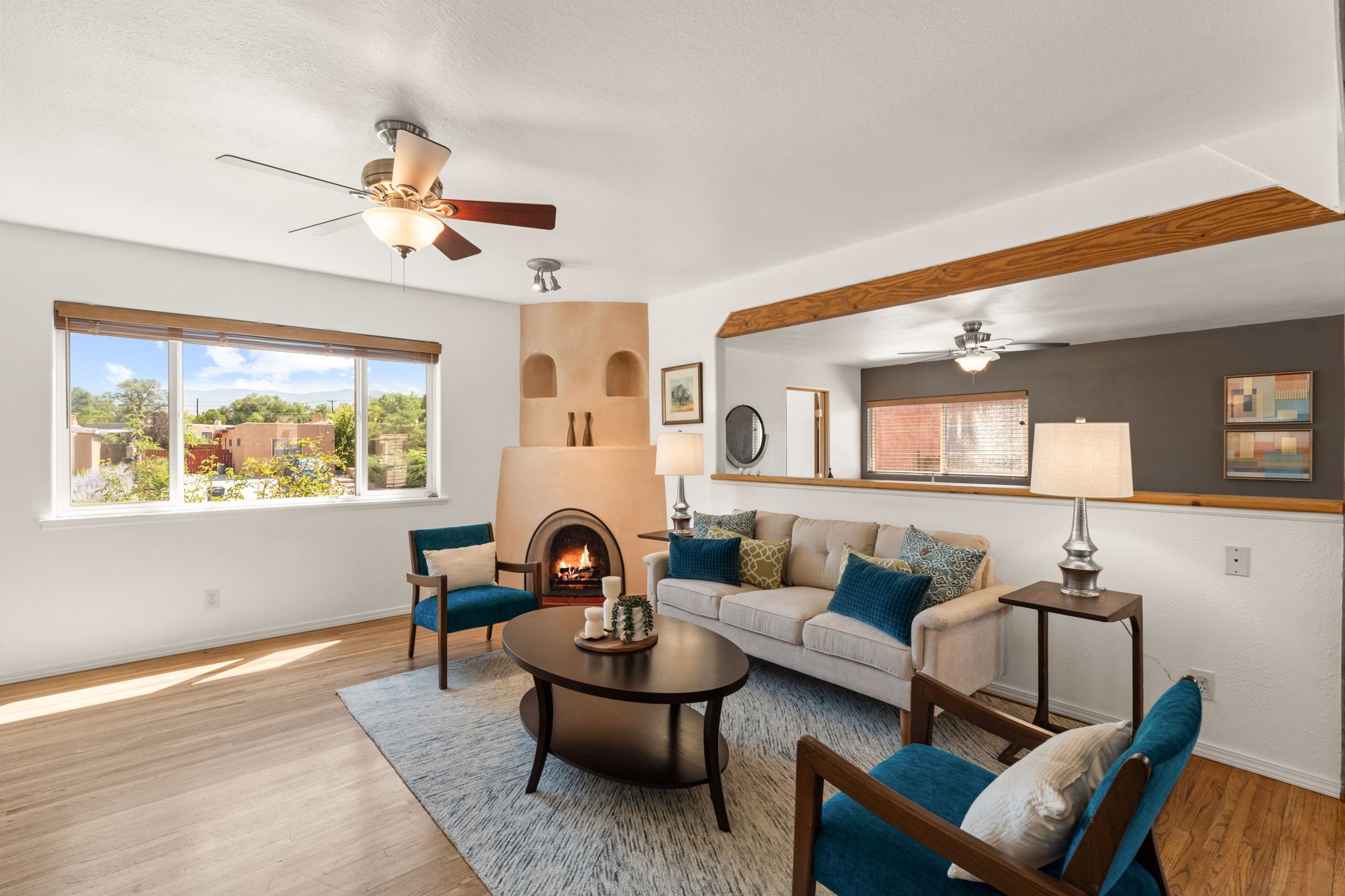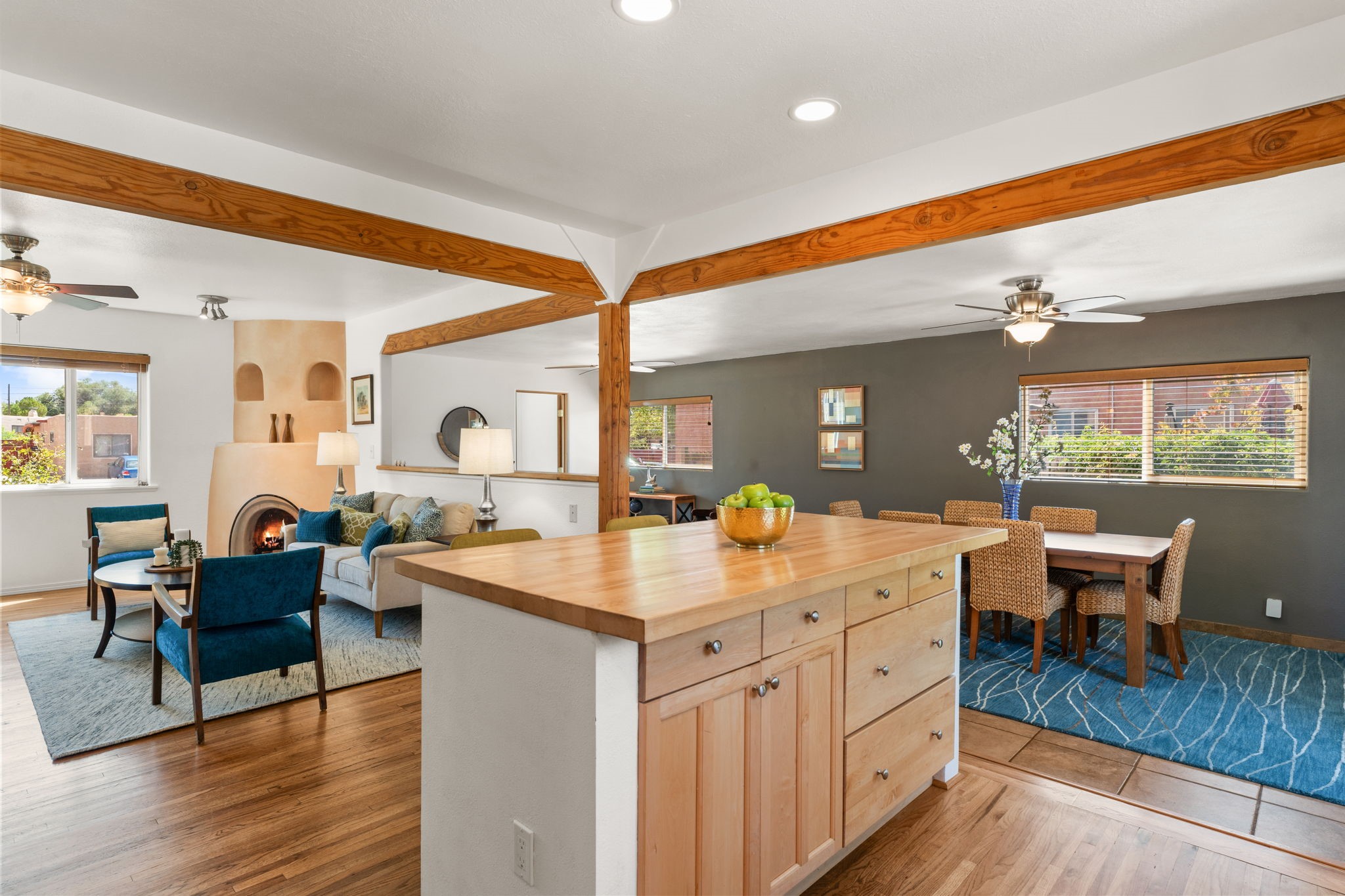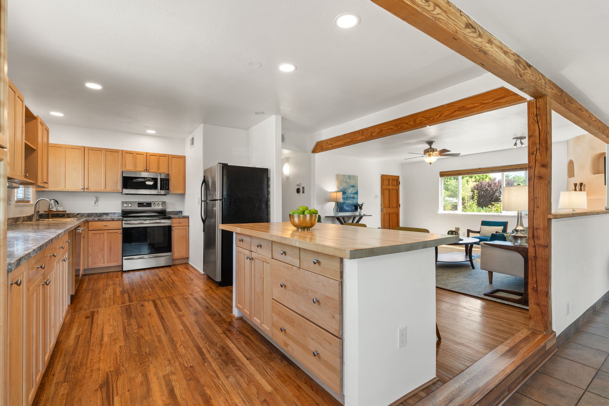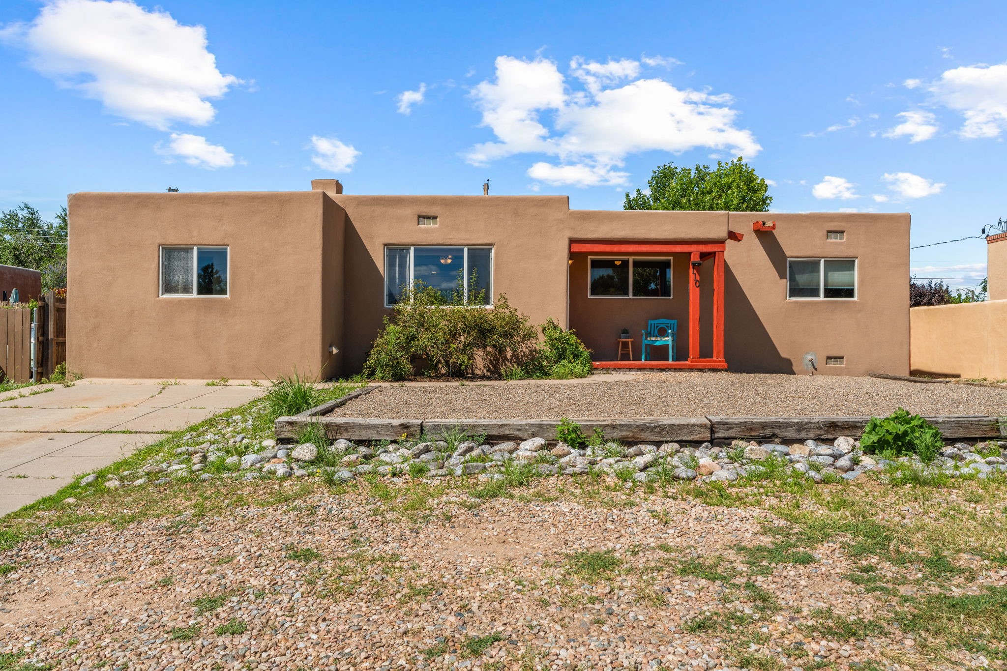 This light-filled and beautifully remodeled Stamm home offers captivating Sangre de Cristo mountain views and a seamless blend of classic charm and modern upgrades. The open floor plan centers around a spacious, completely updated kitchen featuring sleek cabinetry, stainless-steel appliances, and a generous butcher block island with ample storage--perfect for gathering and entertaining, with hardwood floors lending warmth throughout. The inviting living room boasts a cozy corner Kiva fireplace and a large picture window framing the unforgettable mountain vistas. The home offers three comfortable bedrooms, including a primary suite with a tastefully remodeled en suite bath. Central heating and A/C provide year-round comfort. Outside, the expansive and private back yard includes a large storage shed with shelving and a second smaller shed ideal for garden tools. With only one step throughout the entire home, accessibility is easy and effortless. Just moments from the Santa Fe River Trail, La Tierra trails and dog park, and within walking distance to local coffee shops and shopping, this property blends convenience, comfort, and natural beauty into a truly special place to call home.
