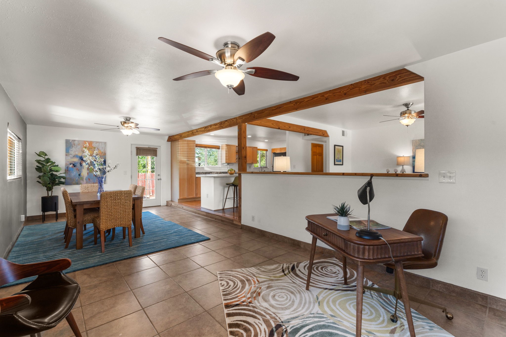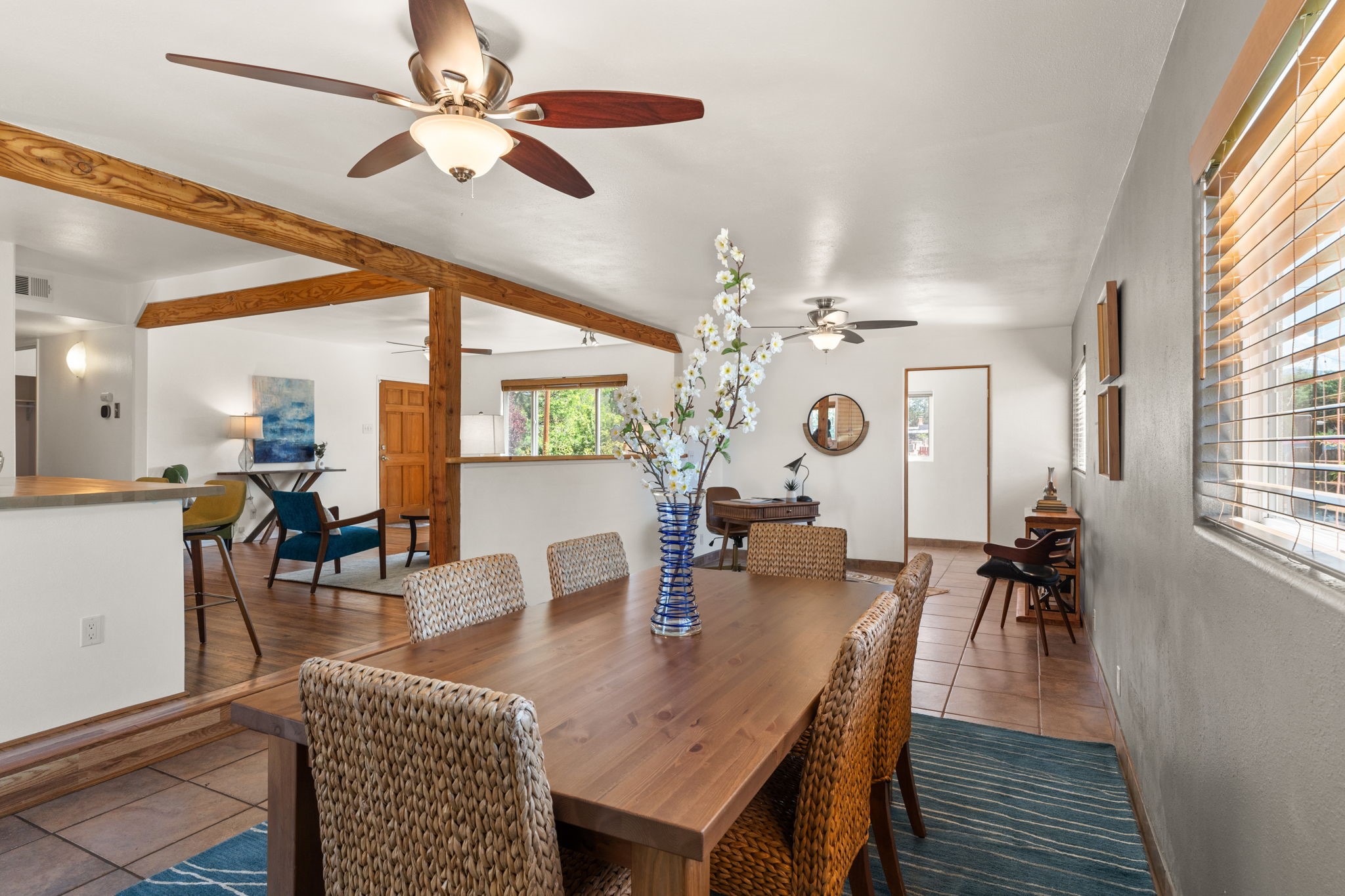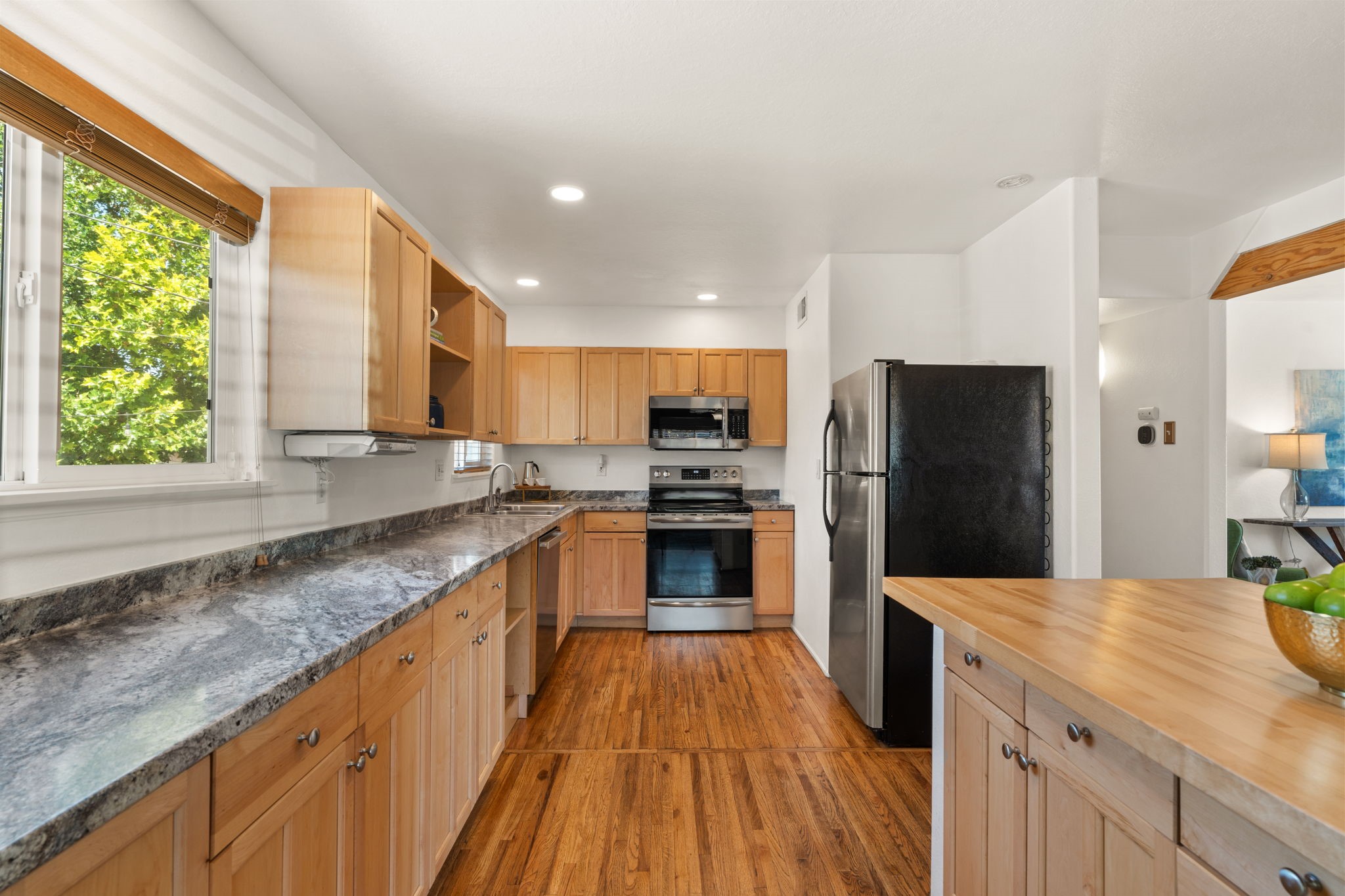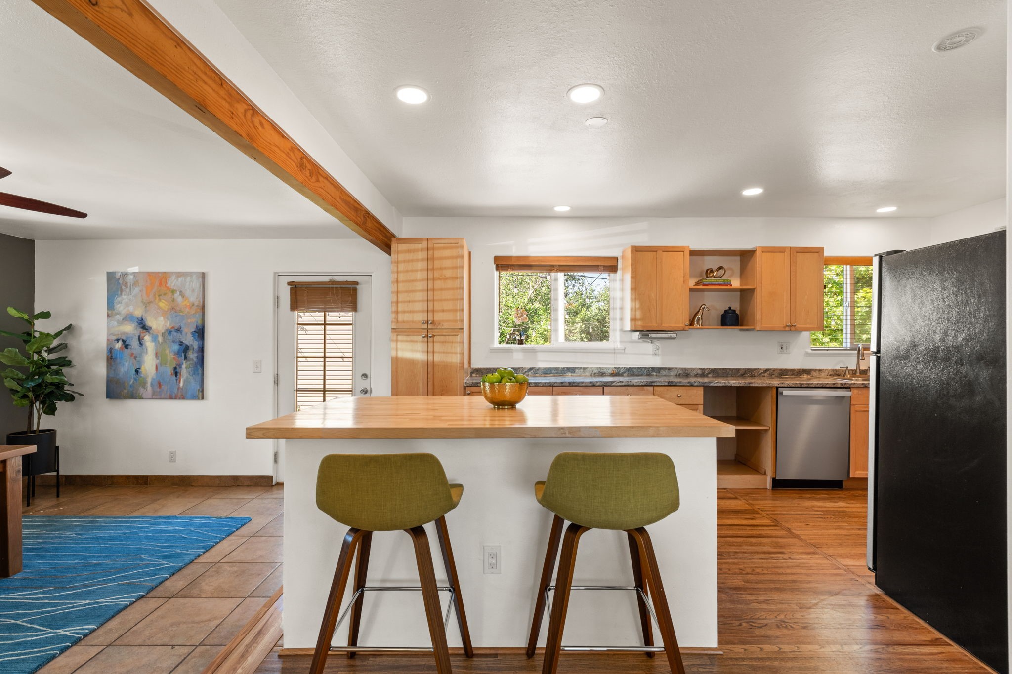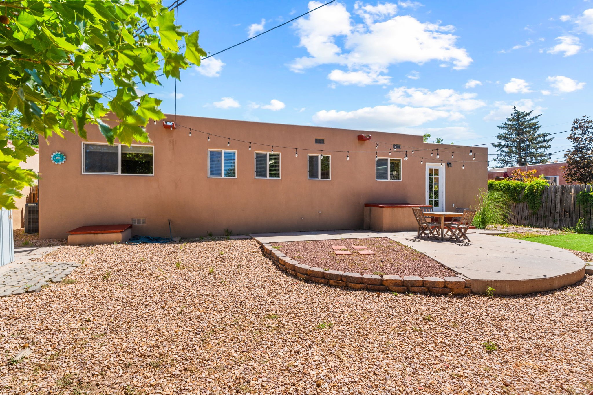 This light-filled and beautifully remodeled Stamm home offers captivating Sangre de Cristo mountain views and a seamless blend of classic charm and modern upgrades. The open floor plan centers around a spacious, completely updated kitchen featuring sleek cabinetry, stainless-steel appliances, and a generous butcher block island with ample storage--perfect for gathering and entertaining, with hardwood floors lending warmth throughout. The inviting living room boasts a cozy corner Kiva fireplace and a large picture window framing the unforgettable mountain vistas. The home offers three comfortable bedrooms, including a primary suite with a tastefully remodeled en suite bath. Central heating and A/C provide year-round comfort. Outside, the expansive and private back yard includes a large storage shed with shelving and a second smaller shed ideal for garden tools. With only one step throughout the entire home, accessibility is easy and effortless. Just moments from the Santa Fe River Trail, La Tierra trails and dog park, and within walking distance to local coffee shops and shopping, this property blends convenience, comfort, and natural beauty into a truly special place to call home.
