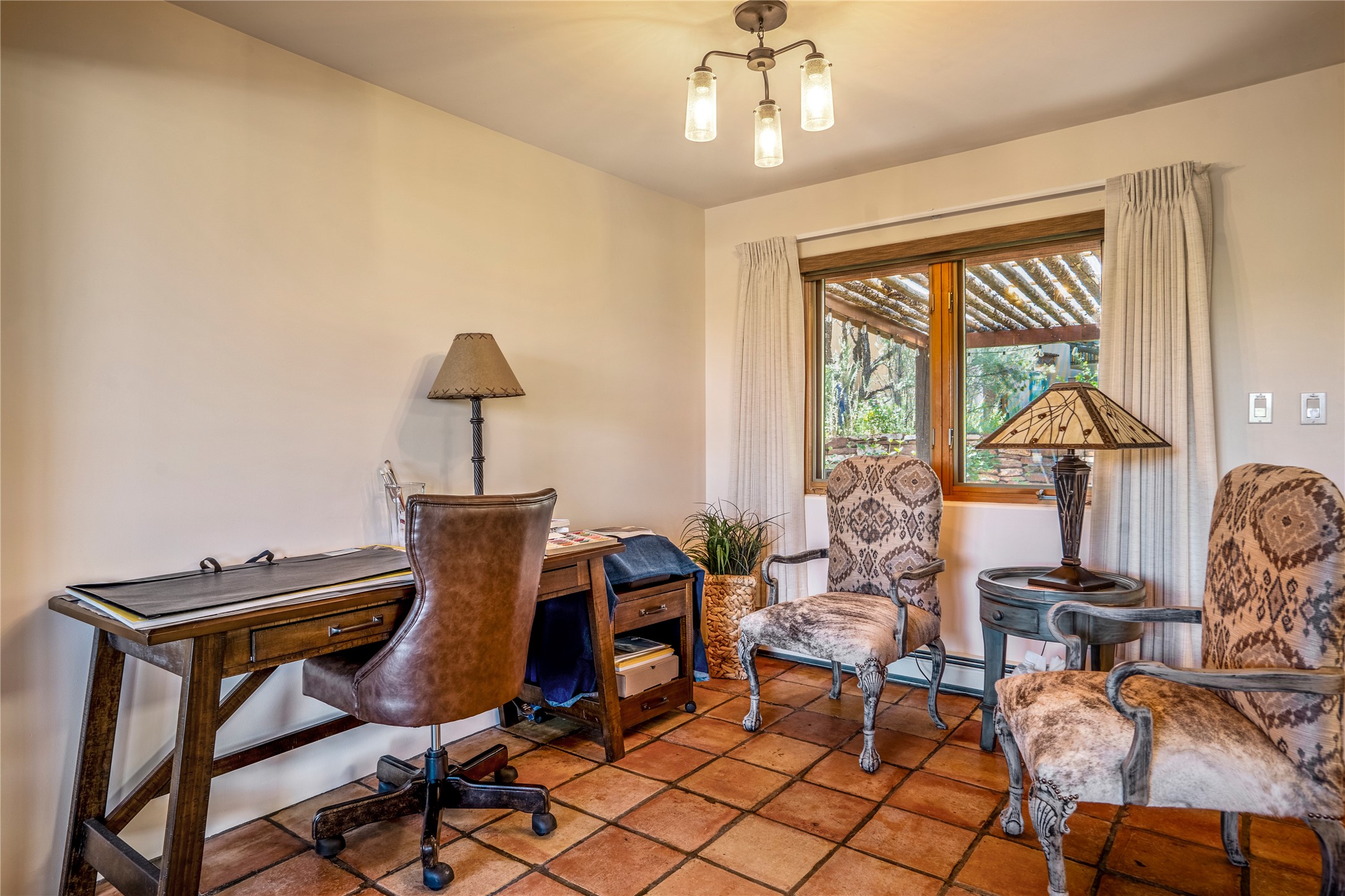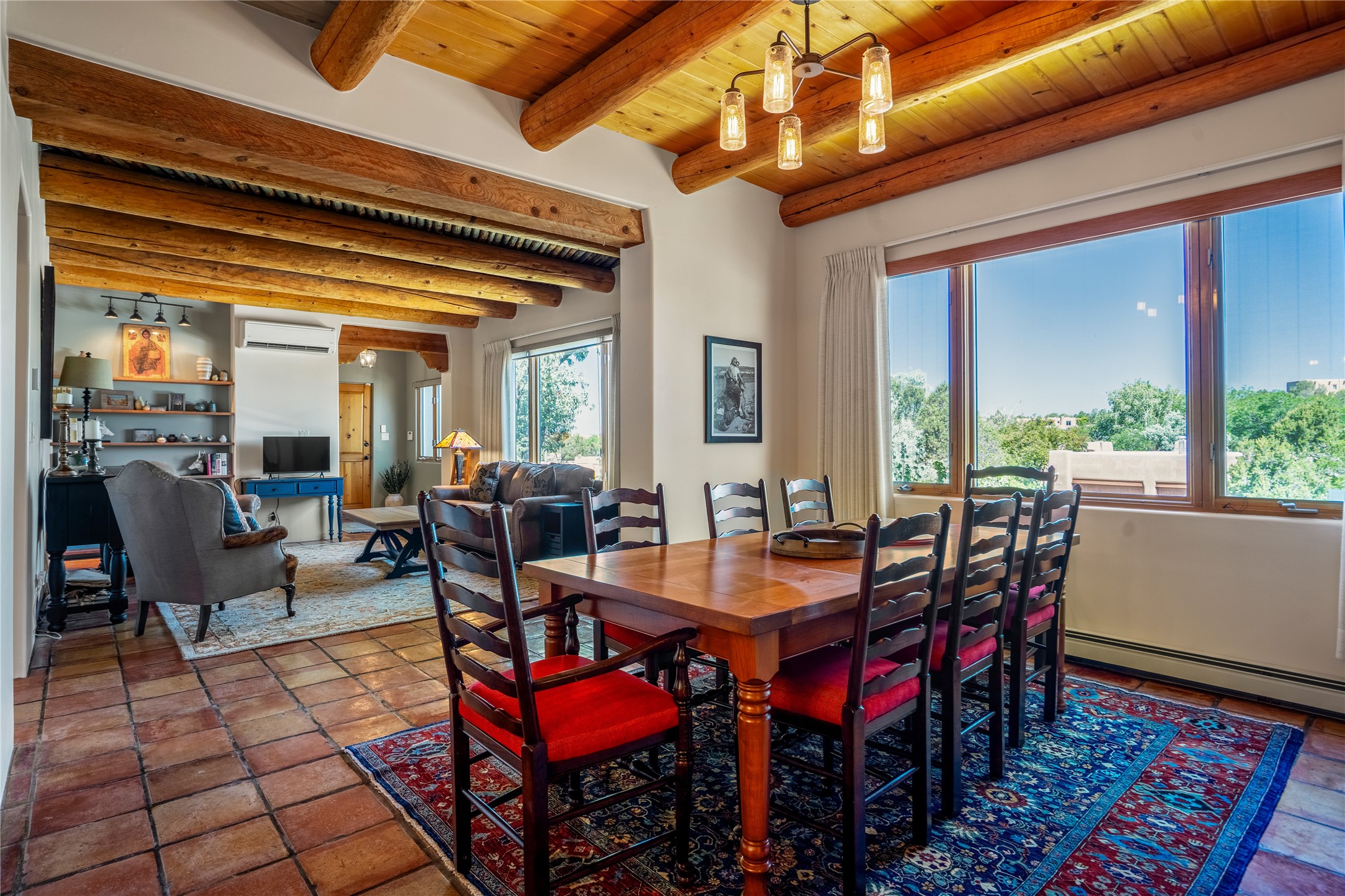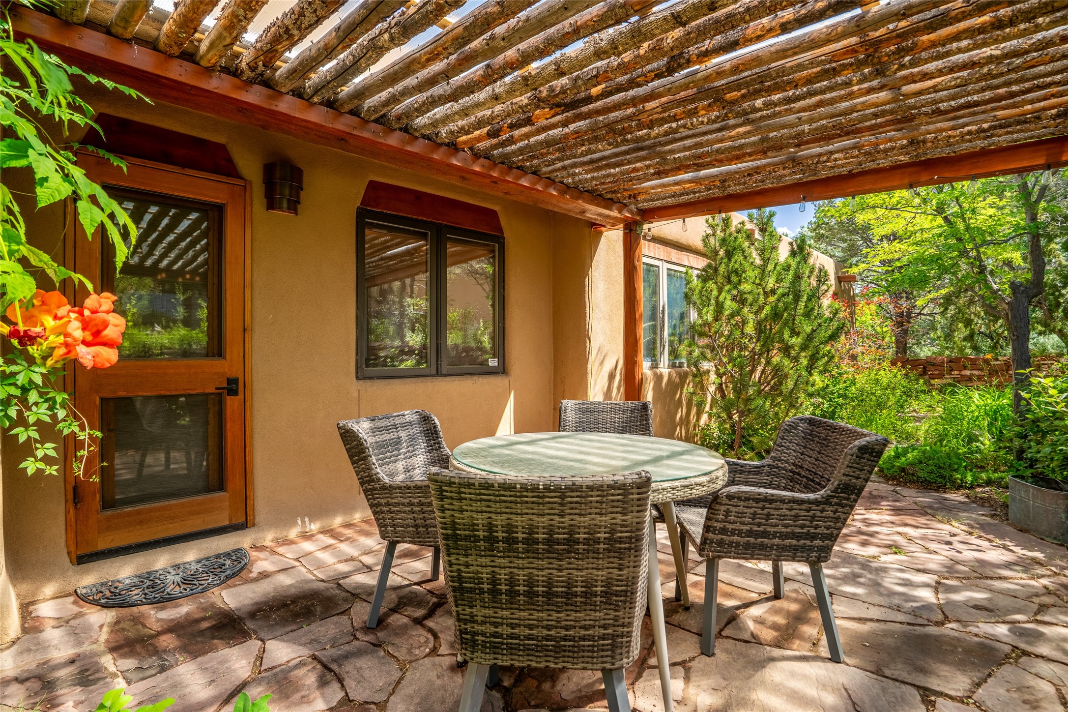 Celebrating the essence of Santa Fe, this lovely Pueblo Revival residence sits elevated on a fabulous corner lot in the foothills of the Sangre de Cristo mountain. The open floor plan, the distribution of natural light, high ceilings and vigas, with a nicely designed kitchen and patio off the kitchen perfect for entertaining, this property has much to offer the discriminating Santa Fe resident. The furniture and rugs were sourced with great care and the landscaping was professionally designed and maintained. A move-in ready home in Santa Fe