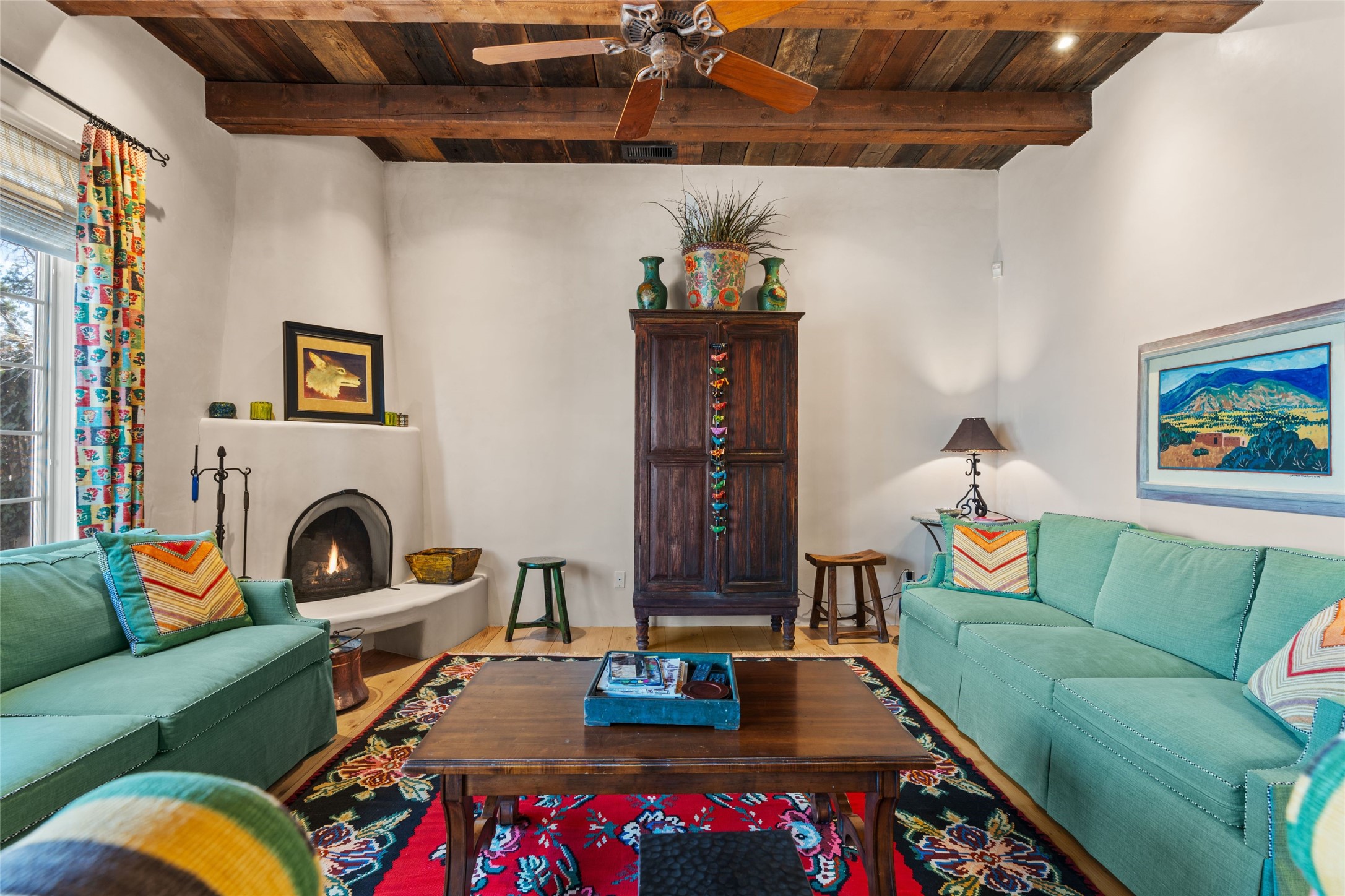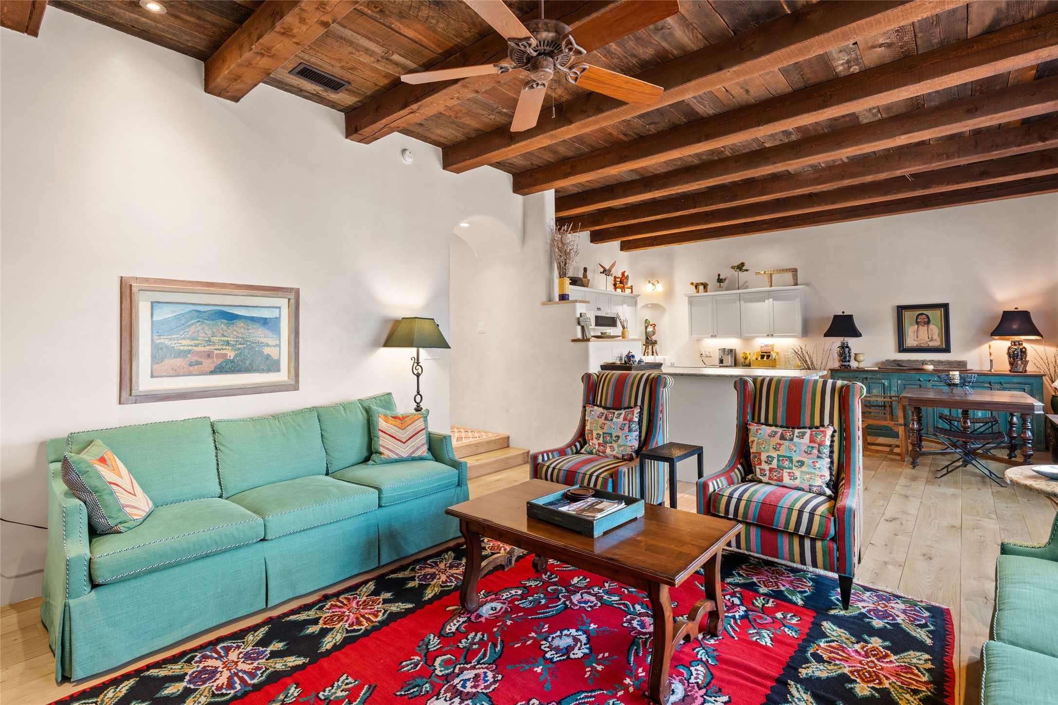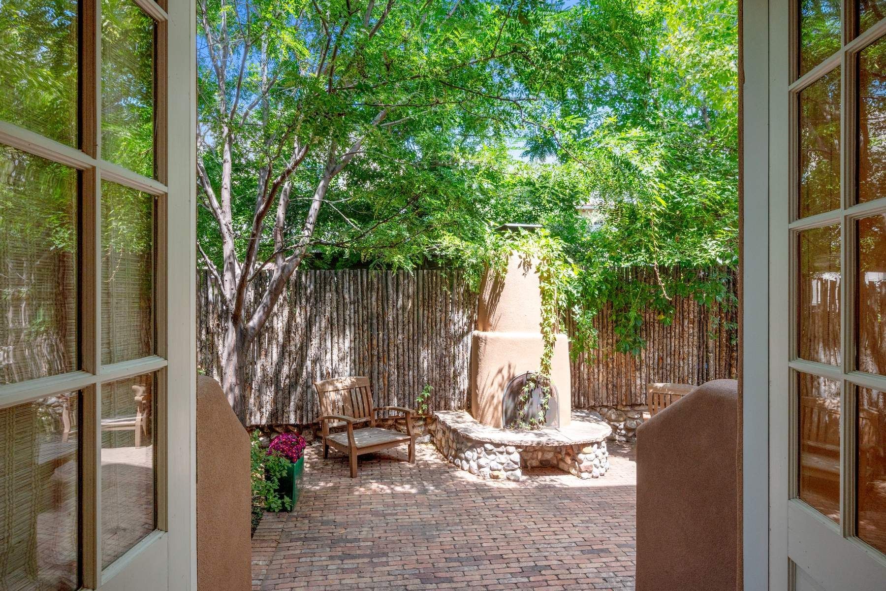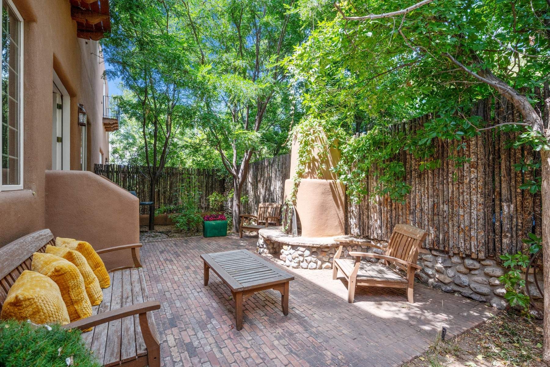 Nestled in a prime location just moments from Fort Marcy Park and the historic Santa Fe Plaza, this charming two-story home blends Southwestern character with modern comfort. Featuring 2 bedrooms and 3 bathrooms, this beautifully designed residence boasts stunning beam ceilings and rich wood floors throughout, creating a warm and inviting atmosphere.The open-concept layout seamlessly connects the kitchen, dining area, and living room, with a patio door leading to a private back patio complete with a kiva fireplace, perfect for outdoor relaxation. Upstairs, the primary suite offers a cozy fireplace, large shutters for customized light control, and a private balcony showcasing slight mountain views and overlooking the patio below. The guest bedroom, also located upstairs, features an en-suite bathroom for added privacy.Additional highlights include a one-car garage plus off-street parking, tile floors in the bathrooms, and a fantastic location within walking distance of restaurants, shopping, galleries, and entertainment. Outdoor enthusiasts will appreciate being less than 15 miles from Ski Santa Fe, making this home an ideal retreat year-round.