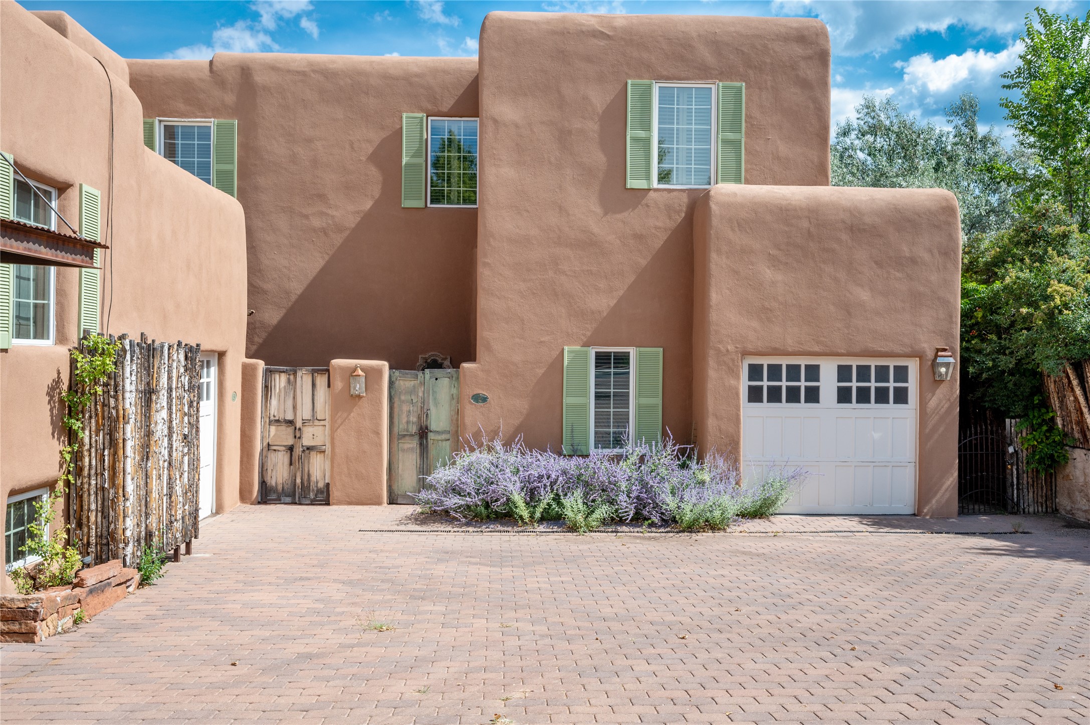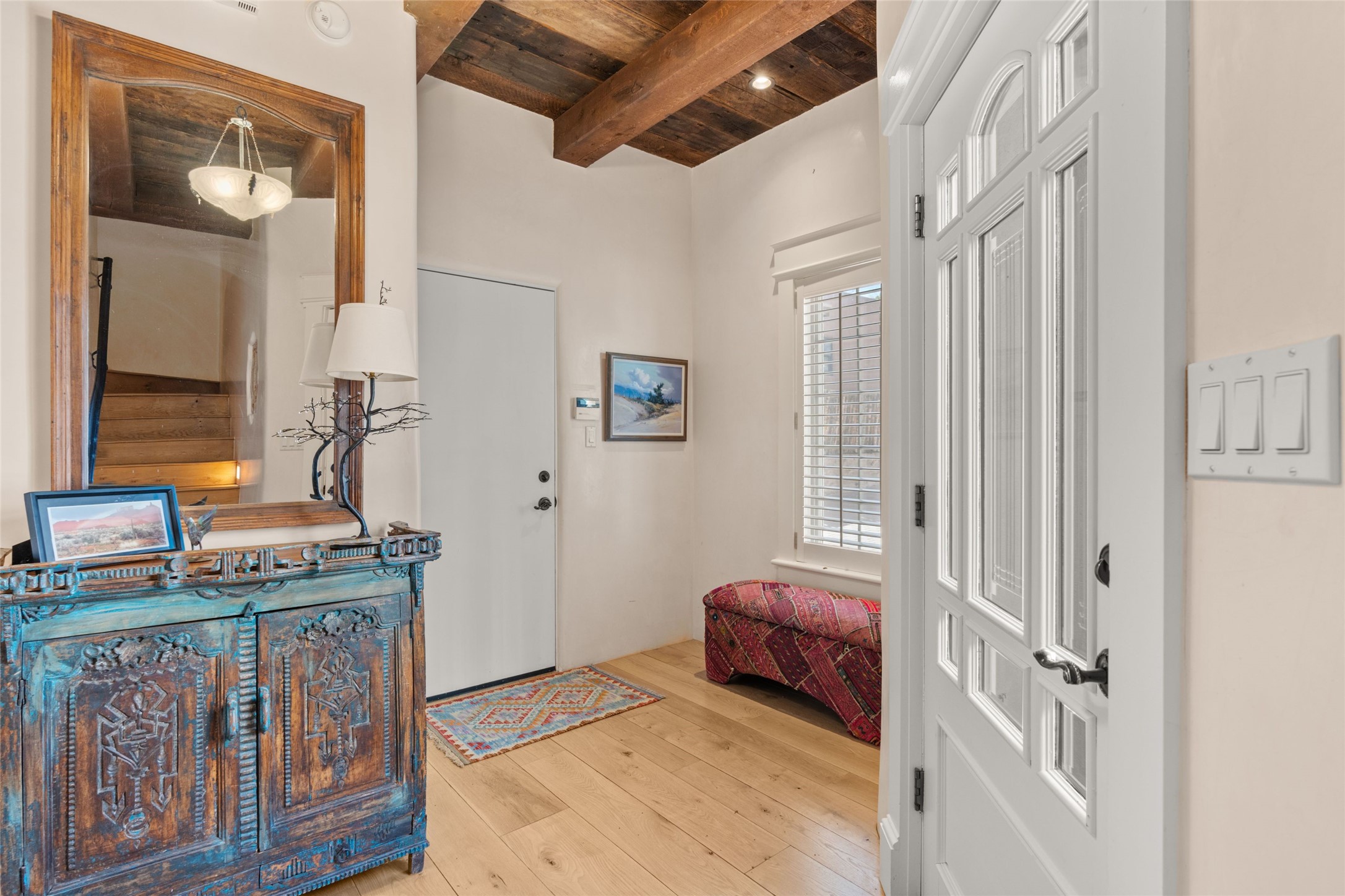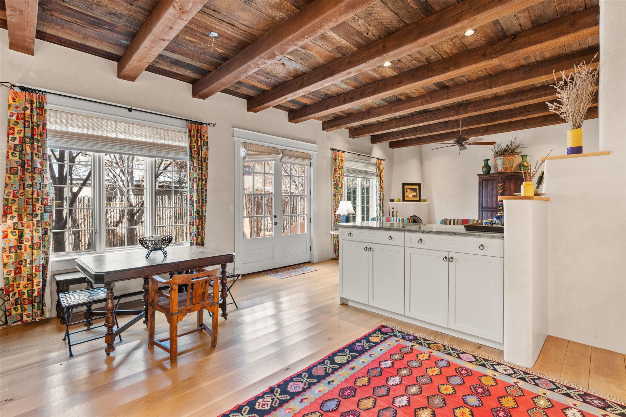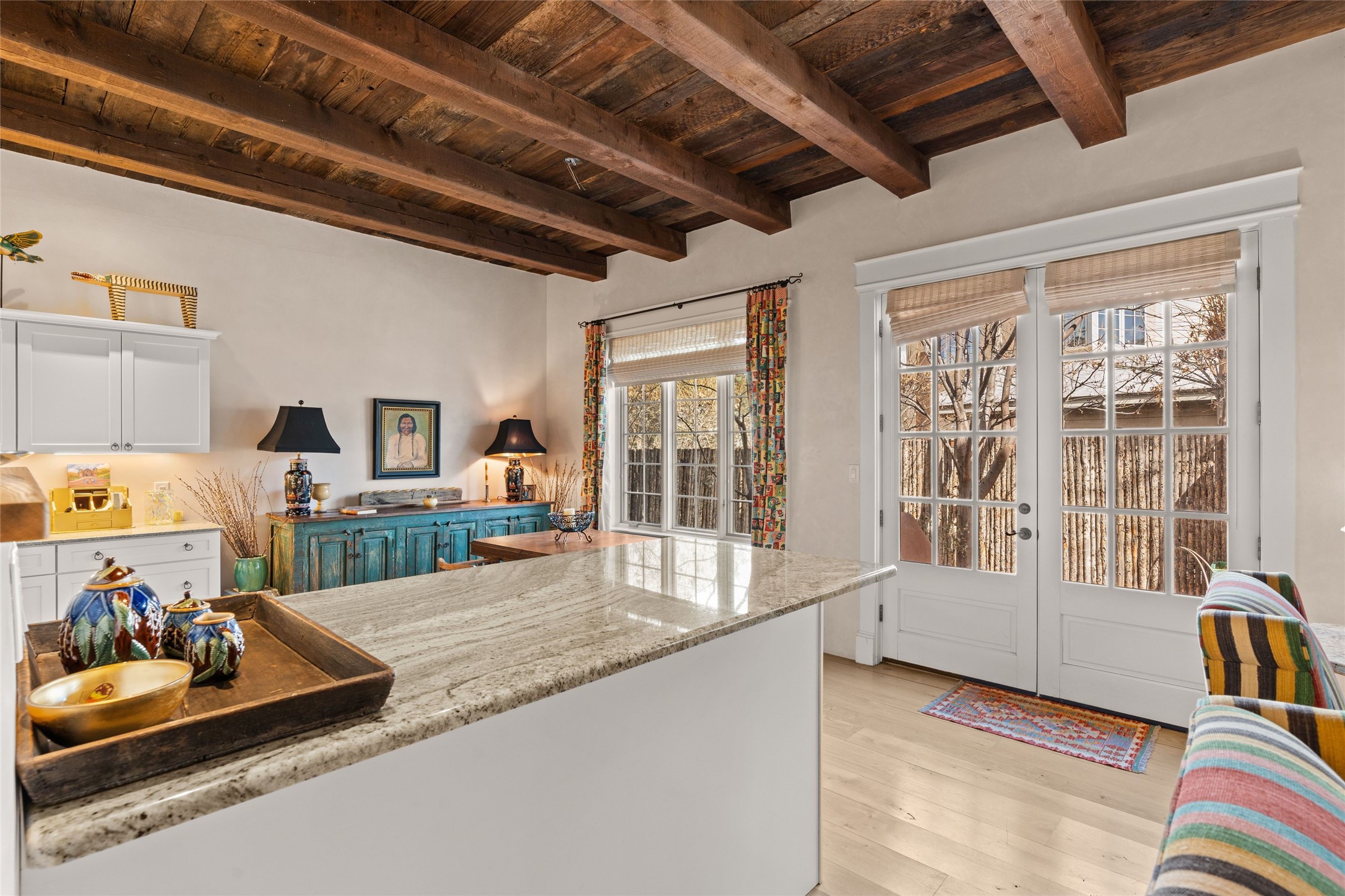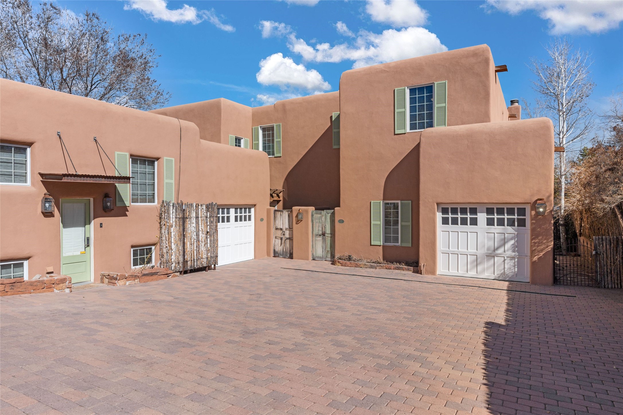 Nestled in a prime location just moments from Fort Marcy Park and the historic Santa Fe Plaza, this charming two-story home blends Southwestern character with modern comfort. Featuring 2 bedrooms and 3 bathrooms, this beautifully designed residence boasts stunning beam ceilings and rich wood floors throughout, creating a warm and inviting atmosphere.The open-concept layout seamlessly connects the kitchen, dining area, and living room, with a patio door leading to a private back patio complete with a kiva fireplace, perfect for outdoor relaxation. Upstairs, the primary suite offers a cozy fireplace, large shutters for customized light control, and a private balcony showcasing slight mountain views and overlooking the patio below. The guest bedroom, also located upstairs, features an en-suite bathroom for added privacy.Additional highlights include a one-car garage plus off-street parking, tile floors in the bathrooms, and a fantastic location within walking distance of restaurants, shopping, galleries, and entertainment. Outdoor enthusiasts will appreciate being less than 15 miles from Ski Santa Fe, making this home an ideal retreat year-round.