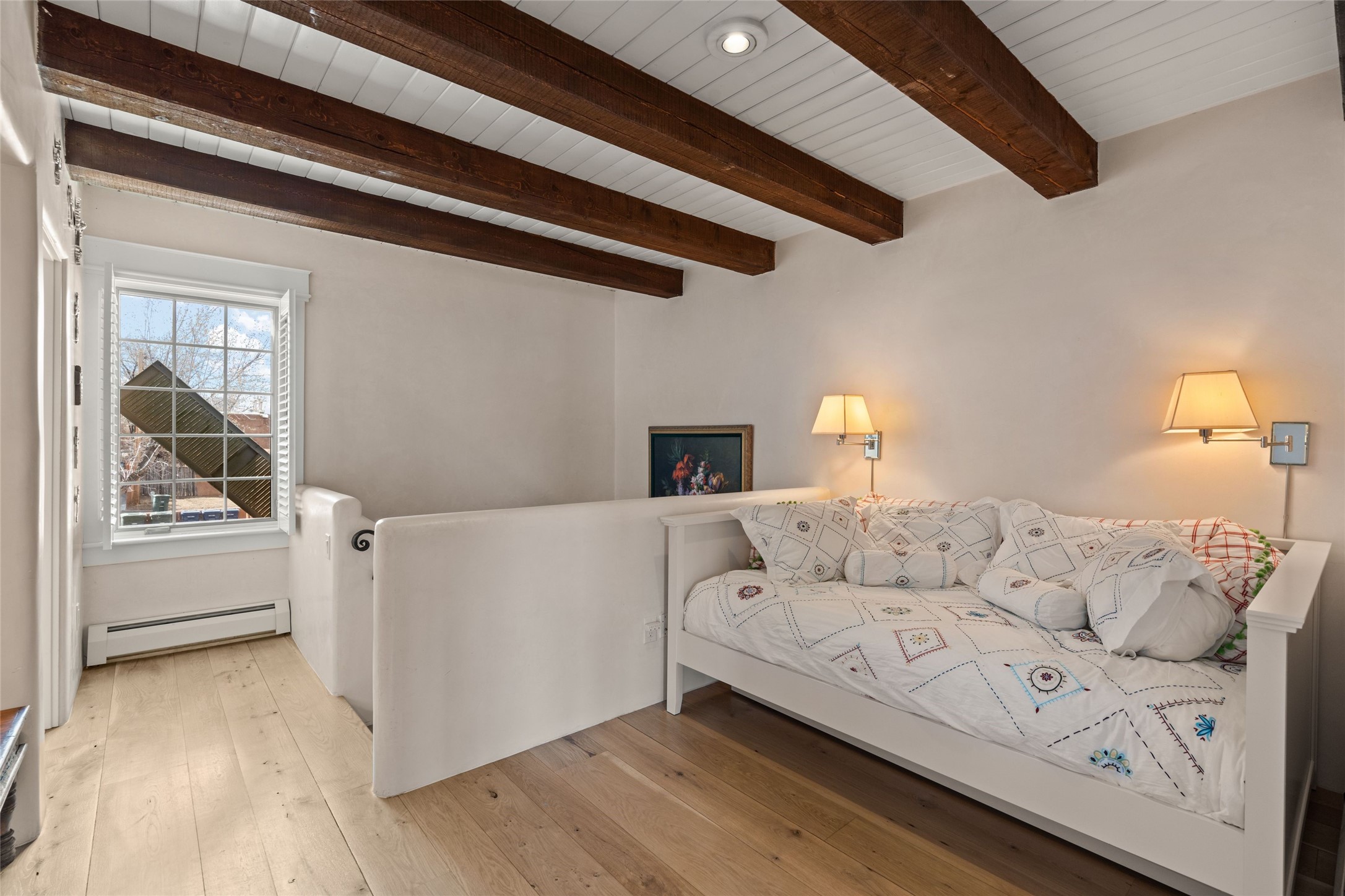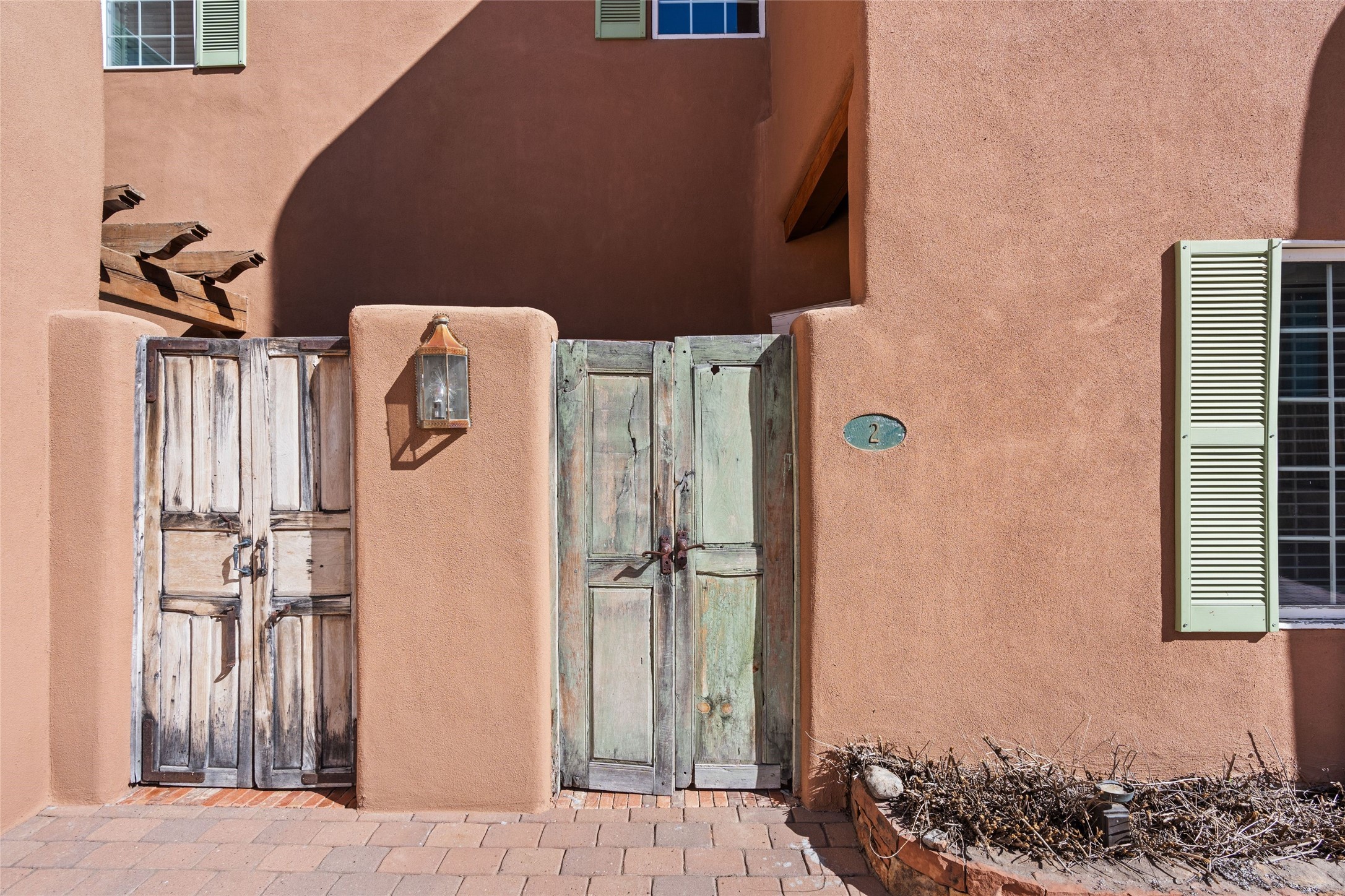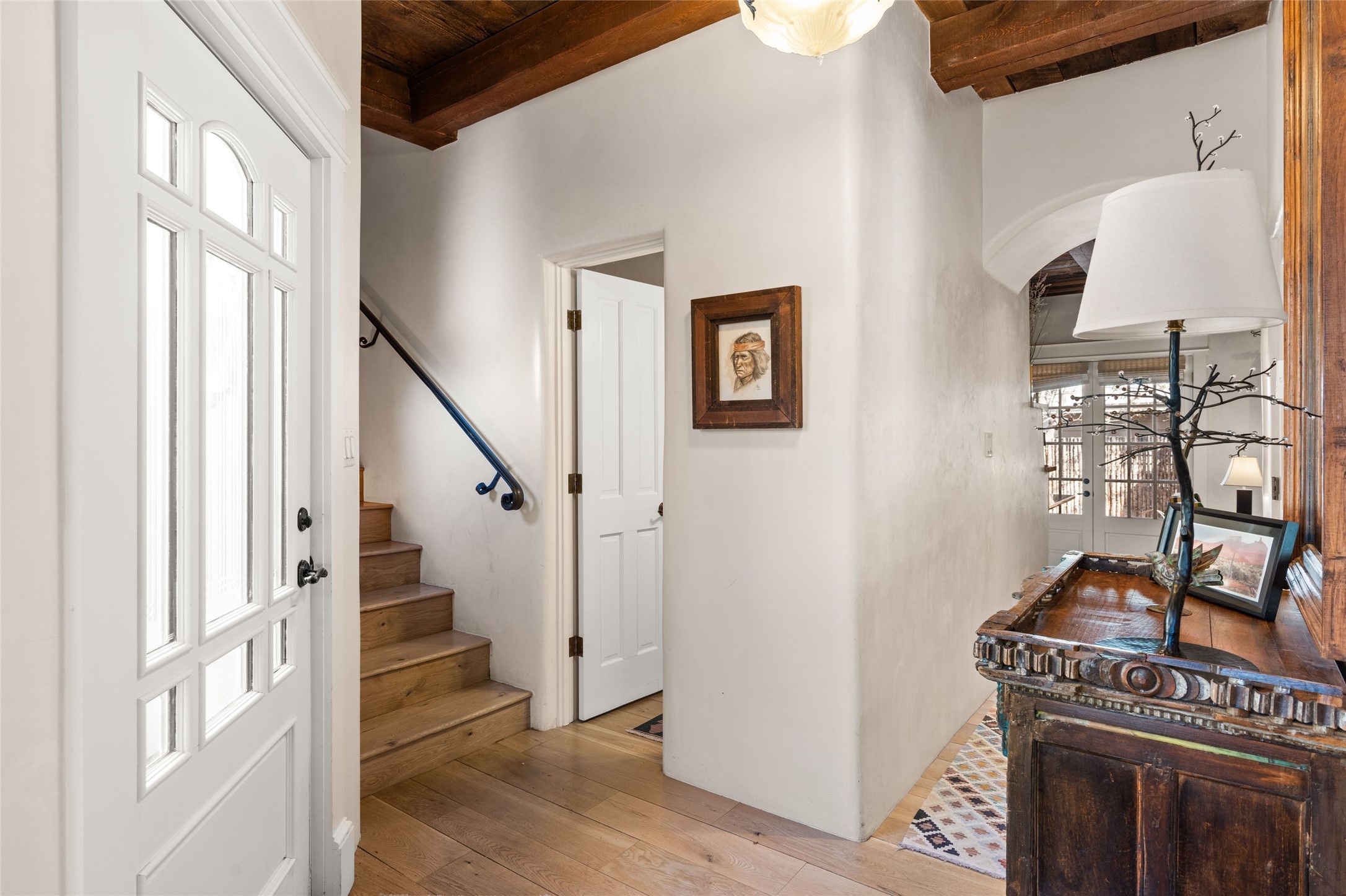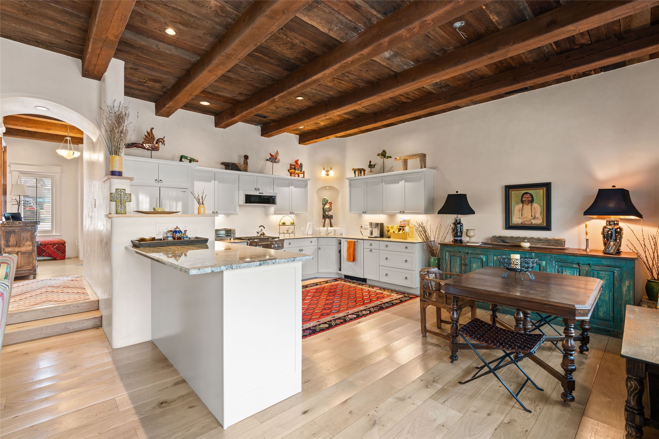 Nestled in a prime location just moments from Fort Marcy Park and the historic Santa Fe Plaza, this charming two-story home blends Southwestern character with modern comfort. Featuring 2 bedrooms and 3 bathrooms, this beautifully designed residence boasts stunning beam ceilings and rich wood floors throughout, creating a warm and inviting atmosphere.The open-concept layout seamlessly connects the kitchen, dining area, and living room, with a patio door leading to a private back patio complete with a kiva fireplace, perfect for outdoor relaxation. Upstairs, the primary suite offers a cozy fireplace, large shutters for customized light control, and a private balcony showcasing slight mountain views and overlooking the patio below. The guest bedroom, also located upstairs, features an en-suite bathroom for added privacy.Additional highlights include a one-car garage plus off-street parking, tile floors in the bathrooms, and a fantastic location within walking distance of restaurants, shopping, galleries, and entertainment. Outdoor enthusiasts will appreciate being less than 15 miles from Ski Santa Fe, making this home an ideal retreat year-round.