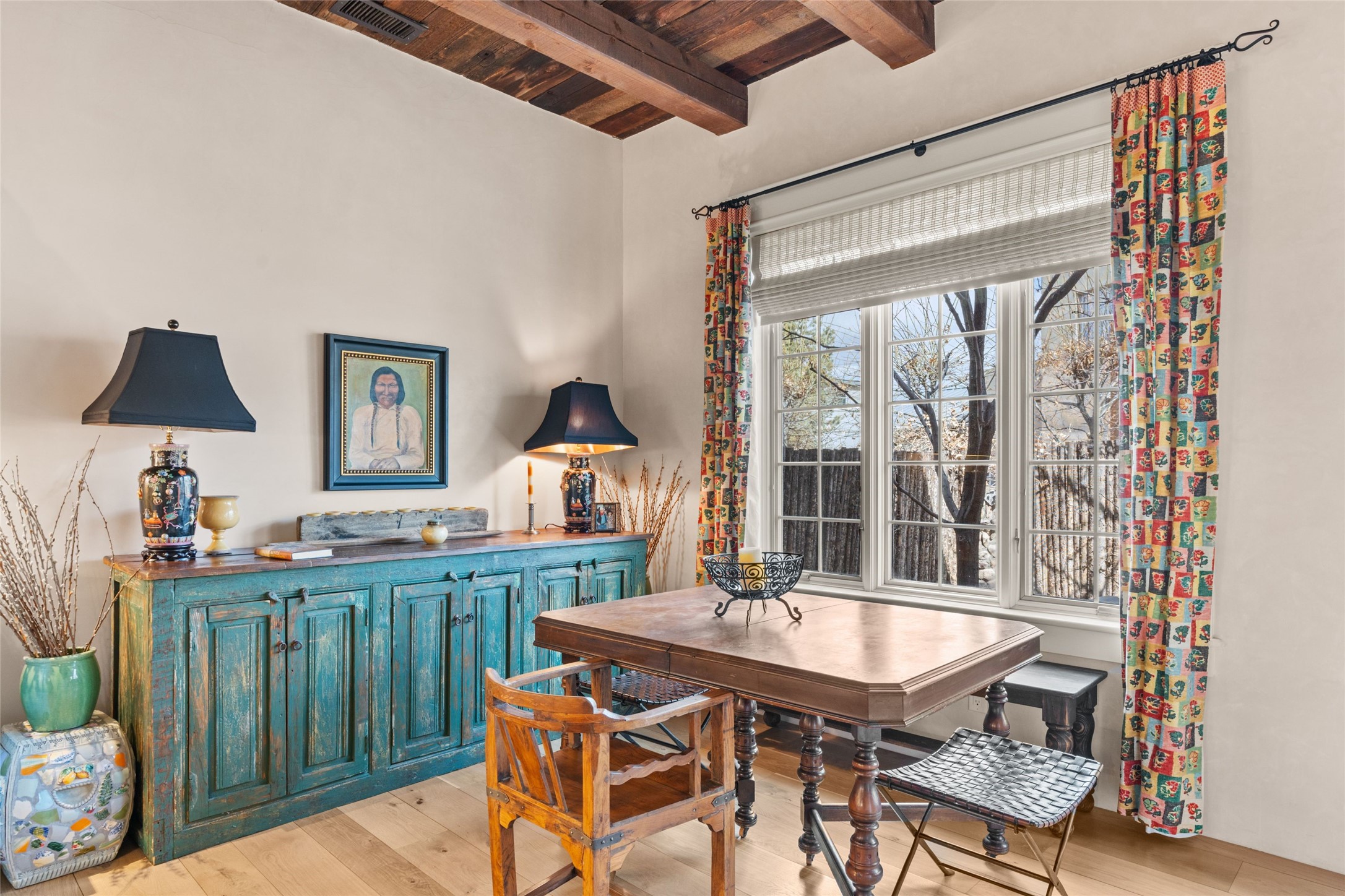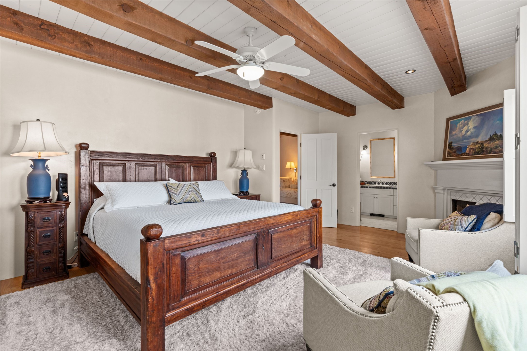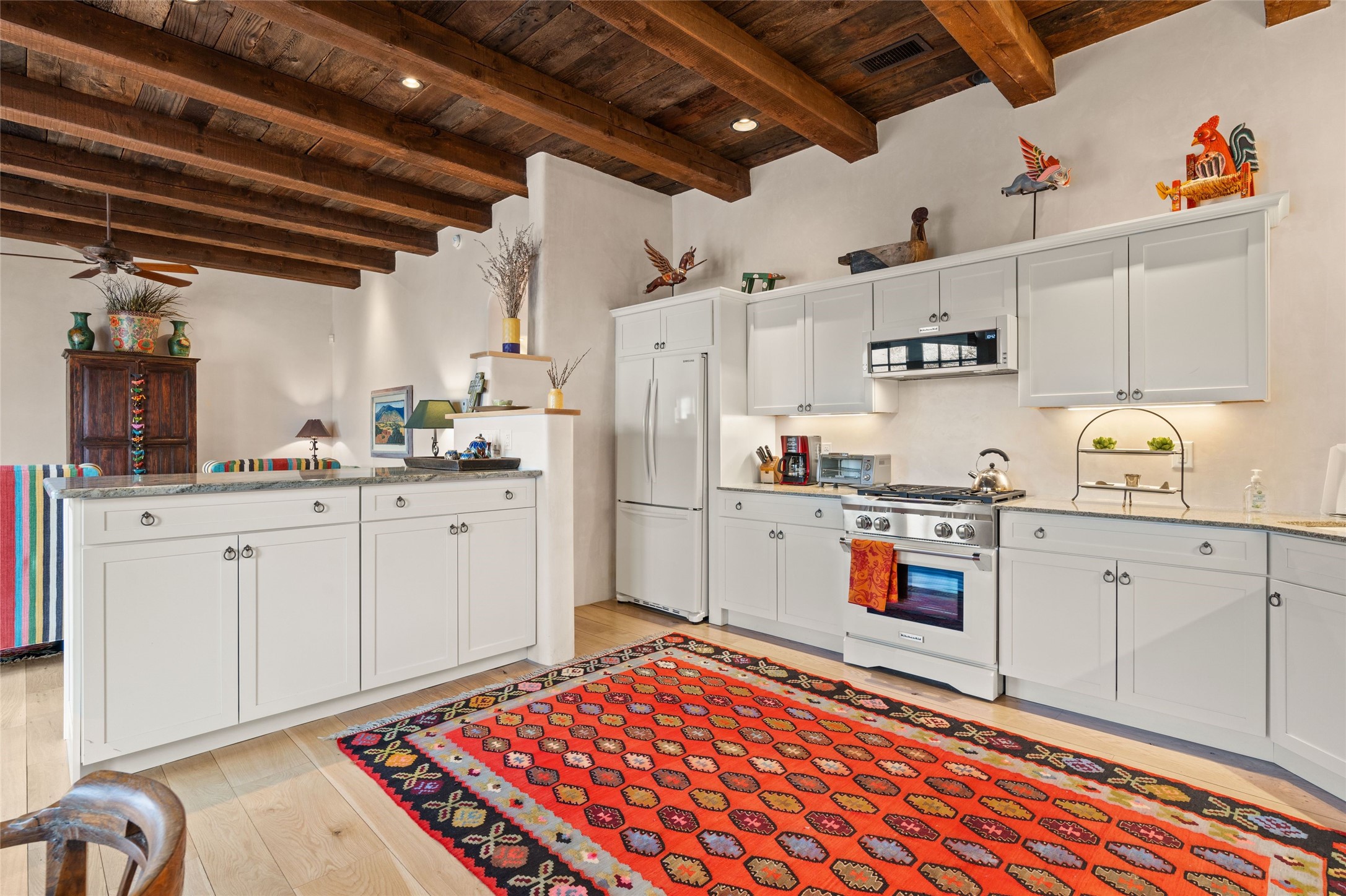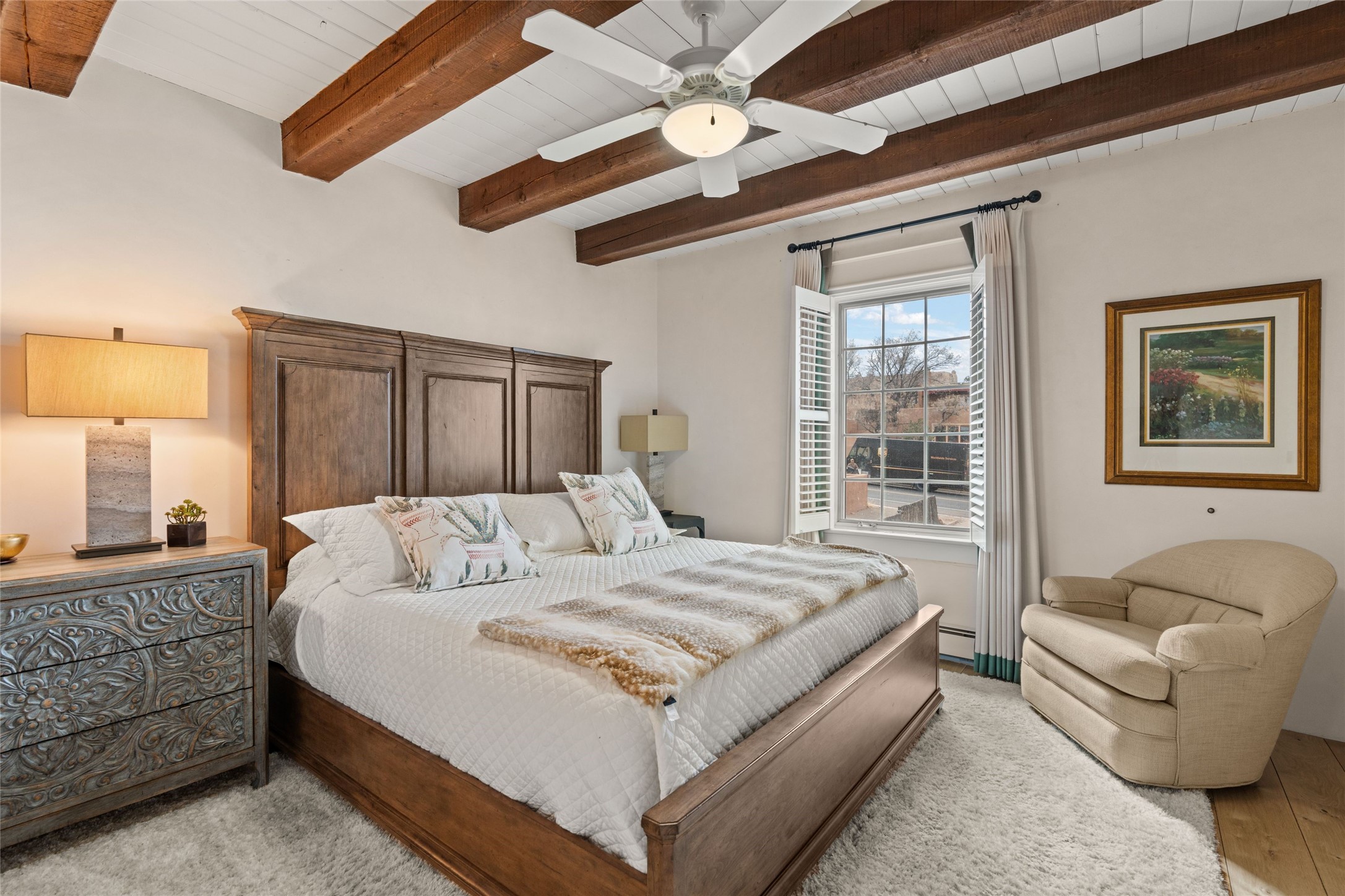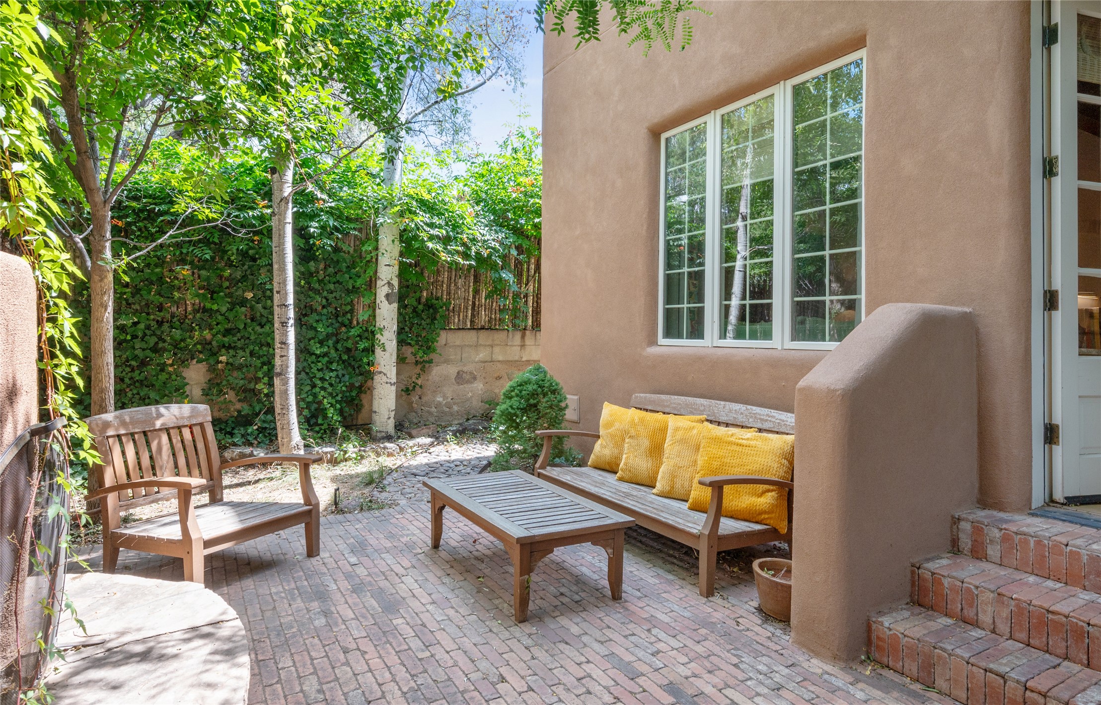 Nestled in a prime location just moments from Fort Marcy Park and the historic Santa Fe Plaza, this charming two-story home blends Southwestern character with modern comfort. Featuring 2 bedrooms and 3 bathrooms, this beautifully designed residence boasts stunning beam ceilings and rich wood floors throughout, creating a warm and inviting atmosphere.The open-concept layout seamlessly connects the kitchen, dining area, and living room, with a patio door leading to a private back patio complete with a kiva fireplace, perfect for outdoor relaxation. Upstairs, the primary suite offers a cozy fireplace, large shutters for customized light control, and a private balcony showcasing slight mountain views and overlooking the patio below. The guest bedroom, also located upstairs, features an en-suite bathroom for added privacy.Additional highlights include a one-car garage plus off-street parking, tile floors in the bathrooms, and a fantastic location within walking distance of restaurants, shopping, galleries, and entertainment. Outdoor enthusiasts will appreciate being less than 15 miles from Ski Santa Fe, making this home an ideal retreat year-round.