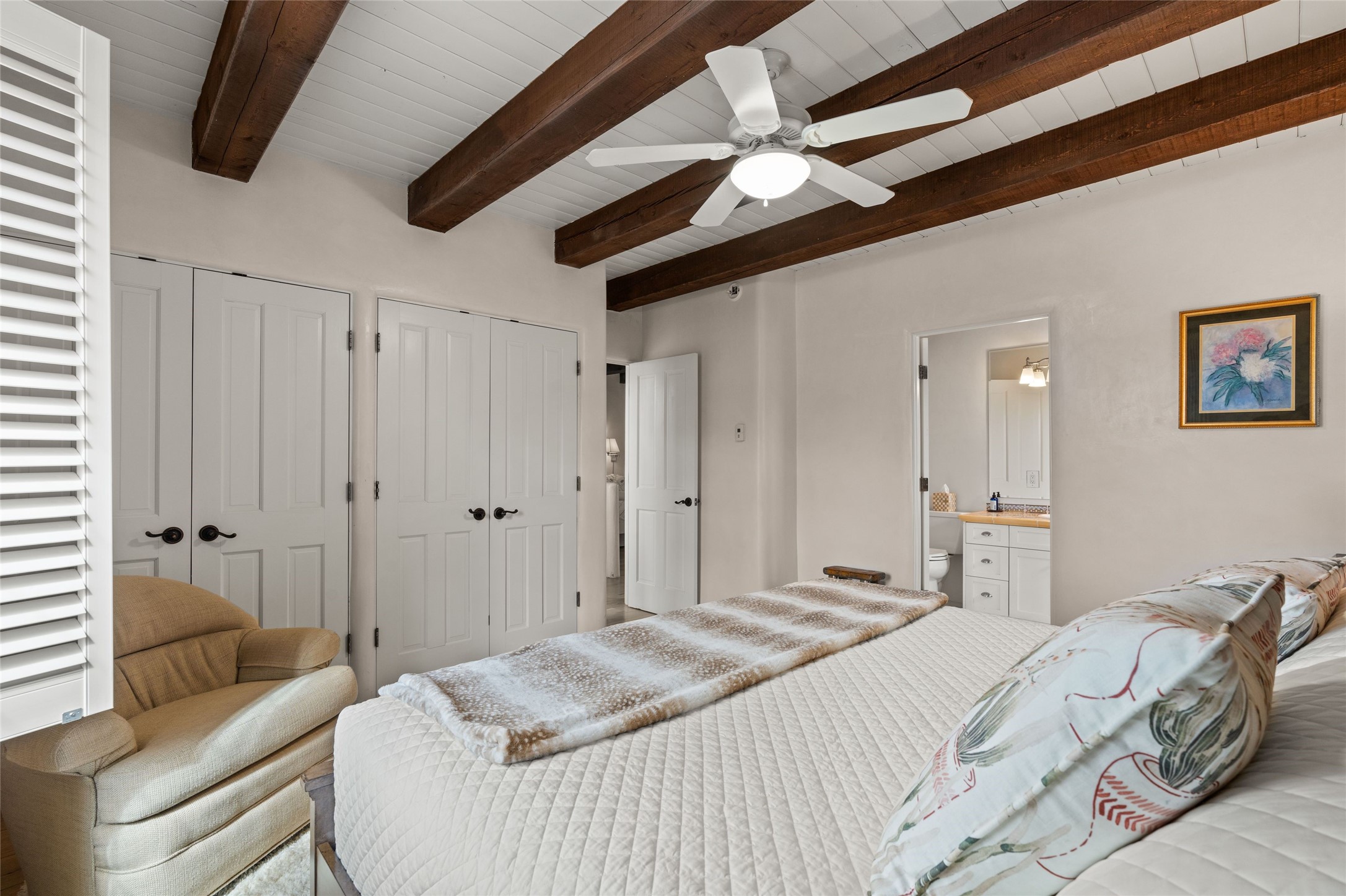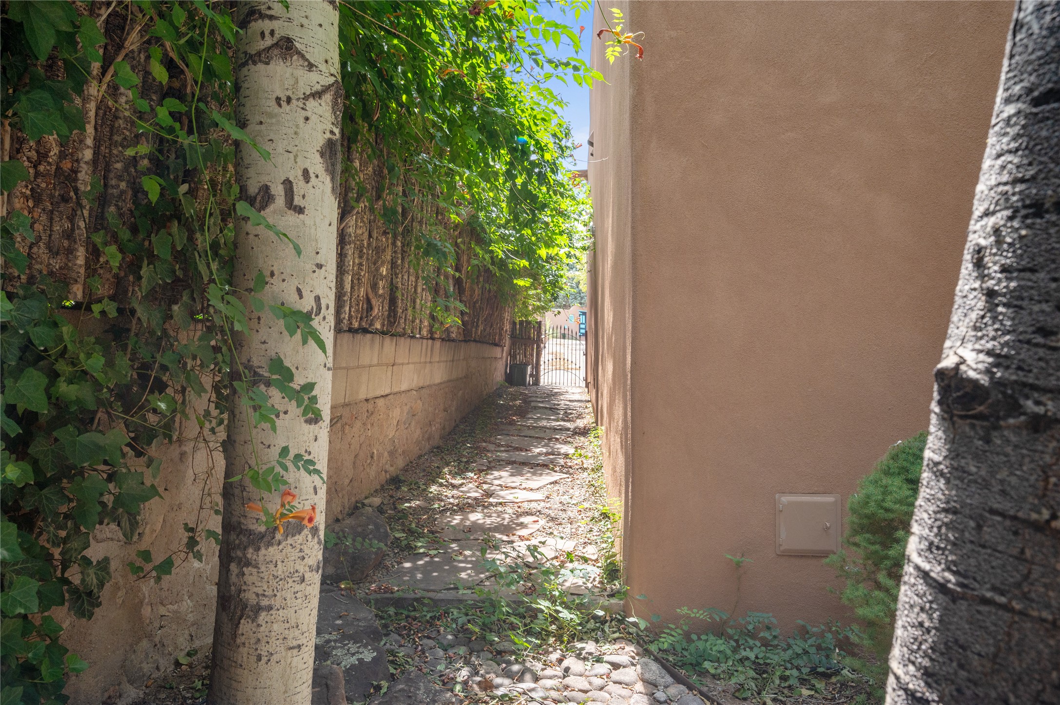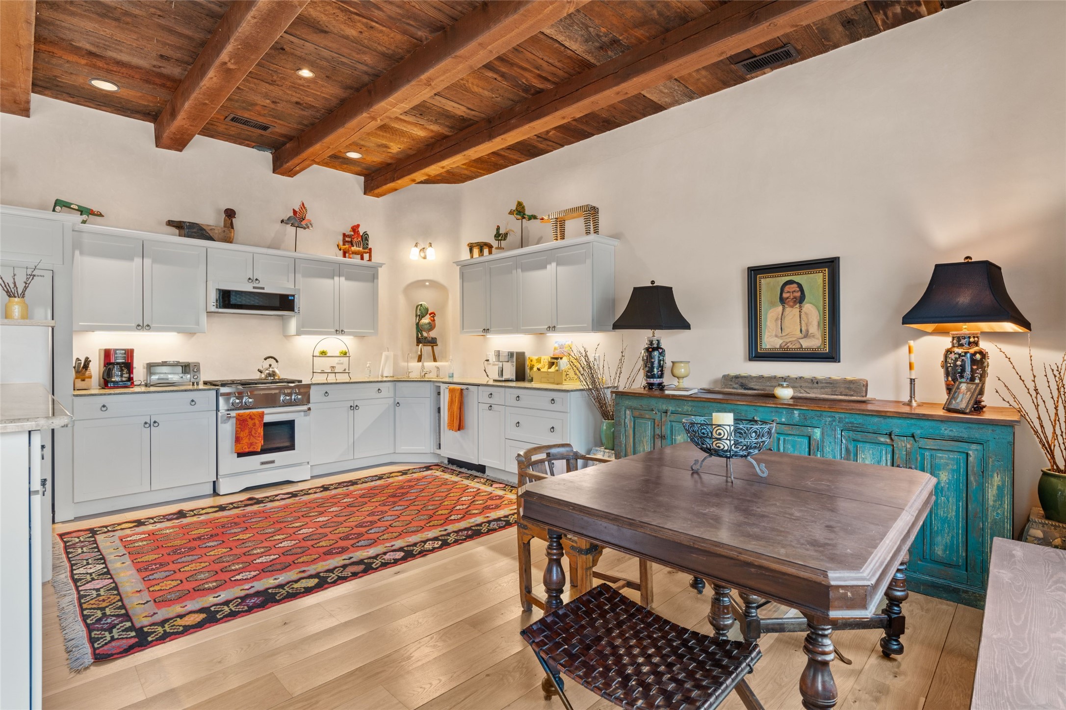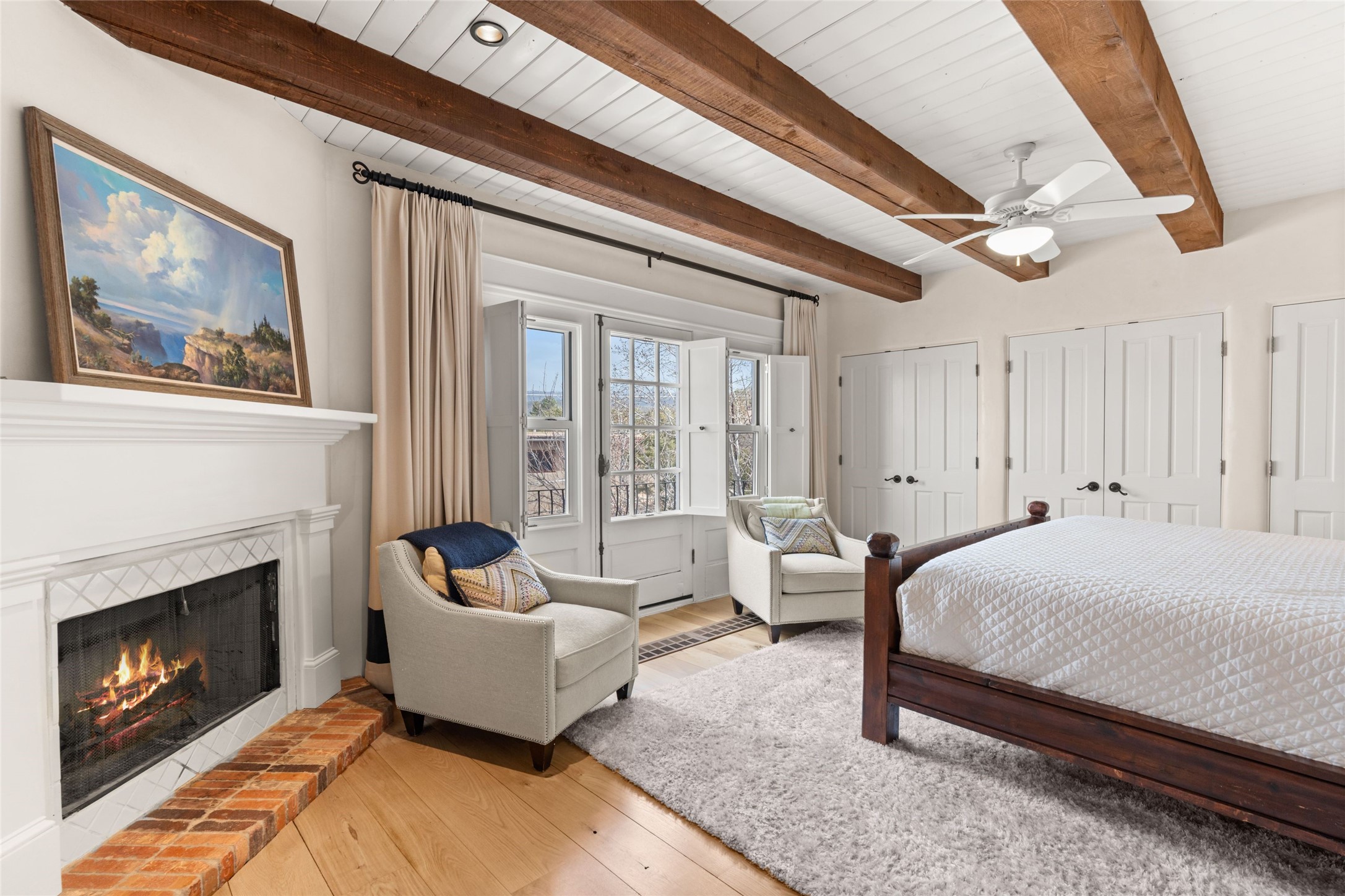 Nestled in a prime location just moments from Fort Marcy Park and the historic Santa Fe Plaza, this charming two-story home blends Southwestern character with modern comfort. Featuring 2 bedrooms and 3 bathrooms, this beautifully designed residence boasts stunning beam ceilings and rich wood floors throughout, creating a warm and inviting atmosphere.The open-concept layout seamlessly connects the kitchen, dining area, and living room, with a patio door leading to a private back patio complete with a kiva fireplace, perfect for outdoor relaxation. Upstairs, the primary suite offers a cozy fireplace, large shutters for customized light control, and a private balcony showcasing slight mountain views and overlooking the patio below. The guest bedroom, also located upstairs, features an en-suite bathroom for added privacy.Additional highlights include a one-car garage plus off-street parking, tile floors in the bathrooms, and a fantastic location within walking distance of restaurants, shopping, galleries, and entertainment. Outdoor enthusiasts will appreciate being less than 15 miles from Ski Santa Fe, making this home an ideal retreat year-round.