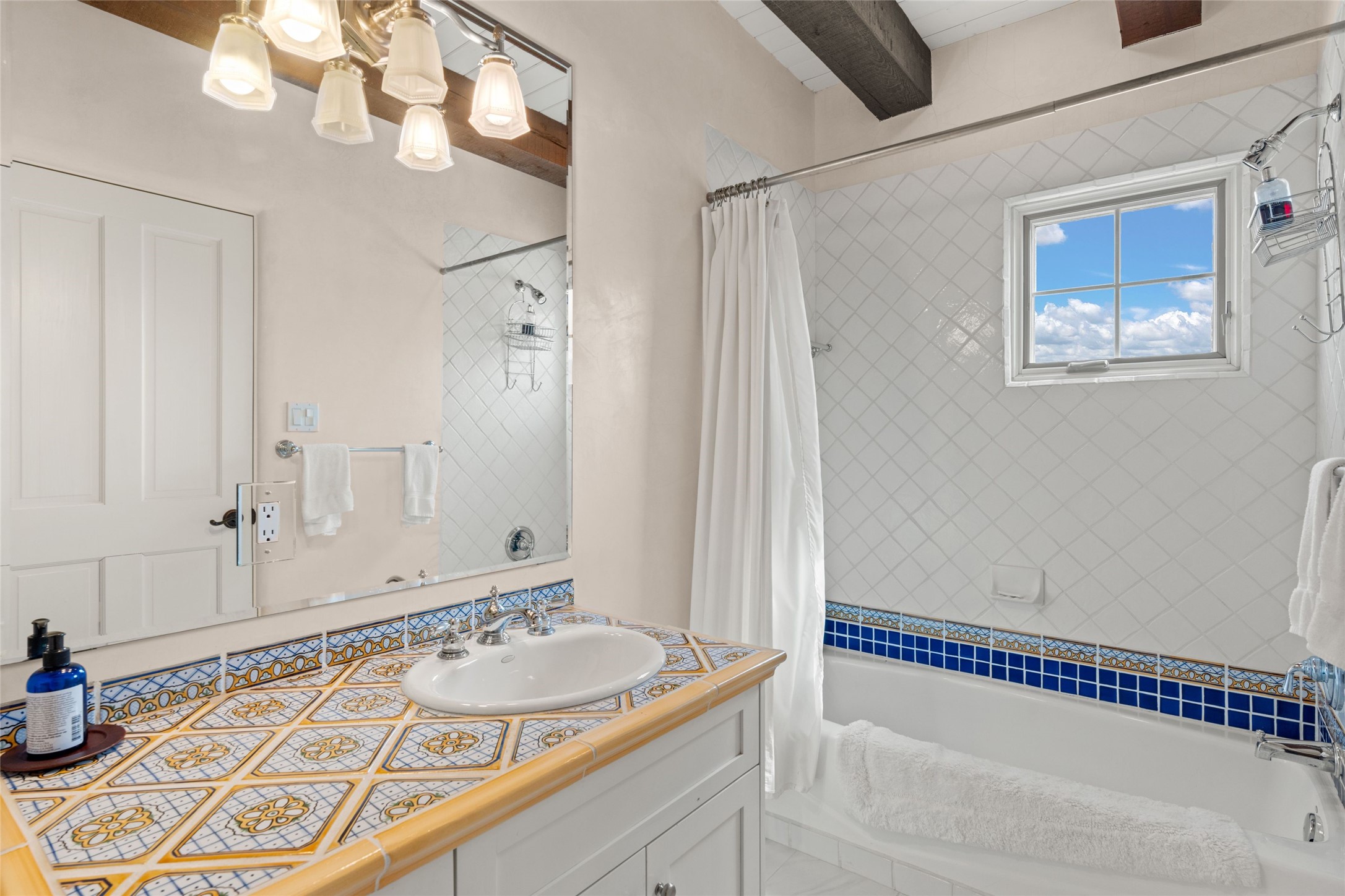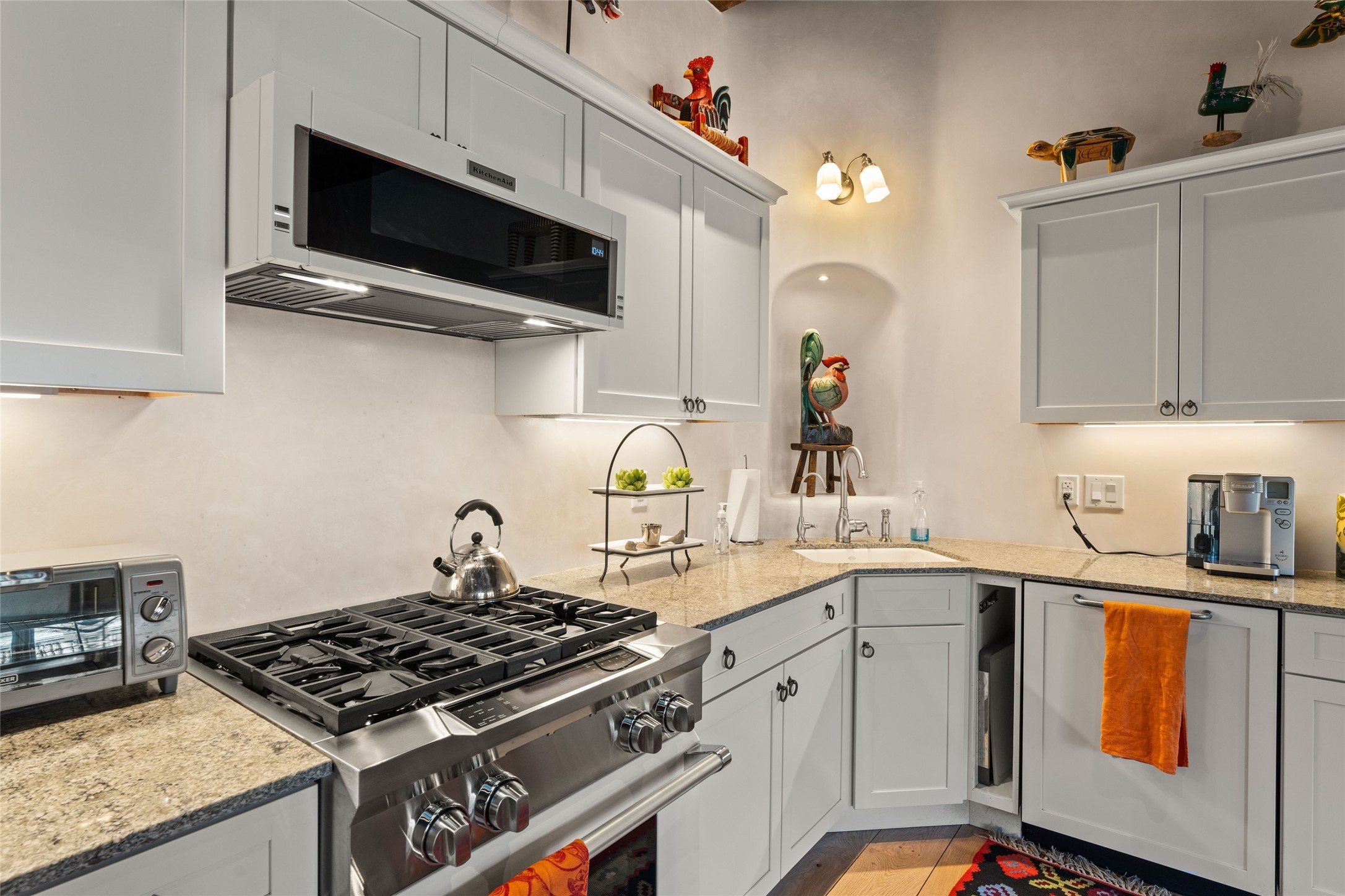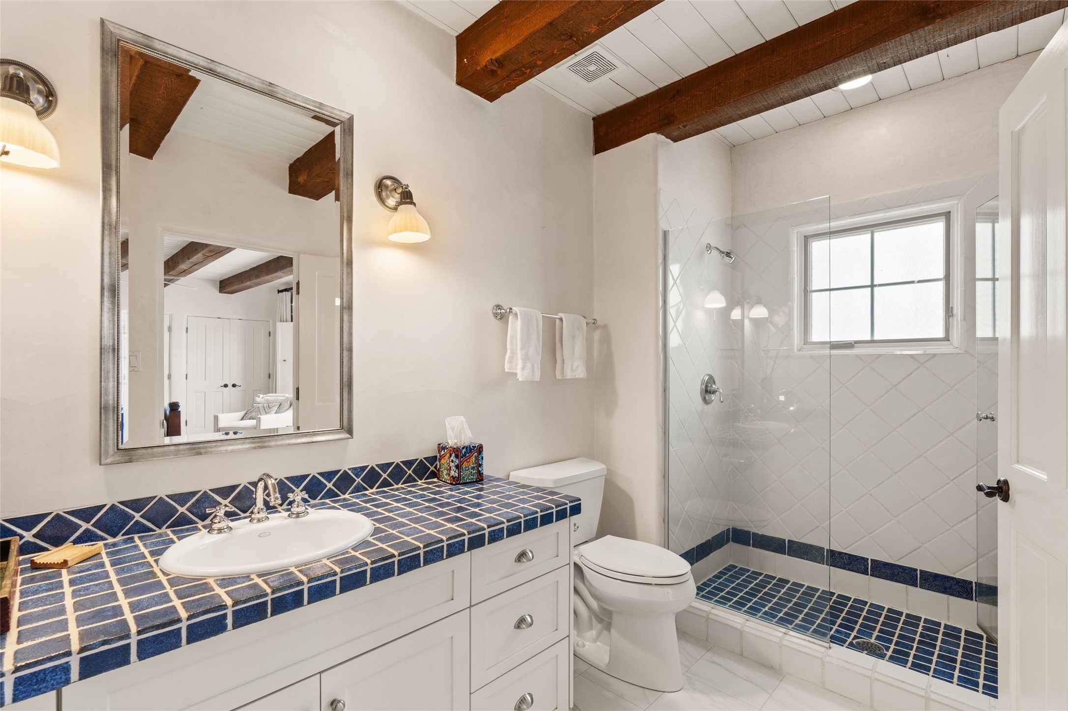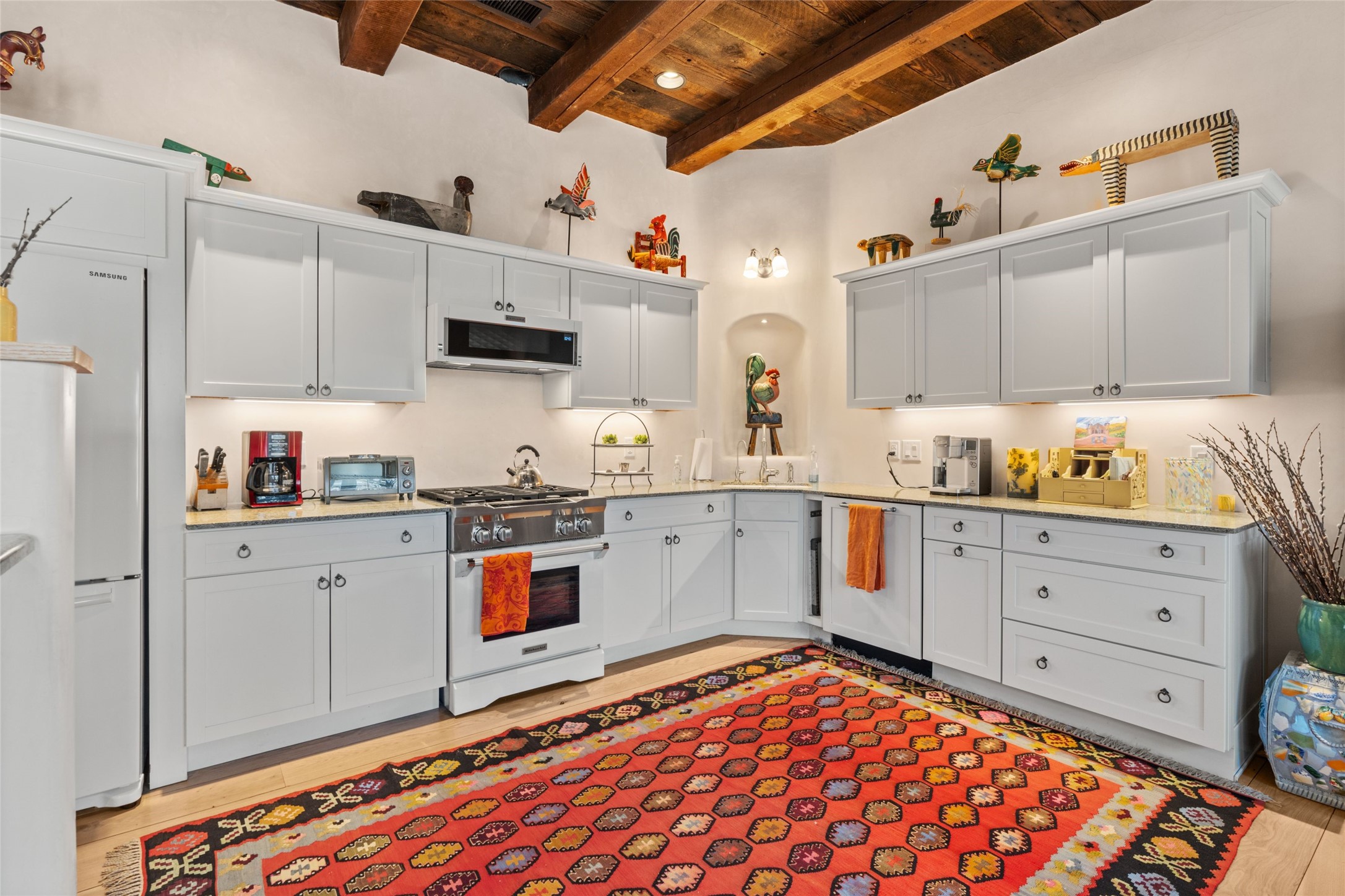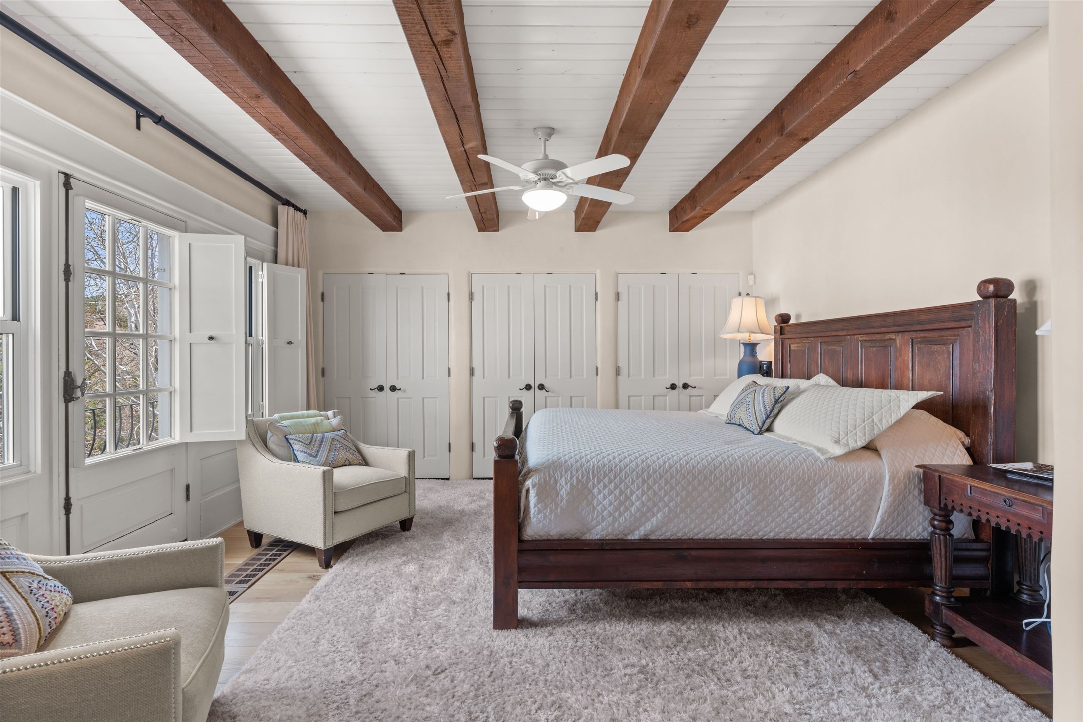 Nestled in a prime location just moments from Fort Marcy Park and the historic Santa Fe Plaza, this charming two-story home blends Southwestern character with modern comfort. Featuring 2 bedrooms and 3 bathrooms, this beautifully designed residence boasts stunning beam ceilings and rich wood floors throughout, creating a warm and inviting atmosphere.The open-concept layout seamlessly connects the kitchen, dining area, and living room, with a patio door leading to a private back patio complete with a kiva fireplace, perfect for outdoor relaxation. Upstairs, the primary suite offers a cozy fireplace, large shutters for customized light control, and a private balcony showcasing slight mountain views and overlooking the patio below. The guest bedroom, also located upstairs, features an en-suite bathroom for added privacy.Additional highlights include a one-car garage plus off-street parking, tile floors in the bathrooms, and a fantastic location within walking distance of restaurants, shopping, galleries, and entertainment. Outdoor enthusiasts will appreciate being less than 15 miles from Ski Santa Fe, making this home an ideal retreat year-round.