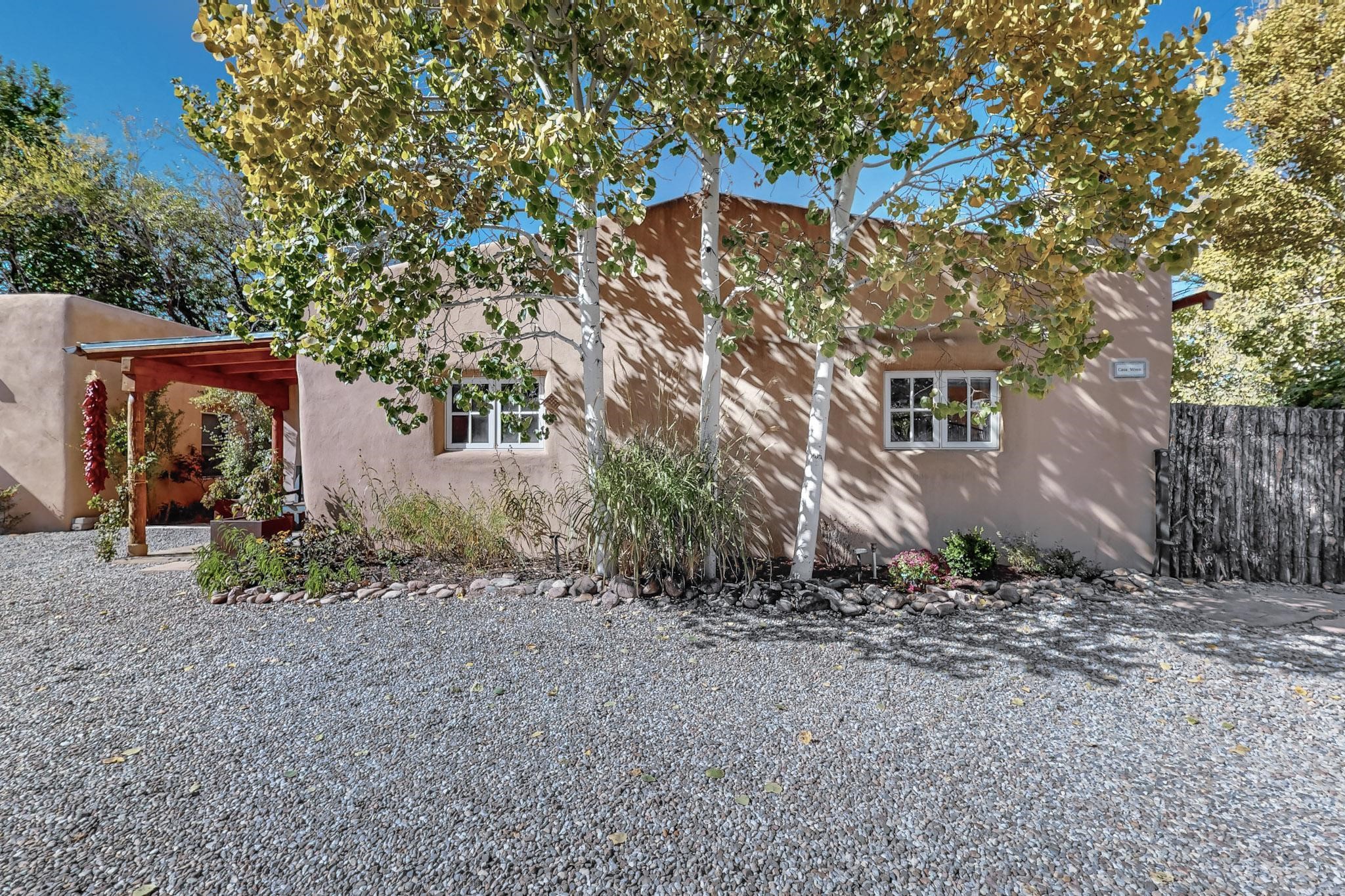 Rarely does a condo in the gated Assisi Compound become available. The Compound is beautifully maintained, landscaped and located in the vibrant Railyard/Guadalupe area. Oozing with charm, character and attention to detail, Casa Wren is one of the seven distinctively unique units. A gracious vigas and beamed portal shelters the front entrance. Inside, elegant architectural details including rounded bullnose corners, clerestory windows, beamed ceilings, Venetian plaster, skylights and a Kiva fireplace. Galley-style kitchen with wood cabinetry, Quartz countertops, ceramic double sink, tile backsplash and new appliances. Open and bright Living/Dining with a wood burning Kiva fireplace and stone flooring that continues into the en-suite bedroom. Matisse wall tiles, slate floors, new mini-splits, bathroom tub and tankless hot water. Private garden, off the living room, with its' own secret entrance. Water feature, fire pit, landscaping and storage shed. Stucco walls enclose the property. 1 parking place and no street parking permit required.