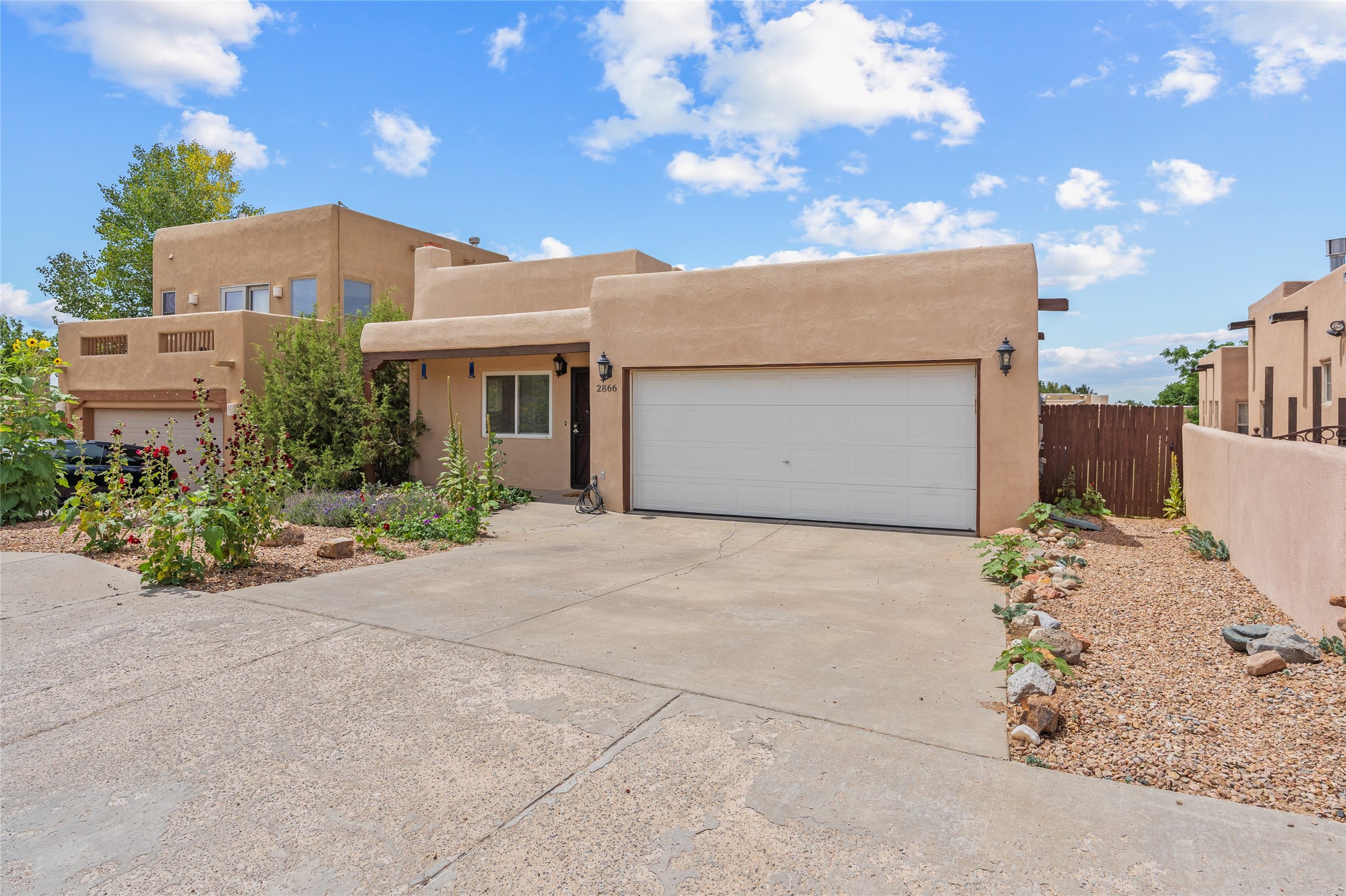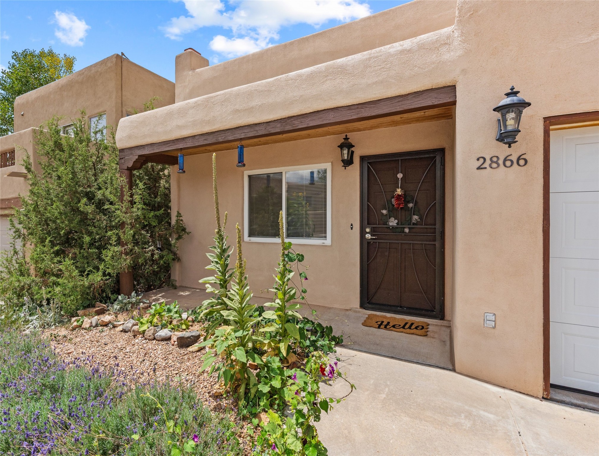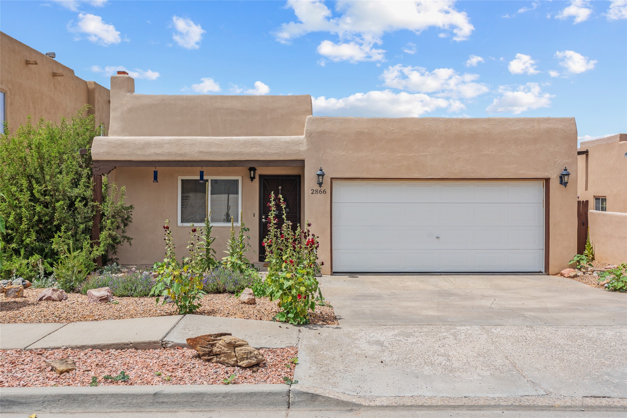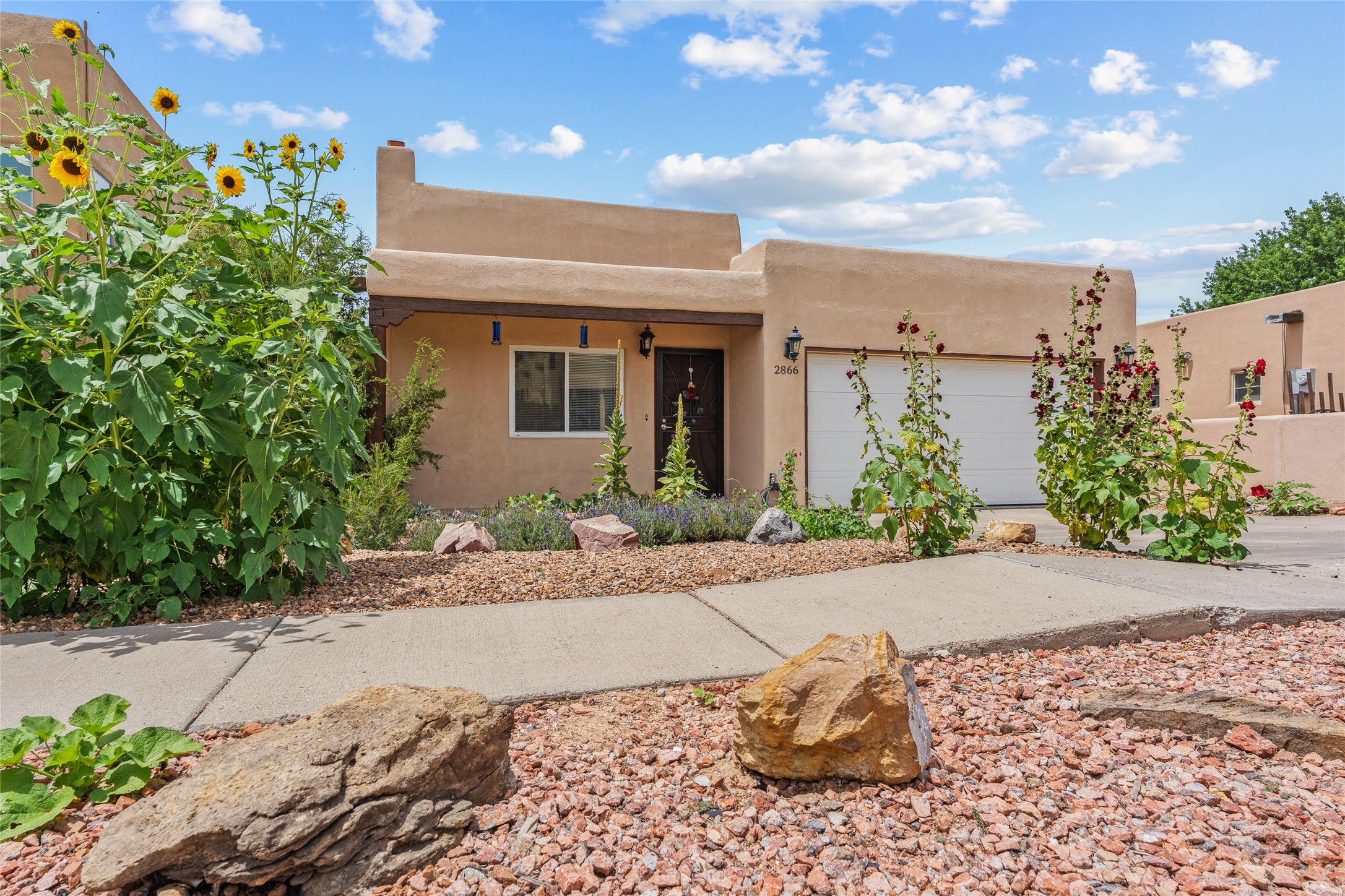 Welcome to 2866 Pueblo Jacona, a move-in ready gem tucked into one of Santa Fe's most beloved communities--Pueblos Del Sol. This sweet and sunny 3-bedroom, 2-bath home sits on an oversized lot with lovely front landscaping and an expansive backyard that offers room to relax, play, and dream. Step inside to find a warm and inviting interior with beautiful tongue-and-groove ceilings accented by classic vigas, adding rich character and Southwestern charm. The open living and dining area flows easily to the outdoors, where a covered deck leads to a flagstone path, mature trees, and a large flagstone patio--a perfect spot for entertaining or enjoying Santa Fe's beautiful weather. Freshly painted and newly carpeted in all bedrooms, the home feels fresh and move-in ready. Three comfortable bedrooms, two full baths, and a 2-car garage round out this thoughtfully maintained home. Pueblos Del Sol is known for its beautiful walking trails, community parks, and proximity to schools, shopping, and restaurants, making this a perfect location for full-time living or a second home retreat. Come experience the charm, character, and light of 2866 Pueblo Jacona--your next chapter starts here.