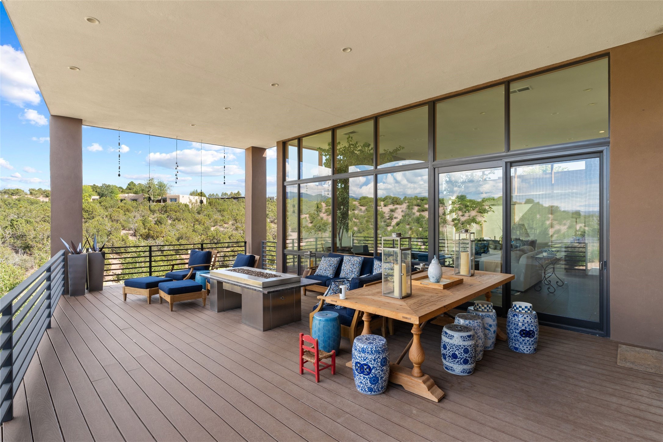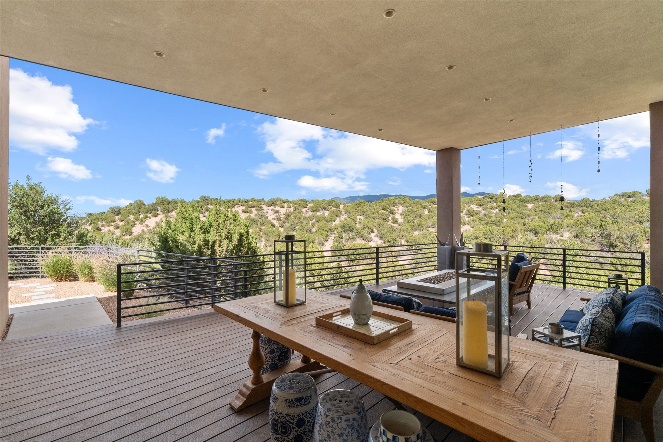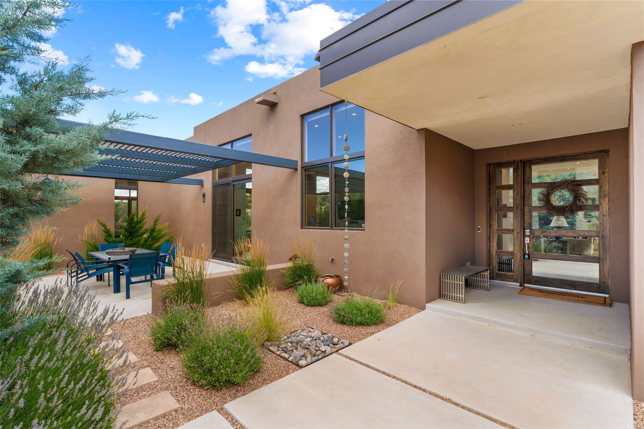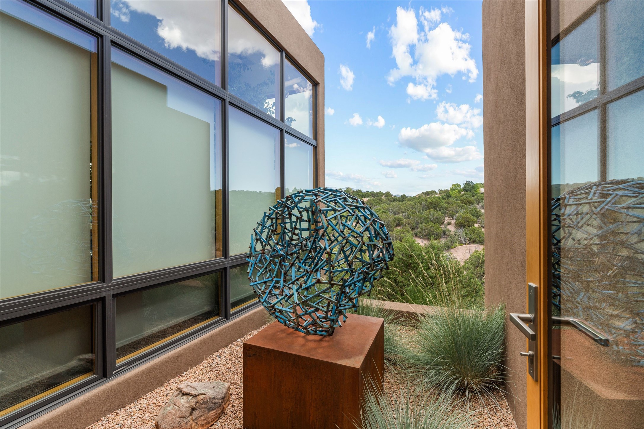Welcome to the Opera House. Just a stones throw to the entrance to the world renowned Santa Fe Opera is this stunning soft contemporary home situated on a beautiful view lot that boasts expansive private views of the Sangre de Christo Mountain range and the Badlands to the north. This light filled home is a dream residence for the most discriminating Buyer. Top of the line quality abounds in every area from landscaping, custom rock retaining walls, and a stone drive way that greet your guests arrival. Extensive native plant landscaping compliments every entry for a dramatic effect. Custom outdoor kitchen is a entertaining dream plus a fully covered deck that faces the north east off both living areas. The home offers a split floor plan, each bedroom with their own ensuite bath and privacy. The 2 living areas have soaring floor to ceiling windows with unobstructed views. Top of the line appliances, cabinetry that grace the kitchen great room area for a spacious and relaxed environment. Custom hot tub, a bonus, overlooking the mountains and natural landscape and offering a starlit New Mexico sky for your evening relaxation. Impeccably maintained, one of a kind, this this property is a special offering.