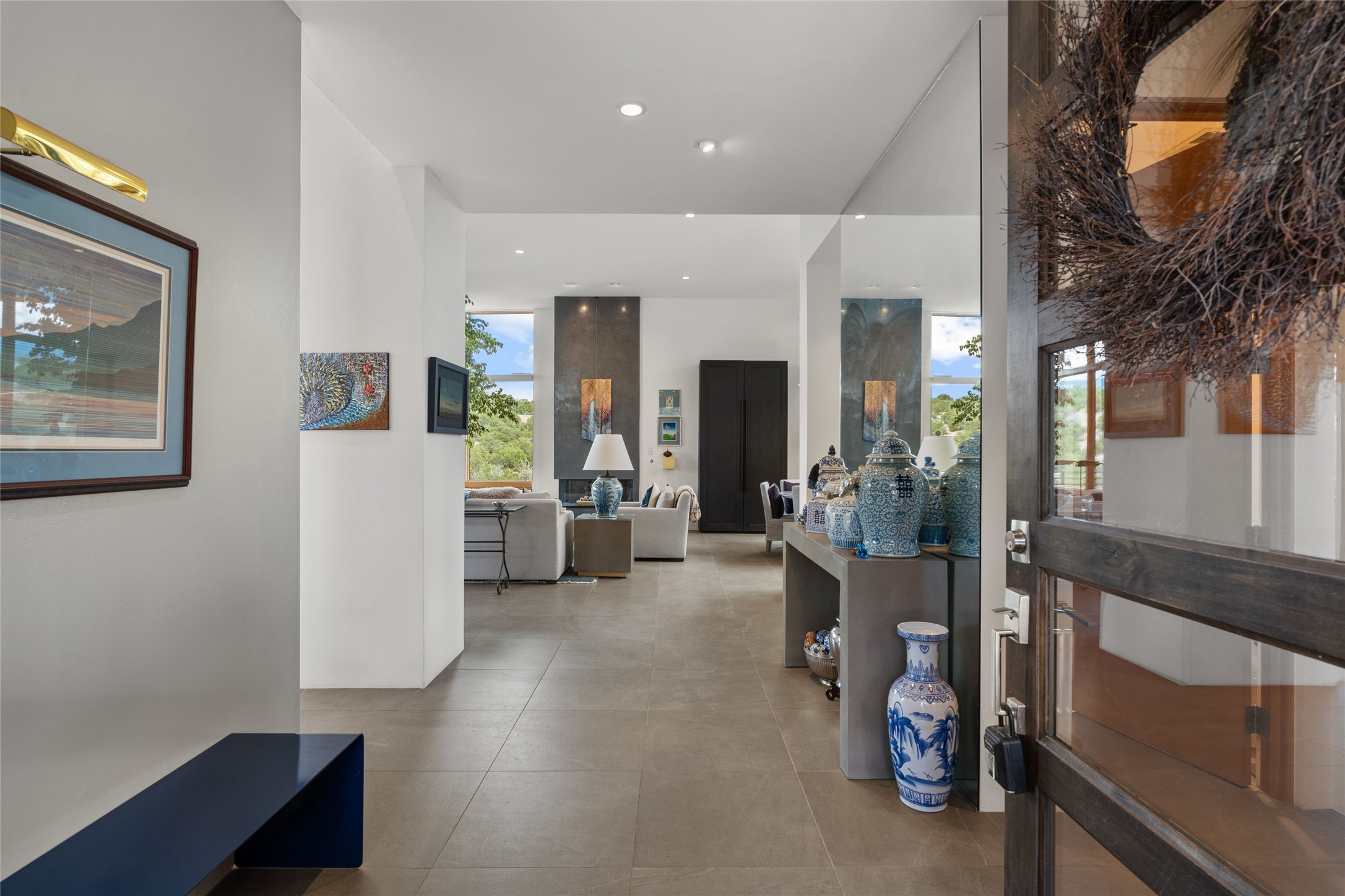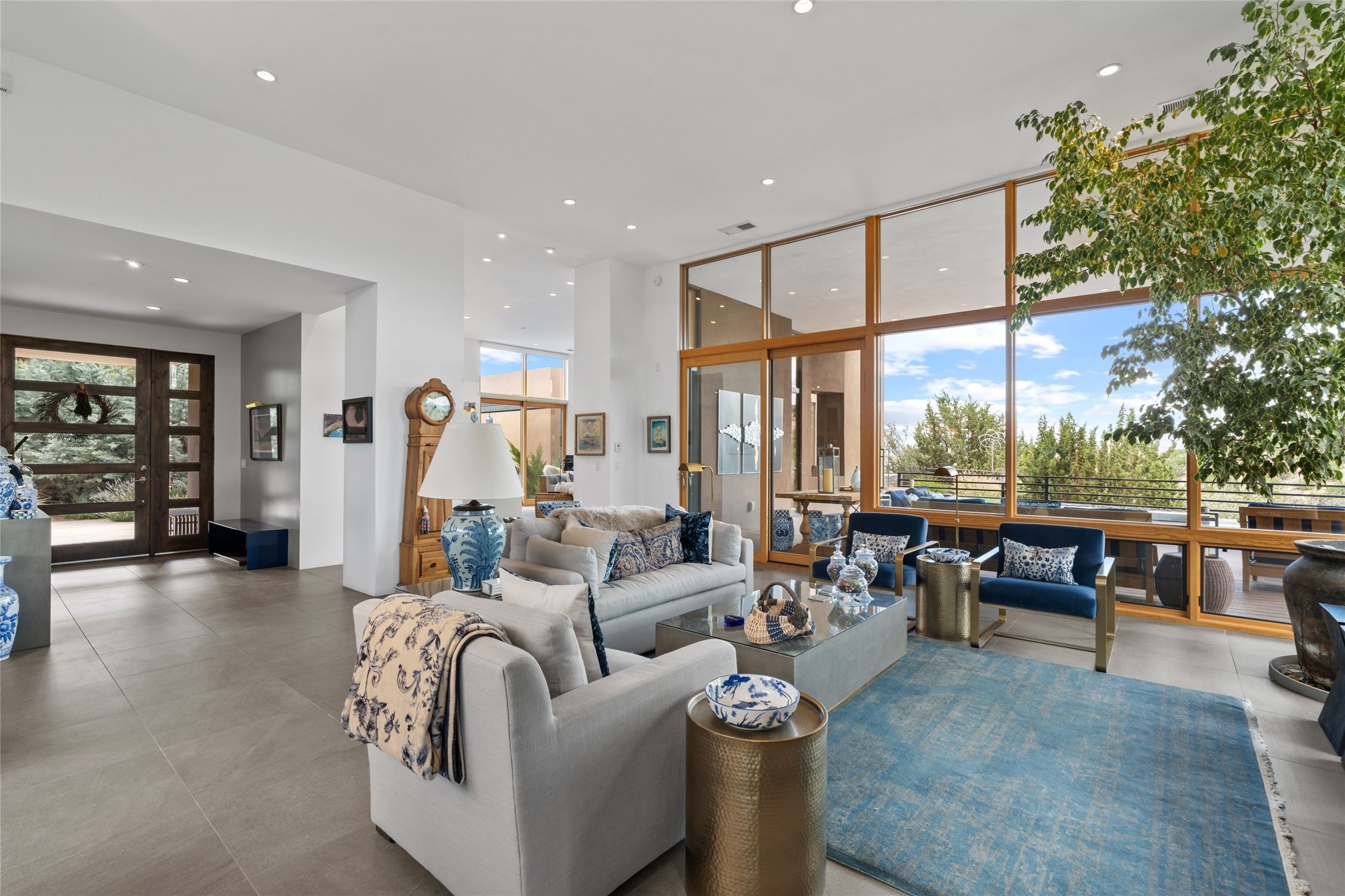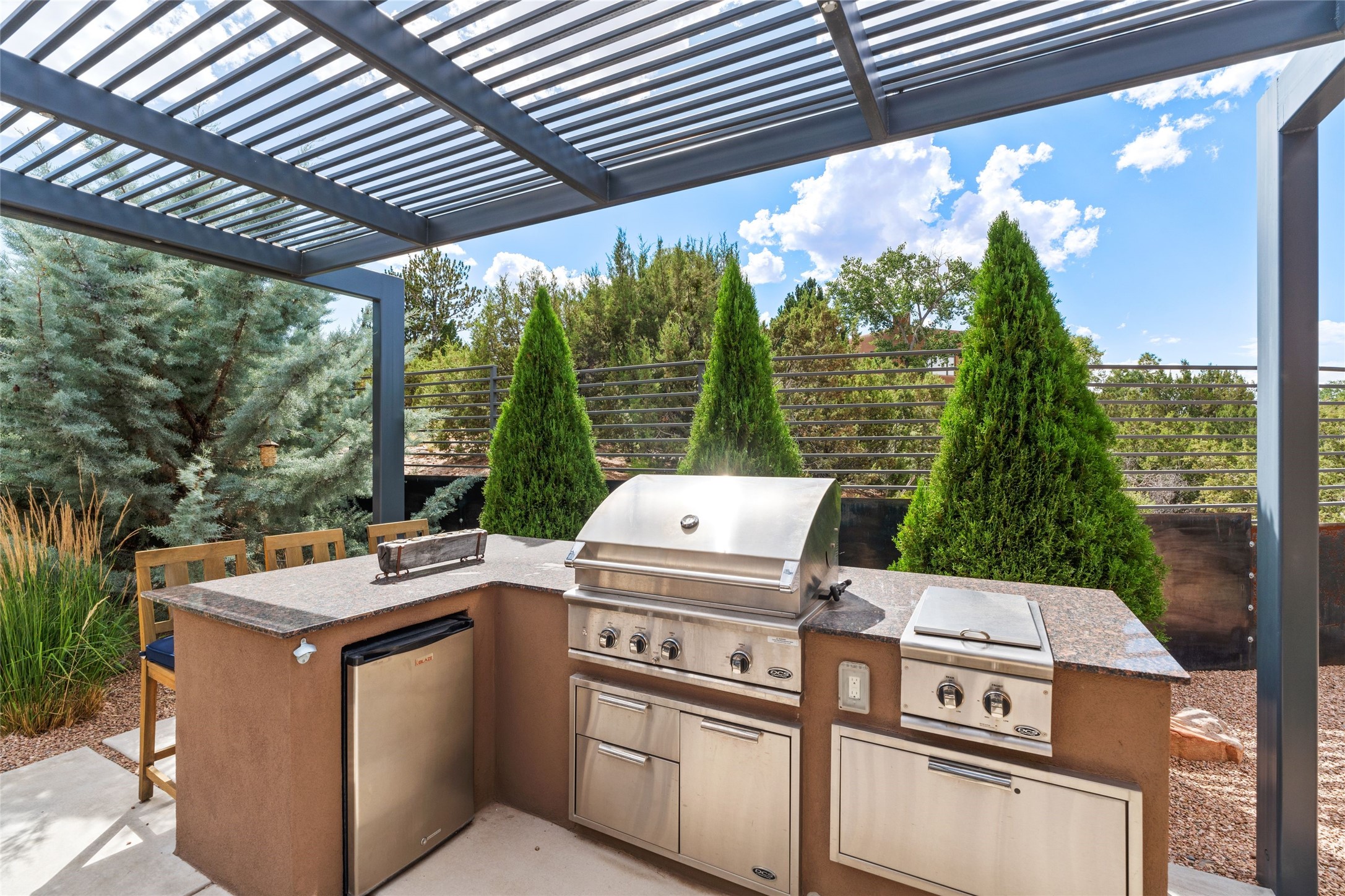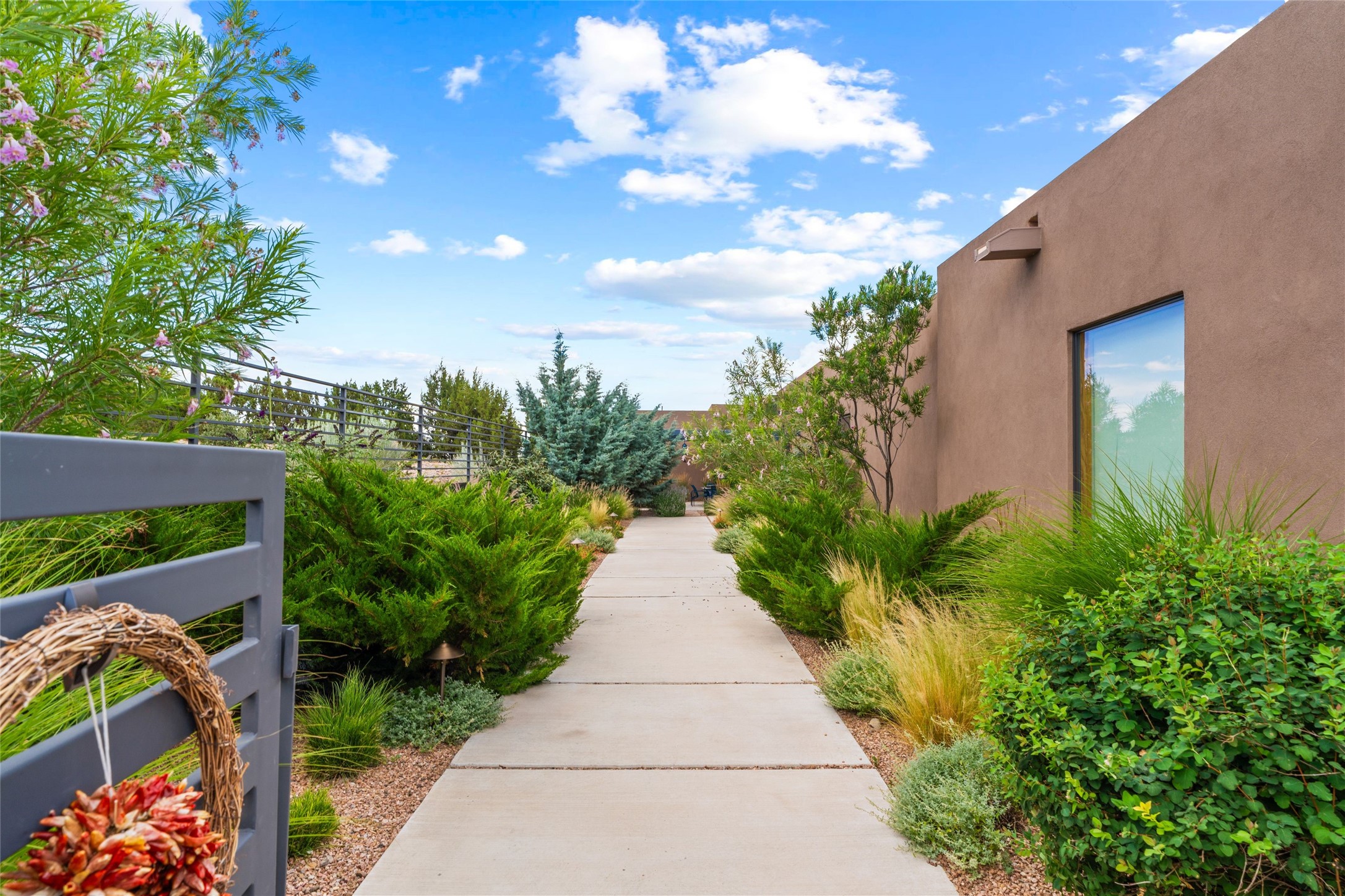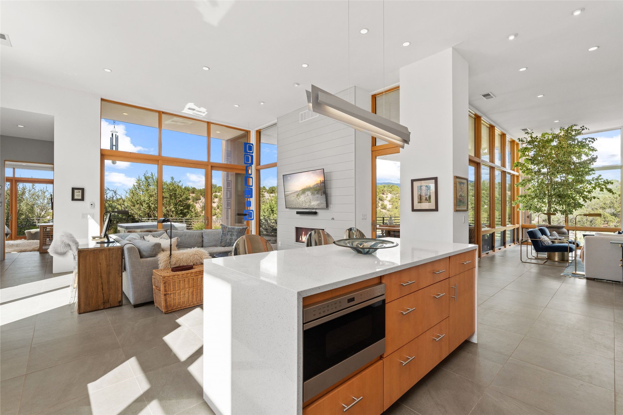 Welcome to the Opera House. Just a stones throw to the entrance to the world renowned Santa Fe Opera is this stunning soft contemporary home situated on a beautiful view lot that boasts expansive private views of the Sangre de Christo Mountain range and the Badlands to the north. This light filled home is a dream residence for the most discriminating Buyer. Top of the line quality abounds in every area from landscaping, custom rock retaining walls, and a stone drive way that greet your guests arrival. Extensive native plant landscaping compliments every entry for a dramatic effect. Custom outdoor kitchen is a entertaining dream plus a fully covered deck that faces the north east off both living areas. The home offers a split floor plan, each bedroom with their own ensuite bath and privacy. The 2 living areas have soaring floor to ceiling windows with unobstructed views. Top of the line appliances, cabinetry that grace the kitchen great room area for a spacious and relaxed environment. Custom hot tub, a bonus, overlooking the mountains and natural landscape and offering a starlit New Mexico sky for your evening relaxation. Impeccably maintained, one of a kind, this this property is a special offering.