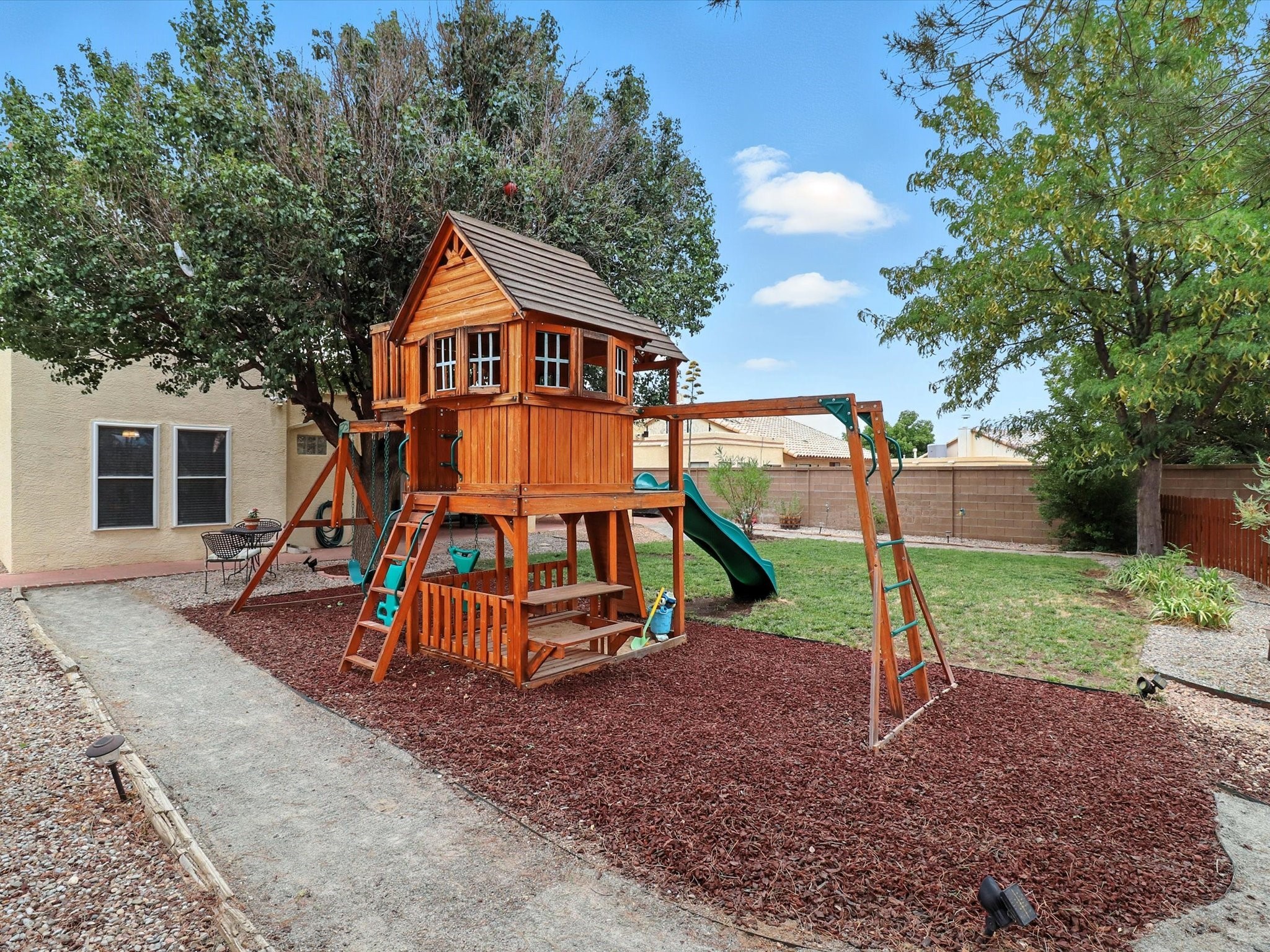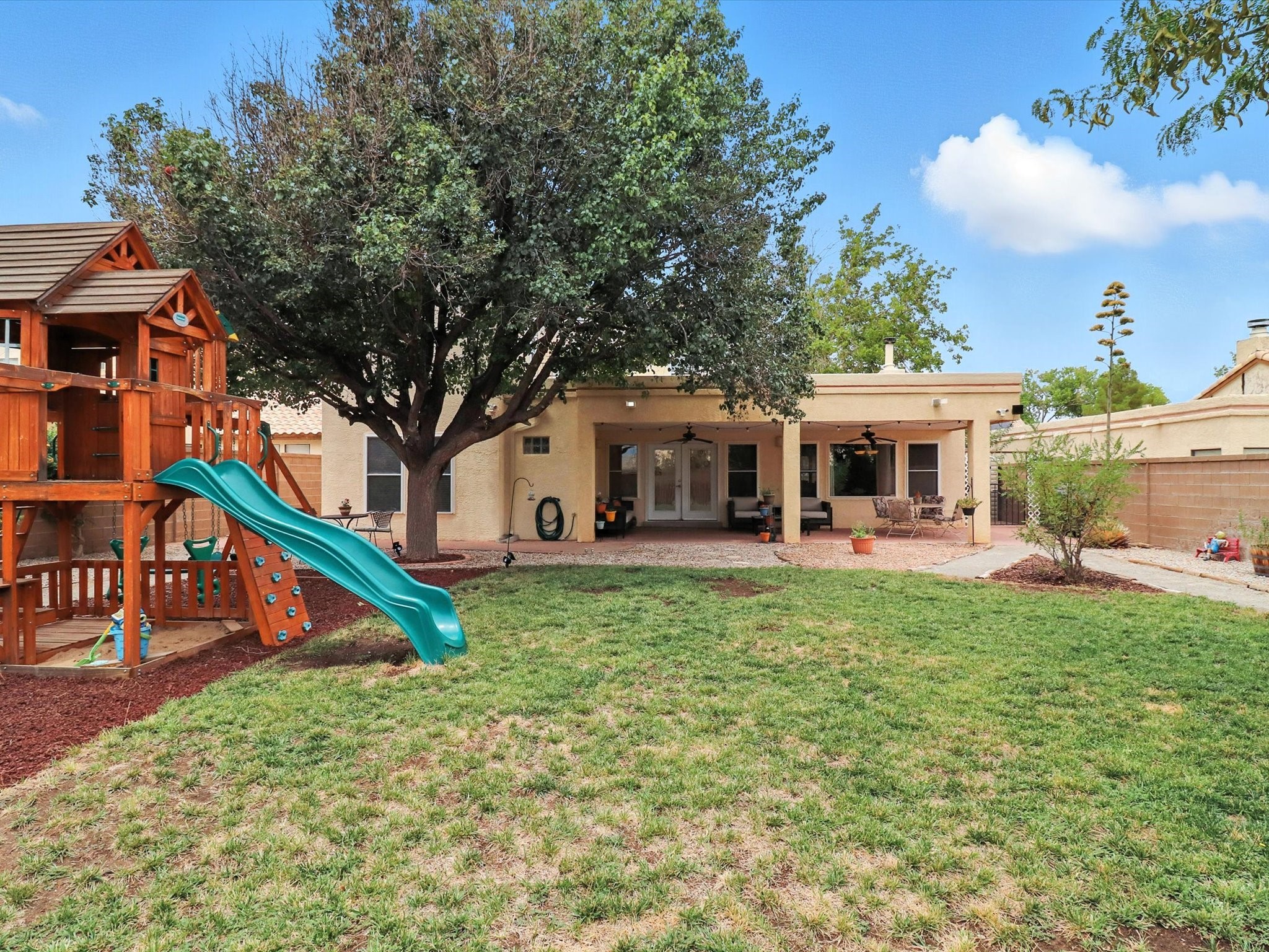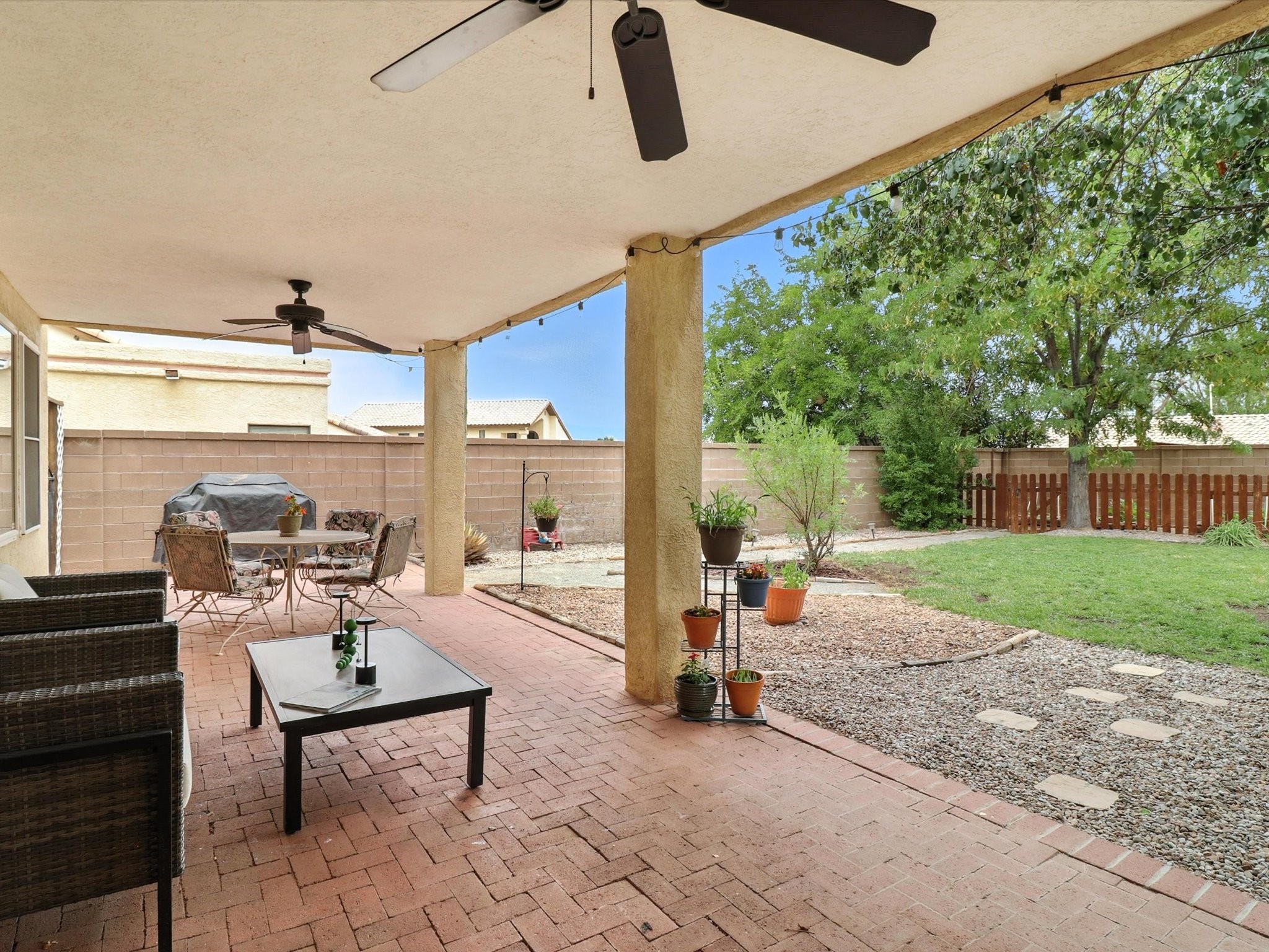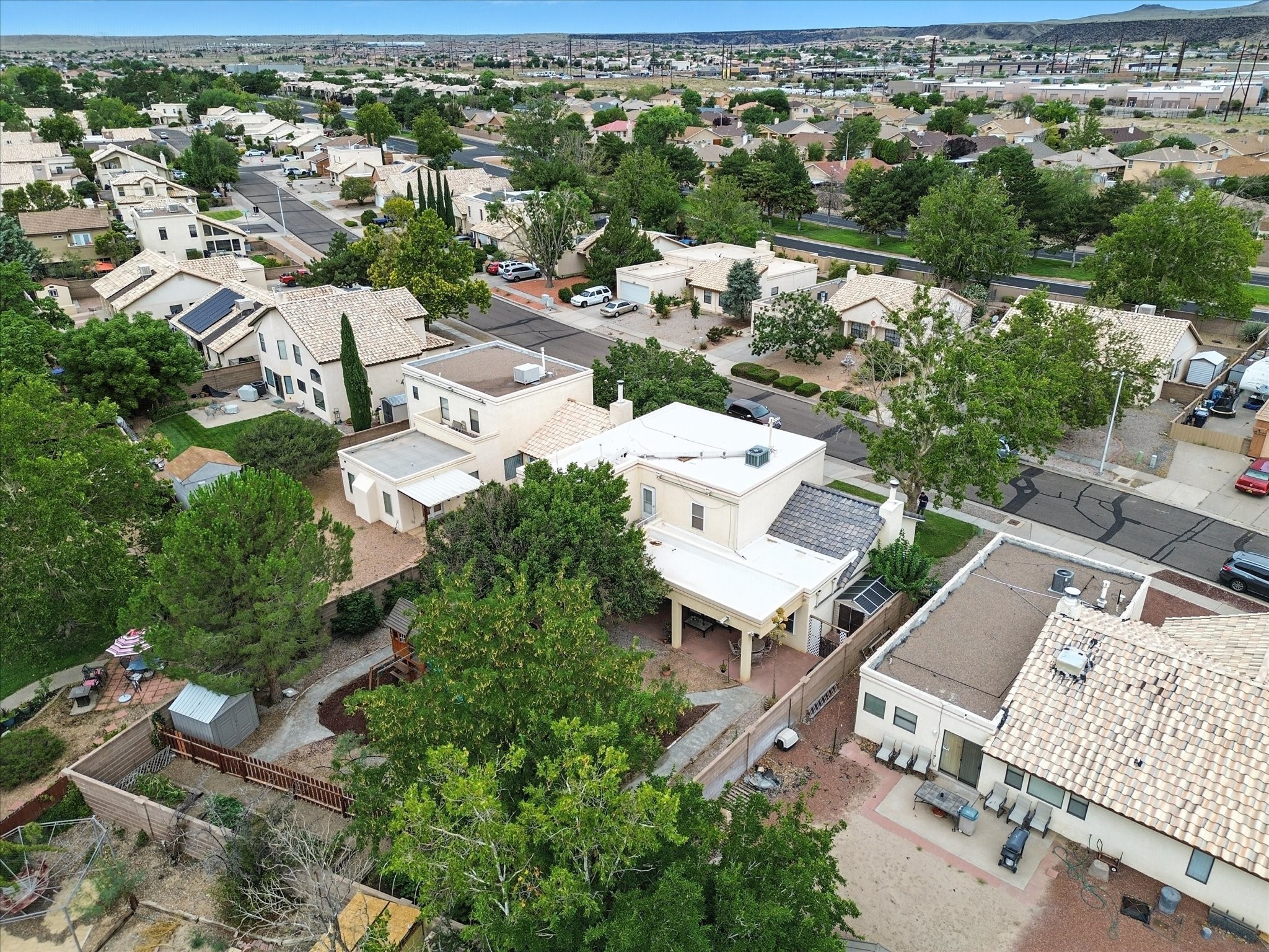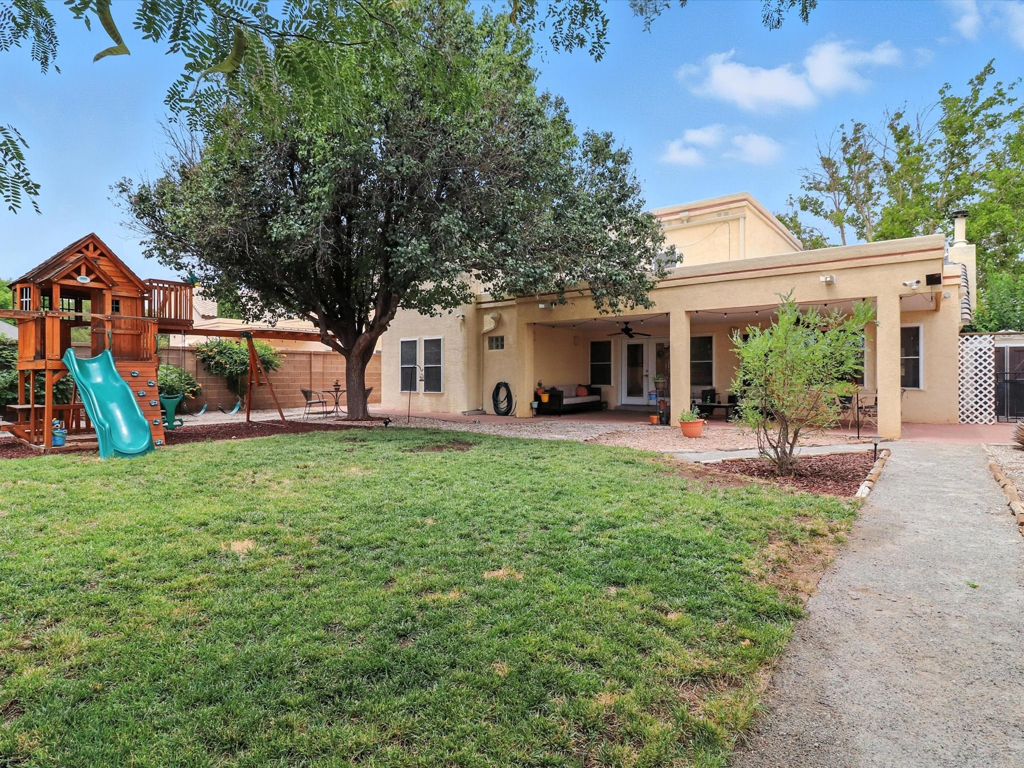 Discover this spacious 3-bedroom, 4-bathroom Spanish Contemporary home located on Albuquerque's desirable Westside in Ladera Heights. With 2,318 square feet of well-designed living space, this property offers a seamless blend of comfort, style, and function. Step inside to warm maple wood-laminate and tile flooring throughout, a dramatic vaulted ceiling in the living area, and a cozy wood, burning fireplace that adds charm and comfort. The generous floor plan offers versatile living and dining spaces ideal for both everyday life and entertaining. The home includes a two-car garage for added convenience, and the beautifully landscaped yards feature natural grass in both the front and back. The backyard is perfect for gatherings, outdoor dining, or simply enjoying the New Mexico sunshine. Perfectly located with excellent proximity to Coors Boulevard, Unser, and I-40, this home offers easy access to shopping, dining, parks, and major commuting routes-combining comfort, convenience, and style in one exceptional package. Imagine the Possibilities and schedule your showing today.