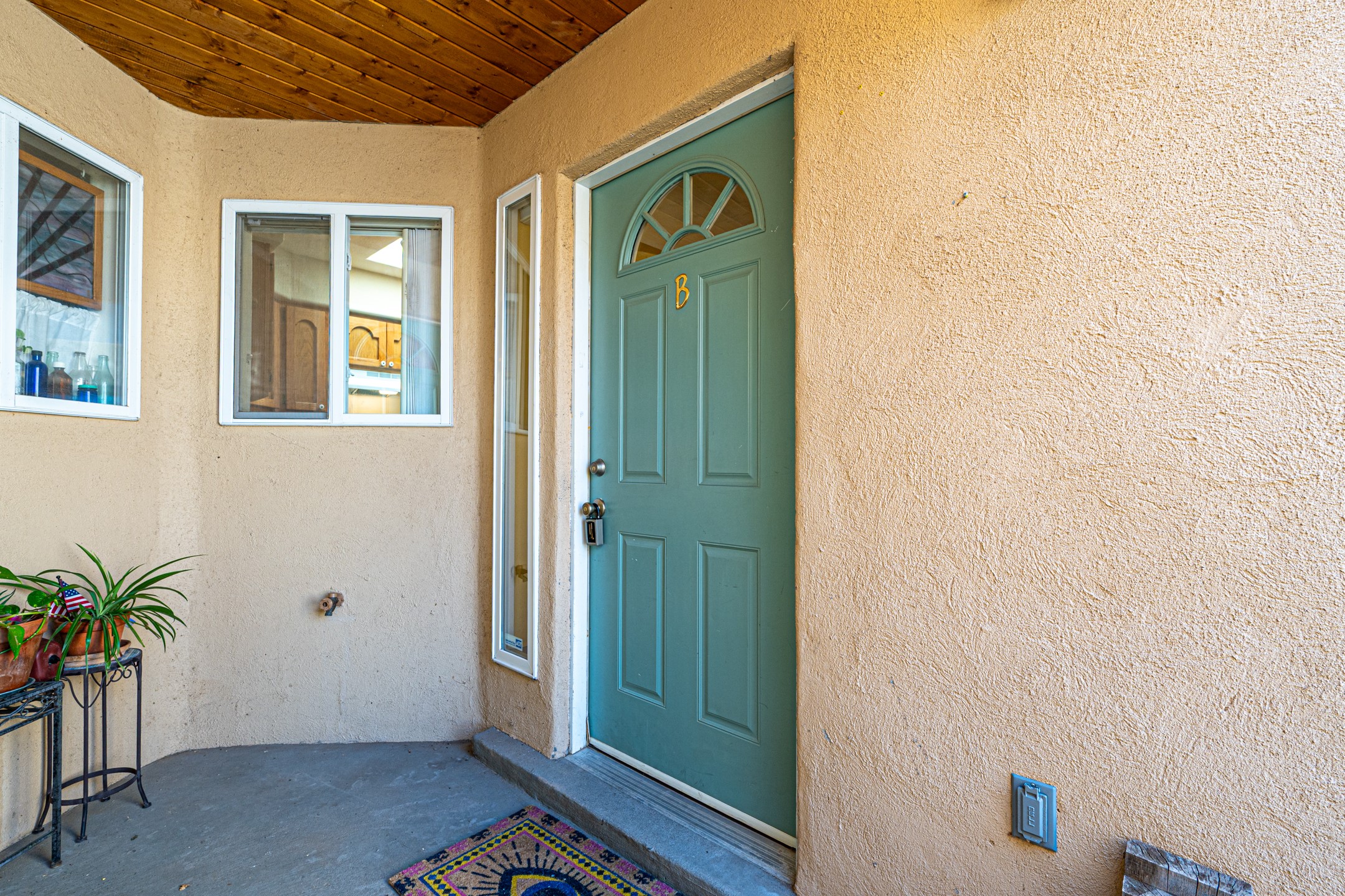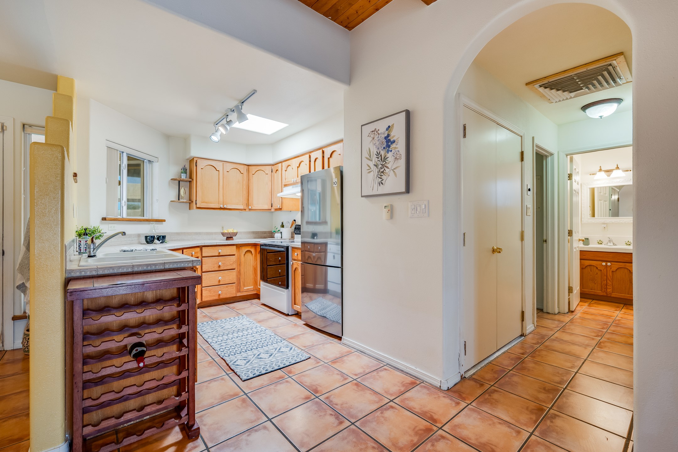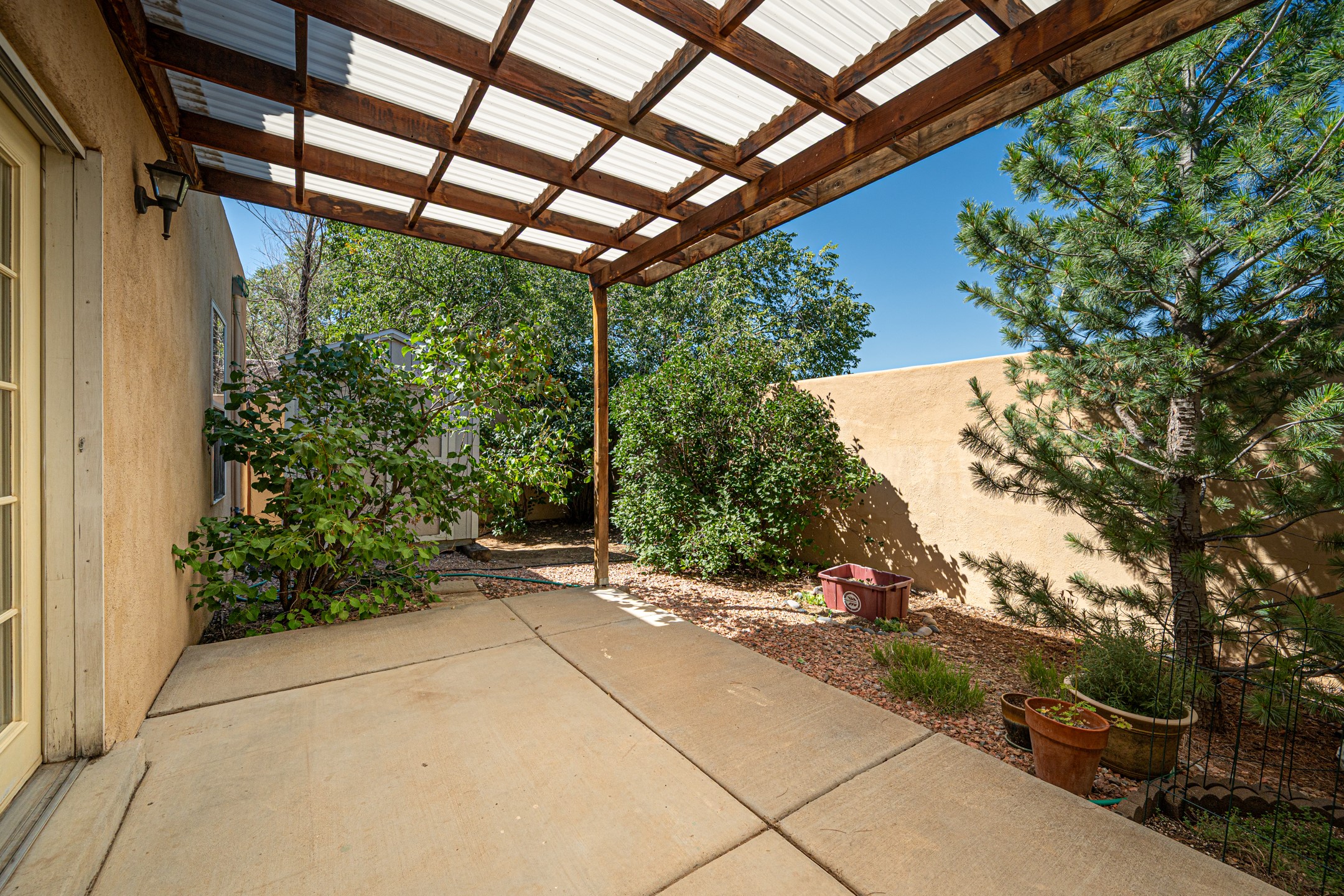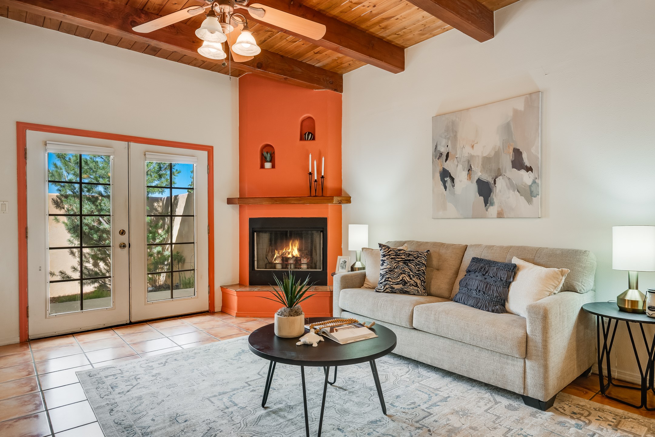Enjoy relaxed, low-maintenance living in this 2-bedroom, 2-bathroom single-level condo, ideally situated on the street level of a four-unit building with convenient off-street parking. The open-concept layout features high ceilings, wood-finish vigas, skylights, and a fireplace--creating a bright, comfortable space perfect for everyday living and easy entertaining. The primary bedroom includes an en-suite bathroom for added privacy and convenience. Step outside to a private backyard designed for outdoor enjoyment, complete with a covered porch, stucco privacy wall, storage shed, and space to garden or unwind. Located near Rufina Street and Las Acequias Park, this home offers quick access to local markets and Santa Fe's creative hubs--making it easy to enjoy everything the area has to offer.