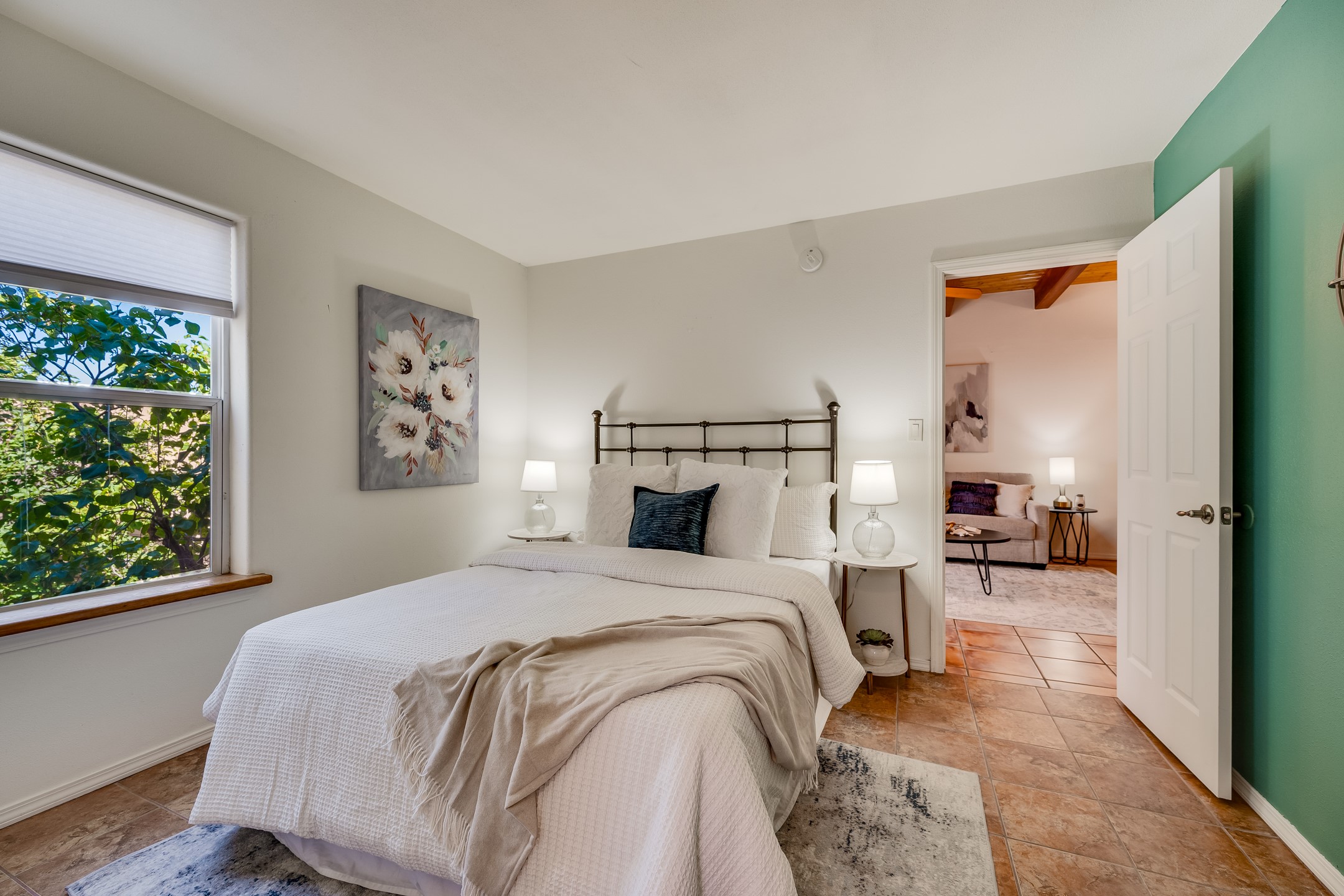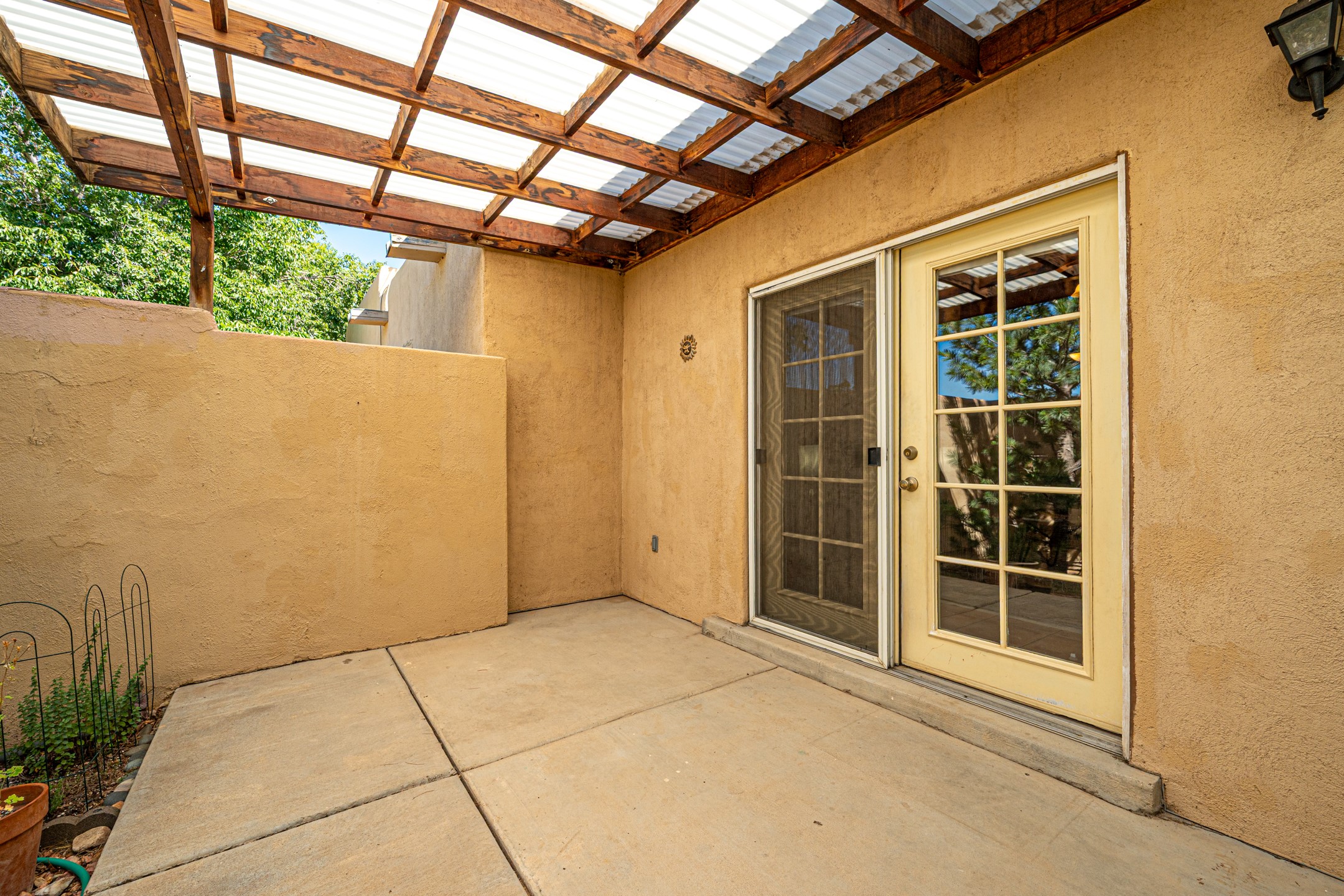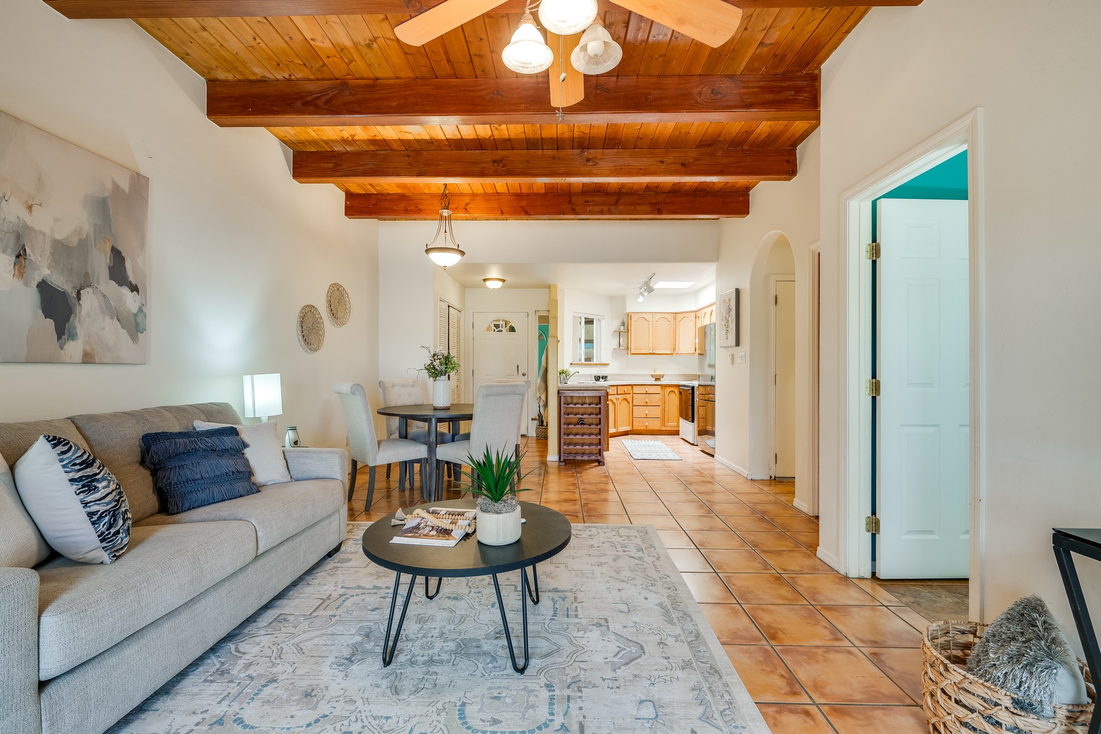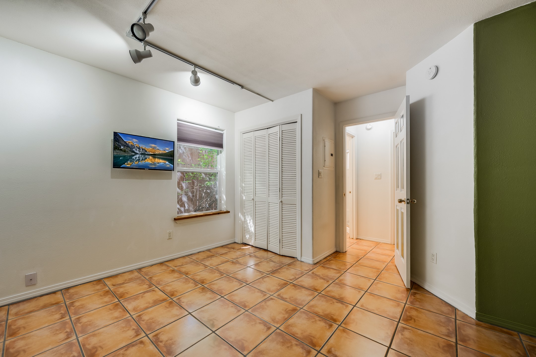 Enjoy relaxed, low-maintenance living in this 2-bedroom, 2-bathroom single-level condo, ideally situated on the street level of a four-unit building with convenient off-street parking. The open-concept layout features high ceilings, wood-finish vigas, skylights, and a fireplace--creating a bright, comfortable space perfect for everyday living and easy entertaining. The primary bedroom includes an en-suite bathroom for added privacy and convenience. Step outside to a private backyard designed for outdoor enjoyment, complete with a covered porch, stucco privacy wall, storage shed, and space to garden or unwind. Located near Rufina Street and Las Acequias Park, this home offers quick access to local markets and Santa Fe's creative hubs--making it easy to enjoy everything the area has to offer.