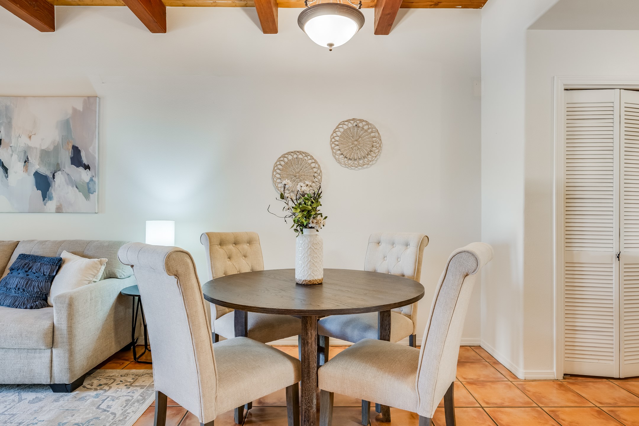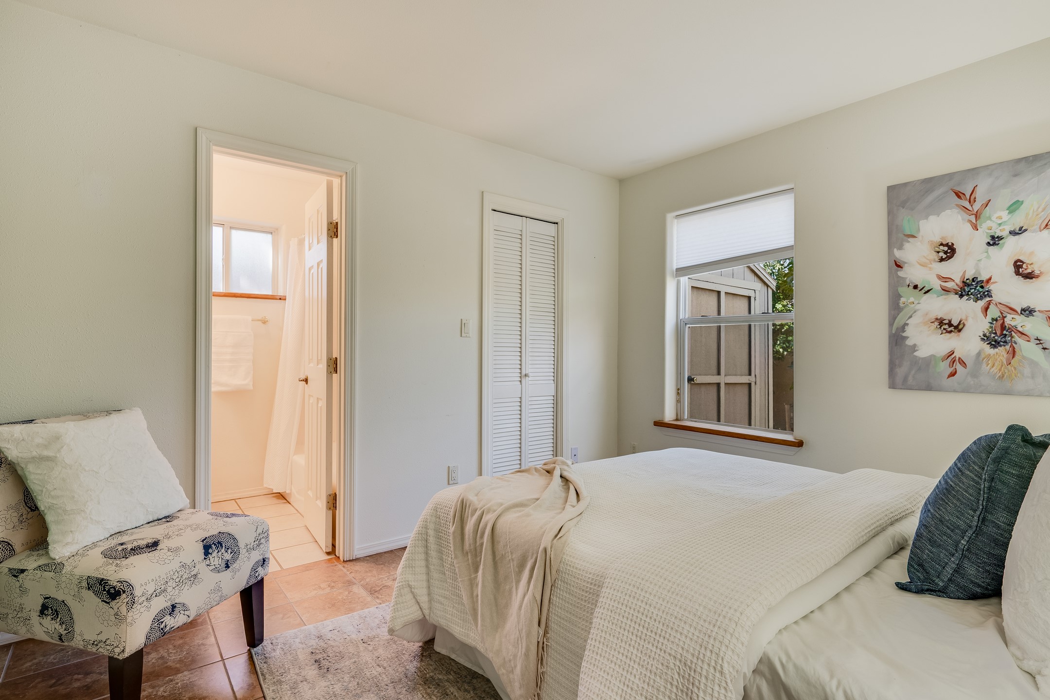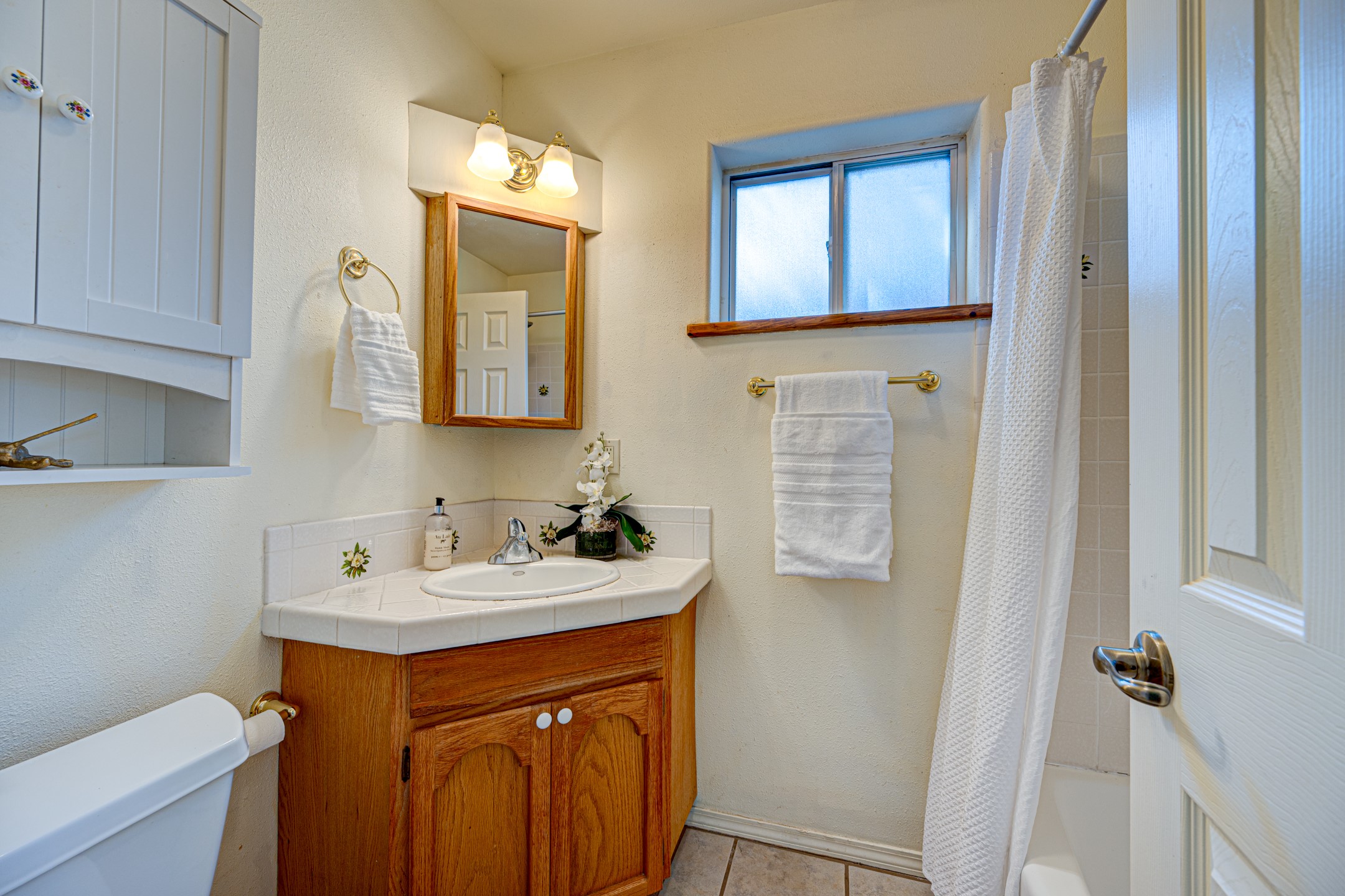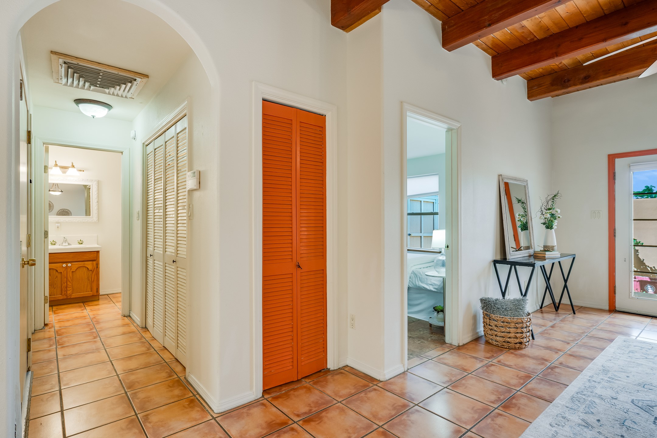 Enjoy relaxed, low-maintenance living in this 2-bedroom, 2-bathroom single-level condo, ideally situated on the street level of a four-unit building with convenient off-street parking. The open-concept layout features high ceilings, wood-finish vigas, skylights, and a fireplace--creating a bright, comfortable space perfect for everyday living and easy entertaining. The primary bedroom includes an en-suite bathroom for added privacy and convenience. Step outside to a private backyard designed for outdoor enjoyment, complete with a covered porch, stucco privacy wall, storage shed, and space to garden or unwind. Located near Rufina Street and Las Acequias Park, this home offers quick access to local markets and Santa Fe's creative hubs--making it easy to enjoy everything the area has to offer.