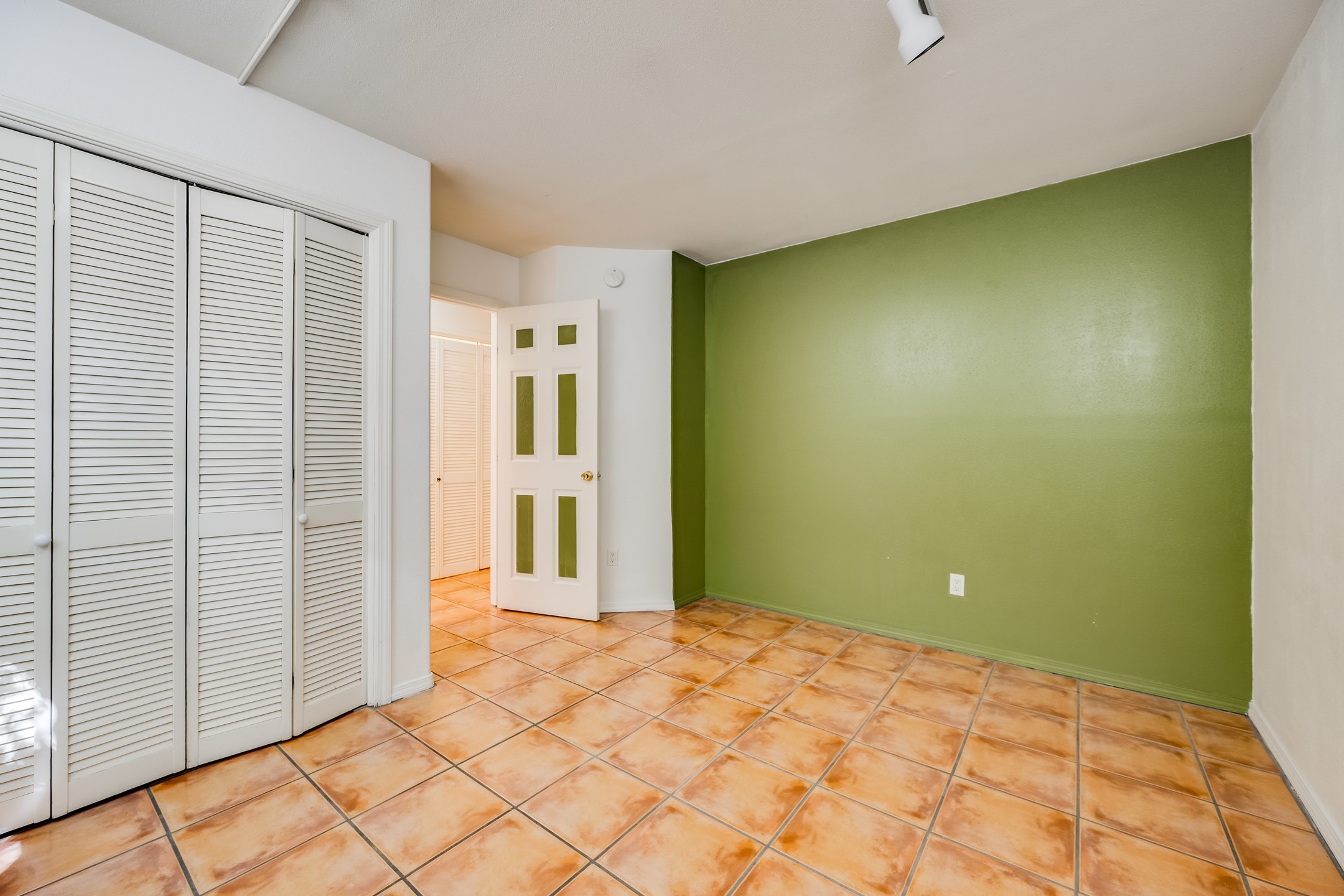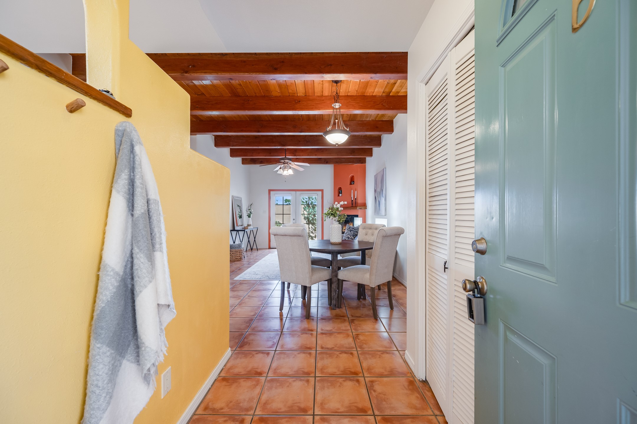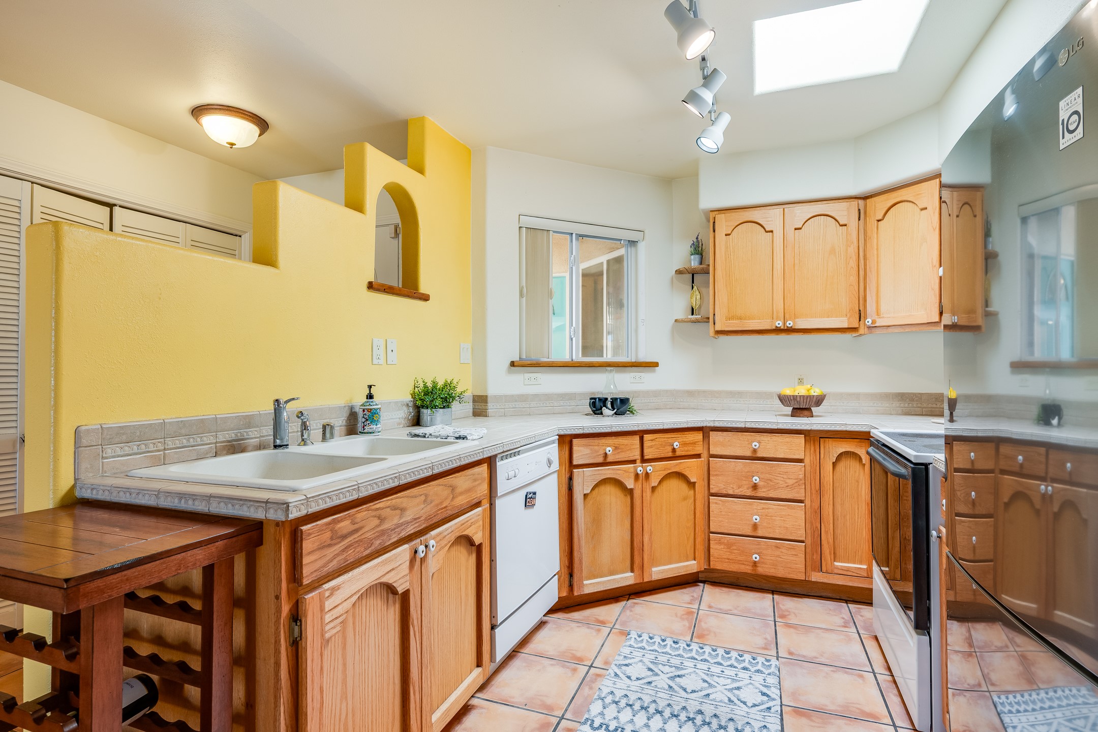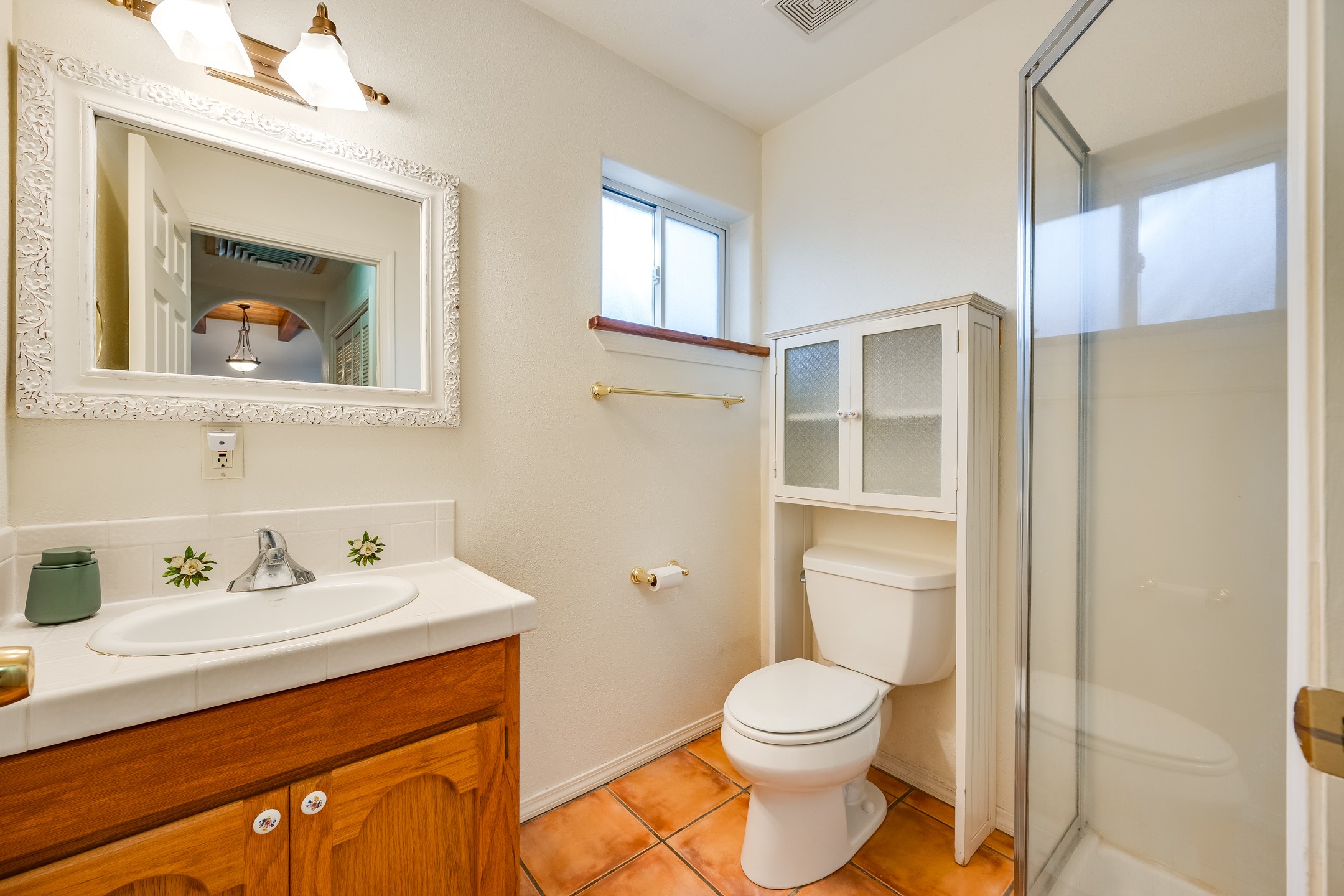 Enjoy relaxed, low-maintenance living in this 2-bedroom, 2-bathroom single-level condo, ideally situated on the street level of a four-unit building with convenient off-street parking. The open-concept layout features high ceilings, wood-finish vigas, skylights, and a fireplace--creating a bright, comfortable space perfect for everyday living and easy entertaining. The primary bedroom includes an en-suite bathroom for added privacy and convenience. Step outside to a private backyard designed for outdoor enjoyment, complete with a covered porch, stucco privacy wall, storage shed, and space to garden or unwind. Located near Rufina Street and Las Acequias Park, this home offers quick access to local markets and Santa Fe's creative hubs--making it easy to enjoy everything the area has to offer.