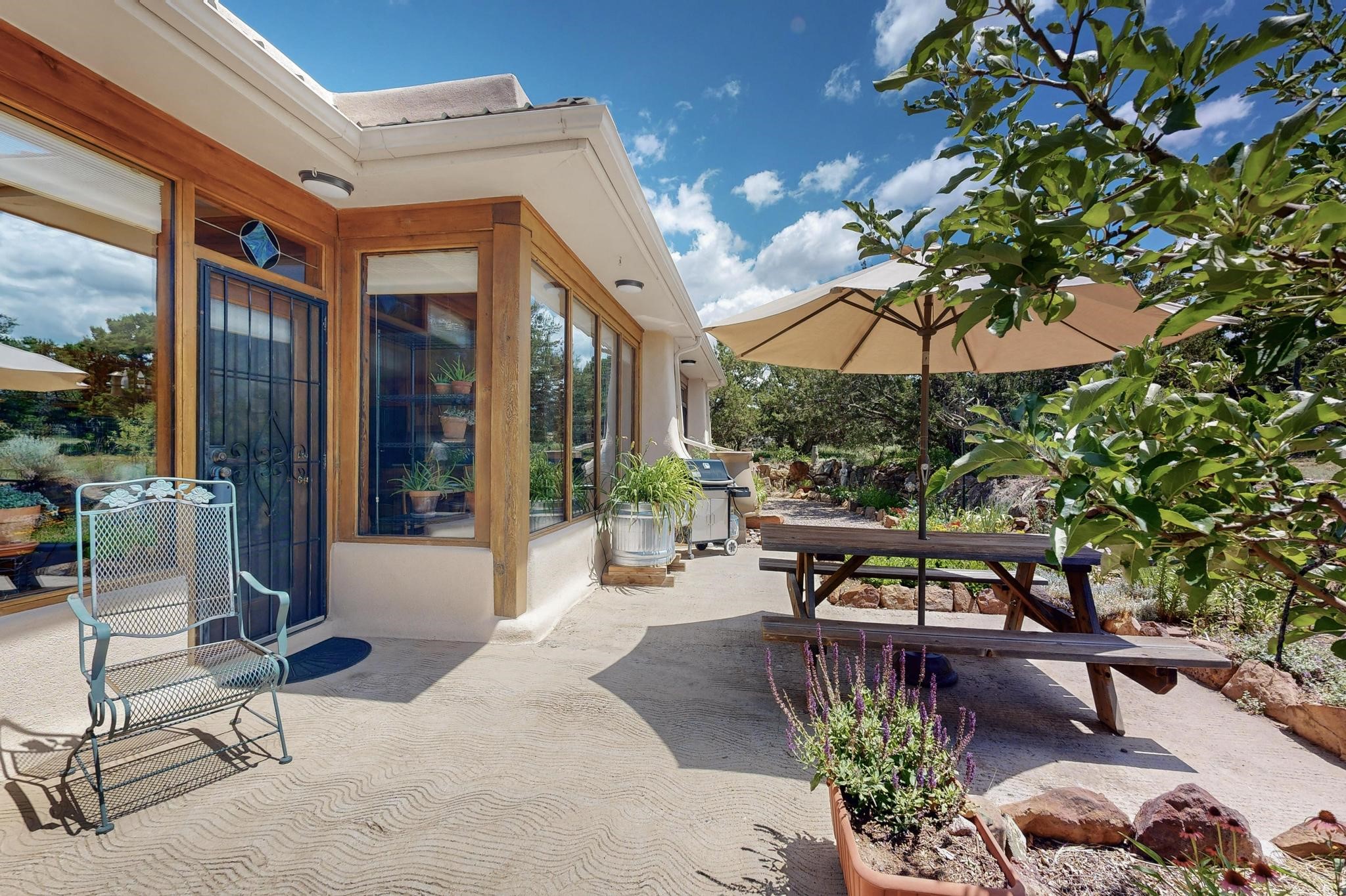 Surrounded by lush perennial gardens, sitting back from the road this lovely traditional pueblo home built by R.J. McMillan in 1984 provides a private oasis. Many upgrades have enhanced it including a new roof in 2015 maintained annually, electric baseboard heating with Daikin mini splits in 2022, reroofed the pitched area with propanel in 2021, reroofed the overhangs with new rain gutters, mostly new windows, upgraded kitchen and appliances in 2023 and new stucco in 2024. Delightful Santa Fe style details creating an ambient charm throughout, even vigas in the garage. The garage currently has a glass door not a garage door on one side, as it was used as a studio. A garden shed, plus productive raised beds, and on the greenbelt, this lovingly maintained home and gardens is special. Close to Eldorado amenities, local shopping, schools, library and senior center, it is only minutes into Santa Fe.