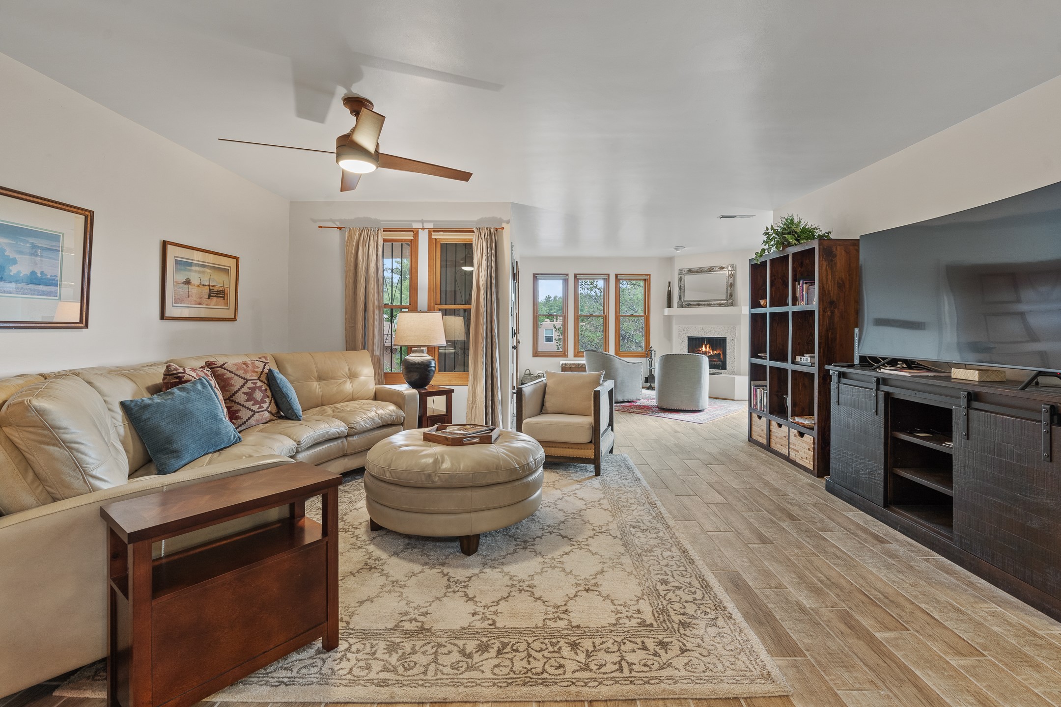 Located in the sought-after South Capital neighborhood, this beautifully updated condo in Los Pueblos is a hidden gem offering both comfort and convenience. Just under 1.5 miles to the Santa Fe Plaza and less than a mile to the Railyard District, enjoy easy access to Whole Foods, Trader Joe's, Natural Grocers, popular restaurants, and local amenities.Spanning 1,472 sqft, this 2-bedroom, 1-bath home (originally a 2-bath and still plumbed for a second bath) features a spacious open-concept layout that seamlessly blends the kitchen, dining, and living areas. A cozy sitting area with a fireplace and sliding glass doors opens to a private balcony, also accessible from the primary bedroom--perfect for relaxing.The home is tiled throughout, offering ease of maintenance and a clean, cohesive look. The tastefully updated kitchen is a standout with granite countertops, a bar-top counter, pantry, and chic lighting fixtures over both the kitchen and dining areas. Newer double-paned windows and a ceiling fan in the living room add comfort and energy efficiency.The large primary suite connects directly to the oversized bathroom, which also serves as the guest bath with a secondary entrance from the hallway. The bathroom includes a walk-in shower and generous space for comfort. The guest bedroom is privately situated down the hall.A former second bathroom has been thoughtfully converted into a large laundry and storage room, complete with a stackable washer and dryer (included) and ample closet space throughout.Additional highlights include:An 8x8 storage unit in the secure underground garage,furniture package available,prime location near Santa Fe's best shopping, dining, and cultural attractions.Whether you're looking for a full-time residence, weekend retreat, or investment opportunity, this stylish condo offers the best of Santa Fe living in an unbeatable location.