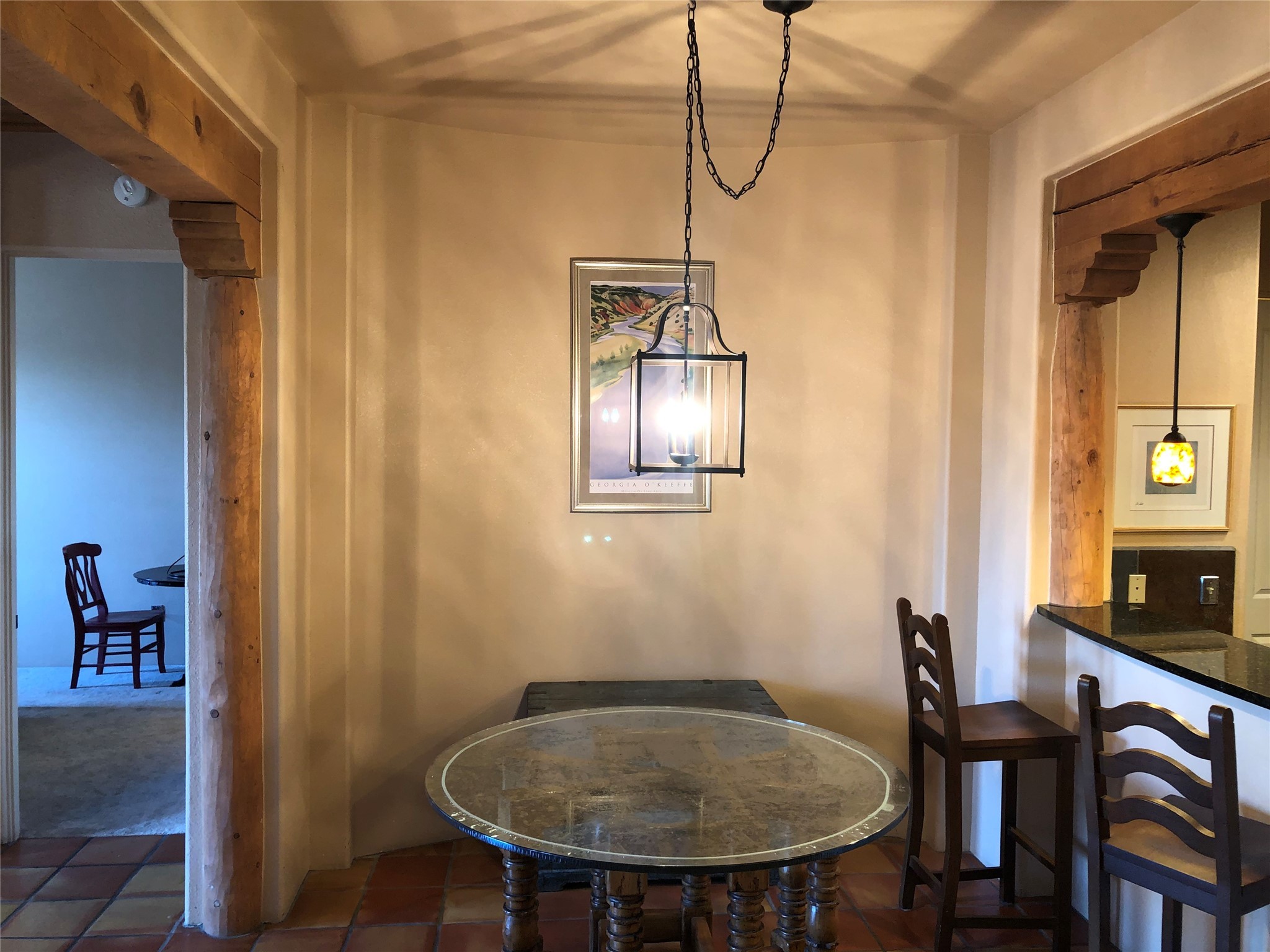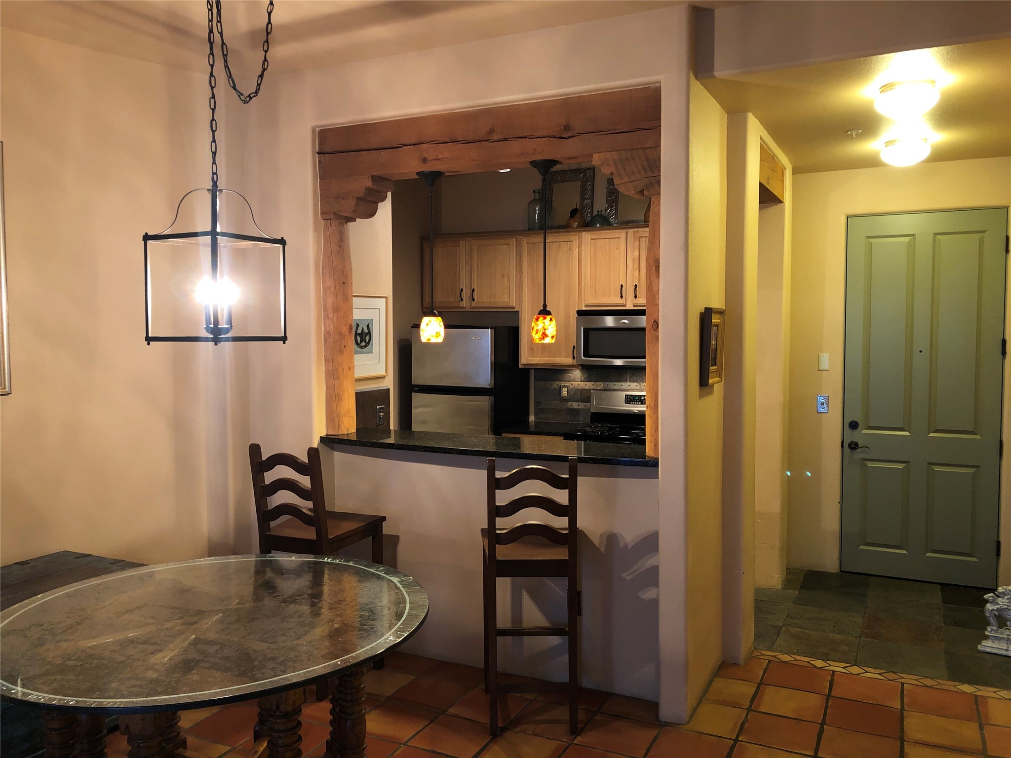 Spacious 2nd floor, Unit B-238, north facing 2 bedrooms, 2 bath condominium located in The Alameda. Extra attached storage area plus a large detached garage. This well done unit features vigas, tongue and groove ceilings, Saltillo and slate floors beautifully done. tile and granite counter tops in kitchen and baths, stainless appliances, washer and dryer included, high ceilings with vigas, Natural gas kiva fireplace, refrigerated air and nice deck area. Amenities: The Alameda is a secure complex, security patrols, with gated parking areas, located in the heart of Santa Fe's prime recreational, entertainment and shopping corridor and boasts a private fitness center, fabulous inner courtyard and outdoor pool, conference center, offices, public gathering area, wine tasting room and is 24 hour access controlled. It's a fantastic unit in a great building & allows for good quality of life.