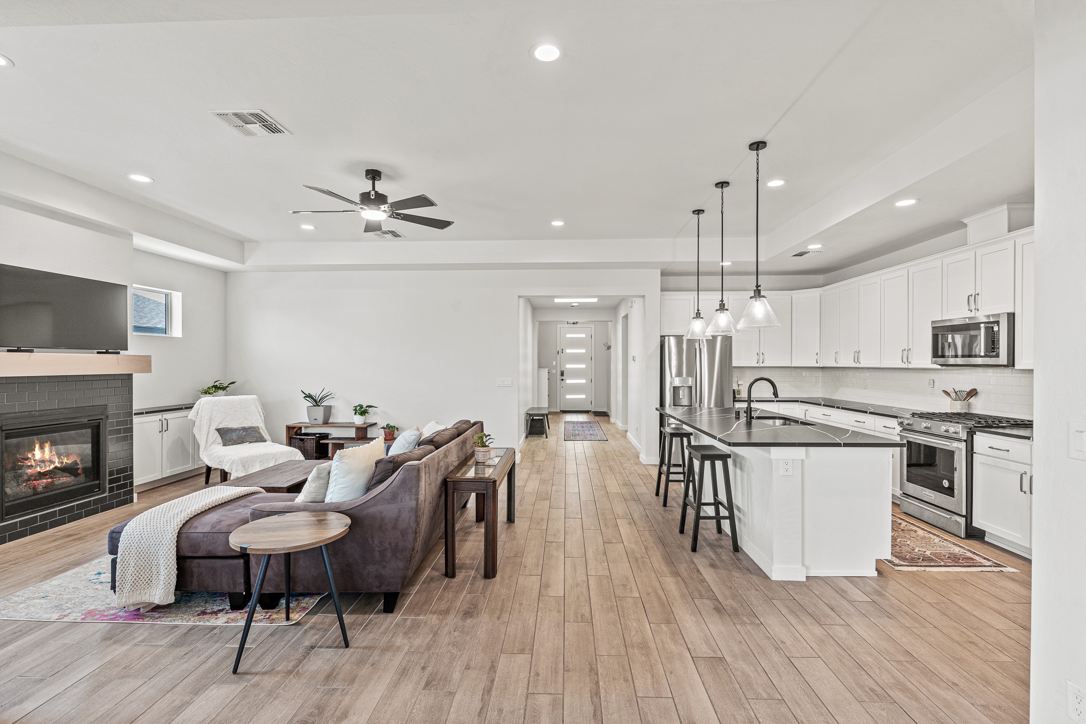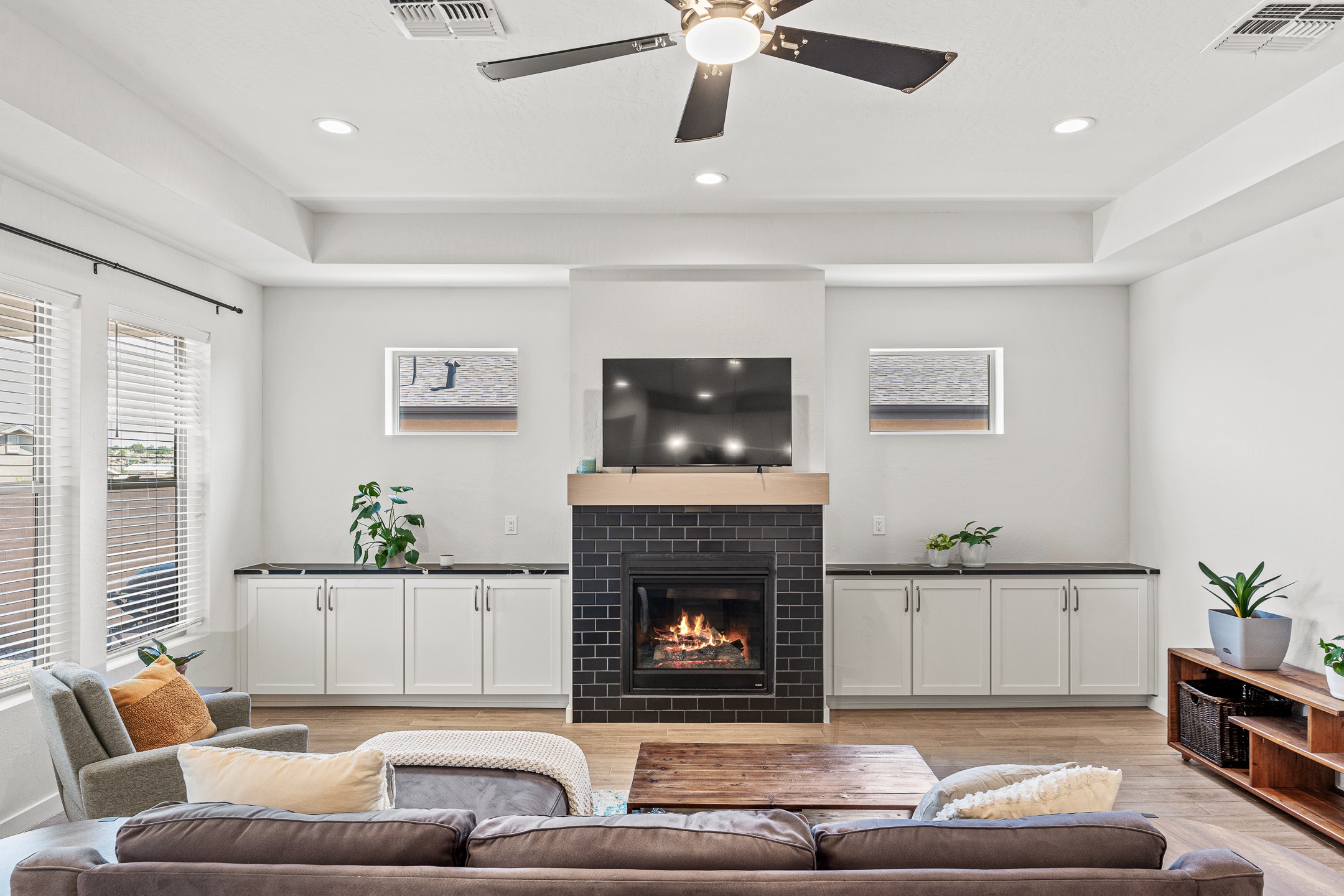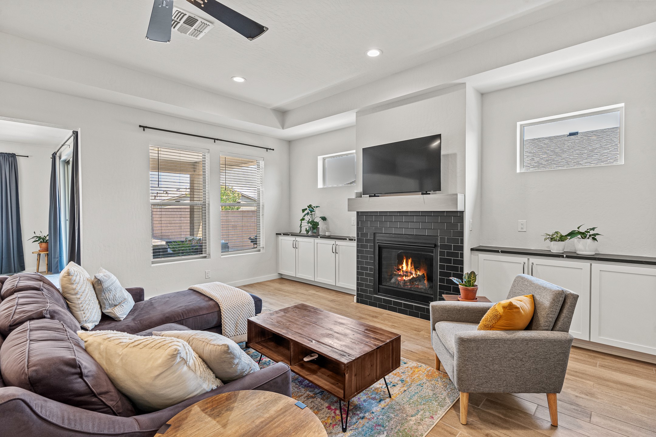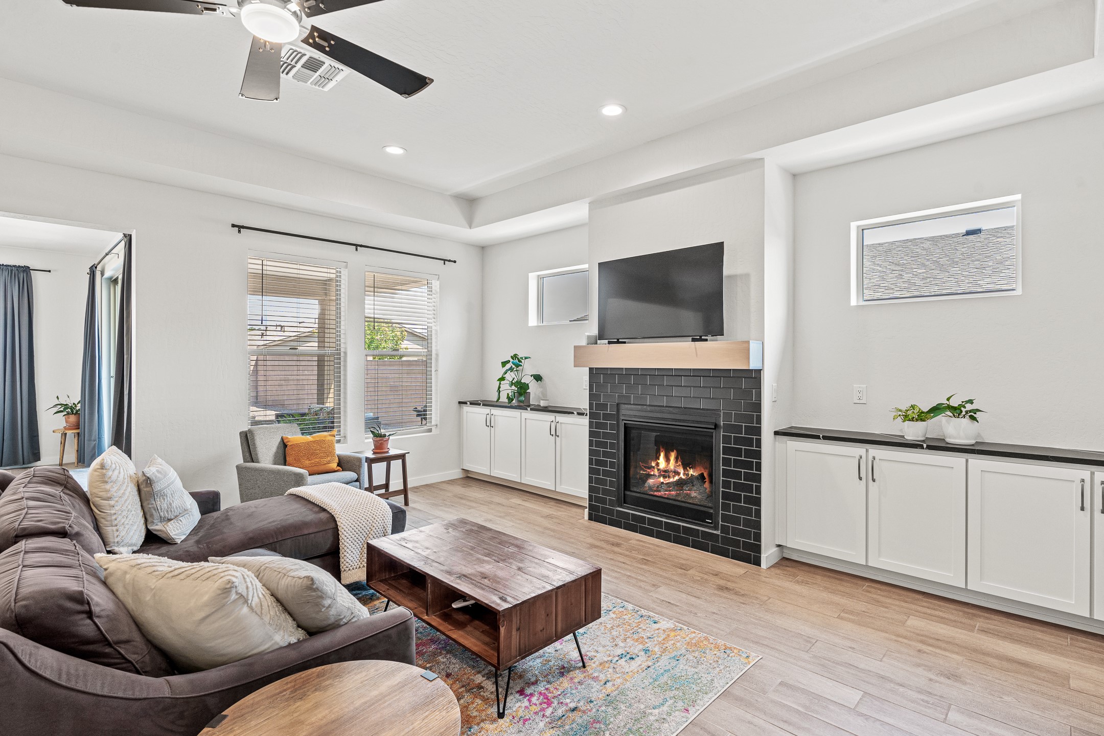Welcome to this immaculate, nearly new home that blends stylish modern finishes with thoughtful upgrades and everyday comfort. Designed for today's lifestyle, this move-in-ready residence offers an open-concept layout filled with natural light, high ceilings, and high-end details throughout. The heart of the home is the beautifully appointed kitchen, featuring sleek countertops, stainless steel appliances, and an oversized island perfect for gathering and entertaining. The spacious living area is anchored by a cozy gas fireplace, creating a warm and inviting atmosphere year-round. The luxurious primary suite provides a peaceful retreat with a spa-like en-suite bathroom and a generous walk-in closet. Custom electric blinds in the home offer privacy and convenience at the touch of a button, while additional bedrooms provide flexibility for guests, work, or hobbies. Step outside and enjoy the thoughtfully designed outdoor living space--ideal for al fresco dining, relaxing evenings, or morning coffee. The low-maintenance yard includes two outdoor storage sheds, providing ample room for tools and gear. The garage is equally impressive, featuring two 240V amp circuits for EV charging or workshop needs, hanging storage shelves, and newly installed gutters for peace of mind. Blink security cameras at the front and back of the home offer added safety and convenience. Located in a desirable neighborhood close to parks, schools, and local amenities, this nearly new home is a special place to move right in and start making memories. Don't miss your chance to make it yours--schedule your showing today!