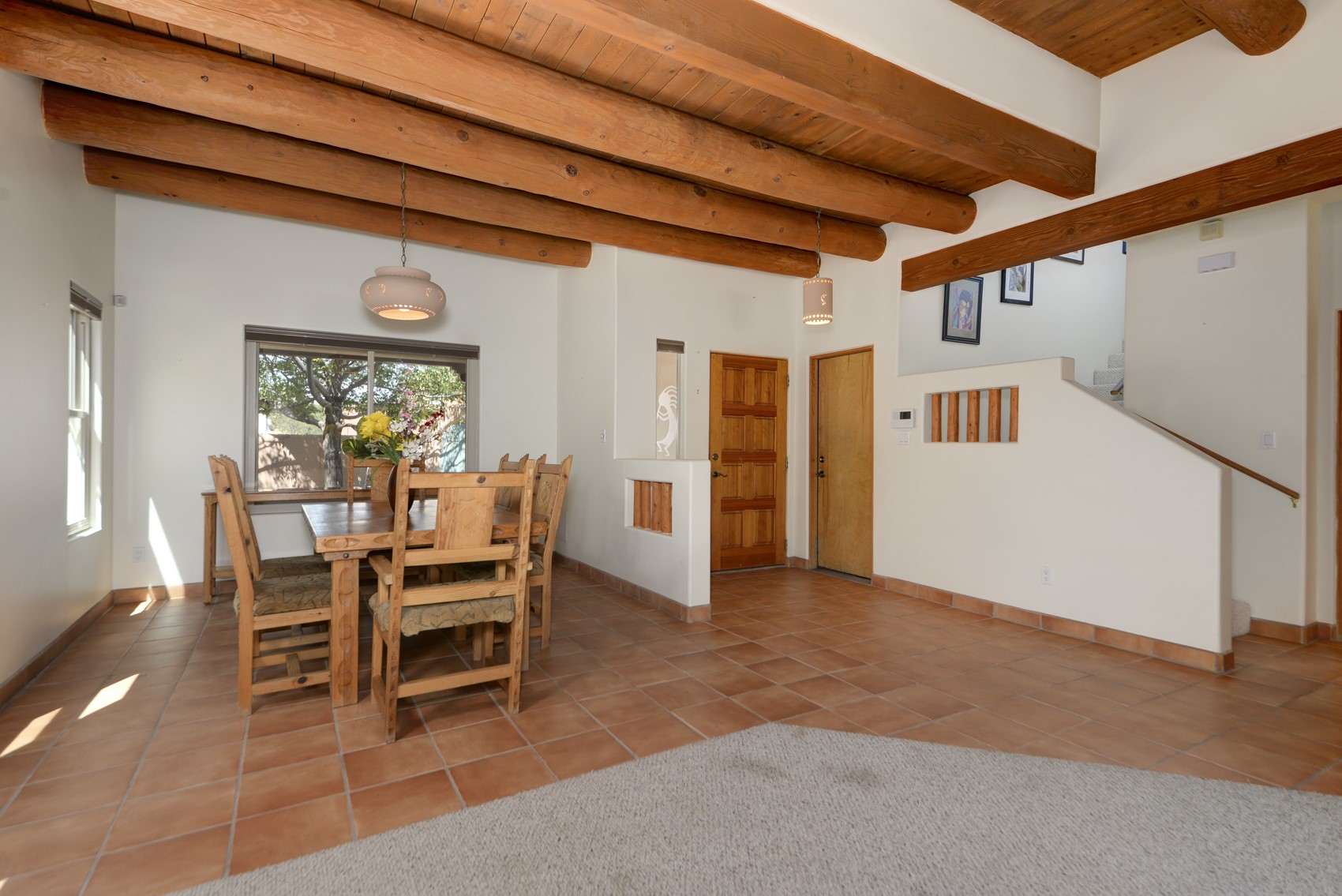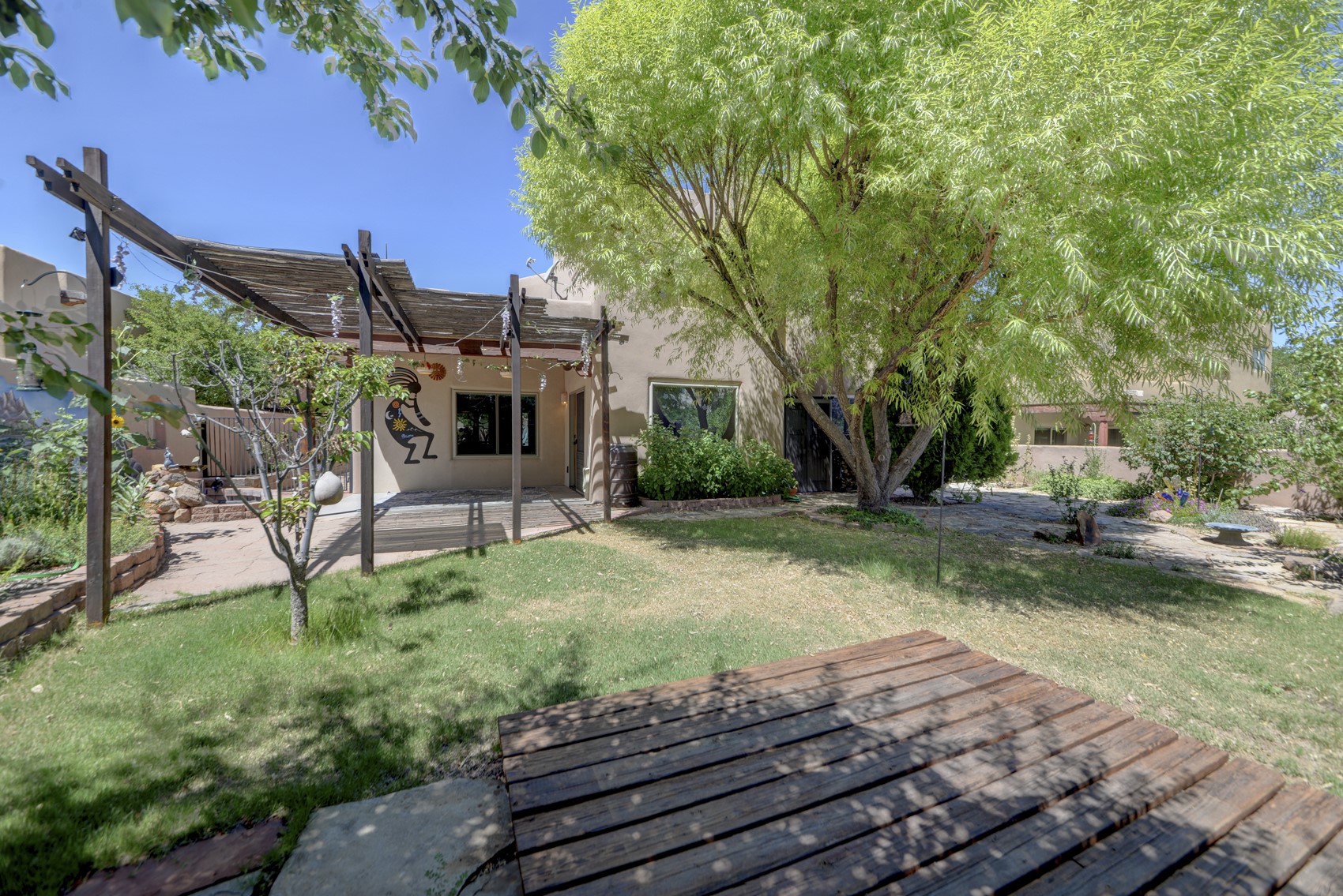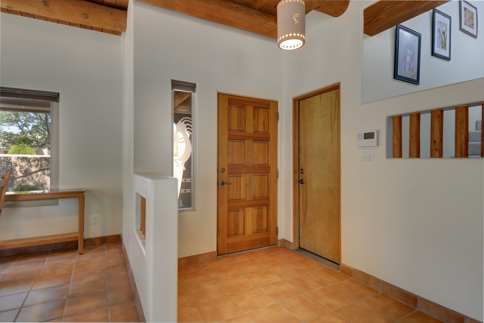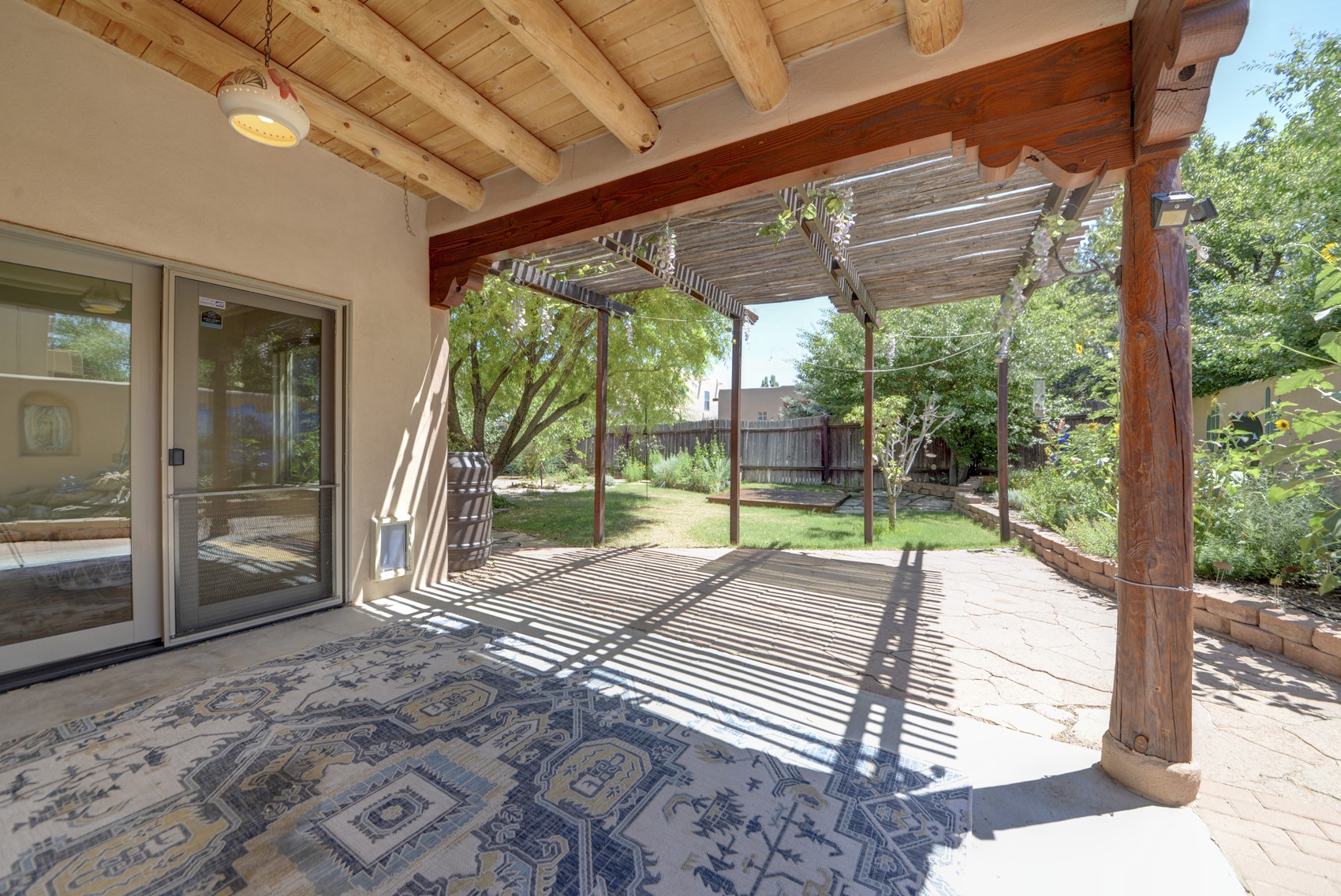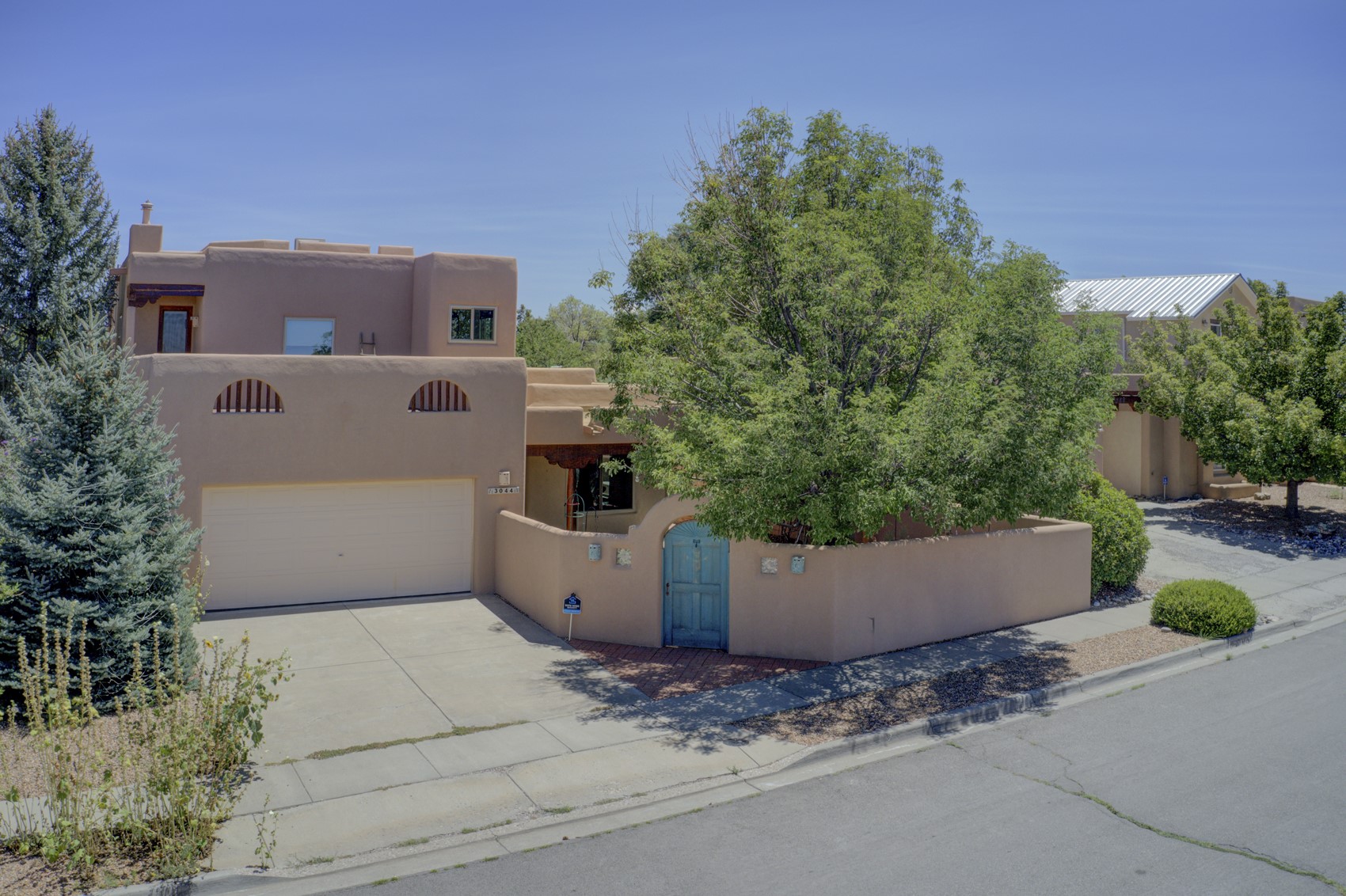 Fantastic Custom home nestled on a Stunning Park-like lot in Pueblos Del Sol, boasting over 100K in Upgrades/Updates!An Oasis in the Heart of Santa Fe! Raised Viga Beam Tongue and Groove Ceilings & Custom Kiva Fireplace in Spacious Living Area! Designer Chandelier in Open Dining Area! Chef's Delight Kitchen has updated smooth surface counter + SS Appliances/Casual Dining Area! Main Level offers 2 Bedrooms and a Gorgeous Remodeled Bath with a Huge Custom Tile shower! Upper Level has wrap-around LOFT Library with live-edge wood bookshelves! Ideal for Art studio/Home office/Work out! View deck off Loft! Luxurious Owner's Suite with Private Deck! Indulge in a SPA-like Experience in the remodeled bath! Relax in the Steam Shower with Body Jets or Linger in the Jet Tub! Upgrades Include: 2019 EE Windows and Patio Doors! 2019 Stucco!/Recent Roof! Remodeled Baths! Updated Kitchen! 2018 Blinds! 2 Mini Split Heat/AC units! 2024 Partial Paint.Stunning Professional Landscaping Designed by a Horticulturist! From the Private Courtyard to the Meandering Flagstone paths, you will be Enchanted! Beautiful SW Original Mural by local Artist! Enjoy the Soothing Stone Waterfall as you Dine on the covered Patio! EZ care Buffalo Grass! Santa Fe Charm meets Modern Comfort! Located just minutes from downtown Santa Fe, local parks, trails, and dining, this home puts you close to everything while still feeling like a private escape!