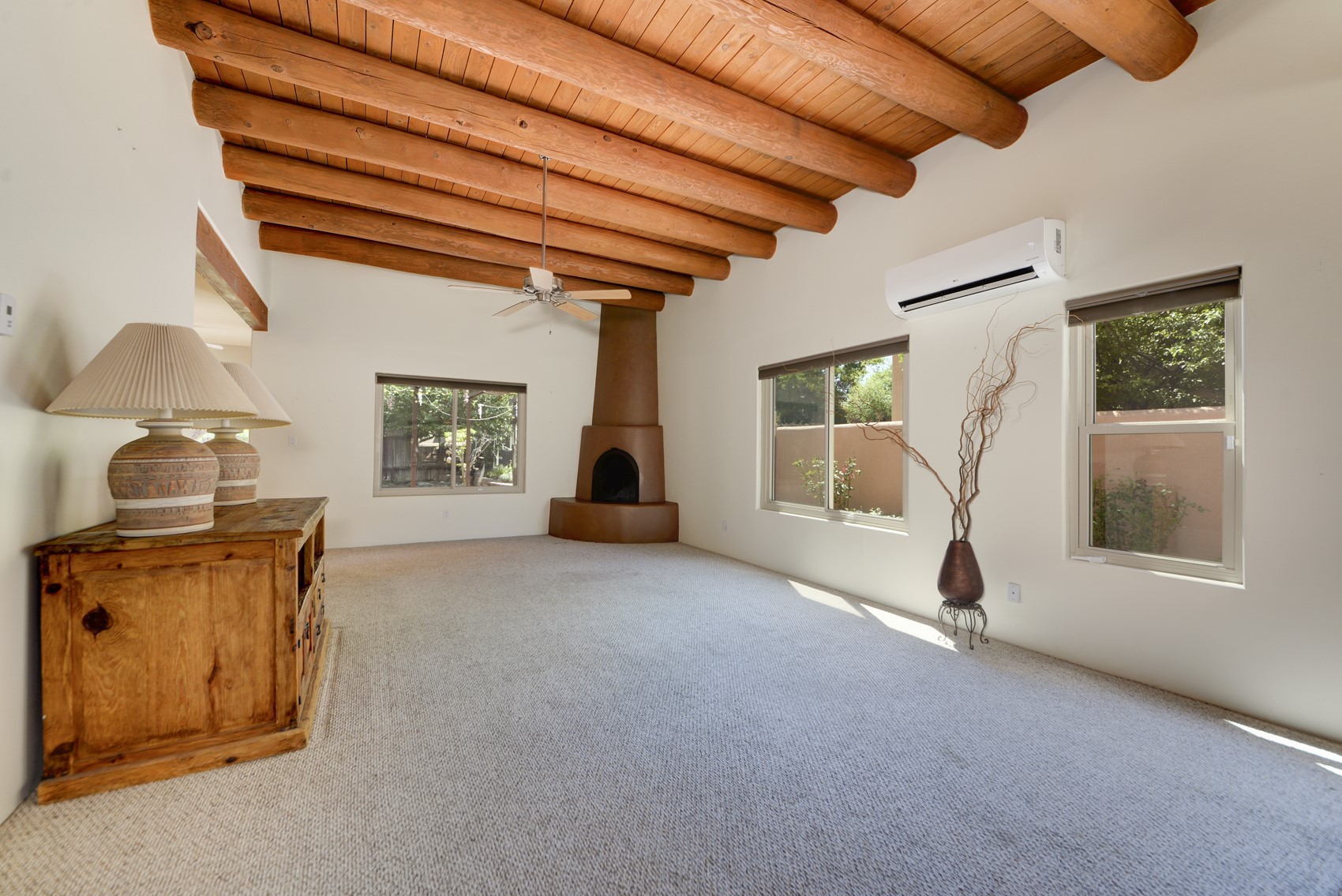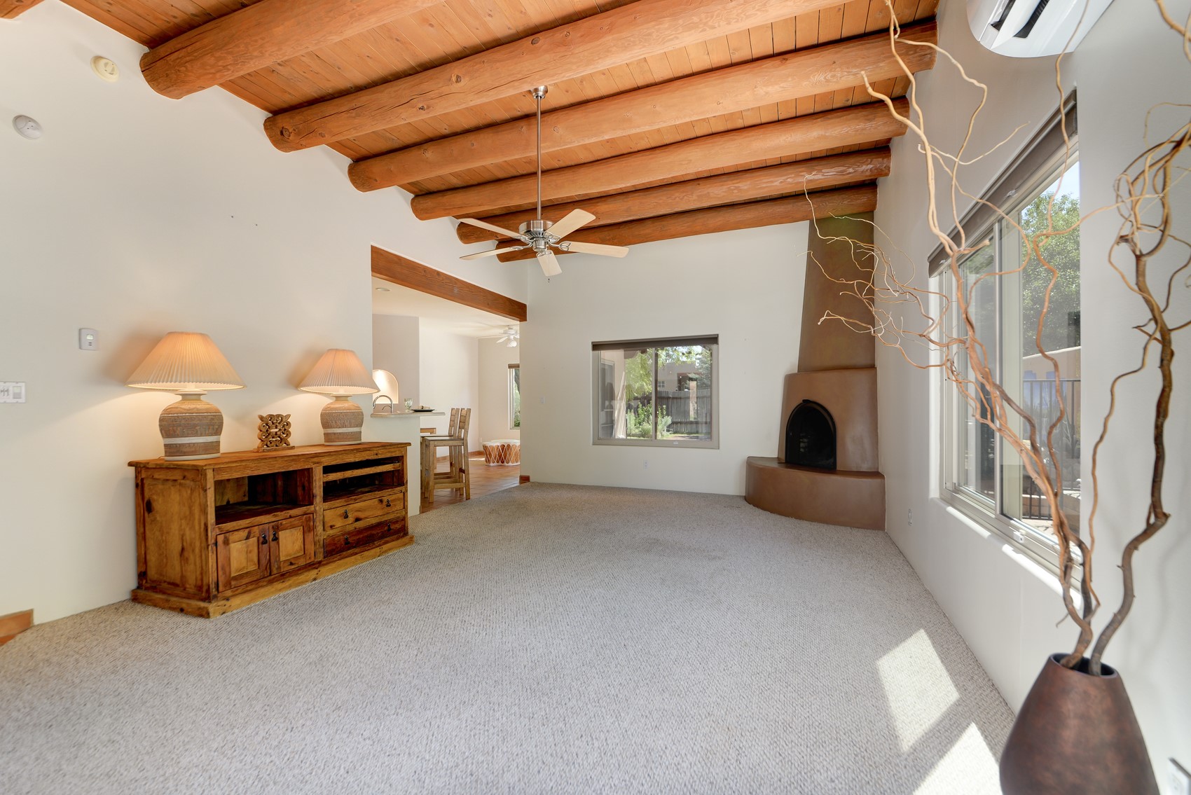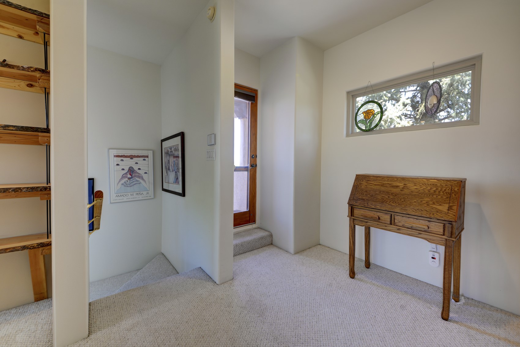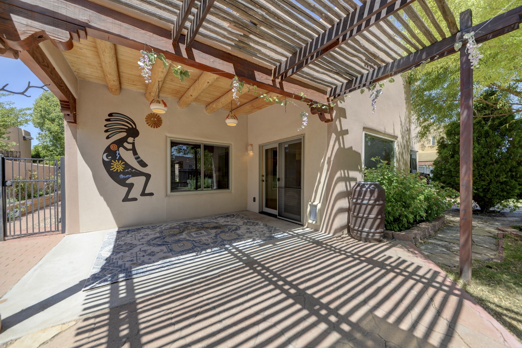 Fantastic Custom home nestled on a Stunning Park-like lot in Pueblos Del Sol, boasting over 100K in Upgrades/Updates!An Oasis in the Heart of Santa Fe! Raised Viga Beam Tongue and Groove Ceilings & Custom Kiva Fireplace in Spacious Living Area! Designer Chandelier in Open Dining Area! Chef's Delight Kitchen has updated smooth surface counter + SS Appliances/Casual Dining Area! Main Level offers 2 Bedrooms and a Gorgeous Remodeled Bath with a Huge Custom Tile shower! Upper Level has wrap-around LOFT Library with live-edge wood bookshelves! Ideal for Art studio/Home office/Work out! View deck off Loft! Luxurious Owner's Suite with Private Deck! Indulge in a SPA-like Experience in the remodeled bath! Relax in the Steam Shower with Body Jets or Linger in the Jet Tub! Upgrades Include: 2019 EE Windows and Patio Doors! 2019 Stucco!/Recent Roof! Remodeled Baths! Updated Kitchen! 2018 Blinds! 2 Mini Split Heat/AC units! 2024 Partial Paint.Stunning Professional Landscaping Designed by a Horticulturist! From the Private Courtyard to the Meandering Flagstone paths, you will be Enchanted! Beautiful SW Original Mural by local Artist! Enjoy the Soothing Stone Waterfall as you Dine on the covered Patio! EZ care Buffalo Grass! Santa Fe Charm meets Modern Comfort! Located just minutes from downtown Santa Fe, local parks, trails, and dining, this home puts you close to everything while still feeling like a private escape!